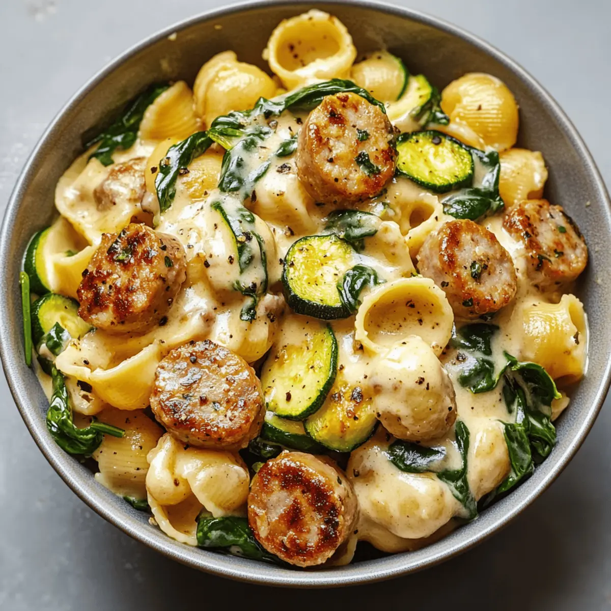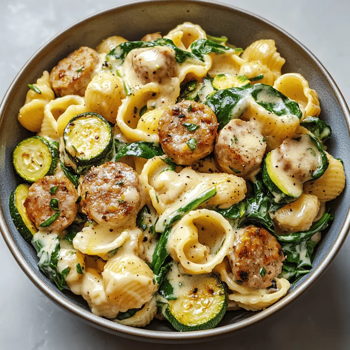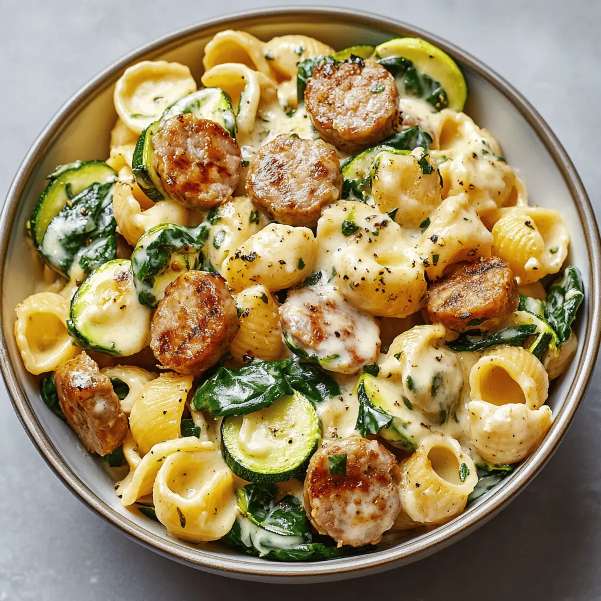 As I hurriedly rummaged through my fridge on a busy weeknight, the challenge of creating a satisfying meal seemed daunting. Then I spotted a package of chicken sausage, some fresh zucchini, and a handful of spinach—transforming what could have been a food frenzy into a delightful dinner surprise. This Creamy Protein-Packed Pasta Bowl is my go-to solution for those hectic evenings, marrying the comforting essence of pasta with an impressively high protein content. In just 15 minutes, you can indulge in a creamy, wholesome dish that not only fuels your body but also brings a smile to your face. With its quick preparation and nutritious twist, this pasta bowl is sure to be a crowd-pleaser at your table. So, are you ready to whip up something deliciously satisfying? Why is this pasta bowl a must-try? Satisfying Comfort: This Creamy Protein-Packed Pasta Bowl blends cherished comfort food with a nutritious twist, perfect for busy nights. High-Protein Delight: With over 30 grams of protein per serving, it’s a wholesome choice that keeps you full and energized. Quick and Easy: In just 15 minutes, you can whip up this dish, making it ideal for those last-minute cravings. Versatile Ingredients: Feel free to customize by swapping veggies or proteins, ensuring it fits your dietary preferences seamlessly. Crowd-Pleasing Flavor: The savory chicken sausage complements the creamy sauce, creating a meal that everyone will love, just like my other favorites, Garlic Parmesan Pasta and Garlic Shrimp Pasta. Creamy Protein-Packed Pasta Bowl Ingredients For the Pasta • 1 cup cooked shell pasta – This serves as the hearty base; feel free to substitute with your favorite pasta shape to match personal taste. For the Protein • 1 Applegate chicken sausage, sliced – This adds a burst of flavor and protein; turkey or veggie sausage works well too. For the Vegetables • 1 small zucchini, sliced – Provides a fresh crunch; you can swap it for yellow squash if you prefer. • 1 handful fresh spinach – A nutrient-rich addition that brightens the dish; frozen spinach can be a good substitute when thawed and patted dry. For the Sauce • ¼ cup light or reduced-fat cream cheese or Alfredo sauce – This creates a creamy, dreamy texture; full-fat cream cheese adds a richer taste. For Seasoning • Salt & pepper to taste – Essential for enhancing the overall flavor; consider adding fresh herbs for a fragrant touch! For Cooking • Olive oil spray or 1 tsp olive oil – Used to sauté veggies; replace with cooking spray for a lower-fat alternative. Now you have everything you need for your Creamy Protein-Packed Pasta Bowl! Happy cooking! Step‑by‑Step Instructions for Creamy Protein-Packed Pasta Bowl Step 1: Cook Pasta Bring a pot of salted water to a rolling boil and add 1 cup of shell pasta. Cook according to package directions, usually about 8–10 minutes, until al dente. Once cooked, drain the pasta in a colander and set it aside, reserving a little pasta water for later use if needed. Step 2: Sauté Veggies In a large skillet, heat 1 teaspoon of olive oil over medium heat. Add the sliced zucchini and sauté for about 3–4 minutes, until golden brown and tender. Next, stir in a handful of fresh spinach, cooking until it wilts, which should take about 1–2 minutes. This creates a vibrant base for your Creamy Protein-Packed Pasta Bowl. Step 3: Add Sausage Now it’s time to introduce the protein! Add the sliced Applegate chicken sausage to the skillet with the sautéed veggies. Sauté everything together for another 3–4 minutes, allowing the sausage to heat through and slightly brown, enhancing its flavor for your pasta bowl. Step 4: Combine & Cream It Up Reduce the heat to low and mix in the cooked shell pasta with the veggie and sausage mixture. Add ¼ cup of light or reduced-fat cream cheese (or Alfredo sauce), stirring gently until all ingredients are evenly coated and creamy, about 2 minutes. If the sauce is too thick, stir in a splash of reserved pasta water to reach your desired consistency. Step 5: Season & Serve Taste your Creamy Protein-Packed Pasta Bowl and adjust the seasoning with salt and pepper to your liking. Serve immediately while warm, garnishing with additional spinach or a sprinkle of Parmesan cheese, if desired. Enjoy the comforting flavors of this quick and satisfying meal right from your kitchen! What to Serve with Creamy Protein-Packed Pasta Bowl This delightful dish pairs beautifully with a variety of sides that enhance its comforting flavors and textures, turning dinner into a feast. Garlic Bread: The warm, crispy bites of garlic bread provide a satisfying crunch that complements the creamy pasta. Caesar Salad: Crisp romaine lettuce with zesty dressing adds a refreshing crunch that balances the richness of the pasta bowl. Roasted Vegetables: Seasonal veggies like carrots, bell peppers, or broccoli bring vibrant colors and a sweet char that enhances the dish’s wholesome ingredients. Lemon Herb Quinoa: Light and fluffy quinoa mixed with fresh herbs adds a nutty texture and bright acidity, creating a delightful contrast with the creamy pasta. Sautéed Green Beans: Tender green beans tossed in olive oil and garlic make for a vibrant and healthful side, adding a pop of color and nutrition. Iced Tea or Lemonade: A chilled glass of sweet iced tea or tangy lemonade refreshes your palate between each creamy bite and hints at summer. Chocolate Mousse: End your meal on a sweet note with a rich chocolate mousse that pairs perfectly with the savory elements of the pasta bowl. Its smooth texture creates a perfect finale! Make Ahead Options These Creamy Protein-Packed Pasta Bowls are perfect for meal prep enthusiasts! You can cook the pasta, sauté the zucchini, and slice the chicken sausage up to 3 days in advance, storing each component separately in airtight containers in the refrigerator. For the best quality, prepare the creamy sauce just before serving to prevent it from thicken