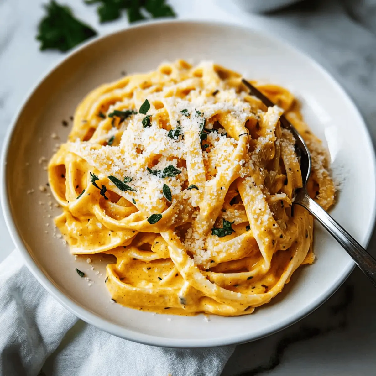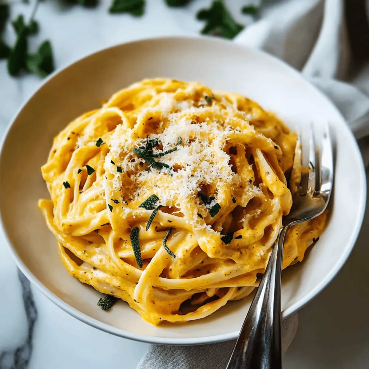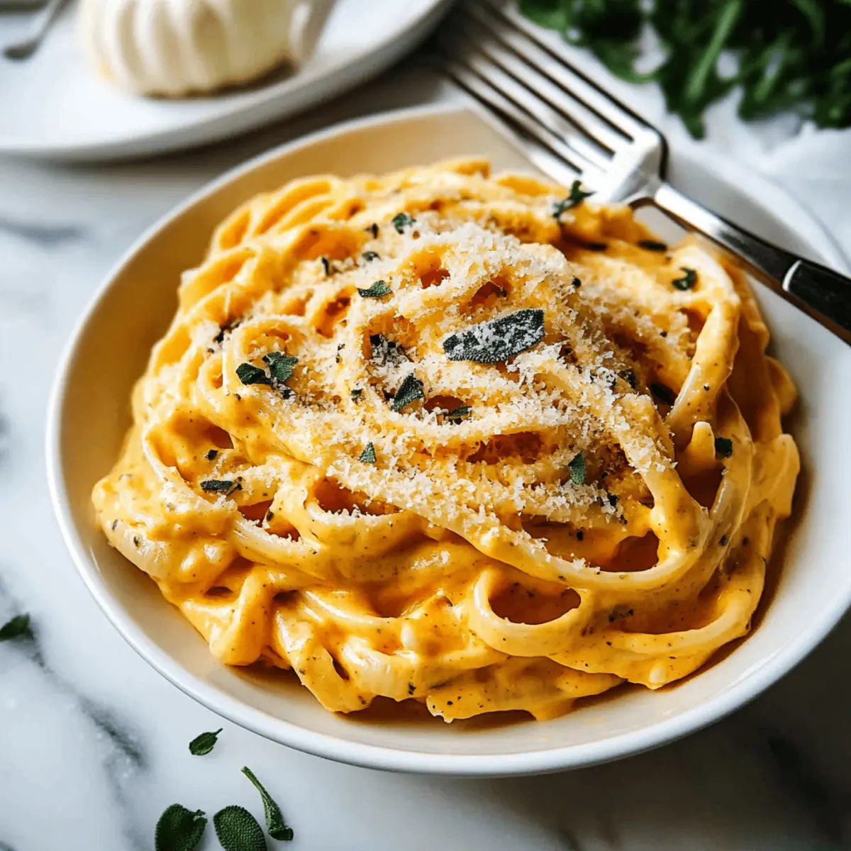 As I stood in my kitchen, the air filled with the warm, earthy scent of freshly sautéed garlic and sage, I felt an undeniable pull towards fall flavors. It was then that I decided to whip up an Easy Creamy Pumpkin Alfredo Pasta, a dish that effortlessly combines creamy pumpkin puree with a hint of herbaceous warmth for a comforting dinner. In just 30 minutes, this vegetarian delight transforms busy weeknights into something truly special. Not only does it make for an impressive meal without the stress, but it also offers a healthier twist on classic Alfredo, making it a perfect go-to for anyone eager to escape the fast-food routine. Ready to dive into this comforting bowl of goodness? Let’s get started! Why Choose Creamy Pumpkin Alfredo Pasta? Simplicity: This recipe is incredibly easy to follow, perfect for both novice cooks and seasoned chefs alike. Quick Prep: Ready in just 30 minutes, it’s ideal for busy weeknights. Flavorful Twist: The blend of creamy pumpkin and sage offers a unique spin on classic Alfredo, making every bite delightful. Versatile: Feel free to experiment with your favorite pasta shapes or add proteins like grilled chicken for extra heartiness. Crowd-Pleasing: It’s a dish everyone will love, transforming any dinner into a comforting experience. Pair it with a fresh side salad or garlic bread, and you’ve got a complete meal that beats fast food any day! Creamy Pumpkin Alfredo Pasta Ingredients For the Pasta • Fettuccine Pasta – This is the main component that clings beautifully to the sauce; feel free to swap with your favorite pasta type. For the Sauce • Olive Oil – The base for sautéing garlic; it adds a lovely richness to the dish. • Garlic – Introduces aromatic depth that enhances the overall flavor. • Pumpkin Puree – This creamy and slightly sweet base brings that lovely pumpkin flavor; make sure it’s pure pumpkin, not pie filling! • Heavy Cream – The star ingredient that contributes to the sauce’s richness and creamy texture. • Parmesan Cheese – This brings in salty, nutty notes as it melts into the sauce. • Ground Nutmeg – Adds warmth and depth, elevating the pumpkin flavor in your Creamy Pumpkin Alfredo Pasta. • Fresh Sage – Offers fragrant, earthy notes; swap for dried sage if necessary, but use a smaller amount as it’s more concentrated. • Pasta Cooking Water – Using this reserved water helps you adjust the sauce to your desired consistency; don’t forget to save some before draining the pasta! Optional Garnish • Extra Parmesan – A sprinkle on top adds an extra layer of flavor and visual appeal. • Fresh Pepper – A dash gives a slight kick; adjust to taste! • Fresh Herbs – Feel free to add more for that burst of freshness. Embrace the comforting allure of creamy pumpkin Alfredo; this ingredient list sets you up for a dinner your family will adore! Step‑by‑Step Instructions for Creamy Pumpkin Alfredo Pasta Step 1: Cook the Pasta Begin by bringing a large pot of salted water to a rolling boil over medium-high heat. Once boiling, add in your fettuccine pasta and cook according to package instructions until al dente, usually about 8-10 minutes. Just before draining the pasta, reserve ½ cup of the cooking water; then, drain the pasta in a colander and set it aside. Step 2: Sauté the Garlic In a large skillet, heat 2 tablespoons of olive oil over medium heat. Once the oil is shimmering, add 2-3 cloves of minced garlic and sauté for about 1 minute until fragrant but not browned. This step sets the aromatic base for your creamy pumpkin Alfredo pasta, enhancing the dish’s overall flavor. Step 3: Prepare the Pumpkin Sauce Next, stir in 1 cup of pumpkin puree to the skillet, mixing well with the sautéed garlic. Cook the mixture for about 2-3 minutes until heated through, stirring frequently. The pumpkin should become smooth and combined with the garlic, creating a rich, creamy base for your sauce. Step 4: Create the Creamy Sauce Pour in 1 cup of heavy cream and stir until the sauce is well combined and silky. Allow it to simmer on low heat, letting it thicken for about 3-5 minutes. As you simmer, the creamy pumpkin Alfredo pasta sauce will develop its luxurious texture with beautiful hints of orange from the pumpkin. Step 5: Add Cheese and Seasoning Gradually stir in ¾ cup of grated Parmesan cheese until fully melted and smooth. Season your sauce with salt, freshly cracked pepper, and a pinch of nutmeg for warmth. Finally, toss in 2 tablespoons of chopped fresh sage, cooking for an additional 1-2 minutes until everything is beautifully melded together. Step 6: Combine Pasta and Sauce Gently add the drained fettuccine to the skillet with the creamy pumpkin Alfredo sauce. Toss everything together until the pasta is well coated. If the sauce appears too thick, add the reserved pasta cooking water a few tablespoons at a time, mixing to reach your desired consistency. Step 7: Serve the Dish Once combined, remove the skillet from the heat and transfer your creamy pumpkin Alfredo pasta to serving plates. For added flavor and a touch of elegance, garnish with additional Parmesan cheese, a sprinkle of fresh pepper, and extra sage if desired. Enjoy this comforting and delightful dish! How to Store and Freeze Creamy Pumpkin Alfredo Pasta Fridge: Store your Creamy Pumpkin Alfredo Pasta in an airtight container for up to 3 days. Reheat gently on the stovetop with a splash of milk or cream to preserve its creamy texture. Freezer: For longer storage, freeze your pasta in a freezer-safe container for up to 3 months. Allow it to cool completely before freezing, and remember to label with the date. Defrosting: To enjoy, thaw overnight in the refrigerator before reheating. Add a bit of cream or pasta water if the sauce thickens during freezing. Reheating: When ready to serve, warm the pasta gently on the stove, stirring in reserved cooking water or cream to maintain that delicious, velvety consistency. Creamy Pum