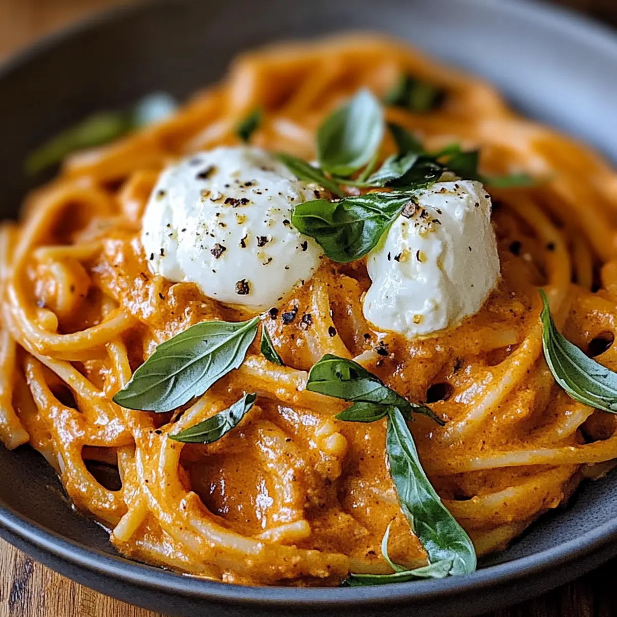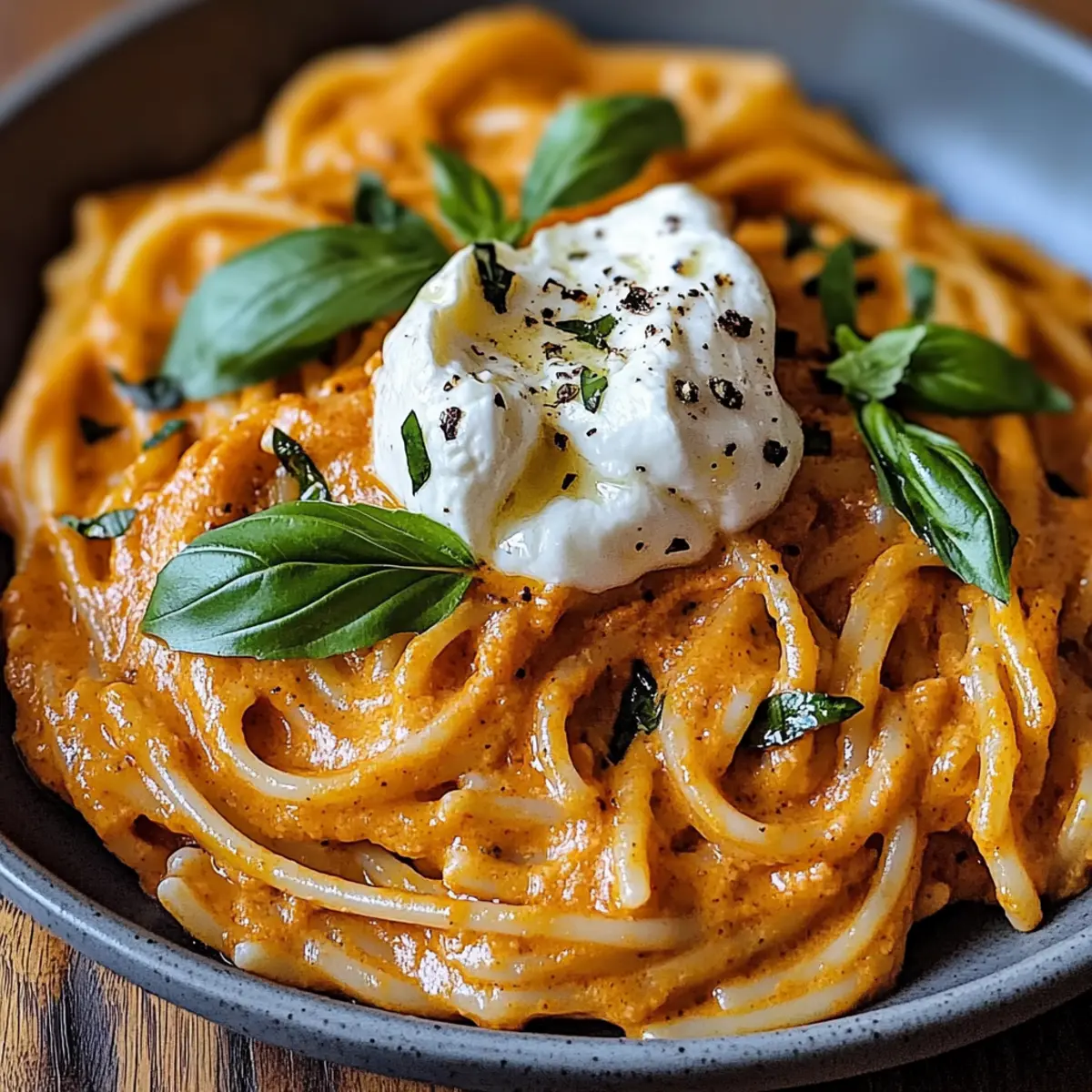 There’s something magical about the rich aroma of roasted red peppers wafting through the kitchen. As I prepared to make my Creamy Red Pepper Pasta with Burrata & Herbs, I felt transported to Italy, where simple ingredients combine to create mouthwatering dishes. This delightful recipe is exceptionally quick to whip up, making it perfect for busy weeknights or when you want to impress guests without spending hours in the kitchen. The creamy sauce envelops every strand of pasta, while the luscious burrata adds a layer of indulgence that’s hard to resist. Plus, it’s vegetarian, so it caters to various dietary preferences! Curious about how it all comes together? Let’s dive into this comforting yet elevated meal that promises to be a hit at your table. Why Will You Love This Pasta? Simplicity: You only need 30 minutes to create this mouthwatering dish, making it a winner for any busy home cook. Flavor Explosion: The blend of creamy burrata and roasted red peppers delivers an exquisite taste that will have your taste buds singing. Versatility: Feel free to mix in your favorite veggies or proteins like grilled chicken or shrimp for an extra boost. Crowd-Pleaser: Whether for a delightful family dinner or when entertaining guests, this dish is sure to impress. Comforting Indulgence: Each bite is a warm hug, reminiscent of cozy Italian kitchens, bringing comfort to your dining table. Ready to elevate your weeknight meals with this Creamy Red Pepper Pasta? Check out some side suggestions like Chicken Garlic Herbs or a fresh salad! Creamy Red Pepper Pasta Ingredients • Gather these delightful ingredients to create the perfect Creamy Red Pepper Pasta with Burrata & Herbs! For the Pasta Pasta – the star of the dish; choose your favorite type for the best texture. Salt – enhances the flavor of the pasta; don’t forget to salt your water! For the Sauce Red Bell Peppers – rich in sweetness and smoky flavor when roasted; jarred roasted variants work well for convenience. Heavy Cream – creates the luscious creaminess of the sauce; use half-and-half for a lighter feel. Garlic – elevates the dish with its aromatic kick; fresh minced garlic is the best choice. Olive Oil – adds richness and helps sauté the sauce; feel free to swap in avocado oil for a different flavor profile. Black Pepper – essential for seasoning; fresh cracked pepper will enhance the taste. Red Pepper Flakes – optional for a hint of heat; skip it if you prefer your pasta mild! For the Toppings Burrata Cheese – creamy goodness that makes this dish irresistible; substitute with ricotta if needed. Fresh Basil – brightens the dish with freshness; parsley works as a great alternative. Parmesan Cheese – a flavorful finishing touch; opt for nutritional yeast for a vegan version. Craft your plate of Creamy Red Pepper Pasta with Burrata & Herbs, and enjoy the warmth and comfort it brings to your table! Step‑by‑Step Instructions for Creamy Red Pepper Pasta with Burrata & Herbs Step 1: Roast the Peppers Preheat your oven to 400°F (200°C). Arrange red bell peppers on a baking sheet and roast them for 25–30 minutes, or until their skins are beautifully charred and blistered. Once roasted, remove the peppers from the oven, and allow them to cool for a few minutes. Carefully peel off the skins, remove the seeds, and set the peppers aside to be blended into the sauce. Step 2: Cook the Pasta In a large pot, bring salted water to a rolling boil, then add your chosen pasta. Cook the pasta according to package instructions until it is al dente, usually about 8–10 minutes. Stir occasionally to prevent sticking. Once cooked, drain the pasta in a colander and reserve a cup of the pasta water to adjust the sauce later if needed. Set the pasta aside and let it rest while you prepare the sauce. Step 3: Prepare the Sauce In a blender or food processor, combine the roasted red peppers, heavy cream, minced garlic, a pinch of salt, freshly cracked black pepper, and red pepper flakes (if using). Blend the mixture until it reaches a smooth and creamy consistency, resembling a beautiful sauce. This blend will create the foundation for your Creamy Red Pepper Pasta, perfectly complementing the pasta’s texture. Step 4: Sauté Sauce Heat a tablespoon of olive oil in a large skillet over medium heat. Once the oil is warm, carefully pour the blended sauce into the skillet. Cook it for about 5 minutes, stirring occasionally. This step allows the flavors to meld together while also gently warming the sauce, making it ready to coat your cooked pasta. Step 5: Combine Add the drained pasta directly into the skillet with the creamy red pepper sauce. Gently toss the pasta in the sauce for about 2–3 minutes, ensuring each strand is well-coated and infused with flavor. If the sauce appears too thick, incorporate a splash of the reserved pasta water until you achieve your desired creamy consistency. Step 6: Serve Carefully transfer the creamy red pepper pasta to warm bowls. Top each serving with generous dollops of burrata cheese, letting its creaminess melt slightly into the pasta. Finish with a sprinkle of freshly chopped basil, adding a burst of color and freshness to your delightful Creamy Red Pepper Pasta with Burrata & Herbs. Step 7: Finish For an extra layer of flavor, grate fresh Parmesan cheese over each bowl of pasta right before serving, if desired. This finishing touch enhances the richness of the dish and adds a delightful salty note. Serve immediately while it’s warm, and watch your loved ones enjoy every bite! Creamy Red Pepper Pasta Variations Invite your culinary creativity to run wild as you explore these delightful variations of Creamy Red Pepper Pasta with Burrata & Herbs! Each twist adds a unique flavor or nutrition boost to make this recipe even more enjoyable. Dairy-Free: Swap the heavy cream for coconut milk or a creamy oat alternative for a delicious dairy-free option. This substitution brings a hint of sweetness