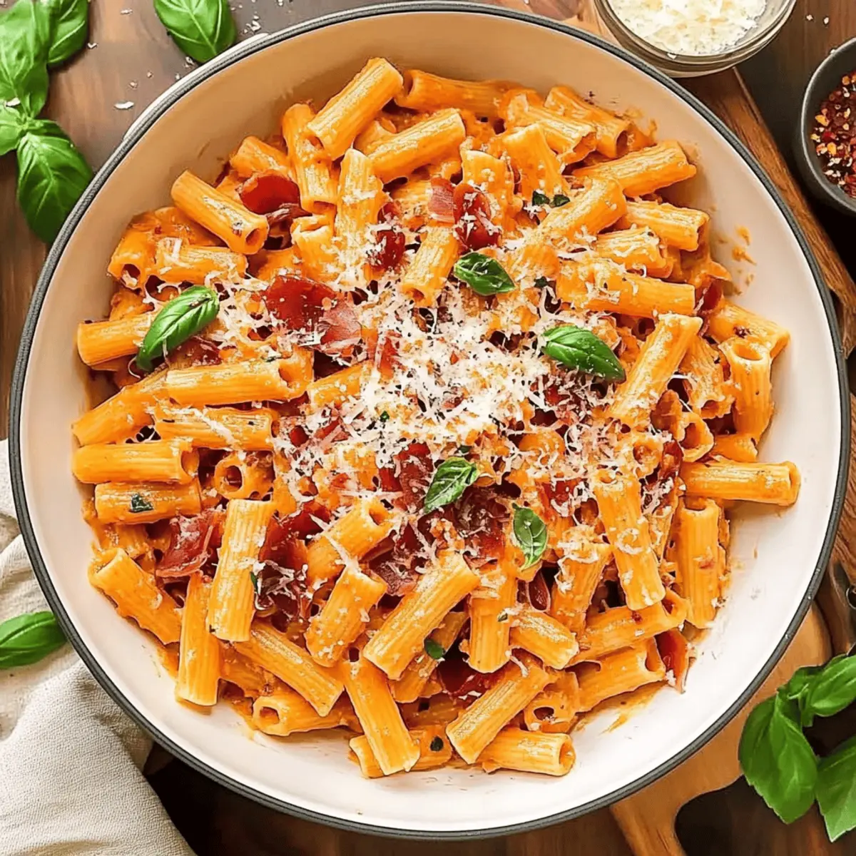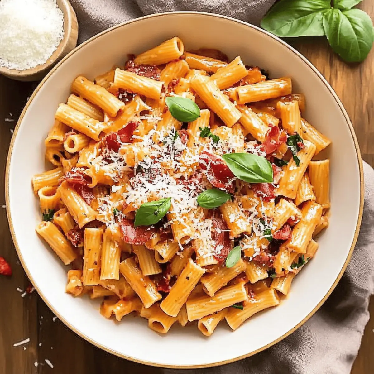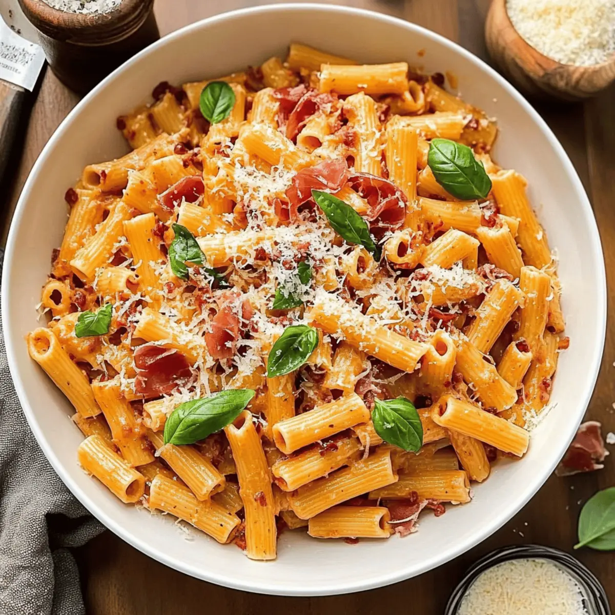 As the water begins to boil, I find myself transported to an Italian trattoria, where the aroma of rich tomato sauce fills the air. That’s the moment I realized that making a comforting dish like Creamy Vodka Pasta with Prosciutto at home is not just a meal—it’s a experience. This recipe offers not only a creamy, luxurious finish but also a delightful kick that keeps everyone coming back for more. With quick prep time and the ability to impress even your most discerning dinner guests, this dish strikes the perfect balance between simplicity and sophistication. Plus, it invites creativity; feel free to swap ingredients and make this pasta your own. Ready to dive into a bowl of comforting goodness? Let’s get cooking! Why Will You Love This Pasta Dish? Irresistible Flavor: The rich, creamy sauce blended with fragrant garlic and a hint of heat from red pepper flakes makes every bite unforgettable. Quick & Easy: With just a few simple steps, you’ll have a stunning pasta dish ready in no time, perfect for busy weeknights or last-minute dinners. Versatile Options: Feel free to personalize your Creamy Vodka Pasta by swapping prosciutto for bacon or trying different pasta shapes like penne. Impress Your Guests: This dish is a showstopper that can elevate any gathering, making you the host with the most. Perfect Pasta Texture: The rigatoni beautifully hugs the sauce, creating a delightful experience with every forkful. Pair it with a side salad or some garlic bread for a complete meal, and don’t forget to check out the Penne Alla Vodka for another fantastic option! Creamy Vodka Pasta Ingredients Get ready to create a delightful dish with these essential ingredients for your Creamy Vodka Pasta! For the Sauce Heavy cream – Adds richness and creaminess; substitute with half-and-half for a lighter option. Vodka – Provides a unique flavor and enhances sauce depth; chicken broth can be used for a non-alcoholic version. Red pepper flakes – Adds gentle heat; adjust to taste or omit for a milder sauce. Fresh basil – Brightens the sauce; dried basil can replace it at a third of the fresh amount. Parmesan cheese – Enhances flavor; freshly grated is best for optimal taste. Butter – Offers a flavorful base; use olive oil as a lighter substitute. Garlic – Essential for flavor; fresh minced garlic ensures aromatic depth. Crushed tomatoes (canned) – Provides acidity and a rich base; fresh tomatoes can be used when in season. Prosciutto – Adds savory depth; alternatives include bacon or omit for vegetarian options. For the Pasta Rigatoni pasta – The tubular shape catches the sauce beautifully; penne is a suitable substitute. Now that you have your ingredients ready, you’re one step closer to crafting the comforting, rich flavors of Creamy Vodka Pasta that will warm both heart and soul. Step‑by‑Step Instructions for Creamy Vodka Pasta Step 1: Sauté the Aromatics Melt 1/4 cup of butter in a large saucepan over medium heat, allowing it to bubble gently. Add 7 minced garlic cloves and sauté for 2-3 minutes until the garlic is golden and fragrant. The aroma will fill the kitchen, setting the stage for your luxurious Creamy Vodka Pasta. Step 2: Add the Vodka Pour in 1 cup of vodka and stir the mixture well. Let it simmer for about 5 minutes, reducing the liquid by half; you’ll know it’s ready when the strong alcohol scent dissipates, and the sauce begins to thicken slightly. This step builds the unique flavor foundation of your pasta sauce. Step 3: Incorporate the Tomatoes and Spices Stir in a 28-ounce can of crushed tomatoes along with 1/2 teaspoon of red pepper flakes and 2 tablespoons of chopped fresh basil. Season with freshly cracked black pepper to taste. Let this vibrant mixture simmer for 15-20 minutes, observing as it thickens and the flavors meld beautifully. Step 4: Cream and Prosciutto Time About 30 minutes before serving, stir in 1 pint of heavy cream and 1/2 pound of chopped prosciutto. Allow the sauce to simmer gently for another 10 minutes, letting it transform into a rich, creamy concoction. Keep stirring occasionally, ensuring the sauce hugs every morsel of prosciutto evenly. Step 5: Cook the Pasta While the sauce bubbles, bring a large pot of salted water to a boil. Add 2 pounds of rigatoni and cook until al dente, about 10-12 minutes, checking the pasta packages for specific timings. Drain the pasta, allowing a bit of the cooking water to cling, as this will help the sauce adhere better. Step 6: Combine and Serve Toss the hot rigatoni with 1 cup of grated Parmesan cheese in a large bowl, mixing until the cheese begins to melt and coat the pasta. Then, gently fold in the creamy vodka sauce, ensuring every piece is enveloped in the rich flavors. Your Creamy Vodka Pasta is now ready to be plated up and savored! Expert Tips for Creamy Vodka Pasta Use Fresh Ingredients: Opt for fresh garlic and high-quality parmesan to elevate the flavor of your creamy vodka pasta. Control the Heat: Adjust the amount of red pepper flakes to suit your taste; they can be omitted for a milder dish. Don’t Overcook Pasta: Follow package instructions to cook the rigatoni al dente, allowing for the perfect texture that holds the sauce well. Prep Ahead: Make the sauce up to the point of adding cream and prosciutto in advance, saving time on busy nights and enhancing the flavors. Perfect Sauce Consistency: If the sauce becomes too thick after adding cream, add a splash of pasta cooking water for a smoother texture. Experiment with Variations: Make the dish your own by substituting prosciutto with bacon or trying different pasta shapes for a unique twist. How to Store and Freeze Creamy Vodka Pasta Fridge: Store leftovers in an airtight container for up to 3 days. To keep the creamy sauce silky, gently reheat on the stovetop, adding a splash of cream if needed. Freezer: Freeze Creamy Vodka Pasta in a freezer-safe container for up to 2 months. Consider separating the sauce from the pasta 