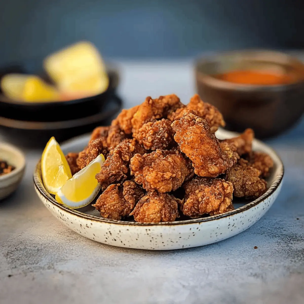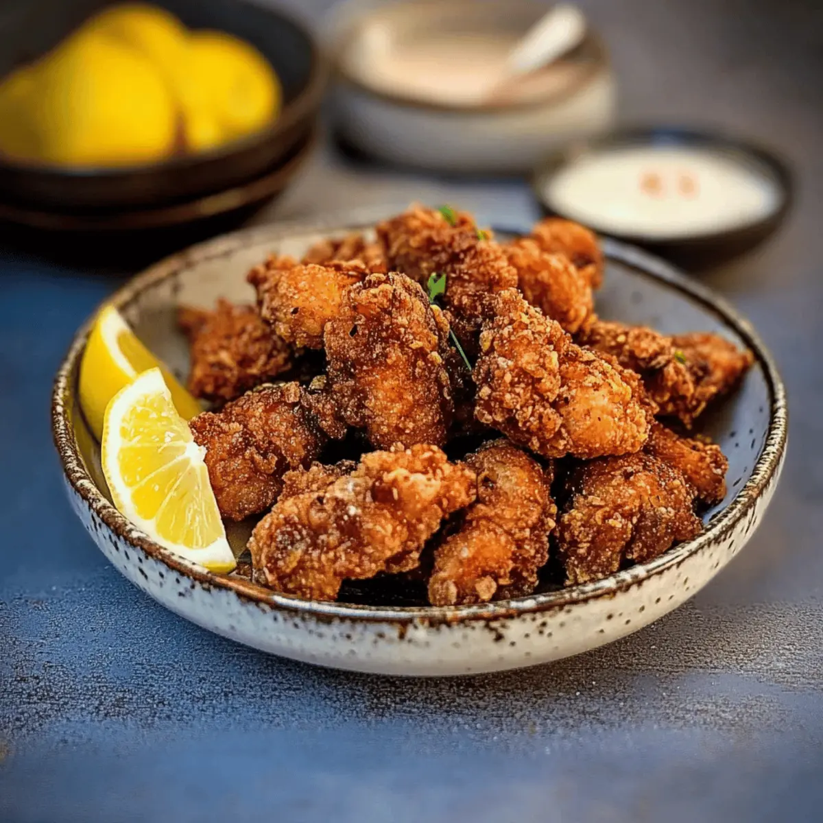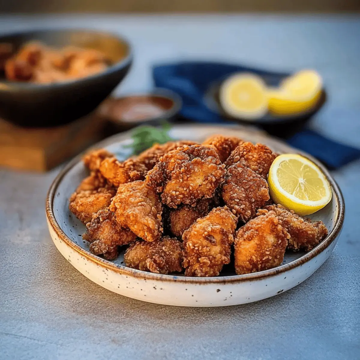 As I stepped into my kitchen, the air was thick with nostalgia and the irresistible scent of ginger and garlic, instantly transporting me to a cozy izakaya in Japan. I couldn’t resist recreating the joy of Crispy Chicken Karaage, that perfect combination of a light, crunchy exterior and tender, juicy chicken inside. This dish not only satisfies your cravings for comfort food but also doubles as an impressive centerpiece for gatherings. Even better, I’ve included simple methods for both deep frying and air-frying, so you can whip it up just the way you like. Whether it’s a casual weeknight meal or a fun appetizer to share, this versatile delight will have everyone coming back for more. Ready to impress your family with something truly special? Let’s dive in! Why is Crispy Chicken Karaage a Must-Try? Flavorful, Juicy Chicken: The marinated thighs soak up a delightfully savory blend of garlic, ginger, and soy sauce, ensuring every bite is bursting with flavor. Crispy Textures: Achieving that perfect crunch is easy, whether you choose deep-frying or the lighter air-fryer option; both methods result in a satisfying exterior. Versatile Dish: Perfect for appetizers or main courses, serve it over rice or transform it into sliders for your next gathering. Quick and Easy: With a little marinating time, you can have this mouth-watering dish ready in just about an hour—ideal for busy weeknights! Crowd-Pleasing Delight: Impress your family and friends with this restaurant-quality recipe that is bound to become a favorite; it’s a dish everyone will undeniably love! If you’re hunting for more crispy chicken options, don’t forget to check out my recipe for Crispy Oven Baked Chicken Tenders and Chicken Katsu for tantalizing twists! Crispy Chicken Karaage Ingredients For the Marinade Dark Soy Sauce – Provides depth and umami flavor; substitute with light soy sauce for a less intense flavor. Honey (or Sugar) – Adds sweetness to balance the savory marinade; agave nectar works great for a vegan option. Garlic (6 cloves, minced) – Contributes aromatic flavor; fresh garlic is preferred for the best taste. Fresh Ginger (2 tbsp, finely grated) – Adds a warm spice and fragrance; ground ginger can be a last-minute substitute. Sake (1 tbsp) or Dry Sherry/Vermouth – Provides acidity and enhances flavor; white wine vinegar can be used if you’re out of sake. For the Chicken Skinless Boneless Chicken Thighs (450 g) – Known for juicy flavor; you can use chicken breasts, but they may result in drier meat. For the Coating Potato Starch (30 g, or Corn Starch) – A key coating agent that delivers extra crispiness; cornflour works well too. Flour (30 g) – Adds structure to the coating; consider using gluten-free flour for a gluten-free version. For Cooking Sunflower Oil – Essential for frying; vegetable oil or canola oil are good substitutes. Enjoy making the perfect Crispy Chicken Karaage with these ingredients, and get ready to savor every crunchy bite! Step‑by‑Step Instructions for Crispy Chicken Karaage Step 1: Prepare the Chicken Start by cutting the skinless boneless chicken thighs into uniform bite-sized pieces, ensuring to remove any visible fat for a cleaner taste. Arrange the pieces in a mixing bowl to make marinating easier, and set aside as you prepare the marinade. Step 2: Marinate the Chicken In a separate bowl, combine minced garlic, honey, dark soy sauce, sake, and finely grated ginger to create a flavorful marinade. Add the chicken pieces to the marinade, making sure they are well coated. Cover and refrigerate for at least 1 hour; this allows the flavors to deeply penetrate the chicken, enhancing the taste of your Crispy Chicken Karaage. Step 3: Mix the Coating Once marinated, prepare the coating by mixing potato starch and flour in a shallow dish. This blend helps achieve that signature crispy texture. Just before frying, take the marinated chicken from the fridge and lightly coat each piece with the flour and starch mixture, ensuring an uneven covering for the extra crunch. Step 4: Heat the Oil In a heavy-bottomed pot or deep pan, pour enough sunflower oil to submerge the chicken and heat it to 160–165°C (320–329°F). Use a kitchen thermometer to check the temperature accurately. This temperature is perfect for the first fry, creating a tender yet crispy crust. Step 5: First Fry Carefully add the coated chicken pieces to the hot oil in small batches, making sure not to overcrowd the pot. Fry for about 90 seconds, or until the chicken is lightly golden. Once done, gently remove the chicken and set it aside on a plate lined with paper towels to absorb any excess oil. Step 6: Increase Oil Temperature Raise the oil temperature to 190°C (375°F) for the final fry, which will give your Crispy Chicken Karaage that delightful golden crisp. Monitor the heat closely using your thermometer, ensuring a consistent temperature for even frying. Step 7: Second Fry Return the initial batch of fried chicken to the hot oil and fry for an additional 45 seconds to 1 minute. Keep a close eye on them, looking for a deep golden color that indicates they’re perfectly cooked. Ensure the internal temperature reaches 75°C (165°F) for food safety and optimal juiciness. Step 8: Drain and Serve Using a slotted spoon, transfer the fried chicken to a plate lined with paper towels to drain any leftover oil. This step is crucial for maintaining that crunchy exterior. Serve immediately with lemon wedges, a sprinkle of Japanese Seven Spice, and a side of wasabi mayo for a deliciously zesty touch. Expert Tips for Crispy Chicken Karaage • Consistent Oil Temperature: Use a digital thermometer to keep oil at the right temperatures during both frying phases to ensure crispy chicken karaage. • Avoid Overcrowding: Fry in small batches to maintain oil temperature. Overcrowding will lower the heat, making your chicken soggy instead of crispy. • Uneven Coating: Coat the chicken lightly but unevenly