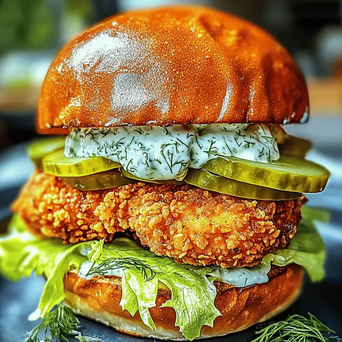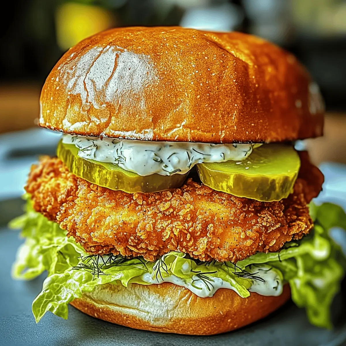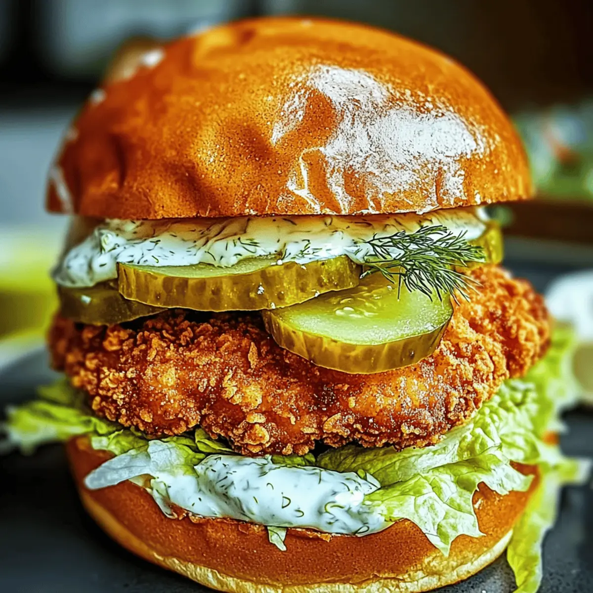 The aroma of sizzling chicken fills the air as I pull together my go-to quick lunch: the Crispy Dill Chicken Sandwich. This delightful creation features tender chicken cloaked in a golden panko crust, perfectly paired with zesty homemade dill mayo. It’s not just a meal; it transforms an ordinary lunch into a gourmet experience, elevating your taste buds with every crunch. What I love most is its incredible versatility—whether you’re in a rush or looking to impress, this sandwich is quick to prepare and absolutely satisfying. Plus, it’s a crowd-pleaser that you can easily customize, making it a perfect choice for family gatherings or weeknight dinners. Are you ready to bite into a flavor-packed adventure? Let’s dive into the recipe! Why is this sandwich a must-try? Quick and Easy: This recipe is perfect for busy weekdays, allowing you to whip up a delicious lunch in no time without sacrificing flavor. Zesty Homemade Mayo: The homemade dill mayo is a game changer, adding a creamy, tangy twist that elevates the entire sandwich! Versatility: Customization is a breeze—try swapping in whole wheat flour for a gluten-free option or Greek yogurt for a lighter version. Crowd-Pleaser: Ideal for family gatherings or casual get-togethers, the Crispy Dill Chicken Sandwich is loved by everyone! Perfect Pairings: Serve it with crispy sweet potato fries or fresh coleslaw for a complete meal that packs a punch. Crispy Dill Chicken Sandwich Ingredients For the Chicken • Chicken Breasts – Primary protein source, providing juiciness and tenderness. Substitution: Use boneless, skinless chicken thighs for richer flavor. • All-Purpose Flour – Coating base for adherence and golden crust. Substitution: Whole wheat flour for a healthier alternative. • Salt – Enhances overall flavor profile. • Black Pepper – Adds mild heat to the dish. • Garlic Powder – Provides a mellow garlicky aroma. • Onion Powder – Contributes sweet and savory depth. • Dried Dill – Infuses an herby, citrusy note into the coating. • Eggs – Binds coating to chicken, keeping it moist. Substitution: Egg alternatives for a lighter option. • Milk – Adds silkiness to the egg wash for better adhesion. • Panko Breadcrumbs – Ensures a crispy exterior that stays crunchy. • Vegetable Oil – For frying; prevents burning due to high smoke point. Substitution: Canola or peanut oil. For the Sandwich • Brioche Buns – Soft, buttery base; toast for enhanced texture. • Mayonnaise – Base for the dill mayo; creamy foundation. Substitution: Use Greek yogurt for a lighter option. • Fresh Dill – Provides bright flavor in the dill mayo. • Lemon Juice – Adds acidity to balance richness of mayo. • Shredded Lettuce – Adds refreshment and crunch. • Dill Pickles – Adds tangy acidity and texture. Embark on your culinary journey with these delicious ingredients for a mouthwatering Crispy Dill Chicken Sandwich! Step‑by‑Step Instructions for Crispy Dill Chicken Sandwich Step 1: Prepare Chicken Begin by slicing the chicken breasts in half horizontally to create thinner cutlets, then pound them to a uniform ½ inch thickness using a meat mallet or rolling pin. This helps achieve even cooking and tenderness. Set aside while you prepare the coating, ensuring the chicken is ready for that crispy bite in your Crispy Dill Chicken Sandwich. Step 2: Mix Coating In a shallow dish, combine all-purpose flour, salt, black pepper, garlic powder, onion powder, and dried dill. Whisk the mixture until well blended to ensure an even coating on the chicken. This blend not only adds flavor but also enhances the crispy texture, making your sandwich irresistible. Step 3: Prepare Egg Wash In another bowl, whisk together the eggs and milk until the mixture is smooth and frothy. This egg wash creates the perfect adhesive for the panko breadcrumbs to cling to the chicken, which is essential for that satisfying crunch in your Crispy Dill Chicken Sandwich. Step 4: Coat Chicken Dredge each chicken cutlet in the flour mixture, shaking off any excess, then dip into the egg wash until fully coated. Finally, press the chicken into the panko breadcrumbs, ensuring an even layer covers each piece. This three-step coating process is key to achieving that golden, crispy exterior. Step 5: Heat Oil In a large skillet, pour enough vegetable oil to cover the bottom about ¼ inch deep and heat it over medium-high heat. Use a thermometer to check that the oil reaches around 350°F or tilt the skillet slightly and add a breadcrumb to test; it should sizzle immediately when the oil is ready for frying. Step 6: Fry Chicken Carefully place the coated chicken cutlets in the hot oil, making sure not to overcrowd the pan. Fry for 4-5 minutes on each side, or until they are golden brown and the internal temperature reaches 165°F. This step is crucial for the perfect texture in the Crispy Dill Chicken Sandwich, so watch them closely! Step 7: Make Dill Mayo While the chicken fries, mix mayonnaise, freshly chopped dill, and lemon juice in a small bowl. Stir until well combined, creating a tangy, creamy spread that elevates your sandwich. This dill mayo adds a fresh burst of flavor that complements the crispy chicken beautifully. Step 8: Toast Buns Assemble your sandwich components by toasting brioche buns in a toaster or on a dry skillet until they’re golden brown. This extra step not only enhances the buns’ flavor and texture but also prevents them from getting soggy once the crispy chicken is added. Step 9: Assemble Sandwiches To assemble your Crispy Dill Chicken Sandwich, spread a generous amount of dill mayo on each toasted bun. Layer with shredded lettuce, followed by the crispy chicken cutlet, and top with sliced dill pickles. This layering not only looks appealing but also delivers a fantastic flavor balance with each bite. What to Serve with Crispy Dill Chicken Sandwich The delicious crunch of a crispy dill chicken sandwich is just the b