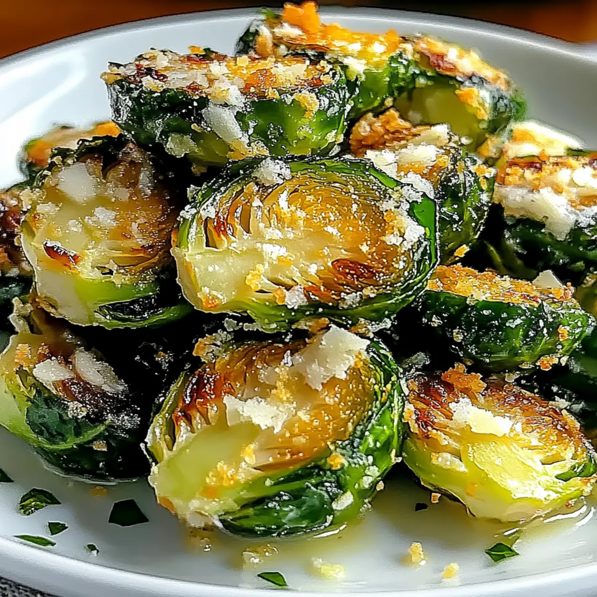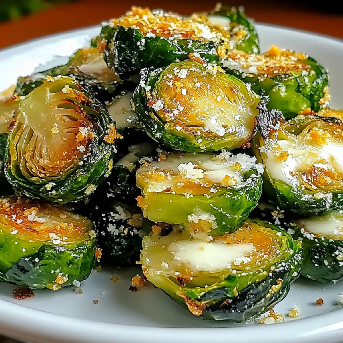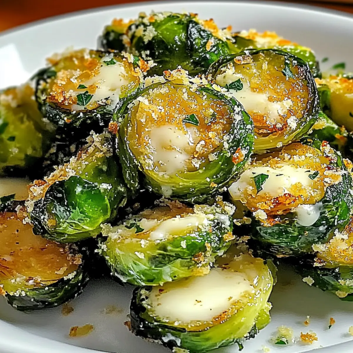 As I tossed the vibrant green Brussels sprouts in a rich garlic-infused olive oil, I could already envision their transformation into something spectacular. This recipe for Crispy Garlic Parmesan Brussels Sprouts is my secret weapon for turning everyday veggies into a golden, crunchy side dish that even non-veggie lovers can’t resist. The best part? It takes mere moments to prepare, making it a fantastic option for busy weeknights or impromptu gatherings. Not only are they a healthier alternative to greasy snacks, but these delightful sprouts can also be dressed up or down to suit any occasion. So, are you ready to elevate your vegetable game with this irresistible dish? Why are Brussels sprouts so delicious? Irresistible Crunch: These Crispy Garlic Parmesan Brussels Sprouts are a game-changer, boasting a satisfying texture that appeals to both veggie enthusiasts and skeptics alike. Minimal Effort: With just a handful of ingredients and a simple roasting method, you can whip up this delectable side dish in no time. Flavor Explosion: The rich combination of garlic, smoked paprika, and nutty Parmesan cheese creates a robust flavor profile that will have everyone asking for seconds. Versatile Serving Options: Pair these sprouts with grilled meats, or serve them as an impressive appetizer at your next gathering! Healthier Snacking: Made with fresh ingredients, they provide a nutritious alternative to traditional fried snacks, keeping your cravings in check without sacrificing taste. Whether you’re enjoying them as a quick weeknight side or as part of a festive spread, these Brussels sprouts will be a hit! If you love simple yet flavorful dishes, check out my recipes for Steak Garlic Parmesan or Garlic Parmesan Cheeseburger for more delicious inspiration! Crispy Garlic Parmesan Brussels Sprouts Ingredients For the Sprouts • Brussels Sprouts – Choose fresh, firm sprouts that are deep green for the best flavor. • Olive Oil – Use high-quality extra virgin olive oil to ensure a crispy texture and rich taste. • Garlic (4 cloves, minced) – Freshly minced garlic adds savory depth and aroma to the dish. • Salt (1 tsp) – Enhances all the flavors, making every bite more delicious. • Black Pepper (1/2 tsp, freshly cracked) – Introduces warmth and complexity to balance the richness. • Smoked Paprika (1 tsp) – Adds a hint of smokiness that elevates the overall flavor profile. • Parmesan Cheese (1/2 cup, freshly grated) – This provides a cheesy, savory finish that melts beautifully during roasting. For Optional Enhancement • Balsamic Vinegar (optional, 2 tbsp) – A drizzle at the end adds a tangy depth to complement the flavors. • Fresh Parsley (for garnish) – Brightens up the dish with a touch of color and freshness. These Crispy Garlic Parmesan Brussels Sprouts are not only delicious but also a healthy choice for your next meal! Step‑by‑Step Instructions for Crispy Garlic Parmesan Brussels Sprouts Step 1: Preheat Your Oven Begin by preheating your oven to 425°F (220°C). This high temperature is essential for achieving that irresistible crunch in your Crispy Garlic Parmesan Brussels Sprouts. While the oven heats up, line a baking sheet with parchment paper to prevent sticking and ensure easy cleanup later. Step 2: Prepare the Brussels Sprouts Rinse the fresh Brussels sprouts under cold water and trim off the stem ends. Remove any damaged or yellowing leaves for the best flavor and texture. Once cleaned, cut each sprout in half lengthwise to maximize the roasting surface area, which will make them even crispier. Step 3: Toss the Sprouts In a large mixing bowl, add the halved Brussels sprouts along with olive oil, minced garlic, salt, black pepper, and smoked paprika. Toss everything together until the sprouts are evenly coated. This step is crucial, as the oil and spices will enhance the flavor and help achieve that golden-brown exterior during roasting. Step 4: Arrange on the Baking Sheet Carefully arrange the Brussels sprouts cut side down on the prepared baking sheet, making sure they are in a single layer without overcrowding. This allows the heat to circulate freely and ensures each sprout gets that lovely golden color. Step 5: Roast the Sprouts Place the baking sheet in the preheated oven and roast the Brussels sprouts for 20–25 minutes. About halfway through the cooking time, flip the sprouts to ensure even browning and crispiness. You want them to be tender on the inside with a lovely crispy exterior. Step 6: Add the Parmesan Cheese During the last 5 minutes of roasting, sprinkle the freshly grated Parmesan cheese over the sprouts. This will melt beautifully and create a cheesy, savory topping that elevates your Crispy Garlic Parmesan Brussels Sprouts to a whole new level. Keep an eye on them to prevent burning. Step 7: Serve and Garnish Once they’re done, remove the Brussels sprouts from the oven and let them cool for a moment. For an extra burst of flavor, drizzle with balsamic vinegar and garnish with fresh parsley if desired. Your crispy, cheesy masterpiece is now ready to be enjoyed as a delightful side dish or snack! What to Serve with Irresistibly Crispy Garlic Parmesan Brussels Sprouts Elevate your meal with perfect pairings that will make your taste buds sing. Grilled Chicken: Juicy, marinated chicken complements the crunchy, cheesy sprouts beautifully, making for a well-balanced plate. Steak Frites: The rich flavors of a perfectly cooked steak elevate the dish while the Brussels add a delicious, crunchy contrast. Lemon Herb Quinoa: This light, citrusy side introduces a fresh element, enhancing the savory richness of the sprouts. Roasted Sweet Potatoes: The natural sweetness of tender, caramelized sweet potatoes provides a delightful balance to the salty Parmesan. For an impressive touch, serve these sprouts alongside a charcuterie board filled with assorted meats and cheeses. The interplay of flavors will enthrall your guests. Crisp White W