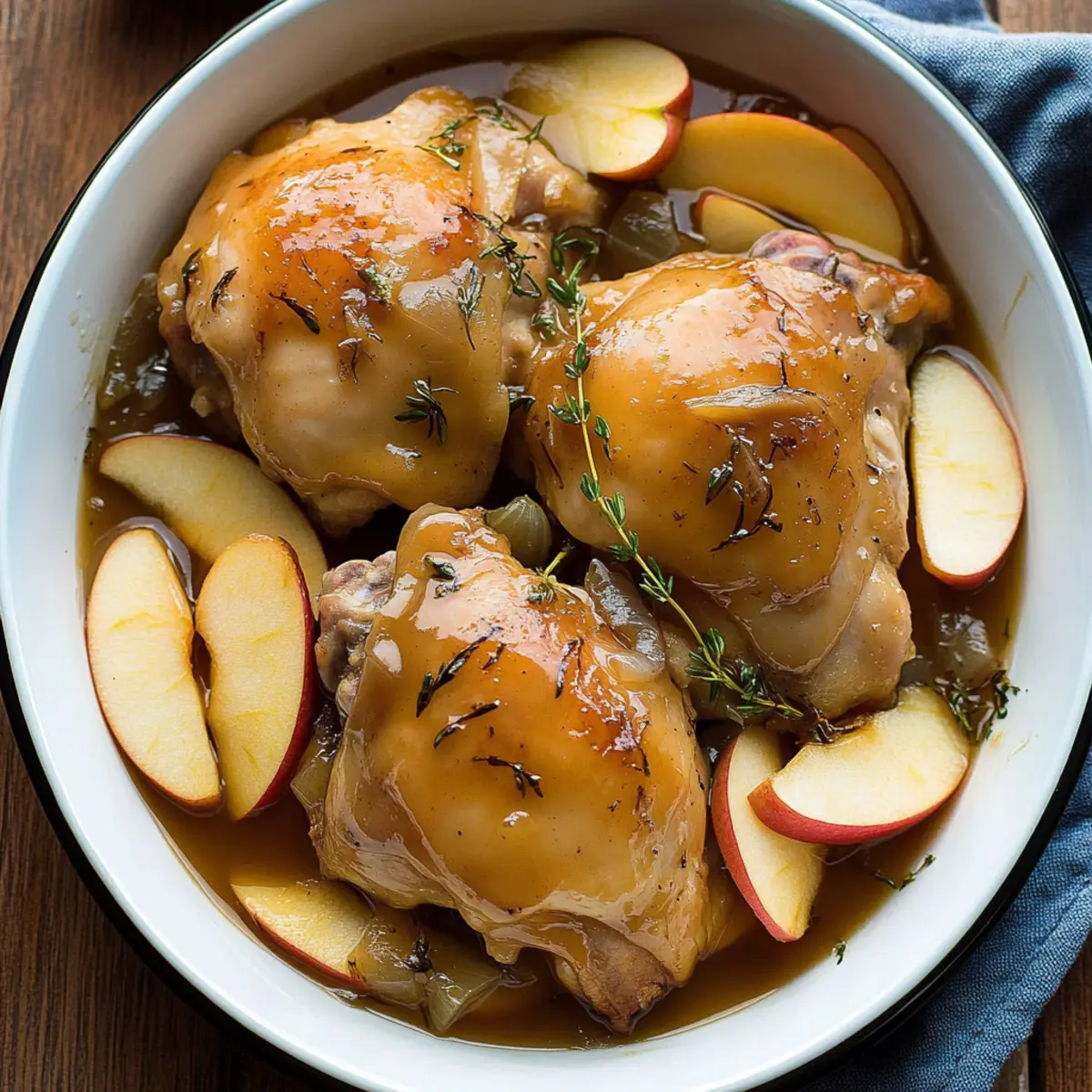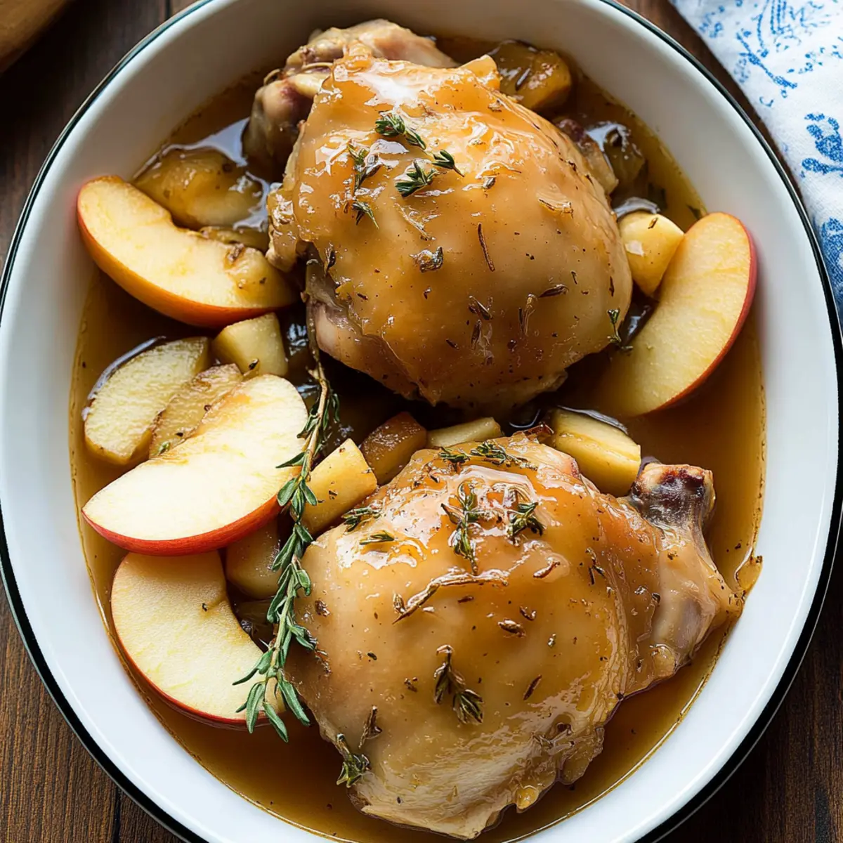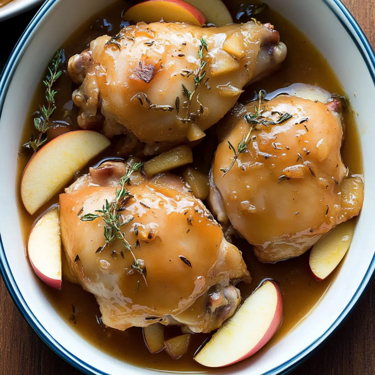 The familiar scent of autumn wafts through my kitchen, a gentle reminder that comfort can be created with just a few simple ingredients. This is precisely what my Crockpot Apple Cider Chicken Thighs offer: a cozy, throw-it-all-in dish that effortlessly transforms your home into a warm haven. With its rich, savory-sweet notes and tender chicken that practically melts in your mouth, this easy-to-make recipe is perfect for both busy weeknights and lazy weekends. Not only does it delight the palate, but it also requires minimal prep time, allowing you to focus on savoring those precious moments with family and friends. Don’t you just love a meal that warms the heart and fills the belly? Let’s get cooking! Why is this chicken recipe so special? Simplicity at Its Best: The magic of this Crockpot Apple Cider Chicken lies in its effortless preparation, making it approachable for even novice cooks. Flavor Explosion: A delightful mix of sweet apple cider and aromatic herbs creates a sublime taste that’s comforting and addictive. Versatile Serving Options: Pair it with creamy mashed potatoes or crusty bread, ensuring something delightful for everyone at the table. Perfect for Any Day: Whether it’s a bustling weeknight or a leisurely weekend, this recipe gives you a warm, cozy meal with minimal fuss. Crowd-Pleasing Dish: With its rich flavors and tender chicken, it’s bound to impress family and friends alike, making it a go-to for gatherings or intimate dinners. If you’re in the mood for another delightful chicken dish, check out our Sweet Chili Chicken or explore a comforting plate of Smothered Chicken and Rice. Crockpot Apple Cider Chicken Ingredients For the Chicken Boneless, Skinless Chicken Thighs – 2 lbs; these retain moisture beautifully during slow cooking. For the Sauce Apple Cider – 2 cups; the main liquid that tenderizes the chicken and creates a mouthwatering sauce. Dijon Mustard – 1 tbsp; adds a tangy kick that beautifully complements the sweetness of the dish. Apple Cider Vinegar – 1 tbsp; balances the sweetness; feel free to use white wine vinegar as a substitute. Brown Sugar – 1 tbsp; enhances the dish’s sweetness; coconut sugar works as a non-refined alternative. Salt – 1 tsp; essential for enhancing the flavors; adjust according to your taste preference. Black Pepper – ½ tsp; freshly ground pepper offers the best flavor; it’s a must for seasoning. For the Aromatics Honeycrisp Apples – 2 medium; their natural sweetness and tartness elevate the dish; gala or Fuji would work too. Yellow Onion – 1 large; brings a depth of flavor; substitute with a sweeter onion if desired. Garlic – 3 cloves, minced; imparts a delightful aroma and taste; always use fresh for the best results. Fresh Rosemary – 1 tbsp; adds an aromatic touch; you can opt for dried rosemary (1 tsp) if needed. Fresh Thyme – 1 tbsp; pairs beautifully with the savory notes; dried thyme (1 tsp) is also a suitable alternative. For Cooking Olive Oil – 1 tbsp; prevents sticking in the crockpot; avocado oil can be used if preferred. This Crockpot Apple Cider Chicken is sure to become a household favorite, bringing warmth and flavor to your dinner table! Step‑by‑Step Instructions for Crockpot Apple Cider Chicken Thighs Step 1: Prep Ingredients Start by thinly slicing two medium Honeycrisp apples and one large yellow onion. Mince three cloves of fresh garlic to enhance the dish’s flavor. This initial prep will ensure all ingredients blend perfectly in your Crockpot Apple Cider Chicken Thighs, creating a well-balanced taste. Step 2: Make Sauce In a mixing bowl, whisk together two cups of pure apple cider, one tablespoon of Dijon mustard, and one tablespoon of apple cider vinegar until fully combined. Add one tablespoon of brown sugar, one teaspoon of salt, and half a teaspoon of black pepper, stirring until the sugar dissolves. This tangy-sweet sauce is essential for our Crockpot Apple Cider Chicken Thighs. Step 3: Layer in Crockpot Drizzle one tablespoon of olive oil at the bottom of your crockpot to prevent sticking. Begin layering by placing the sliced onions and apples to create a flavorful base. Carefully place the seasoned chicken thighs on top, ensuring they’re evenly spread. Sprinkle one tablespoon each of fresh rosemary and thyme over the chicken, then pour the cider sauce and add the minced garlic on top for a rich flavor infusion. Step 4: Cook Cover the crockpot with its lid, set it to low heat, and let it cook for 6 hours, or if you’re pressed for time, on high for 3 hours. You’ll know it’s ready when the chicken is tender and easily shreds with a fork, and the sauce has thickened slightly. The enticing aroma of the Crockpot Apple Cider Chicken Thighs will fill your kitchen as it cooks. Step 5: Serve When cooking time is complete, carefully remove the lid and ladle the apple cider sauce and soft apples over the tender chicken thighs. This dish pairs wonderfully with creamy mashed potatoes or warm, crusty bread to soak up the delicious sauce. Enjoy this comforting meal that reminds you of home! Crockpot Apple Cider Chicken Variations Feel free to customize this delicious recipe with these simple and delightful twists that will elevate your dining experience! Chicken Breasts: Swap chicken thighs for breasts; adjust cooking time to avoid drying out the meat. Breasts are leaner and can still absorb all those marvelous flavors. Fruit Twist: Replace Honeycrisp apples with juicy pears for a unique sweetness that pairs well with savory chicken. This change will bring a lovely, aromatic profile to your dish. Herb Boost: Add a few sprigs of fresh sage along with thyme and rosemary for added depth. Sage has a robust flavor that complements the sweetness of the cider wonderfully. Heat Up: Toss in a sprinkle of red pepper flakes for a gentle kick. This subtle heat balances the sweetness beautifully and adds an unexpected layer of flavor. Rich Sauce: Enhance the sauce by adding a