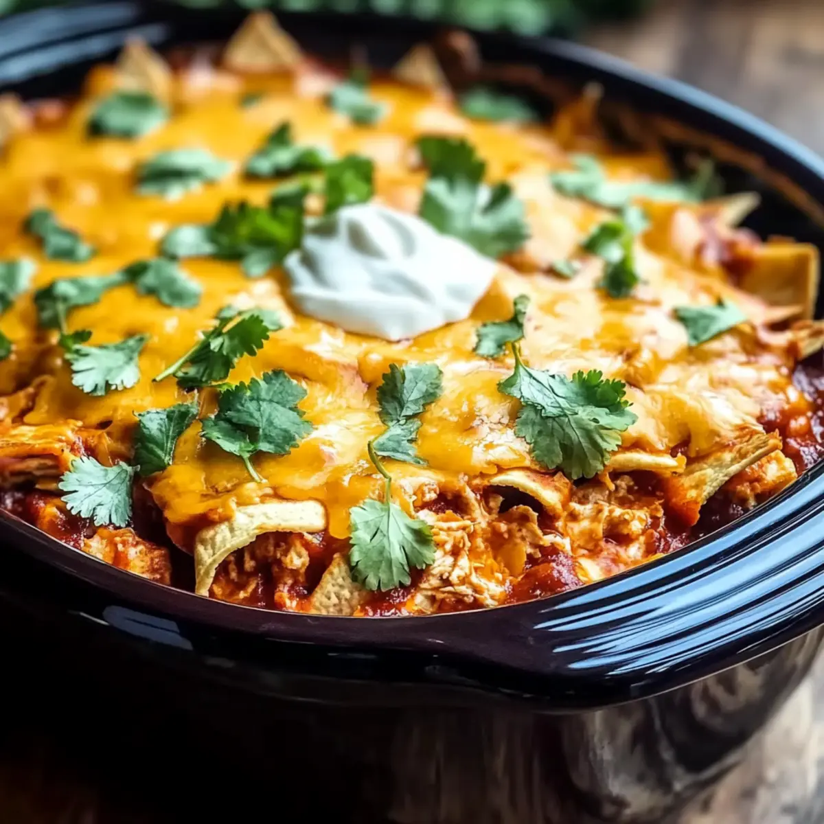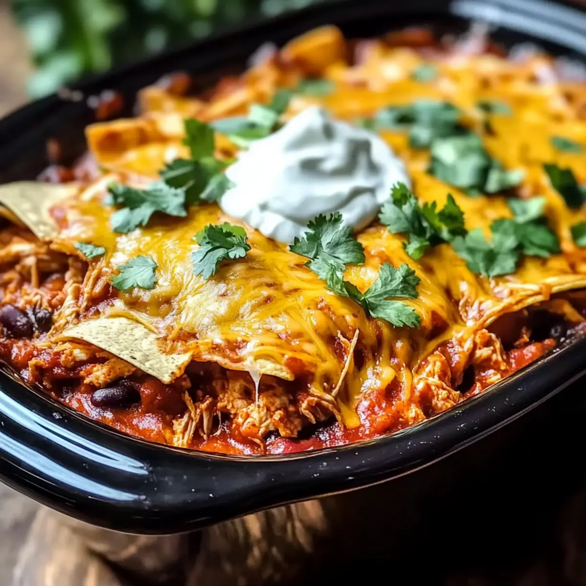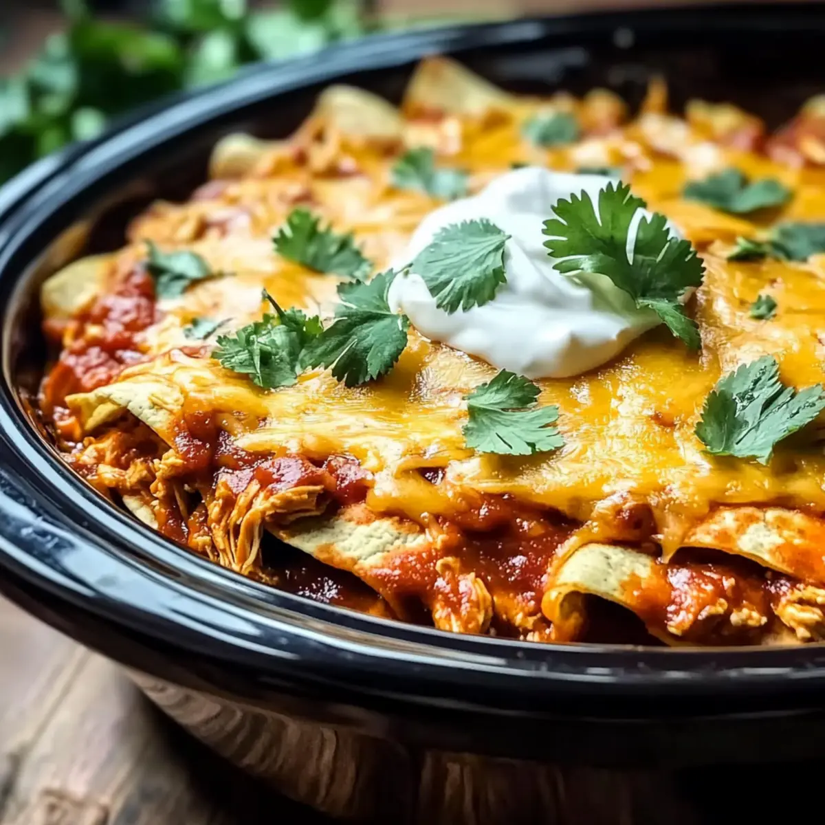 The tantalizing aroma of slow-cooked goodness wafts through my kitchen as the day winds down, and it instantly draws my family around the table. That’s the magic of my Crockpot Chicken Enchilada Casserole, an easy recipe that combines tender chicken, zesty enchilada sauce, and gooey cheese into a comforting meal perfect for busy weeknights. With minimal prep time—including the option to customize with your favorite veggies—this gluten-free dish is a total crowd-pleaser! The best part? You can set it and forget it, allowing those rich, hearty flavors to meld beautifully without demanding all your attention. Just imagine the smiles as you serve up warm, soothing portions, topped with fresh cilantro and a dollop of sour cream. Curious about how something so comforting can be so easy? Let’s dive into this irresistible recipe! Why is This Casserole a Must-Try? Effortless Preparation: Simply layer the ingredients in your slow cooker, giving you more time to relax while it cooks to perfection. Bold Flavors: The combination of zesty enchilada sauce and creamy cheese offers a deliciously rich experience that your taste buds will adore. Customizable Options: Want to make it vegetarian? Swap chicken for beans and veggies! Craving more spice? Add some cayenne or different cheese types for a bolder twist. Crowd-Pleasing Appeal: This dish brings everyone together for a comforting meal, making it perfect for family dinners or gatherings with friends. Meal Prep Friendly: Make it ahead of time and enjoy the convenience of having leftovers throughout the week or freeze for an easy meal later. Whether you’re also a fan of Cheesy Chicken Enchiladas or looking for something to pair with a fresh green salad, this Crockpot Chicken Enchilada Casserole is sure to delight! Crockpot Chicken Enchilada Casserole Ingredients • Get ready to cook up comfort! For the Casserole Chicken Breast – The star protein of this dish; can be replaced with ground turkey or beef for a different twist. Enchilada Sauce – It adds that signature flavor and moisture; feel free to use homemade or your favorite store-bought brand. Cheese – For maximum creaminess, a mixture of cheddar and Monterey Jack is highly recommended. Beans – Packed with fiber and protein; black beans or kidney beans make great substitutes. Tortillas – They provide essential structure; opt for gluten-free tortillas if needed to keep it fitting dietary restrictions. Bell Peppers/Zucchini (optional) – These add nutrition and color; consider using corn if you want a touch of sweetness instead. Smoked Paprika (optional) – It gives a nice depth of flavor; regular paprika works just as well in a pinch. For Serving Cilantro – Adds freshness that brightens every bite; optional, but definitely recommended! Sour Cream – A lovely creamy addition, balancing out the flavors beautifully—optional based on your preference. Step‑by‑Step Instructions for Crockpot Chicken Enchilada Casserole Step 1: Prep the Chicken and Veggies Begin by shredding 2-3 cooked chicken breasts using two forks until it’s easily pulled apart. If you’re adding vegetables like bell peppers or zucchini, chop them into bite-sized pieces. This step ensures your Crockpot Chicken Enchilada Casserole has a delightful mix of flavors and textures, providing a solid foundation for your layers. Step 2: Layer the Ingredients In your slow cooker, start layering by placing half of the gluten-free tortillas at the bottom. Top them with half of the shredded chicken, followed by half of the enchilada sauce, a can of beans, and a generous layer of cheese. This layering process builds the rich flavor profile of your casserole, creating hearty bites packed with goodness. Step 3: Repeat the Layering Process Now, repeat the layering with the remaining tortillas, chicken, enchilada sauce, beans, and cheese. Make sure to cover all layers evenly for consistent cooking. As the Crockpot Chicken Enchilada Casserole cooks, these ingredients will meld together beautifully, ensuring every scoop is deliciously satisfying. Step 4: Cook on Low Cover the slow cooker and set it to low heat for 5 hours. This gentle cooking allows the flavors to infuse while keeping the chicken tender and juicy. You’ll know it’s ready when the cheese is bubbling and slightly golden on top, signaling a beautifully cooked casserole waiting to be enjoyed. Step 5: Optional Crispy Finish For a delightful crispy top, consider transferring your casserole to an air fryer for an additional 5–10 minutes at 375°F. This optional step turns your Crockpot Chicken Enchilada Casserole into an irresistible dish with a crunchy crust that contrasts perfectly with the gooey filling below. Step 6: Serve and Garnish Once cooked, remove the lid and let it sit for a few minutes before serving. Dish out warm portions and top each with fresh cilantro and a dollop of sour cream, if desired. These garnishes elevate the flavors, providing a refreshing contrast to the hearty casserole—which makes each bite delightful! Make Ahead Options These Crockpot Chicken Enchilada Casserole components are perfect for meal prep, saving you time on busy weeknights! You can prep the shredded chicken, chopped vegetables, and layer the casserole up to 24 hours in advance. Simply place the assembled layers (tortillas, chicken, enchilada sauce, beans, and cheese) in the slow cooker insert and cover tightly. When you’re ready to cook, just plug in your slow cooker and set it to low for 5 hours. This method ensures that the flavors meld beautifully while maintaining the casserole’s delicious, gooey texture, making it taste just as fantastic as if it were freshly made. Enjoy the ease and convenience of a comforting meal without the last-minute rush! How to Store and Freeze Crockpot Chicken Enchilada Casserole Fridge: Transfer cooled leftovers to an airtight container. They can be stored in the refrigerator for up to 3-4 days, ensuring freshness for your next mea