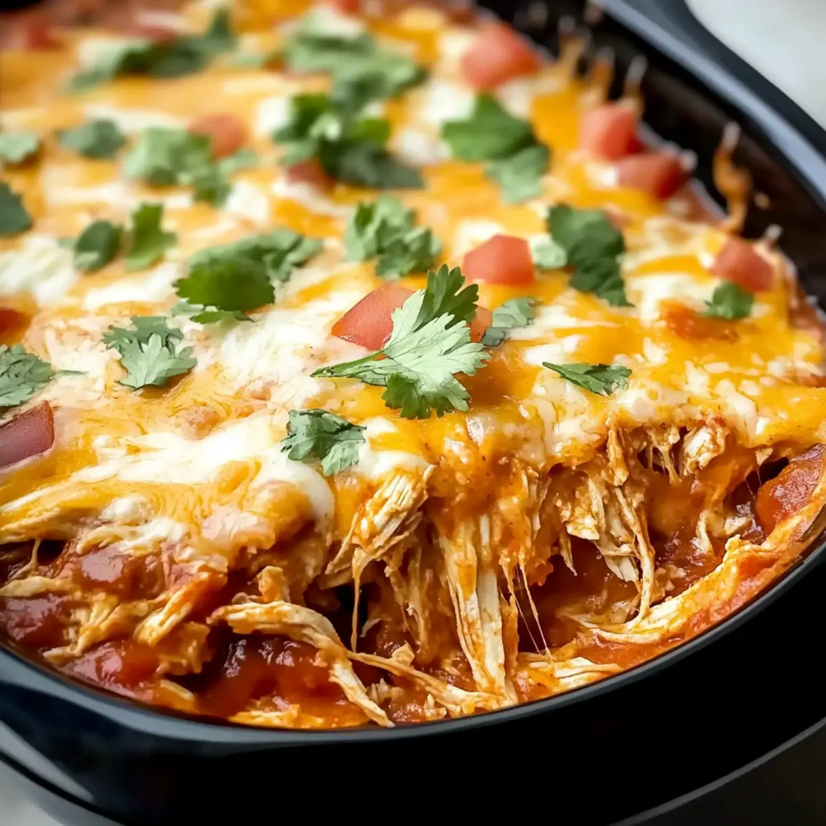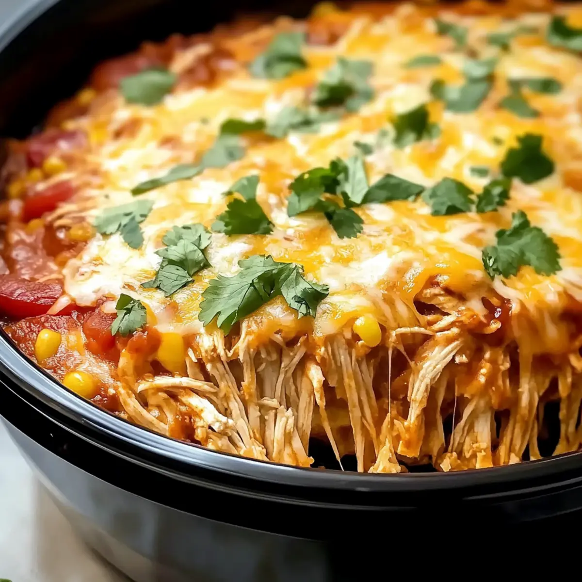 The aroma of comfort fills the air as I dive into the depths of my slow cooker, ready to create a meal that transforms any busy weeknight into a cozy gathering. This Easy Slow Cooker Chicken Enchilada Casserole is my go-to dish that marries simplicity with flavor, pulling together tender, shredded chicken, gooey cheese, and just the right hint of spice. Not only does it save precious time in the kitchen—just dump the ingredients and let the magic happen—but it’s also a surefire crowd-pleaser that even the pickiest eaters will adore. Plus, it’s perfect for meal prep, ensuring that leftovers taste just as delightful the next day. So, what are you waiting for? Let’s stir up some deliciousness! Why is this casserole a weeknight hero? Simplicity Personified: Just toss everything into the slow cooker and let it work its magic—no intricate steps or fancy skills required! Flavorful Layers: The combination of tender chicken with a rich enchilada sauce and gooey cheese brings a deliciously satisfying experience. Perfect for Meal Prep: Make ahead and enjoy scrumptious leftovers throughout the week—each bite tastes just as good the next day. Customizable Goodness: Switch up the ingredients! Use beans or corn for added texture, or swap out for whole wheat tortillas for a healthier twist. Crowd-Pleaser: Whether you’re feeding a family or hosting friends, this dish will have everyone coming back for seconds! Pair with a side of fresh toppings like sour cream and avocado for the ultimate comfort meal, and don’t forget to check out my tasty recipes for Cheesy Chicken Enchiladas or Chicken Pot Pie for more cozy options! Crockpot Chicken Enchilada Casserole Ingredients • Get ready to gather these simple staples! For the Chicken Boneless, Skinless Chicken Breasts – The main protein source; fresh or thawed frozen chicken works best for even cooking. Taco Seasoning – Adds essential spice; store-bought is convenient, but homemade can offer a personalized flavor. Salt and Black Pepper – Enhances overall taste; feel free to adjust according to your preference. For the Sauce Red Enchilada Sauce (2 cans, 10 oz each) – Serves as the base, bringing moisture and a kick of flavor; choose between mild or spicy based on your family’s taste. Diced Tomatoes with Green Chiles (1 can, 10 oz, drained) – Infuses the casserole with tang and texture; be sure to drain well to avoid excess liquid. For the Base Corn Tortillas (12 oz, cut into wedges) – Acts as a structural base for the casserole; fresh tortillas are optimal, but stale ones hold up well too. For the Cheese Fiesta Blend Shredded Cheese (2 cups, divided) – Adds creaminess and flavor; reserve half for topping to avoid a rubbery texture. This easy Crockpot Chicken Enchilada Casserole is all about comfort and convenience! Step‑by‑Step Instructions for Crockpot Chicken Enchilada Casserole Step 1: Prepare the Slow Cooker Begin by spraying the inside of your slow cooker with a nonstick cooking spray. This step ensures that your delicious Crockpot Chicken Enchilada Casserole won’t stick to the bottom, making it easier to serve and clean. Once prepped, set the slow cooker aside while you gather the main ingredients. Step 2: Season the Chicken Place the boneless, skinless chicken breasts evenly at the bottom of the slow cooker. Generously sprinkle the taco seasoning, salt, and black pepper over the chicken, ensuring an even distribution to infuse flavor during cooking. This will create a flavorful base for your casserole as it simmers in the crockpot. Step 3: Add the Sauces Pour the red enchilada sauce and the drained diced tomatoes with green chiles over the seasoned chicken. Gently stir to combine without disturbing the chicken too much. The sauce will add moisture and flavor to the Crockpot Chicken Enchilada Casserole, so make sure to cover the chicken completely with the sauce mixture before proceeding. Step 4: Cook Low and Slow Secure the lid on your slow cooker and set it to cook on low for 4 to 5 hours. This low and slow method will allow the chicken to become tender and easy to shred. While it cooks, a wonderful aroma will fill your kitchen, beckoning everyone to gather around the dinner table. Step 5: Prepare the Tortillas While your chicken is cooking, take this time to cut the corn tortillas into wedges. Aim for uniform pieces to ensure even distribution throughout the casserole. Once ready, set the tortilla wedges aside, ready to be mixed in later to add texture to your dish. Step 6: Shred the Chicken After cooking for the designated time, check that the chicken is cooked through and tender. Using two forks, shred the chicken directly in the slow cooker, mixing it into the sauce. Add in half of the cheese and the prepared tortilla wedges, gently folding everything together to combine these ingredients for a flavorful and hearty mixture. Step 7: Layer with Tortillas and Cheese Once thoroughly mixed, smooth the chicken and tortilla mixture into an even layer in the slow cooker. Add any remaining tortilla wedges on top of the mixture, followed by the remaining shredded cheese. This creates a delicious, cheesy topping that will melt and bubble beautifully during the final cooking phase. Step 8: Final Cooking Phase Cover the slow cooker once more and continue cooking on low for an additional 30 minutes. This step allows the cheese to melt perfectly, creating a delightful and gooey topping for your Crockpot Chicken Enchilada Casserole. Keep an eye on it and resist the urge to lift the lid, as this can prolong cooking time. Step 9: Rest Before Serving Once the cooking time has elapsed, turn off your slow cooker and allow the casserole to rest for about 10 minutes. This resting period lets the flavors meld together beautifully, making it easier to scoop out servings. Get ready to enjoy a warm, satisfying meal your family will love! How to Store and Freeze Crockpot Chicken Enchilada Casserole Fridge: Store leftovers in an airtight 