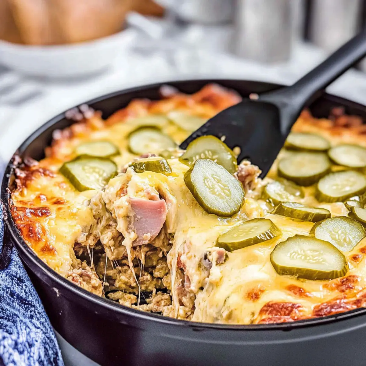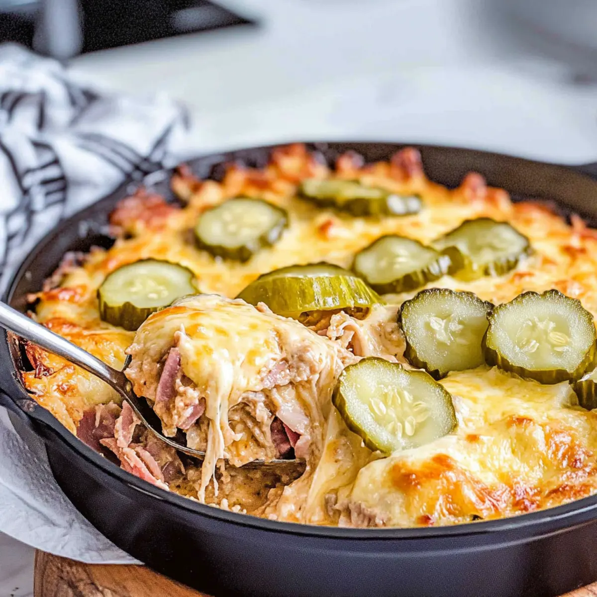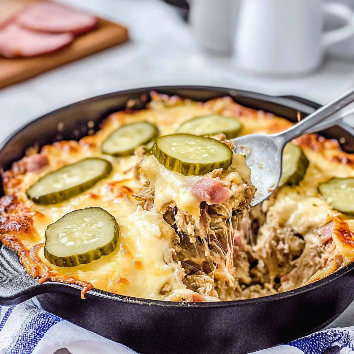 As I stood in my kitchen, the aroma of sizzling pork and creamy sauce began to weave its way through the air, instantly wrapping me in a comforting embrace. This 30-Minute Cuban Casserole is my go-to recipe when I crave something that feels both satisfying and a little indulgent. With its delectable layers of tender pulled pork, savory ham, and gooey Swiss cheese, it transforms leftovers into a glorious feast. What’s even better? You’ll whip it up in no time, making it the perfect answer to busy weeknights or unexpected guests. Plus, it’s gluten-free and keto-friendly, so everyone can dig in without worry. How can you resist the enticing thought of a casserole that combines the flavors of a classic Cuban sandwich with ease and pleasure? Let’s dive into this culinary delight together! Why is This Cuban Casserole a Must-Try? Quick Preparation: You’ll love how effortless this dish is, ready in just 30 minutes, making it a lifesaver on busy evenings. Savory Layers: The combination of pulled pork and ham creates a rich, flavorful base that packs a punch with every bite. Creamy Goodness: With a luxurious sauce made from cream and cheese, it’s comfort food at its finest, reminiscent of the beloved Cuban sandwich. Diet-Friendly: This casserole is both gluten-free and keto-friendly, allowing everyone, including fans of Pot Pie Casserole and Croissant Breakfast Casserole, to indulge without guilt. Versatile Toppings: Pair it with crunchy dill pickles for an extra layer of flavor and texture that’s simply irresistible! Cuban Casserole Ingredients For the Casserole • Prepared Pulled Pork – This is the main protein source; use leftover pulled pork for the best flavor. • Sliced Ham – Adds a savory layer to enhance the pulled pork; opt for thinly sliced deli ham. • Shredded Swiss Cheese – Provides creaminess and a melt-in-your-mouth texture; shred your own for optimal melting. • Whipping Cream – Creates a rich and creamy sauce; ensure it’s full-fat for the best consistency. • Cream Cheese – Thickens the sauce and adds creaminess; soften it before mixing for smooth integration. • Yellow Mustard – Adds tanginess to the sauce; this ingredient replicates the flavor profile of a Cuban sandwich. • Sliced Dill Pickles – Offers tartness and crunch; avoid relish to prevent excess moisture. • Additional Pickles for Garnish – Use fresh dill pickles for an extra flavor boost upon serving. Step‑by‑Step Instructions for 30-Minute Cuban Casserole Step 1: Preheat the Oven Begin by preheating your oven to 375°F (190°C). This crucial step ensures that your Cuban casserole will bake evenly, resulting in a perfectly bubbly and golden top. While the oven heats up, gather your ingredients and equipment, including a large oven-safe skillet, which will be essential for cooking and baking your dish. Step 2: Prepare the Sauce In your preheated skillet, combine the whipping cream, cream cheese, and yellow mustard over medium heat. Stir continuously for about 3–5 minutes until the mixture is melted and smooth, creating a rich and creamy sauce that will envelop your Cuban casserole beautifully. Watch for bubbling around the edges to know it’s ready for the next step. Step 3: Mix in Meats and Pickles Once your sauce is ready, lower the heat and add the prepared pulled pork, diced ham, and half of the sliced dill pickles to the skillet. Stir well, ensuring that all the ingredients are evenly coated in the creamy sauce. After about 2 minutes of gentle mixing, the ingredients should be heated through and well combined, ready for the cheesy layer. Step 4: Add Cheese and Pickles Sprinkle half of the shredded Swiss cheese over the meat mixture, ensuring it covers the top evenly. Then, add the remaining sliced pickles, adding that essential crunch and tang to your Cuban casserole. This layering not only enhances flavor but also prepares the casserole for the next delicious step. Step 5: Bake for Perfection Transfer the skillet to your preheated oven and bake for 20 minutes, or until the cheese is melted and bubbly with a golden hue. The casserole should start to puff up slightly, giving visual confirmation that it’s becoming the delightful dish you envisioned. Keep an eye on it towards the end for that perfect golden crust. Step 6: Serve and Enjoy After baking, carefully remove the skillet from the oven and allow it to cool for a few minutes. The Cuban casserole will be hot and bubbling, so let it rest before serving. Garnish with additional dill pickles for that final touch of flavor, and get ready to enjoy a comforting meal that resonates with the classic Cuban sandwich experience! Expert Tips for Cuban Casserole Prep Pulled Pork Properly: Ensure your pulled pork is dry and not saucy for the best texture in the Cuban casserole. This keeps it from becoming soggy. Cheese Matters: Grate your Swiss cheese at home rather than using pre-shredded cheese. Homemade shreds melt better and provide a creamier texture. Watch the Pickles: Use sliced dill pickles instead of pickle relish to prevent excess moisture. The tartness from whole pickles enhances the casserole’s flavor beautifully. Adjust Consistency: If your creamy sauce seems too thick after combining ingredients, add a splash of whipping cream to reach your desired consistency. Mind the Oven Temp: Pay attention to your oven’s temperature; a too-hot oven can brown the cheese too quickly while leaving the inside undercooked. Rest Before Serving: Let the casserole cool for a few minutes after baking. This allows the flavors to meld and makes it easier to serve clean portions. Make Ahead Options These Cuban Casserole preparations are a game changer for busy weeknights! You can prepare the creamy sauce by mixing the whipping cream, cream cheese, and yellow mustard, then refrigerate it for up to 24 hours. Additionally, you can combine the pulled pork, ham, and half of the pickles ahead of time, storing this mixture in an airtight co