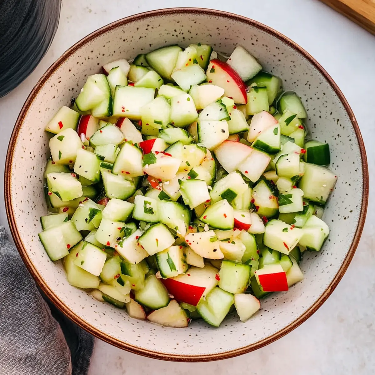 As I took a bite of the crisp Cucumber Apple Salad, the refreshing crunch transported me to a sun-soaked picnic in the park. This delightful blend of cool cucumbers and sweet, juicy apples, all dressed in a light honey-apple cider vinaigrette, is my go-to whenever summer heat hits. Not only is this Cucumber Apple Salad incredibly easy to whip up, but it’s also a light side dish that’s perfect for barbecues and meal preps alike. Plus, it’s vegetarian-friendly, making it an inclusive addition to any gathering! If you’re ready to elevate your salad game and impress your family or guests with something vibrant and delicious, keep reading to see how simple this refreshing recipe can be! Why is this salad a summer favorite? Refreshing, this Cucumber Apple Salad brings a burst of coolness that’s perfect for hot days! Easy to prepare, throw it together in just a few minutes, making it ideal for busy lifestyles. Vegetarian-friendly, it caters to various diets without compromising on flavor. Versatile, pair it with grilled chicken or enjoy it alone as a light snack. Nutrient-rich, each bite is packed with vitamins, ensuring a healthy choice. If you’re in the mood for more delightful dishes, check out this Chicken Salad Light or this refreshing Pesto Pasta Salad. Cucumber Apple Salad Ingredients For the Salad English Cucumber – Provides freshness and crunch; regular cucumbers can also be used, though they may have more seeds. Red Apples – Adds sweetness and texture; opt for sweet varieties like Honeycrisp or Ambrosia for the best flavor. Salt – To taste; enhancing the overall flavor of the Cucumber Apple Salad. Black Pepper – To taste; adds a hint of warmth to the refreshing dish. For the Dressing Honey – Acts as a sweetener to balance acidity; agave nectar or maple syrup can be a vegan-friendly option. Apple Cider Vinegar – Brings brightness and acidity; can be replaced with balsamic vinegar for a different flavor twist. Lemon Juice – Enhances flavor and prevents apple browning; always go for fresh lemon juice for the best taste. Step‑by‑Step Instructions for Cucumber Apple Salad Step 1: Chop the Ingredients Begin by thoroughly washing 1 English cucumber and 2 red apples. Slice the cucumber and apples into small, bite-sized pieces, keeping the skins on for added texture and flavor. Aim for uniform pieces to ensure even distribution in your Cucumber Apple Salad. Place the chopped vegetables and fruits into a large mixing bowl. Step 2: Prepare the Dressing In a separate bowl, whisk together 2 tablespoons of apple cider vinegar, the juice of half a fresh lemon, and 1 tablespoon of honey until fully combined. This dressing will beautifully tie together the flavors of your Cucumber Apple Salad. Make sure the honey is well dissolved and the mixture is smooth, which should take about 30 seconds of vigorous whisking. Step 3: Combine Dressing and Salad Pour the freshly made dressing over the chopped cucumber and apple mixture. Ensure all pieces are well coated; this step is crucial for achieving the perfect flavor in your Cucumber Apple Salad. Use a rubber spatula to scrape down any dressing stuck to the sides of the bowl, ensuring nothing is wasted. Step 4: Season the Salad Sprinkle salt and freshly cracked black pepper over the salad to taste, enhancing the overall flavor profile. Stir gently with a big spoon to distribute the seasoning evenly throughout the Cucumber Apple Salad. Taste a small bite and adjust the seasoning if desired, keeping in mind the balance between sweetness and acidity. Step 5: Toss to Combine Gently toss all the ingredients together until every piece is coated in the dressing. Be careful not to mash the apples or cucumbers; you want to maintain their crunchiness for the best texture. This should take about a minute, and the vibrant colors should meld beautifully at this stage. Step 6: Chill and Serve For the best taste, serve your Cucumber Apple Salad immediately. However, if time allows, cover the salad with plastic wrap and refrigerate for up to 30 minutes. This chilling time helps the flavors meld together harmoniously, creating a refreshing dish perfect for any occasion. Enjoy the burst of summer freshness! What to Serve with Cucumber Apple Salad Elevate your dining experience with delightful pairings that complement the refreshing crunch of this vibrant salad. Grilled Chicken: Marinated grilled chicken pairs wonderfully, adding savory depth to balance the salad’s sweetness. Quinoa Bowl: A hearty quinoa bowl brings a nutty texture and protein punch, perfect for a wholesome meal. Corn on the Cob: Sweet, buttery corn on the cob enhances the summer vibes and provides a warm touch. Pita Chips: Crunchy pita chips serve as an excellent vessel for scooping up this salad, making for delightful finger food. Hummus: Creamy hummus not only adds a Mediterranean flair but also offers a rich, smooth contrast to the crisp salad. Italian Lemonade: Refreshing Italian lemonade brings a zesty sweetness that complements the tangy dressing beautifully. Berry Tart: Finish your meal with a light berry tart; its fruity sweetness pairs harmoniously with the salad’s citrus notes. The combination of textures, flavors, and vibrant colors will create a memorable meal experience! Enjoy! Cucumber Apple Salad Variations Feel free to get creative with your Cucumber Apple Salad by trying out these tasty variations! Nuts: Add walnuts or pecans for a delightful crunch and healthy fats. They’ll bring an earthy richness to each bite. Feta Cheese: Fold in some crumbled feta cheese for a savory twist. Its briny flavor beautifully complements the sweetness of the apples! Colorful Veggies: Mix in any finely chopped vegetables like bell peppers or red onions for added flavor and texture. You’ll enhance the freshness while adding a pop of color. Herbs Boost: Toss in fresh herbs such as mint or basil for an aromatic lift. This will make each bite refreshing and vibrant! Spicy Kick: D