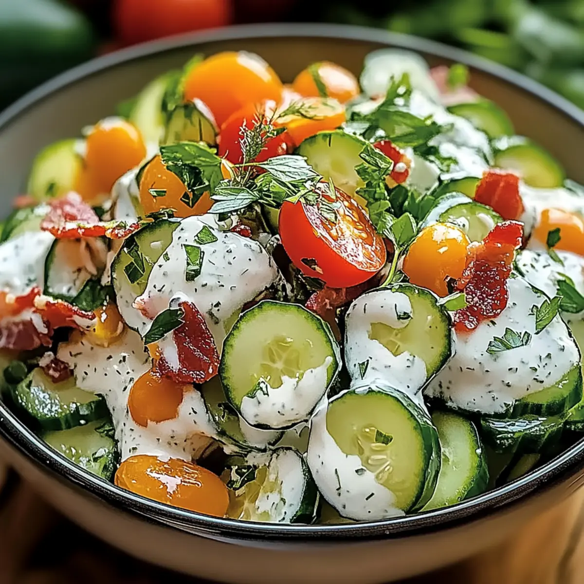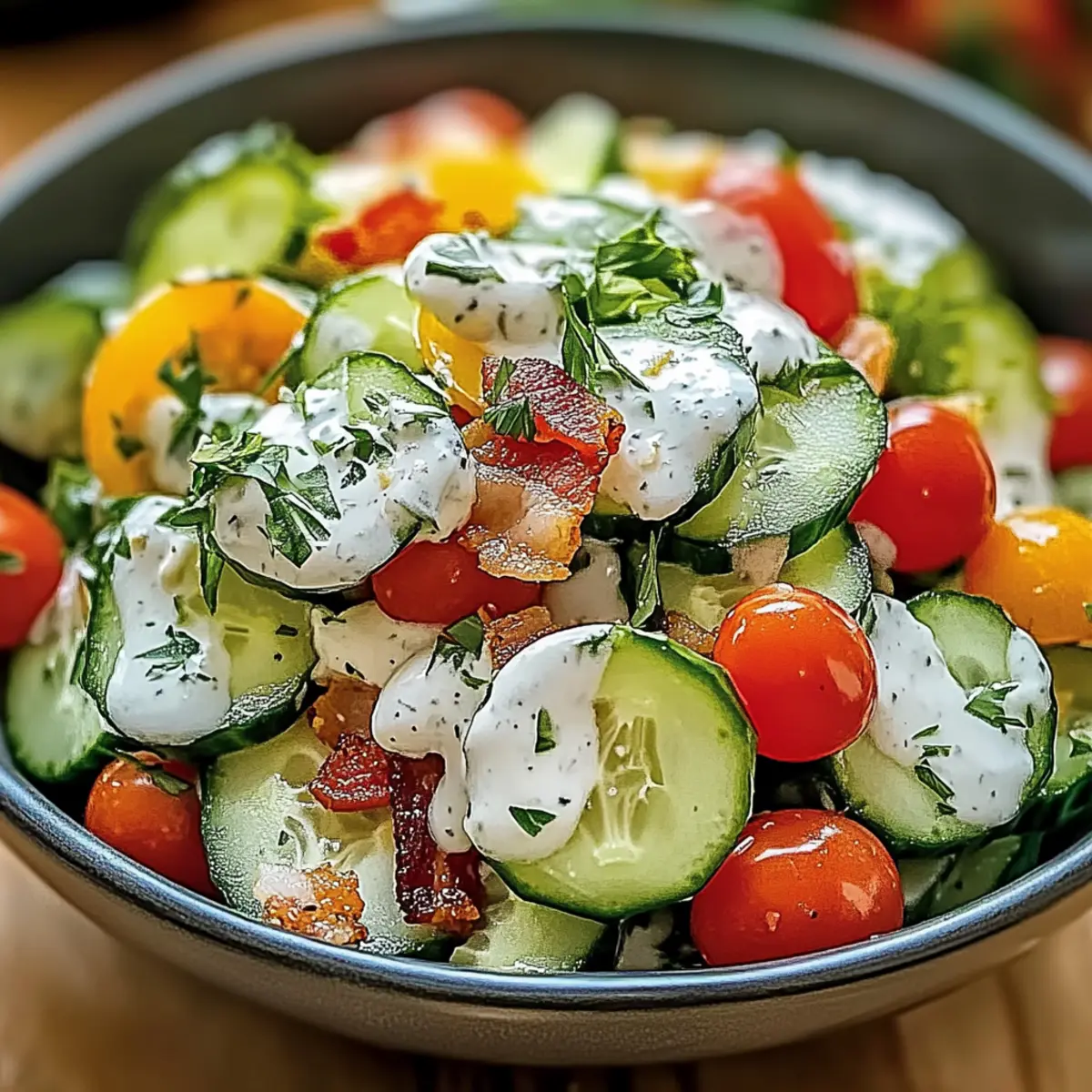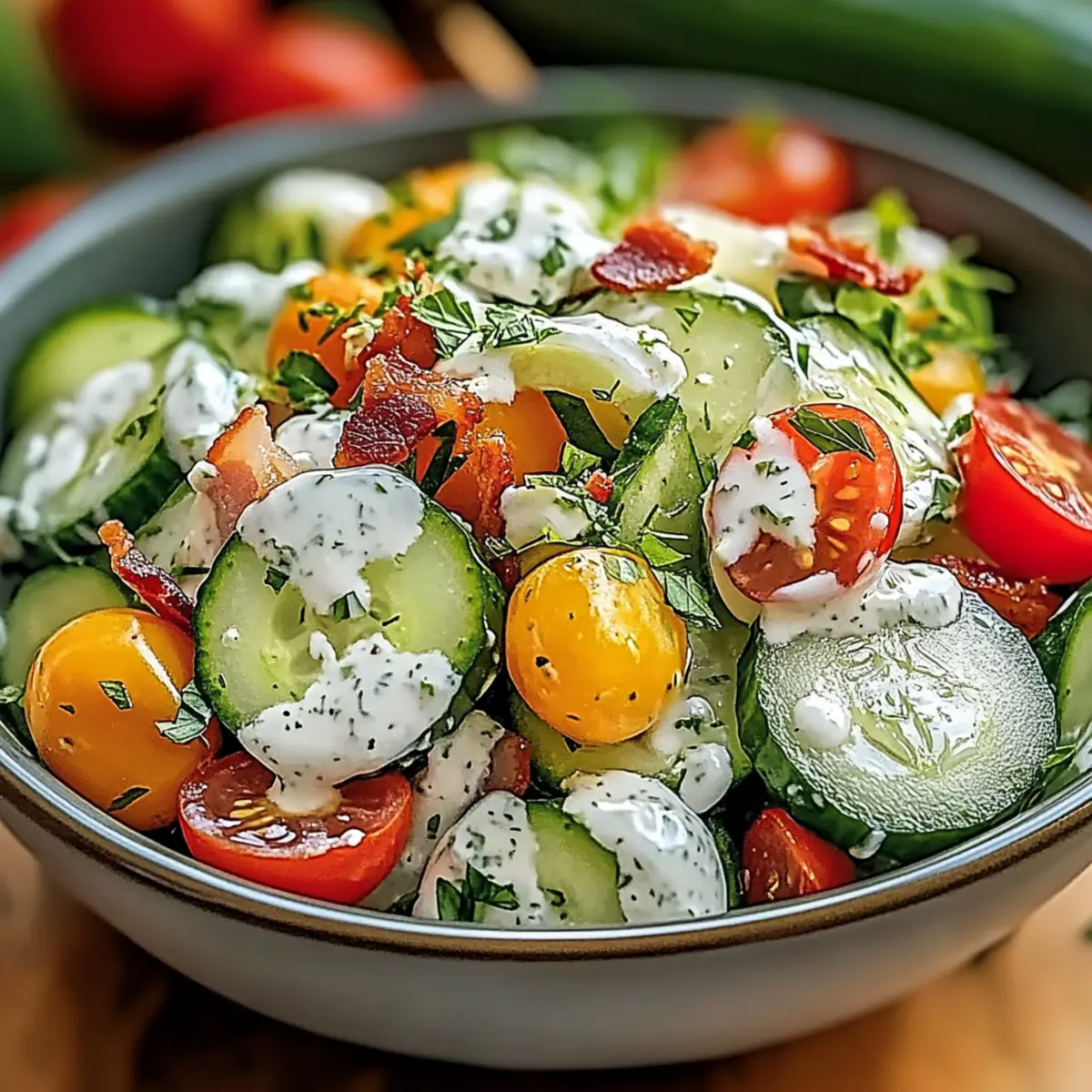“Can you believe how simple it is to whip up a crowd-pleasing dish?” I overheard a friend say while indulging in the delightful Cucumber Ranch Crack Salad at our summer barbecue. This salad isn’t just a refreshing side; it instantly transforms any meal with its vibrant colors and creamy goodness. With the perfect balance of crunchy cucumbers, crispy bacon, and zesty ranch dressing, this quick preparation makes it an ideal go-to for busy days and social gatherings alike. Plus, the customization options are endless—feel free to add your favorite vegetables or even introduce a fruity twist! So, are you ready to impress with this delightful combination? Let’s dive into the easy steps! Why Is Cucumber Ranch Crack Salad Amazing? Crowd-Pleaser: This salad is a guaranteed hit at any gathering, bringing smiles and compliments with every bite. Colorful and Fresh: The bright hues of cucumbers and tomatoes make it a feast for the eyes, elevating your table presentation. Quick Preparation: You can whip this up in no time, making it perfect for those busy days when you need something delicious fast! Customizable Goodness: Whether you prefer a spicy kick with jalapeños or a fruity twist with strawberries, the options are endless! Creamy Delight: The ranch dressing beautifully ties all the ingredients together, creating a luscious, satisfying experience. For more fresh ideas, check out Pesto Pasta Salad or try a lighter option with Chicken Salad Light. Cucumber Ranch Crack Salad Ingredients • Discover what makes this salad irresistible! For the Salad Cucumbers – Use firm, fresh cucumbers for the best crunch. Cherry Tomatoes – Add sweetness and color; any small tomatoes work! Red Onion – Provides zesty flavor; substitute with green onions for a milder taste. Cooked Bacon – Introduces savory crunch; turkey bacon is a great alternative or omit for a vegetarian dish. Shredded Cheese (Cheddar or choice) – Adds creaminess; try feta for a tangy twist. Fresh Dill (or dried) – Enhances flavor with herbal notes; substitute with basil or parsley if preferred. Salt and Pepper – Essential for seasoning; adjust to taste for a personalized flavor profile. For the Dressing Ranch Dressing – The creamy base that delivers luscious goodness; consider using homemade or Greek yogurt-based ranch for a lighter option. This Cucumber Ranch Crack Salad is bound to become a family favorite with its fresh ingredients and customization options! Step‑by‑Step Instructions for Cucumber Ranch Crack Salad Step 1: Prepare the Vegetables Start by washing and dicing 2 firm cucumbers, ensuring they are cut into bite-sized pieces for maximum crunch. Next, rinse about 1 cup of cherry tomatoes, then halve them to release their natural sweetness. These vibrant ingredients form the refreshing base of your Cucumber Ranch Crack Salad, providing not only flavor but also beautiful color. Step 2: Chop the Onion Finely chop 1 small red onion, allowing its zesty flavor to enhance the salad. Aim for small, even pieces so that they distribute well throughout the salad, giving each bite a harmonious balance. If you prefer a milder taste, opt for green onions instead. Set the chopped onion aside, ready to blend with the other fresh ingredients. Step 3: Cook the Bacon In a skillet, cook 4 slices of bacon over medium heat for about 8–10 minutes, turning occasionally until crispy and golden brown. Once cooked, remove the bacon and place it on a paper towel to absorb excess grease. Once cooled, crumble the bacon into small pieces, ready to add savory crunch to your Cucumber Ranch Crack Salad. Step 4: Mix the Vegetables In a large mixing bowl, combine the diced cucumbers, halved cherry tomatoes, and chopped red onion. Use a spatula to gently fold the ingredients together, ensuring an even mix of textures and flavors. This vibrant vegetable medley is the heart of your salad, so take a moment to admire its fresh colors before moving to the next step. Step 5: Add Bacon and Cheese Sprinkle the crumbled bacon over the vegetable mixture in the bowl. Follow by adding about 1 cup of shredded cheese—Cheddar works wonderfully, or feel free to experiment with feta for a tangy twist. Gently toss the ingredients together, allowing the flavors to meld while ensuring the bacon and cheese are evenly distributed throughout the salad. Step 6: Dress the Salad Pour about 1 cup of ranch dressing over the combined vegetables, bacon, and cheese. For added freshness, include 2 tablespoons of chopped dill or a substitute herb of your choice. Stir with a large spoon, folding the mixture carefully to ensure every piece is well-coated with the creamy dressing, resulting in a luscious Cucumber Ranch Crack Salad. Step 7: Season to Taste Sprinkle salt and pepper over the salad to enhance its flavors—start with a pinch of each and adjust to your liking. Mix thoroughly after seasoning to confirm that every bite of your Cucumber Ranch Crack Salad is perfectly seasoned. This simple step lifts the overall taste profile, creating a delightful balance. Step 8: Chill for Flavor Cover the bowl with plastic wrap and place it in the refrigerator for at least 30 minutes. Chilling allows the flavors to meld beautifully, making each bite more harmonious and enjoyable when served. While you wait, this is a great time to prepare any additional sides for your meal. Step 9: Toss Before Serving Before serving, give the Cucumber Ranch Crack Salad a gentle toss to redistribute the dressing and ingredients. This ensures that each scoop is full of flavor and textures. Present it in a decorative bowl for an appealing display, ready to impress your family and guests alike with this refreshing dish! Expert Tips for Cucumber Ranch Crack Salad Fresh Ingredients Matter: Use in-season cucumbers and tomatoes for the best flavor and crunch. Relying on fresh veggies elevates the overall taste of your Cucumber Ranch Crack Salad. Customize Wisely: Feel free to add fruits or herbs, but ens