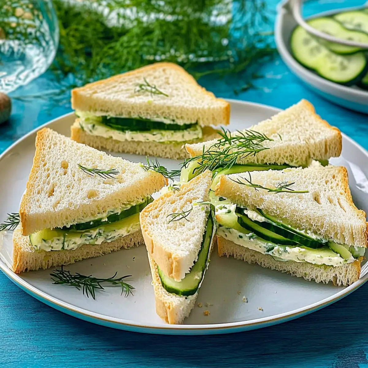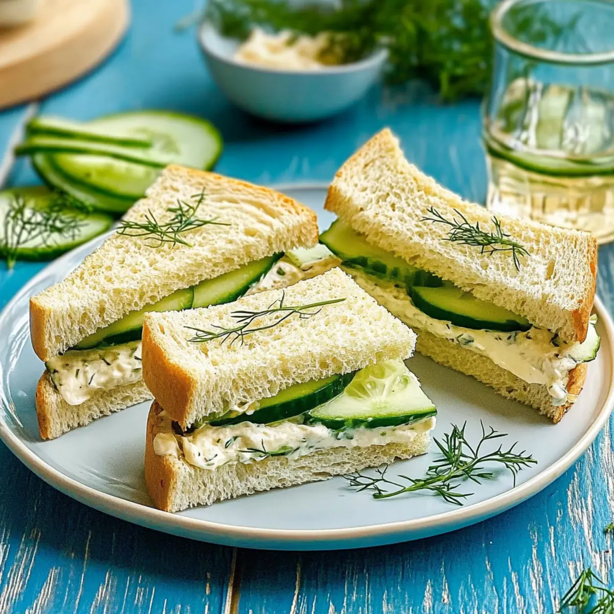 As I spread the creamy filling on soft bread and layer on those crunchy cucumber slices, I can almost hear the clinking of elegant teacups in the background. Cucumber sandwiches are not just delightful finger foods; they embody a slice of tradition that invites a moment of sophistication to any gathering. Whipping up a batch of these classic cucumber sandwiches is a breeze, taking only about 15 minutes and requiring no cooking at all! Perfectly versatile, they can be transformed to suit any palate or occasion, whether you’re hosting a quaint tea party or simply craving a refreshing afternoon snack. Curious to discover how this timeless treat comes together? Let’s dive into the recipe that promises to elevate your snack game! Why choose cucumber sandwiches for your gathering? Light and Refreshing: Enjoy a delightful bite that combines creamy filling with crisp cucumber for a refreshing experience. Quick Preparation: With just 15 minutes needed, you can whip these up in no time—ideal for those spontaneous gatherings! Versatile Options: Feel free to customize; swap herbs or try flavored cream cheeses to make them uniquely yours. Crowd Pleaser: Perfect for tea parties or casual bites, these sandwiches are always a hit and loved by guests of all ages. Convenient Finger Food: No need for utensils—these easy-to-eat delights are perfect for mingling at any event. Serve these delicious cucumber sandwiches alongside your favorite snacks or refreshing beverages, such as Croissant Breakfast Sandwiches. They’re sure to impress! Cucumber Sandwiches Ingredients Here’s everything you need to create these delightful cucumber sandwiches! For the Filling Cream Cheese – Provides a creamy base and great texture; goat cheese can be a tangy alternative. Sour Cream (or Mayonnaise) – Adds richness; for lighter options, consider using Greek yogurt. Dill – Fresh herb that gives a burst of flavor; feel free to substitute with chives or parsley. Kosher Salt – Enhances flavors; regular salt can also be used if that’s what you have on hand. For the Sandwiches English Cucumber – The star vegetable providing crunch and freshness; consider using Persian cucumbers for a different flavor profile. Sandwich Bread – Soft texture supports the filling well; remove crusts for elegance, or use whole grain for a nuttier taste. Step‑by‑Step Instructions for Cucumber Sandwiches Step 1: Prepare the Creamy Filling In a mixing bowl, combine 8 ounces of softened cream cheese, ¼ cup of sour cream (or mayonnaise), 2 tablespoons of chopped fresh dill, and a pinch of kosher salt. Using a hand mixer or a spatula, blend these ingredients until smooth and creamy—a cheerful blend ready to envelop the sandwich bread, making it extra flavorful. Step 2: Spread the Filling Take your soft sandwich bread slices (about 8 in total) and lay them out on a clean surface. Generously spread the cream cheese mixture onto one side of each slice, ensuring an even layer that covers the bread edges. This will create a tasty base for your cucumber sandwiches and help keep everything in place. Step 3: Add the Cucumber Slices Next, wash and thinly slice one English cucumber into rounds, aiming for about ⅛ inch thick for an ideal crunch. Place the cucumber slices evenly over half of the prepared bread slices, slightly overlapping them for a satisfying look. The freshness of the cucumbers will pop against the creamy filling, providing a delightful contrast. Step 4: Assemble the Sandwiches With the cucumber layer in place, take the remaining slices of bread, spread side down, and gently place them on top of the filled bread slices. Press down lightly to help the sandwiches hold together without squishing the filling too much. At this stage, a beautiful collection of cucumber sandwiches will begin to take shape before your eyes. Step 5: Trim and Cut Using a serrated knife, carefully trim off the crusts of each sandwich to give them a refined look. Then, cut each sandwich into quarters—opt for rectangles or triangles, depending on your preference. The finished pieces should be neat and manageable, ideal for snacking or elegant serving at your next gathering. Step 6: Arrange and Serve Finally, artfully arrange the cucumber sandwiches on a serving platter. Optionally, garnish with a sprinkle of extra dill or a few cucumber slices for a decorative touch. These delightful cucumber sandwiches are ready to dazzle your guests and can be enjoyed immediately or chilled for about 15 minutes to enhance the flavors. How to Store and Freeze Cucumber Sandwiches Fridge: Store leftover cucumber sandwiches in an airtight container for up to 1 day. To maintain freshness, place a damp paper towel inside to prevent the bread from drying out. Freezer: For best quality, cucumber sandwiches are not recommended for freezing, as the texture of the bread and cucumbers may suffer. Enjoy them fresh for optimal taste! Make-Ahead: If preparing ahead of time, you can assemble the sandwiches a few hours in advance and refrigerate. However, they are best enjoyed fresh for the ultimate flavor and texture experience. Reheating: These sandwiches are served cold and should not be reheated, as they lose their delightful crunch and refreshing qualities. Cucumber Sandwiches: Creative Twists to Try Customize your cucumber sandwiches with these delightful variations that will elevate your snack experience to new heights! Herb Swap: Replace dill with fresh chives or parsley for a vibrant twist that adds a different flavor profile. Cream Cheese Creations: Try using flavored cream cheeses, like garlic or herb, for an easy and tasty twist! Whole Grain Goodness: Switch to whole grain bread for a heartier texture that complements the crisp cucumbers beautifully. Add Protein: For a heartier sandwich, add thinly sliced smoked salmon or turkey to introduce a savory richness. Spice it Up: Add a dash of cayenne or sprinkle some red pepper flakes to the filling for a touch of heat that 