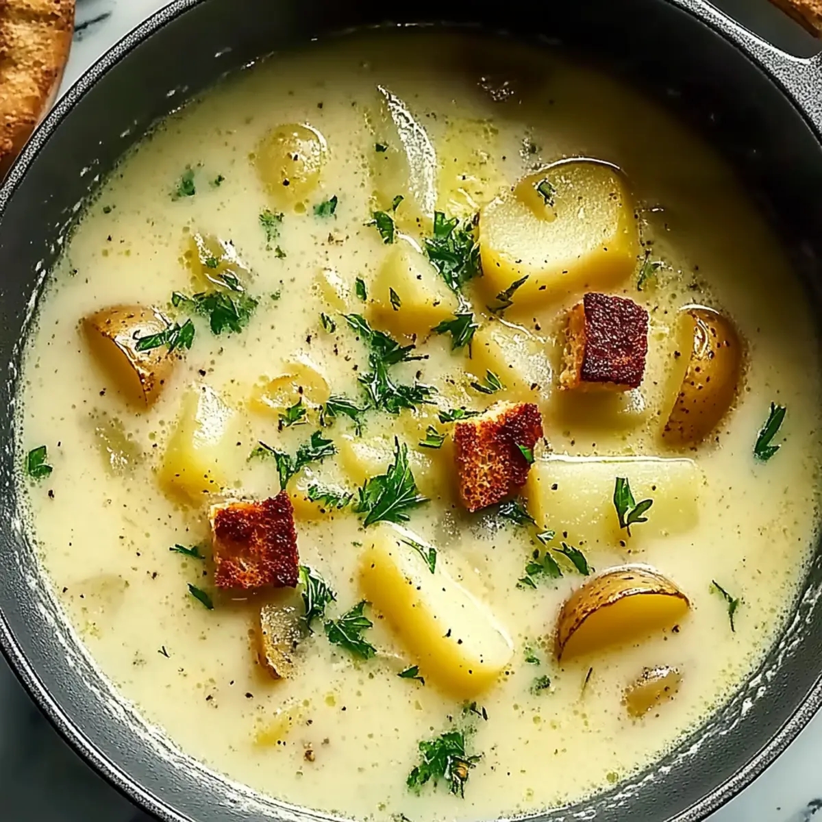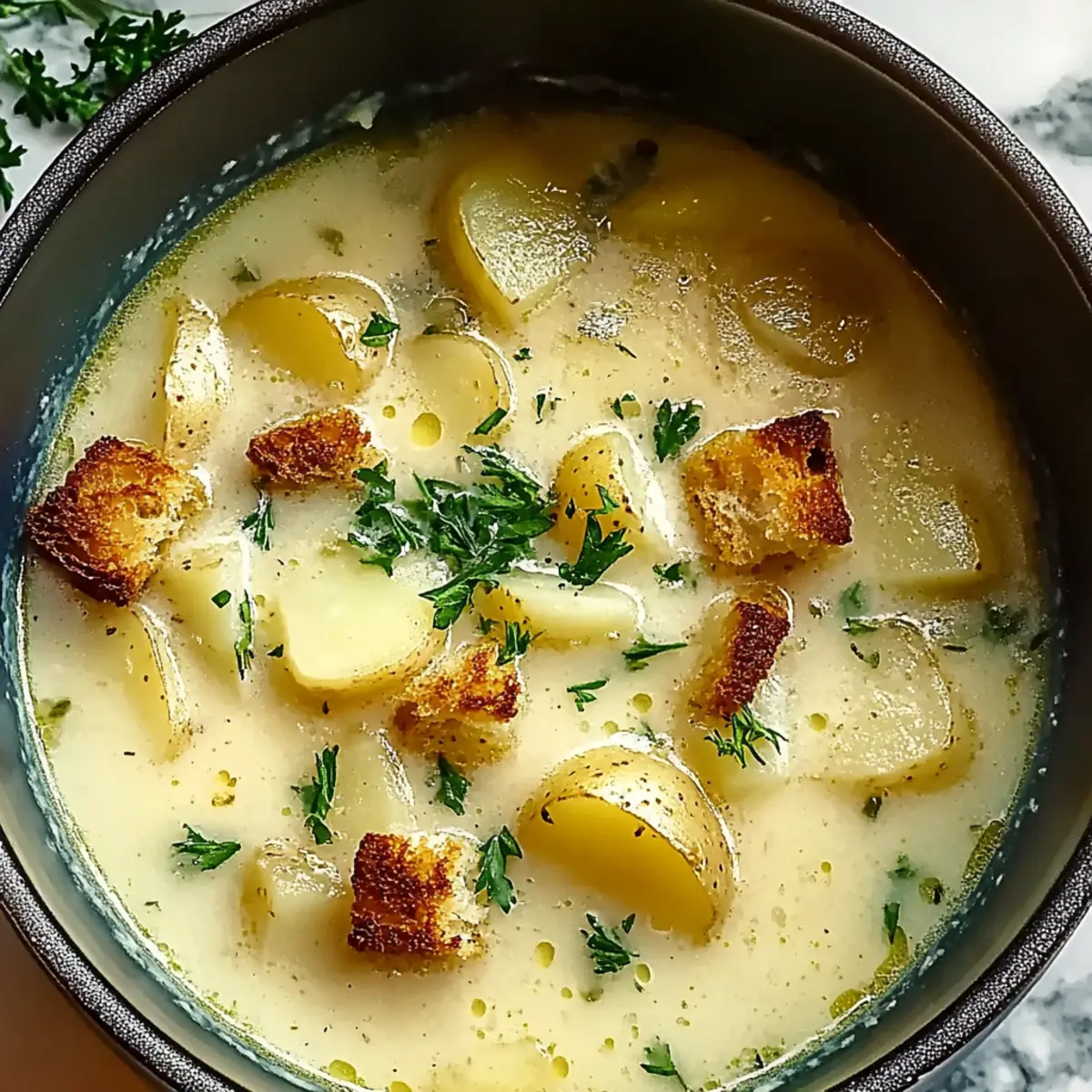The unmistakable aroma of sautéed garlic wafting through the kitchen can instantly lift your spirits and ignite your appetite. If you’re looking for the ultimate comfort food, let me introduce you to my Soothing Hangover Cure Garlic Potato Soup. This creamy concoction is not just a remedy for those nights out that went a little too far—it’s a perfect dinner choice anytime you crave that warm hug from a nourishing bowl. Packed with tender potatoes and the bold flavor of garlic, it’s family-friendly and make-ahead, making life a little simpler when you need it most. Plus, it’s an easy way to serve up some love and coziness in every spoonful. Curious how this soul-soothing soup comes together? Let’s dive in! Why Is Garlic Potato Soup Soothing? Comforting warmth: This soup wraps you in a cozy blanket of flavor, making it perfect for chilly days or recovery moments. Nourishing ingredients: With starchy potatoes and aromatic garlic, each spoonful delivers a burst of healing goodness that’s easy on the stomach. Make-ahead friendly: Prep it in advance and enjoy it whenever the craving strikes, making dinner a breeze after a busy day. Versatile flavors: Customize it with greens or spices to suit your taste—whether it’s a creamy delight or a spicy kick, this soup has got you covered! Crowd-pleaser appeal: Family and friends can’t resist its creamy texture and rich aroma; pair it with crusty bread for a satisfying meal. For a perfect side, consider serving it with Honey Garlic Chicken or some warm rolls for how delectable this comfort dish can truly be! Cure Garlic Potato Soup Ingredients For the Soup Base • Potatoes – Use starchy varieties like Russets or Yukon Gold for the ideal creamy texture in your cure garlic potato soup. • Onion – Adds a lovely sweetness and depth when sautéed to perfection. • Garlic – The star ingredient; roast it beforehand for a smoother, sweeter taste. • Olive Oil – Used for sautéing; it enhances the richness of the soup. • Vegetable Broth – This builds the savory foundation of your soup; adjust salt levels accordingly. • Salt – Add in stages for balanced flavor. For the Garnish • Fresh Parsley – A pop of color and freshness to brighten up your soup. • Optional Croutons – Adds delightful crunch and texture contrast. • Optional Grated Cheese – A touch of richness that complements the creamy soup beautifully. With these ingredients, you’re on your way to crafting a bowl of luxury that comforts like a warm hug after a day well-lived! Step‑by‑Step Instructions for Cure Garlic Potato Soup Step 1: Prepare Ingredients Begin by peeling and cutting your starchy potatoes into 1-inch chunks for even cooking. Dice the onion into small pieces and mince the garlic. Place your chopped ingredients within arm’s reach on your prep station, as having everything ready will help streamline the process. This prep work is essential for making your Cure Garlic Potato Soup easy and enjoyable. Step 2: Sauté Aromatics In a large pot, heat 2 tablespoons of olive oil over medium heat. Once shimmering, add the diced onions and sauté them for about 8 minutes until they become soft and translucent. Stir in the minced garlic and ½ teaspoon of salt, and cook for an additional minute until fragrant, being careful not to brown the garlic. These sautéed aromatics form a flavorful base for your soup. Step 3: Simmer Pour in 4 cups of vegetable broth and bring the mixture to a gentle boil. Once boiling, carefully add the prepared potato chunks along with an additional ½ teaspoon of salt. Lower the heat to a simmer, cover the pot, and let it cook for 15 to 20 minutes until the potatoes are fork-tender and easily break apart when pressed. This simmering step allows all the flavors in your Cure Garlic Potato Soup to meld wonderfully. Step 4: Blend After your potatoes are tender, it’s time to incorporate the roasted garlic into the soup for that perfect melody of flavors. Remove a few potato chunks if you like some texture, then blend the mixture using an immersion blender or a standard blender, pulsing until you reach your desired consistency. A smooth, creamy texture combined with potato pieces will make your soup comforting and delicious. Step 5: Serve Taste your soup and adjust seasoning as needed, adding more salt if necessary. Ladle the creamy Cure Garlic Potato Soup into warm bowls and garnish with freshly chopped parsley for a touch of color. If you like, sprinkle croutons for added crunch and a sprinkle of grated cheese for richness. Serve immediately and enjoy each hearty spoonful. Expert Tips for Cure Garlic Potato Soup Choose Potatoes Wisely: Opt for starchy varieties like Russets or Yukon Gold for optimal creaminess; avoid waxy potatoes which can make the soup watery. Sauté Gently: Cook onions and garlic slowly to develop their natural sweetness. Browning them can introduce bitterness, compromising your soup’s soothing quality. Maintain Texture: Blend only a portion of the soup for a balance of creaminess and chunkiness; this keeps each spoonful interesting. Taste and Adjust: Always sample the soup before serving, as flavors can change during cooking. Adjust seasoning gradually for perfect balance. Use Homemade Broth: For enhanced taste, consider using homemade vegetable broth instead of store-bought. Fresh broth elevates your Cure Garlic Potato Soup’s flavor profile beautifully. Make Ahead Options These Soothing Hangover Cure Garlic Potato Soup preparations are perfect for making your week simpler! You can chop the potatoes, onions, and garlic up to 24 hours in advance and store them in an airtight container in the refrigerator to keep them fresh. If you want to prep even further, sauté the onions and garlic, then refrigerate for up to 3 days before finishing your soup. To maintain quality, make sure to store everything separately to prevent browning and moisture absorption. When you’re ready to serve, simply combine th