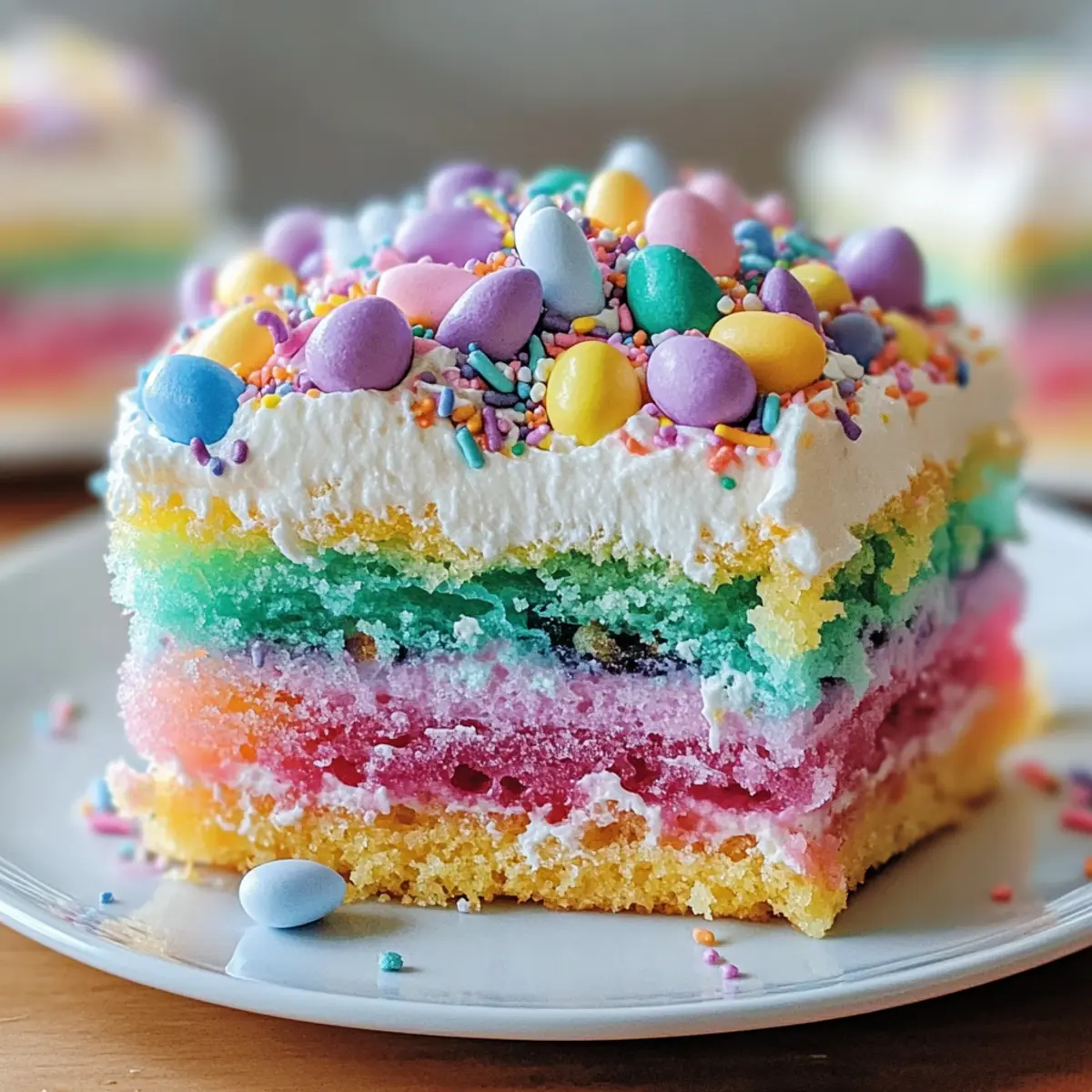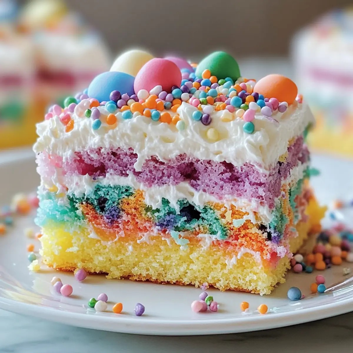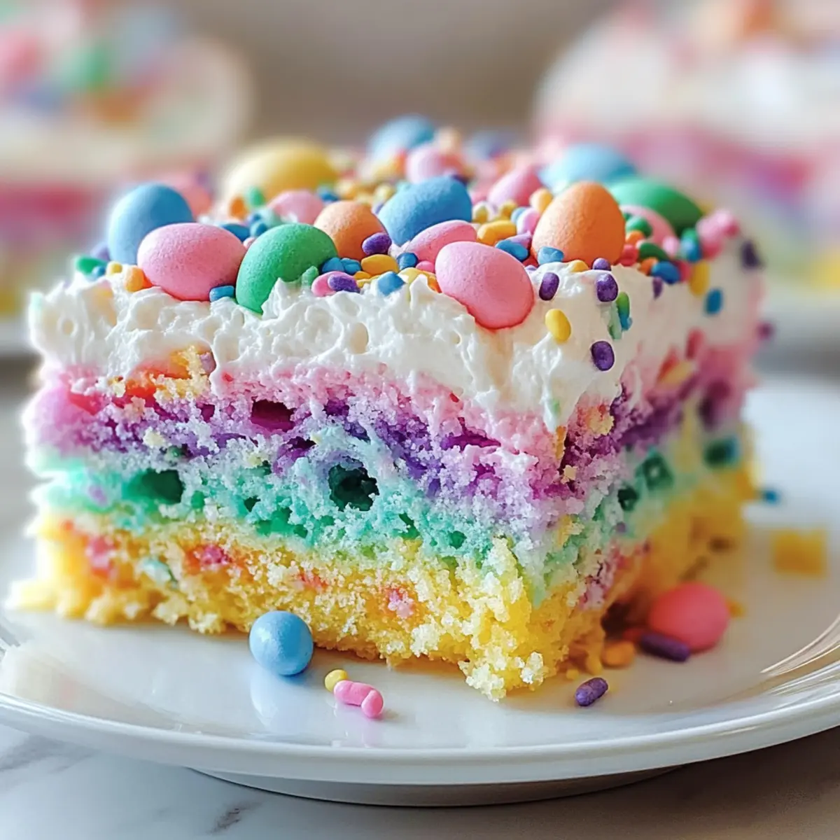 As I stood in my kitchen, the scents of spring filled the air, beckoning the arrival of Easter celebrations. This year, I decided to embrace the joy of the season with a delightfully colorful Easter Poke Cake. This dessert is not just a feast for the eyes; it’s a sweet escape that brings everyone together with its vibrant gelatin-infused layers and creamy whipped topping. One of the best parts? It’s wonderfully easy to whip up and can be customized with a variety of gelatin flavors, making it a versatile go-to for any spring gathering. Whether you’re hosting a lively brunch or attending a potluck, this Easter Poke Cake promises to be a show-stopper that turns ordinary moments into delightful memories. Curious about how to create this cheerful centerpiece? Let’s dive into the recipe! Why Is This Cake a Must-Try? Vibrant Colors: This Easter Poke Cake bursts with beautiful hues, instantly brightening your spring celebrations. Customizable Flavors: Easily switch up the gelatin flavors to match your taste or event theme, ensuring a unique treat every time. Crowd-Pleasing Delight: Perfect for gatherings, this cake is a guaranteed hit with family and friends, sparking joy with each colorful slice. Simple Preparation: With just a few steps, you can create this stunning dessert without any advanced baking skills, making it accessible for everyone. Make-Ahead Magic: Prepare it in advance, allowing the flavors to meld beautifully—ideal for busy Easter festivities. For another festive sweet treat, check out my Cheesecake Ice Cream that’s just as fun and easy! Easter Poke Cake Ingredients For the Cake Base • White Cake Mix – Provides structure and sweetness; feel free to use a homemade cake if desired. • Eggs – Adds moisture and richness, ensuring a soft texture. • Water – Hydrates the cake mix, helping achieve the perfect consistency. • Oil – Creates a tender crumb; substitute with melted butter for a richer flavor. For the Gelatin Mixture • Strawberry Gelatin – Infuses fruity flavor and moisture into the cake; opt for raspberry, lime, or orange for variety. • Boiling Water – Activates the gelatin, ensuring it sets beautifully. • Cold Water – Aids in preparing the gelatin mixture for pouring. For the Topping • Whipped Topping – Provides a creamy texture and light touch; homemade whipped cream works wonderfully as a substitute. • Festive Sprinkles/Marshmallows/Chocolate Eggs – Perfect garnishes that add visual appeal and fun to your Easter Poke Cake. Step‑by‑Step Instructions for Easter Poke Cake Step 1: Bake the Cake Preheat your oven to 350°F (175°C). In a large mixing bowl, combine the white cake mix, eggs, water, and oil as per the package instructions until smooth. Pour the batter into a greased 9×13-inch pan and bake for 25-30 minutes. The cake is ready when a toothpick inserted in the center comes out clean, indicating a fluffy, golden creation. Step 2: Cool the Cake Once baked, remove the cake from the oven and let it cool in the pan for about 10 minutes. This cooling step is essential as it allows the cake to settle, making it easier to poke holes without falling apart. Observe how the edges begin to pull away slightly from the pan as an inviting sign of its readiness. Step 3: Poke Holes While your cake is still warm, use the end of a wooden spoon or a straw to poke holes all over the surface—around 1 inch apart. Ensure the holes are deep enough to absorb the gelatin but not all the way through to the bottom. This step is crucial for allowing the flavorful gelatin to seep into the cake beautifully. Step 4: Prepare Gelatin In a medium bowl, dissolve the strawberry gelatin in 1 cup of boiling water, stirring well until completely dissolved. Add in 1/2 cup of cold water and mix again. The mixture should be a vibrant color, indicating it’s well prepared, and this will infuse your Easter Poke Cake with delightful fruity flavors. Step 5: Pour Gelatin Carefully pour the prepared gelatin mixture over the cake, ensuring it seeps into all the holes you’ve made. Take your time with this step to ensure even distribution of the colorful gelatin, which will create a fun, vibrant effect. Allow the cake to cool for 15-20 minutes at room temperature before moving to the refrigerator. Step 6: Chill Cake Once the cake has cooled, pop it into the refrigerator for at least 2 hours. This chilling time is vital for letting the gelatin set properly within the cake, ensuring a moist and flavorful treat. Check for a slightly firm surface before proceeding, as this indicates the gelatin has set beautifully. Step 7: Add Topping After the cake is well-chilled, spread the whipped topping evenly across the surface, creating a creamy layer that balances out the sweet fruity flavors of the gelatin. Decorate with festive sprinkles or chocolate eggs for a touch of joy and visual appeal, making your Easter Poke Cake even more inviting. Step 8: Serve When you’re ready to serve your beautiful Easter Poke Cake, cut it into squares and present it chilled. The colorful layers will be a delight to the eyes as well as the taste buds, making this treat a sure hit at your spring celebrations. Enjoy each slice as everyone gathers around to share in this festive dessert! Expert Tips for Easter Poke Cake • Poke Holes Deeply: Ensure to poke holes deep enough to absorb the gelatin, but avoid going all the way to the bottom of the cake. • Chill Thoroughly: Refrigerate your cake for at least 2 hours before serving. This allows the gelatin to set perfectly for a moist Easter Poke Cake. • Multi-Gelatin Fun: Combine different gelatin flavors for a rainbow effect; it will not only look appealing but also enhance the taste profile! • Use Quality Topping: For the best texture, opt for high-quality whipped topping or make your own whipped cream—this complements your cake beautifully. • Storing Leftovers: Keep any leftover cake covered in the refrigerator for up to 3-4 days. Y
