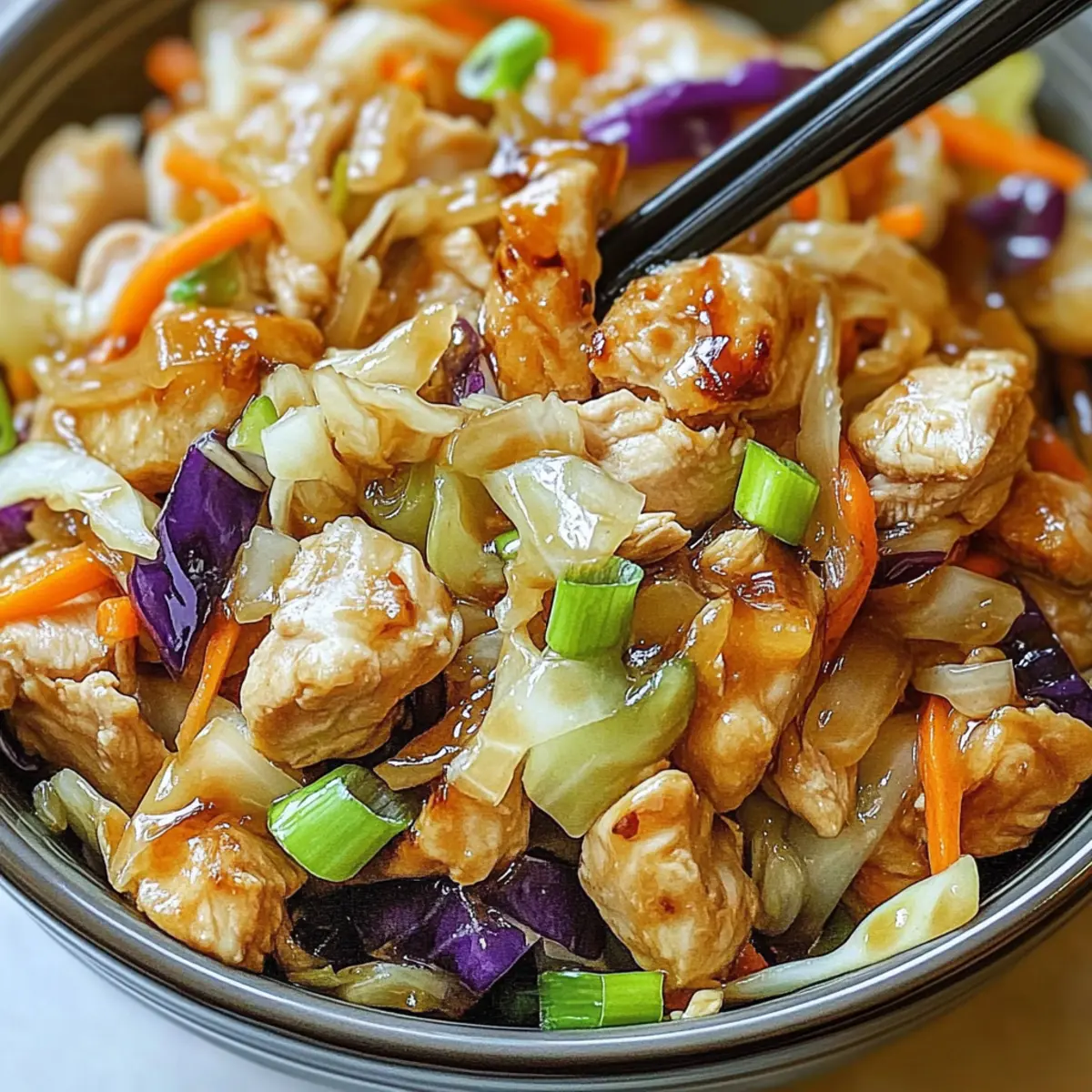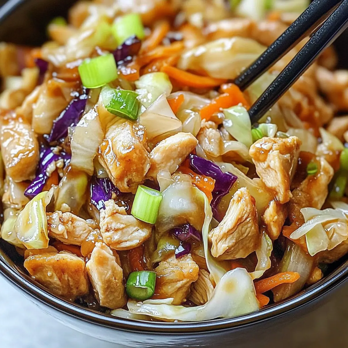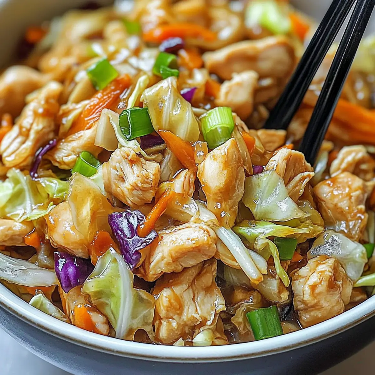 The aroma of sizzling garlic and tender vegetables wafts through the kitchen, instantly lifting my spirits. That’s how I knew it was time to whip up these Quick and Nutritious Egg Roll Bowls with Chicken and Cabbage. In just ten minutes, you can create a delightful meal that captures all the vibrant flavors of traditional egg rolls, minus the frying fuss! Not only are these bowls a crowd-pleaser, but they also pack a nutritious punch, balancing protein, veggies, and healthy fats. It’s the perfect solution for busy weeknights when you crave something homemade yet don’t want to spend hours in the kitchen. Curious how to bring this comforting dish to your table? Let’s dive into the recipe! Why Are Egg Roll Bowls So Appealing? Quick Preparation: You can whip these delicious Egg Roll Bowls up in just 10 minutes, making them a go-to for busy weeknights. Flavorful and Nutritious: Packed with fresh veggies and lean chicken, they provide a satisfying balance of healthy fats and protein to keep you energized. Customization Options: Whether you prefer a vegetarian twist with tofu or want to mix in your favorite vegetables, this recipe is incredibly versatile. Crowd-Pleaser: Family and friends will rave about the rich flavors reminiscent of traditional egg rolls, elevating your dinner gatherings without the frying mess. Light and Guilt-Free: Enjoy all the delicious flavors you love while keeping things gluten-free and nutritious, perfect for health-conscious eaters. Feel free to pair these bowls with options like our Smothered Chicken Rice or a Mango Chicken Stir-Fry for a complete meal experience! Egg Roll Bowls with Chicken and Cabbage Ingredients For the Protein • Chicken Breast – Provides lean protein; substitute with firm tofu or tempeh for a vegetarian option. For the Veggies • Shredded Cabbage – Adds crunch and nutrients; use a mix of green and purple for vibrant color. • Grated Carrots – Contributes sweetness and texture; can be replaced with bell peppers for a flavorful twist. • Green Onions – Adds a mild onion flavor; substitute with shallots if you don’t have green onions on hand. • Garlic – Infuses the dish with aromatic flavor; fresh is ideal, but powdered garlic can work in a pinch. For the Seasoning • Soy Sauce – Ensures umami flavor; opt for tamari if you prefer a gluten-free version. • Sesame Oil – Adds nuttiness; can be replaced with olive oil if needed, but this will alter the flavor slightly. • Ground Ginger – Offers warmth and spice; fresh grated ginger provides a stronger flavor boost. • Salt and Pepper – Essential for basic seasoning; adjust to taste based on your preference. Optional Toppings • Sesame Seeds – Great for additional crunch; sprinkle on top for presentation. • Fresh Cilantro – Adds a burst of freshness; perfect for those who love herbal notes. • Sriracha – A tangy kick; add more for heat or serve on the side for dipping. These Egg Roll Bowls with Chicken and Cabbage are not just delicious; they’re customizable and perfect for the entire family! Step‑by‑Step Instructions for Egg Roll Bowls with Chicken and Cabbage Step 1: Heat Oil In a large skillet, pour in 2 tablespoons of sesame oil and heat it over medium-high heat for about 1-2 minutes. You’ll know it’s ready when the oil shimmers slightly. This initial step sets the perfect stage for the flavorful Egg Roll Bowls with Chicken and Cabbage. Step 2: Cook Chicken Add 1 pound of diced chicken breast into the skillet and season with salt and pepper. Cook for 5-7 minutes, stirring occasionally, until the chicken pieces turn golden brown and fully cooked through. The enticing aroma will fill your kitchen, indicating that it’s time to move to the next step. Step 3: Incorporate Vegetables Now, stir in 3 cloves of minced garlic, 4 cups of shredded cabbage, 1 cup of grated carrots, and 4 chopped green onions. Cook everything together for about 3-5 minutes, until the vegetables are tender yet crisp, showcasing vibrant colors. This medley enhances the flavors of your Egg Roll Bowls. Step 4: Season the Mix Pour in 3 tablespoons of soy sauce and add 1 teaspoon of ground ginger, mixing well to integrate all the flavors. Allow the mixture to simmer for another 1-2 minutes, letting the sauce coat the chicken and vegetables beautifully. You’ll see the glossy sheen that signifies deliciousness. Step 5: Adjust Seasoning Taste your savory mix, adjusting with more salt, pepper, or soy sauce as desired. This step ensures your Egg Roll Bowls with Chicken and Cabbage have just the right balance of flavors that cater to your palate, allowing for a personalized touch. Step 6: Serve Remove the skillet from heat and serve the savory mixture immediately in vibrant bowls. Top with optional sesame seeds, fresh cilantro, or a drizzle of Sriracha for a delightful finish. Your family will be amazed at how quickly and easily you brought this comforting dish to the table! What to Serve with Egg Roll Bowls with Chicken and Cabbage Enhance your dinner experience with delicious sides that elevate your meal and delight your taste buds. Jasmine Rice: This fragrant rice absorbs the savory flavors perfectly and adds a satisfying base. Crispy Baked Spring Rolls: For a fun crunch, serve these on the side to add a traditional touch to your meal. Garlic Edamame: A simple, nutritious side that complements the flavors while providing a protein punch. Asian Slaw: This fresh, tangy salad adds a zesty, crunchy contrast to the warm bowls, brightening the plate. Sautéed Bok Choy: Tender bok choy, lightly seasoned, brings additional nutrients and a pleasant texture to balance the meal. Sesame Cucumber Salad: Cool and refreshing, this salad offers a charming contrast to the warm flavors of the egg roll bowls. Mango Lassi: Pair with a sweet mango lassi for a creamy, delicious beverage that adds an exotic flair. Chilled Green Tea: This light and soothing drink helps cleanse the palate and compleme