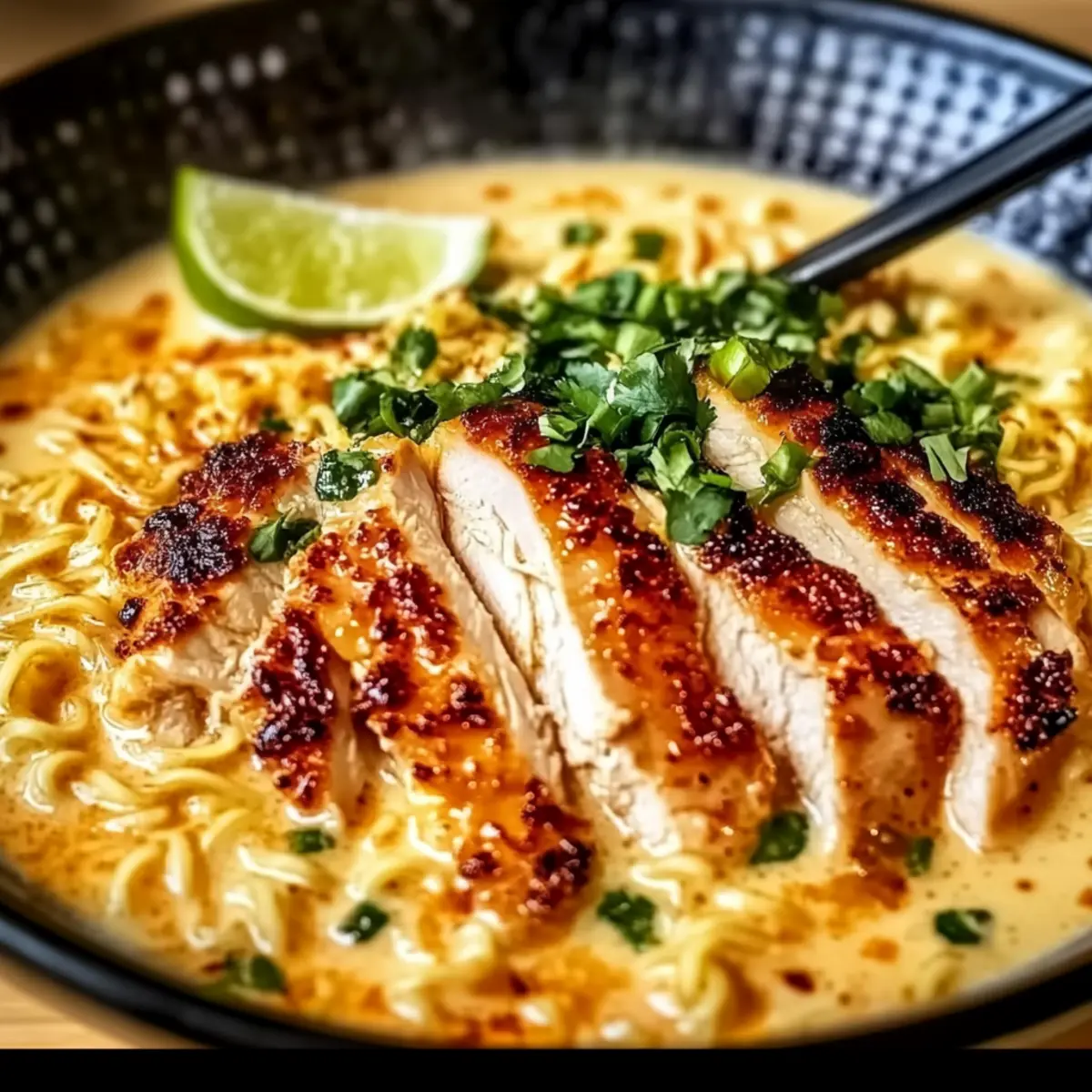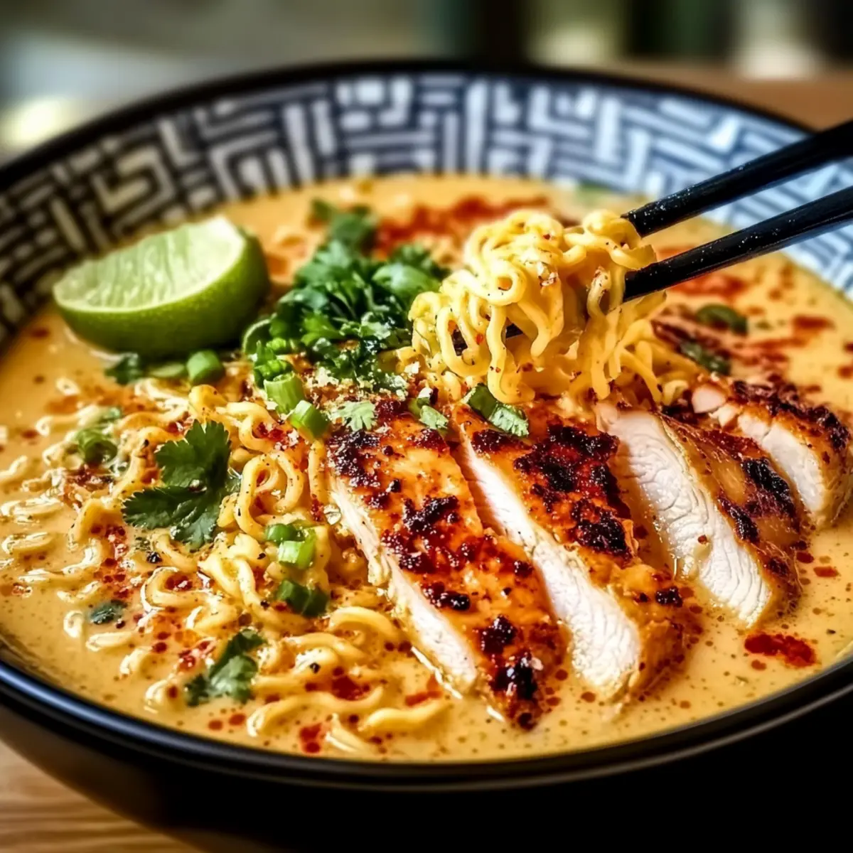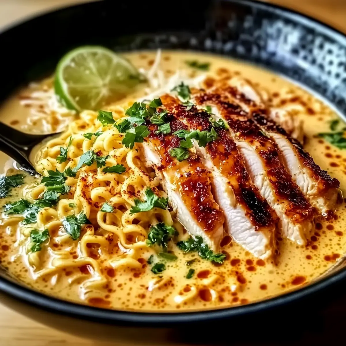 As I stirred the bubbling pot of ramen, the aroma of garlic and spice mingled in my kitchen, a warm invitation to a comforting meal ahead. This Fiery Chicken Ramen with Creamy Garlic Sauce isn’t just a fast dinner solution; it brings a perfect balance of comforting texture and lively heat to the table. Imagine tender chicken coated in a bold, spicy sauce hugging perfectly cooked ramen noodles, all drizzled with a rich, creamy garlic sauce. What’s more, it’s easily customizable—ramp up the spice or swap in tofu for a vegetarian delight, making it a true crowd-pleaser. Whether you’re too busy for takeout or just craving a soul-soothing bowl, this dish promises satisfaction in every bite. Are you ready to transform your dinner routine? Why is This Ramen So Special? Comforting Simplicity: This Fiery Chicken Ramen is a breeze to whip up, requiring minimal ingredients and just a few straightforward steps. Bold Flavor Explosion: The dynamic combination of spices and creamy garlic sauce creates an unforgettable flavor that dances on your palate. Customizable Delight: Whether you’re a spice lover or prefer gentler tastes, this recipe lets you easily adjust the heat and swap proteins, such as using tofu for a delightful vegetarian option. Perfect for Any Night: Ideal for busy evenings, it’s a quick solution that elevates your dinner game—just as delicious as takeout but made right at home! Nourishing Goodness: Packed with protein from the chicken and hearty carbohydrates from the ramen, this dish nourishes both body and soul, making it a fulfilling meal. Crowd-Pleasing Favorite: With its rich, creamy profile, it’s bound to become a family favorite, much like Cheesy Chicken Enchiladas or Caribbean Chicken Rice that will satisfy even the pickiest eaters in your home. Fiery Chicken Ramen Ingredients For the Chicken • Chicken Breasts – Provides a lean protein option, but chicken thighs can be juicier and more flavorful. • Cayenne Pepper – Adds a fiery kick; adjust to taste for your preferred heat level. • Chili Powder – Enhances the spice profile; consider using smoked chili powder for depth. For the Ramen • Ramen Noodles – The base of this dish; fresh ramen provides a chewy texture that elevates the meal. • Garlic – Essential for the creamy garlic sauce, bringing rich flavors that balance the spices. • Lime Juice – A splash brightens the dish, enhancing the overall flavors beautifully. For the Creamy Sauce • Heavy Cream – Adds richness; for a lighter dish, substitute with half-and-half or coconut milk. • Butter – Creates a luscious base for the sauce; feel free to use olive oil for a lighter option. • Parmesan Cheese – Incorporates a creamy, umami element; add more for a richer, less spicy dish. Optional Garnishes • Chopped Green Onions – Provides a fresh, crisp finish to each bowl. • Sesame Seeds – Offers a nutty crunch and an extra layer of texture. Step‑by‑Step Instructions for Fiery Chicken Ramen Step 1: Prepare the Chicken Start by slicing your chicken breasts into thin strips for quick cooking. Season them generously with cayenne pepper and chili powder. In a large skillet, heat a tablespoon of oil over medium-high heat. Add the chicken and sauté for about 6-8 minutes until they are golden brown and cooked through, reaching an internal temperature of 165°F. Set the chicken aside, allowing the spicy aroma to linger. Step 2: Cook the Ramen Noodles Bring a pot of water to a rolling boil over high heat and add your fresh ramen noodles. Cook according to package instructions, usually around 3-4 minutes, until they are tender yet chewy. Once cooked, drain the noodles thoroughly in a colander, and rinse them briefly under cold water to stop the cooking process. Set aside, embracing the anticipation of your Fiery Chicken Ramen. Step 3: Make the Garlic Cream Sauce In the same skillet used for the chicken, reduce the heat to medium and melt 2 tablespoons of butter. Add minced garlic and sauté for about 1-2 minutes until fragrant and golden. Slowly pour in the heavy cream, stirring continuously, and allow it to simmer for 3-4 minutes until it thickens slightly, coating the back of a spoon. This creamy sauce will beautifully complement the spicy chicken. Step 4: Combine Ingredients Add the cooked ramen noodles to the skillet, tossing them gently to coat with the creamy garlic sauce. Introduce the sautéed chicken back into the mix along with a splash of lime juice for brightness. Stir everything together well for 2-3 minutes, allowing the flavors to meld beautifully, and keep an eye out for the noodles soaking up those vibrant flavors of the Fiery Chicken Ramen. Step 5: Serve and Garnish Once all ingredients are well combined and heated through, transfer the creamy, spicy ramen to serving bowls. Top each bowl with freshly grated Parmesan cheese to enrich the flavors. Squeeze additional lime juice over the dish and sprinkle with chopped green onions and sesame seeds for an added crunch. Enjoy the warmth and comfort of your homemade Fiery Chicken Ramen! Helpful Tricks for Fiery Chicken Ramen Control the Spice: Adjust the cayenne and chili powder to match your heat preference; start with less if you’re unsure and build up gradually. Use Fresh Noodles: Fresh ramen noodles provide the ideal chewy texture, which transforms your dish into a superior experience compared to dried noodles. Watch the Cream: When making the garlic cream sauce, keep an eye on the heat. Too high can cause the cream to separate, so simmer gently for best results. Mix It Up: Feel free to incorporate your favorite vegetables like bok choy or mushrooms into the ramen for added nutrition and flavor without altering the essence of your Fiery Chicken Ramen. Prep Ahead: The creamy garlic sauce can be made in advance and stored in the refrigerator. Just reheat when ready to combine with your noodles and chicken. Fiery Chicken Ramen Variations Feel free to unleash your culinar