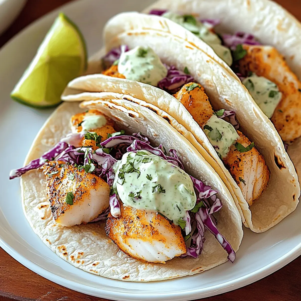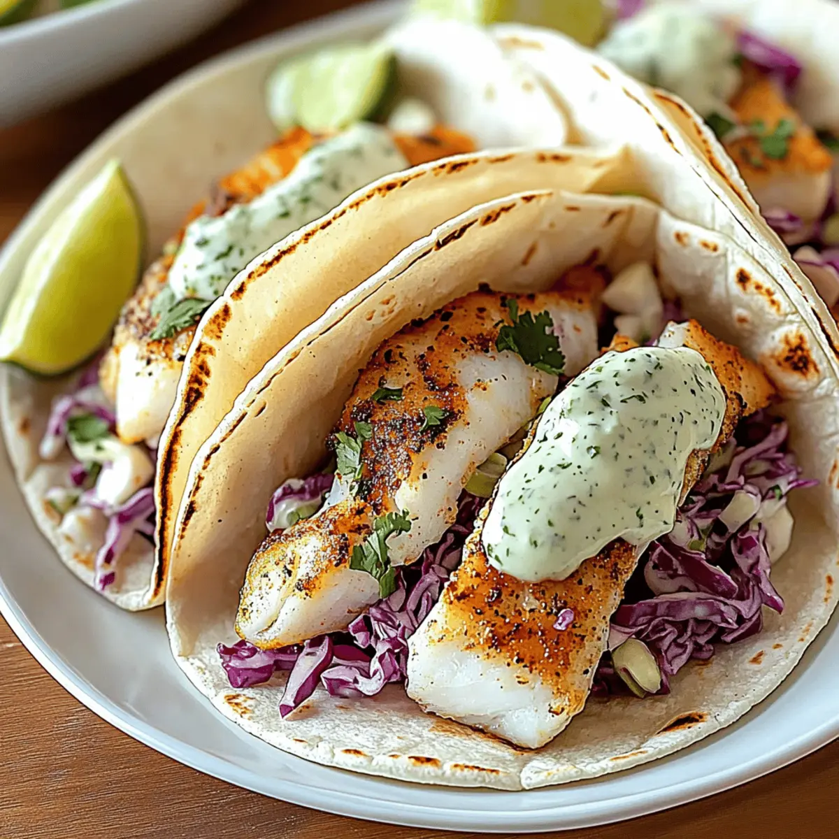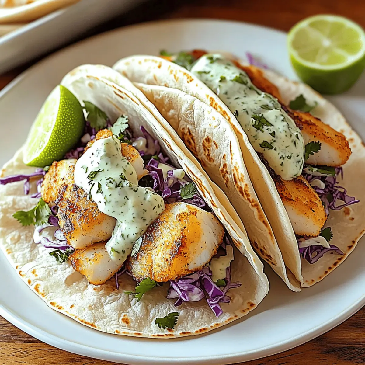 Every time I take a bite of these fish tacos with lime crema, I’m transported to the sun-soaked beaches of Baja California. The flaky, perfectly seasoned white fish, wrapped in warm tortillas and topped with vibrant slaw, creates an explosion of delightful textures and flavors that never fails to impress. Not only are these fish tacos an easy weeknight meal, but they’re also a customizable crowd-pleaser that beckons everyone to join the table. You can throw them together in a pinch, and before you know it, you’re serving a dish that looks and tastes like a culinary adventure. Ready to dive into this ocean of flavor and fun? Let’s get cooking! Why Are Fish Tacos So Popular? Vibrant, Zesty Flavors: These fish tacos are bursting with freshness, thanks to the zesty lime crema that perfectly complements the flaky fish. Easy & Quick: With just a few simple steps, you can whip up a delicious meal in no time—perfect for a busy weeknight! Customizable Delight: Feel free to tailor your tacos; swap out fish for shrimp or even blackened tofu for a fun twist! If you’re looking for more ideas, check out my Rotisserie Chicken Tacos for a tasty alternative. Crowd-Pleasing Appeal: Whether it’s a family dinner or a casual gathering, these tacos are a surefire hit that will have guests coming back for seconds. Texture Harmony: Enjoy the delightful contrast between the warm tortillas, crispy slaw, and creamy lime crema in every bite. Make-Ahead Friendly: Prepare the slaw and lime crema in advance, and watch how quickly these tacos come together when it’s time to eat! Fish Tacos Lime Crema Ingredients For the Fish • White Fish Fillets – Cod, mahi-mahi, or tilapia add essential flavor and flakiness. • Olive Oil – Ideal for cooking and enhances the fish’s taste while preventing sticking. • Chili Powder – Provides heat and depth; adjust based on your spice preference. • Cumin – Adds warmth and earthiness, perfect for that taco flavor profile. • Smoked Paprika – Imparts a subtle smokiness; feel free to swap with sweet paprika if desired. • Garlic Powder & Onion Powder – Season the fish; use fresh alternatives for stronger flavors. • Cayenne Pepper (optional) – For those who like a little extra kick; omit for milder tacos. • Salt and Black Pepper – Essential for seasoning; adjust to suit your taste. For the Lime Crema • Sour Cream & Mayonnaise – A creamy duo that brings the zesty lime flavor alive; substitute with Greek yogurt for a lighter option. • Limes – Fresh limes are key for optimal brightness and acidity in your crema. • Garlic (minced) – Adds a burst of freshness; garlic powder can be used as a quick fix if needed. • Fresh Cilantro – Brightens up both the crema and slaw; omit if you’re not a fan of herbs. For the Slaw • Shredded Cabbage & Carrots – Brings texture and crunch; choose red or green cabbage based on your preference. • Red Onion – Adds a sharp contrast; green onions make for a milder flavor option. • Sugar – Balances the acidity in the slaw dressing; honey can be a natural substitute. For Assembly • Corn or Flour Tortillas – The perfect base for your fish tacos; choose according to your love for texture. • Optional Toppings – Avocado, hot sauce, and pickled onions bring variation and extra flavor to elevate your tacos. Dive into these ingredients for a delightful recipe that promises to bring the taste of Fish Tacos with Lime Crema right to your home table! Step‑by‑Step Instructions for Fish Tacos Lime Crema Step 1: Prepare Fish Begin by patting the white fish fillets dry with a paper towel. This step ensures the fish gets a nice sear when cooked. Set the fish aside as you gather the remaining ingredients. A clean, dry surface will help with seasoning and allow for better texture in the final dish. Step 2: Make Spice Rub In a small bowl, combine chili powder, cumin, smoked paprika, garlic powder, onion powder, cayenne pepper, salt, and black pepper. Mix these spices well to create a flavorful rub for your fish. The aromatic spices are key to enhancing the fish tacos’ overall flavor, so ensure they are blended thoroughly for an even coating. Step 3: Season Fish Generously rub the spice mixture all over the fish fillets, ensuring they are fully coated on both sides. This process should take about 2-3 minutes, allowing the fish to absorb those delicious flavors. Set the seasoned fish aside for a moment while you prepare to cook it, letting the spices impart their taste. Step 4: Heat Oil In a large skillet, heat 2 tablespoons of olive oil over medium-high heat until shimmering, about 2 minutes. This step is crucial as it creates a non-stick surface for the fish and helps to develop a beautiful golden crust. Gently swirl the oil to cover the bottom of the pan evenly before adding the fish. Step 5: Cook Fish Carefully place the seasoned fish fillets in the hot skillet. Sauté for 3-4 minutes on each side until the fish is cooked through and easily flakes apart with a fork. You’ll know they’re done when the exterior is golden brown and the fish has a flaky texture. Remove from the skillet and set aside on a plate. Step 6: Make Lime Crema In a medium bowl, whisk together ½ cup sour cream, ¼ cup mayonnaise, juice and zest from 1 lime, and 1 minced garlic clove. Stir in fresh chopped cilantro, seasoning with salt and pepper to taste. This lime crema adds a zesty kick that elevates the entire fish tacos lime crema experience, making it creamy and tangy. Step 7: Combine Vegetables In a separate bowl, mix together 2 cups shredded cabbage, 1 cup shredded carrots, and ½ thinly sliced red onion. Toss these ingredients together for a refreshing slaw that adds crunch and flavor to your tacos. This vegetable mix will contrast beautifully with the flaky fish and creamy lime crema. Step 8: Prepare Dressing In a small bowl, whisk together 1 tablespoon lime juice, 1 tablespoon olive oil, 1 teaspoon sugar, salt, and p