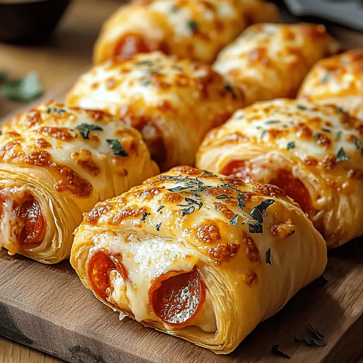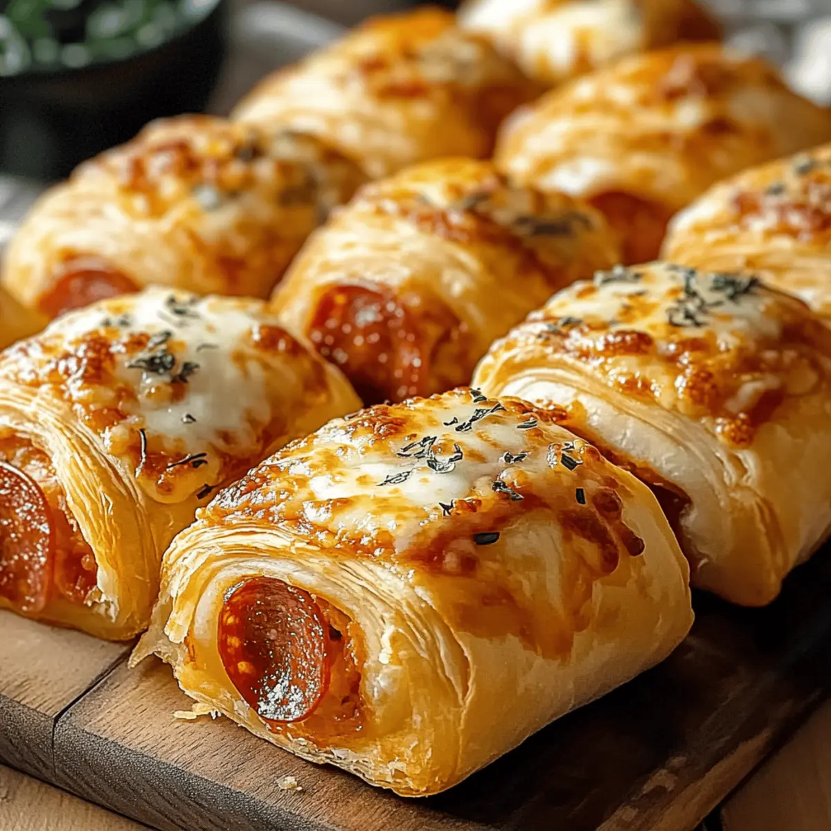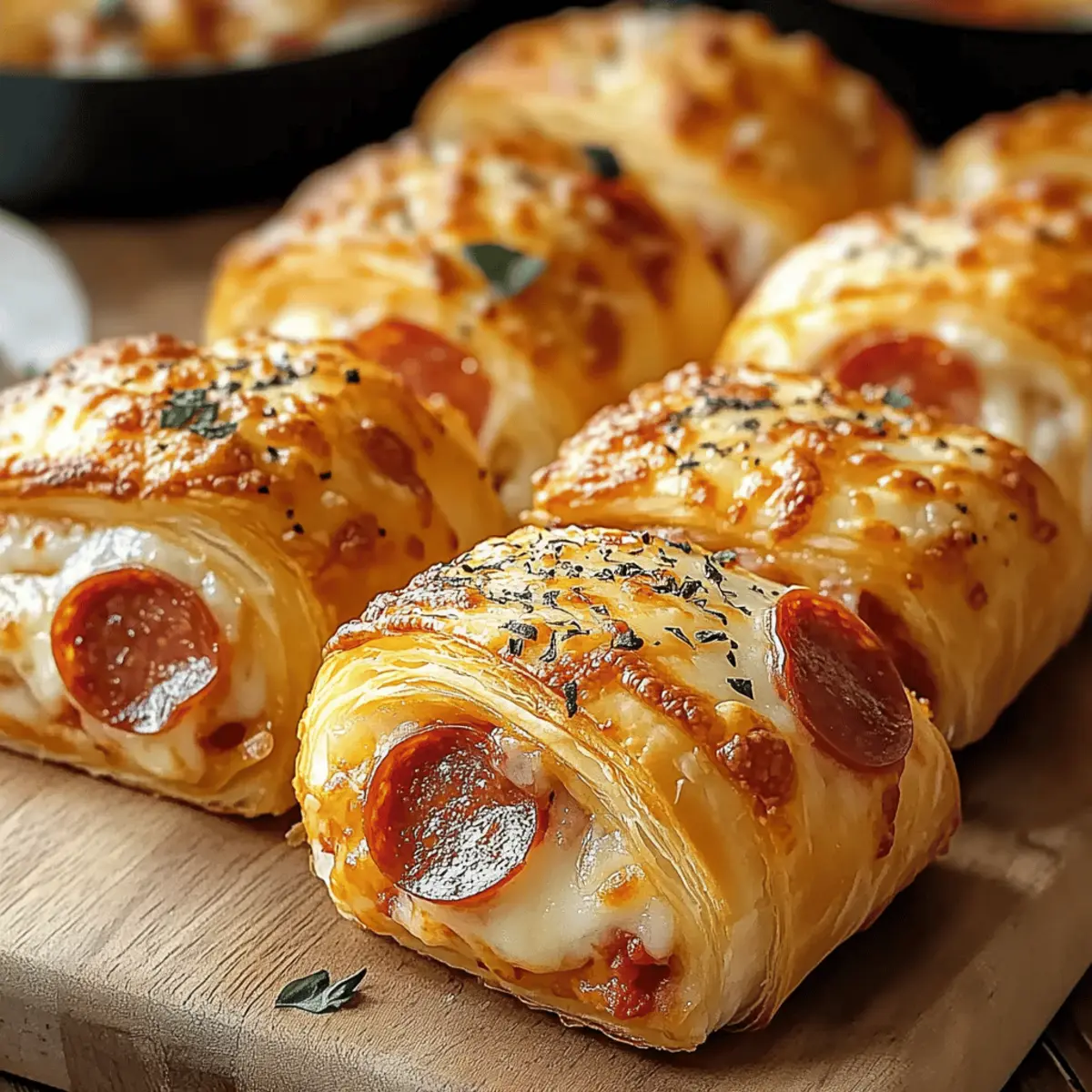 Is there anything more satisfying than the combination of crispy pastry and gooey cheese? Enter my Flaky Pepperoni Pizza Rolls with Mozzarella and Herbs—a homemade delight that can be whipped up in just 30 minutes. This quick snack isn’t just kid-friendly; it’s also endlessly customizable, making it perfect for family gatherings, movie nights, or a midday treat. Using simple ingredients like puff pastry and mozzarella, you’ll experience a crunchy exterior that gives way to a savory, cheesy center, all without the stress of elaborate preparation. Imagine the joy on your loved ones’ faces when they take a bite! Ready to transform your snacking game? Let’s dive into the deliciousness! Why are these pizza rolls a must-try? Quick and Easy: With just 30 minutes of prep time, you can enjoy these delectable Flaky Pepperoni Pizza Rolls with Mozzarella and Herbs without any fuss. Customizable Goodness: Add your favorite veggies or swap out pepperoni for other deli meats, making them fit your taste perfectly. Family Favorite: These rolls are guaranteed to become a hit with both kids and adults alike, perfect for satisfying snack attacks or parties! Crispy and Cheesy: Enjoy the delightful contrast of a flaky pastry exterior and a melty, savory interior—a combination that is simply irresistible! Versatile Snacking: Serve them as appetizers, lunch items, or even movie night treats! You can even pair them with a delicious homemade dipping sauce for extra flair. Check out my Baked Mac Cheese for another quick and cheesy option that your family will adore! Flaky Pepperoni Pizza Rolls Ingredients • Perfect for your next party! For the Rolls Puff Pastry – Provides a flaky, buttery base; ensure it’s fully thawed for best results. Shredded Mozzarella Cheese – Adds a creamy, stretchy texture; choose high-quality for the ultimate melt. Sliced Pepperoni – Offers a spicy flavor punch; feel free to swap it out for any preferred deli meat. Dried Italian Herbs – Enhances flavor through a blend of oregano and basil; try fresh herbs for bolder taste. Egg (for wash) – Gives a beautiful golden finish; it’s optional but highly recommended for presentation. For Serving Optional Pizza Sauce – Perfect for dipping; select your favorite brand or go homemade for a personal touch. Step‑by‑Step Instructions for Flaky Pepperoni Pizza Rolls with Mozzarella and Herbs Step 1: Preheat the Oven Begin by preheating your oven to 400°F (200°C) and lining a baking sheet with parchment paper. This ensures a non-stick surface for the rolls, allowing them to crisp beautifully as they bake. While the oven heats, take a moment to prepare your workspace. Step 2: Roll Out the Puff Pastry Once the oven is preheated, roll out the thawed puff pastry on a lightly floured surface. Aim for a rectangle that is about 12 inches long and 8 inches wide. The dough should be smooth and even, which will help create those delightful layers in the Flaky Pepperoni Pizza Rolls with Mozzarella and Herbs. Step 3: Add the Cheese Evenly sprinkle a generous layer of shredded mozzarella cheese over the entire surface of the rolled pastry, leaving about half an inch of border around the edges. This gooey cheese will melt and create a deliciously stretchy filling, so make sure to cover the pastry but don’t overload it. Step 4: Layer the Pepperoni Next, place sliced pepperoni in a single layer over the mozzarella cheese. Feel free to overlap the slices slightly for a more robust flavor. Then, sprinkle dried Italian herbs evenly over the pepperoni. This combination will enhance the taste of your Flaky Pepperoni Pizza Rolls immensely. Step 5: Roll and Slice the Pastry Starting from one long edge, carefully roll the pastry tightly into a log shape, ensuring no filling spills out. Once rolled, use a sharp knife to slice the log into 1-inch thick pieces. This will give you uniformly sized rolls for even baking and an appealing presentation. Step 6: Arrange on Baking Sheet Place the sliced rolls cut-side up on the prepared baking sheet, ensuring they are spaced apart for optimal air circulation. This spacing allows the heat to reach each roll, promoting an even golden color. Now, it’s time to prepare for that lovely golden-brown finish. Step 7: Apply Egg Wash In a small bowl, whisk one egg to create an egg wash. Using a pastry brush, lightly brush the tops of each roll with the egg wash. This step is optional but highly recommended, as it will give your Flaky Pepperoni Pizza Rolls a beautiful, shiny, and crispy exterior once baked. Step 8: Bake Until Golden Carefully transfer the baking sheet to your preheated oven and bake for 15–18 minutes. Keep an eye on them; they should puff up and turn a delightful golden brown. You’ll know they are done when the pastry is flaky and crisp, enticing you to dig in! Step 9: Serve and Enjoy Once baked, remove the Flaky Pepperoni Pizza Rolls from the oven and let them cool for a minute. Serve the rolls warm with a side of pizza sauce for dipping if desired. Watch as your family and friends enjoy these cheesy, crispy delights! Make Ahead Options These Flaky Pepperoni Pizza Rolls with Mozzarella and Herbs are perfect for meal prep, allowing you to save time during your busy week! You can prepare the rolls in advance by assembling them up to 24 hours ahead of time. Simply complete the rolling and slicing process, then arrange the rolls on a baking sheet. Cover them tightly with plastic wrap or foil and refrigerate. When you’re ready to bake, just remove the wrap and brush with egg wash before popping them in the oven for 15–18 minutes at 400°F (200°C). This way, you’ll enjoy just as delicious rolls, fresh from the oven, with minimal effort on the day of serving! Storage Tips for Flaky Pepperoni Pizza Rolls Room Temperature: Store leftover Flaky Pepperoni Pizza Rolls at room temperature for up to 2 hours to preserve their crispiness, but for longer storage, refrigerate them. Fridge: Keep any r