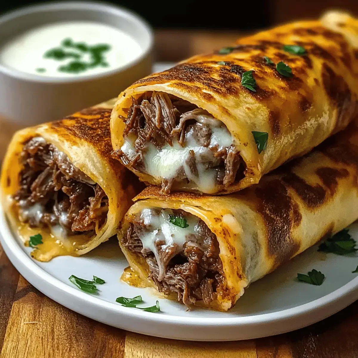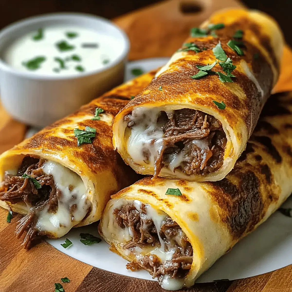 There’s something incredibly satisfying about unrolling a warm tortilla to reveal savory goodness tucked inside—especially when it involves these Quick and Cheesy French Dip Tortilla Roll Ups. Just the thought of tender roast beef, melty cheese, and a rich au jus for dipping can turn any busy day into a cozy culinary experience. Not only are these roll-ups a delightful twist on the classic French dip sandwich, but they also serve up a wonderful way to bring people together around the table with minimal fuss. They’re surprisingly quick to prepare and make for a fun meal that’s also low in lactose, catering to a variety of dietary needs. Ready to dive into a homemade comfort food that’s sure to impress? Let’s get rolling! Why Make French Dip Tortilla Roll Ups? Simplicity, these roll-ups come together in under 30 minutes, making them a go-to for busy weeknights. Flavor packed, each bite delights with rich roast beef and gooey cheese that pairs beautifully with a savory au jus. Customizable, feel free to swap ingredients or add your favorite fillings for a personal touch. Crowd-pleaser, they’re perfect for family dinners or casual gatherings, bringing everyone together with deliciousness. For another comforting option, try Cinnamon Roll Sugar Cookies, or keep it hearty with Chicken Tortilla Soup! French Dip Tortilla Roll Ups Ingredients For the Roll Ups • 1 lb thinly sliced roast beef – Provides a savory and juicy filling; you can use deli-style or leftover roast for convenience. • 1½ cups shredded mozzarella or provolone – Creates a gooey texture; mozzarella adds that melted stretch, while provolone brings more flavor. • 4 large flour tortillas – Soft and pliable, they hold everything together without falling apart during baking. • 2 tablespoons melted butter – Brushed on the outside for a golden, crispy finish that makes each bite irresistible. • 1 teaspoon garlic powder – Adds a warm, aromatic depth, enhancing the overall flavor of the roll-ups. • 1 teaspoon onion powder – Brings subtle savory notes that round out the flavor profile beautifully. • 1 teaspoon dried parsley – A touch of color and a gentle herbal tone to brighten up the dish. For the Au Jus • 2 cups beef broth – The main liquid for a rich and savory dipping sauce that pairs perfectly with the roll-ups. • 1 tablespoon Worcestershire sauce – Adds umami richness to elevate the flavor of the dip. • 1 teaspoon soy sauce – For enhanced saltiness and deep flavor; it complements the beef broth wonderfully. • 1 teaspoon garlic powder and onion powder – Reinforces the flavors of both the sauce and roll-ups; consider it double the deliciousness! • Salt & pepper to taste – Essential for seasoning, so taste as you go for the best flavor outcome. These French Dip Tortilla Roll Ups provide a fantastic fusion of flavors and textures that the whole family can enjoy! Step‑by‑Step Instructions for French Dip Tortilla Roll Ups Step 1: Preheat and Prepare Begin by preheating your oven to 375°F (190°C). While the oven heats up, line a baking sheet with parchment paper to prevent sticking and make cleanup a breeze. This will ensure a beautifully crisp finish for your French Dip Tortilla Roll Ups. Step 2: Assemble the Fillings Take four large flour tortillas and lay them flat on a clean surface. Evenly distribute the thinly sliced roast beef and shredded mozzarella or provolone cheese across each tortilla, leaving about an inch of space from the edges. This will help contain the delicious filling as you roll them up. Step 3: Roll It Up Carefully roll each tortilla tightly from the bottom up, folding in the sides as you go to keep the filling secure. This technique helps prevent any stuffing from spilling out during the baking process. Make sure the tortillas are snug to maintain the shape of your French Dip Tortilla Roll Ups. Step 4: Butter and Season Once rolled, brush the outside of each tortilla with melted butter to achieve a golden, crispy exterior. Then, sprinkle a mix of garlic powder, onion powder, and dried parsley over the buttered surface. This flavorful coating adds extra taste and aroma to your roll-ups while they bake. Step 5: Bake Until Golden Place your prepared roll-ups seam-side down on the lined baking sheet. Bake in the preheated oven for 12–15 minutes, or until the tortillas are golden brown and the cheese is perfectly melted. Keep an eye on them to ensure a delightful crispiness that signals they are ready to be devoured. Step 6: Prepare the Au Jus While the roll-ups are baking, start on the au jus. In a saucepan, combine 2 cups of beef broth, Worcestershire sauce, soy sauce, garlic powder, onion powder, and salt and pepper to taste. Bring this mixture to a gentle simmer over medium heat for about 5–7 minutes, allowing the flavors to meld beautifully. Step 7: Serve with Style Once your roll-ups are out of the oven, slice them into bite-sized pieces for easy dipping. Serve them warm with the rich au jus on the side. Gather around the table and enjoy your delicious French Dip Tortilla Roll Ups, perfect for any busy night or casual gathering. How to Store and Freeze French Dip Tortilla Roll Ups Fridge: Enjoy your baked roll ups stored in an airtight container for up to 3 days. Simply reheat in the oven to regain crispiness. Freezer: For longer storage, freeze the roll ups unbaked for up to 1 month. To bake, preheat directly from the freezer without thawing. Make-Ahead: You can prepare and refrigerate assembled but unbaked roll ups for up to 24 hours, making dinner planning a breeze. Reheating: When reheating leftovers, always choose the oven for the best texture; microwave can make them soggy. Expert Tips for French Dip Tortilla Roll Ups Perfect Filling: Don’t overstuff your tortillas; about ¼ lb of roast beef and a handful of cheese will keep them intact. Seal Smartly: To prevent filling from escaping, press the edges of the tortilla tightly and seal wit