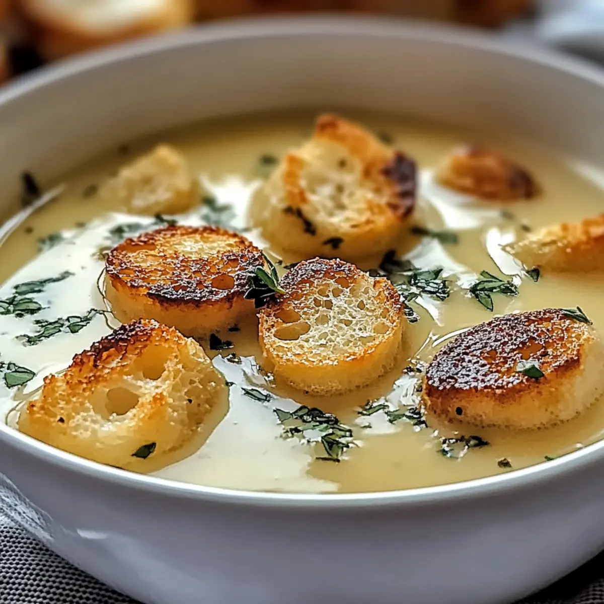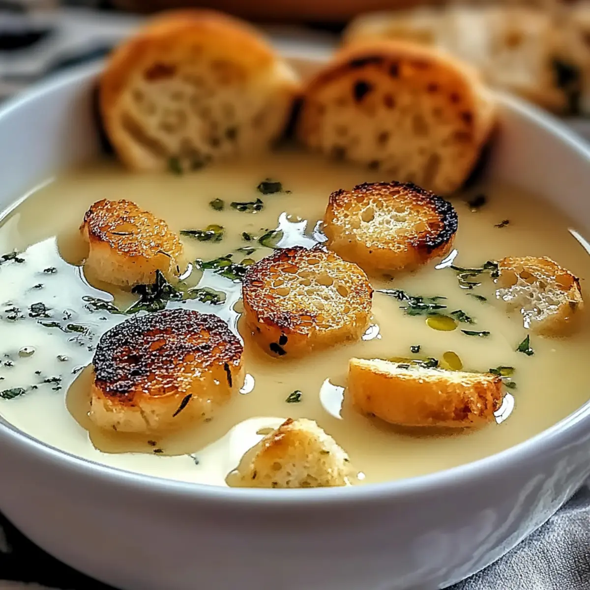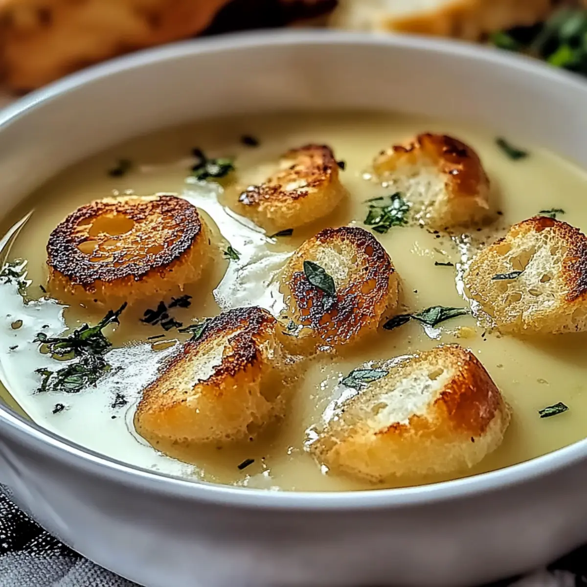As I stood over the simmering pot, the fragrant scent of roasted garlic swirled around me, instantly brightening the chilly afternoon. This Rustic Country French Garlic Soup is more than just a recipe; it’s a cozy experience that turns ordinary meals into something special. Not only does it offer a creamy, comforting texture that wraps you in warmth, but it also brings a boost of immune-boosting goodness, making it a guilt-free indulgence. With easy-to-find ingredients and the versatility to accommodate your pantry preferences, this soup can easily transform your dinner routine from mundane to marvelous. Curious about how to elevate your comfort food game? Let’s dive into the heart of this deliciously simple French classic! Why is French Garlic Soup so irresistible? Comforting Aroma: The moment you roast garlic, your kitchen fills with a rich, inviting scent that beckons everyone to the table. Creamy Goodness: This soup boasts a luscious, velvety texture that wraps you in warmth, perfect for chilly evenings. Immune-Boosting: Packed with garlic’s natural health benefits, this recipe supports your well-being while delighting your taste buds. Versatile Variations: Whether you’re going dairy-free with coconut cream or loading up on fresh spinach, you can easily tailor this soup to your preferences! Crowd-Pleasing: Serve it with warm crusty bread, and watch your family and friends gather around for seconds. This dish is bound to be a hit! If you’re looking for more cozy dishes to enjoy, don’t miss out on my easy Honey Garlic Chicken or the delightful Lemon Garlic Butter Chicken, perfect complements to your culinary repertoire! French Garlic Soup Ingredients Get ready to elevate your cooking with this flavorful French Garlic soup! For the Soup Garlic – The star of the show, roasted garlic brings a mellow sweetness that enhances the soup’s flavor. Yellow Onion – Adds depth with its natural sweetness; roasting it alongside the garlic can intensify the soup’s richness. Vegetable or Chicken Broth – This base adds vital flavor; low-sodium options help you control the saltiness. Heavy Cream – Creates that luxurious creaminess; substitute with half-and-half or milk for a lighter touch. Olive Oil – Used for sautéing veggies, this adds a lovely depth; butter can also be used for an extra richness. Fresh Thyme – Infuses the soup with herbal notes; feel free to swap it out with rosemary or bay leaves if you’d like. Crusty Bread – An excellent accompaniment that enhances the overall experience of your French Garlic Soup. Salt and Black Pepper – Essential for flavor enhancement; adjust them to fit your taste. Fresh Herbs or Croutons – For a fresh garnish and added crunch; consider using parsley or chives based on your preference. Elevate your lunch or dinner with this delightful recipe! Step‑by‑Step Instructions for Rustic Country French Garlic Soup Step 1: Roast Garlic Preheat your oven to 400°F (200°C). Take a head of garlic, slice off the tops, and drizzle with a bit of olive oil. Wrap the garlic in aluminum foil and place it in the oven for about 30 minutes, or until the cloves are golden brown and soft to the touch, filling your kitchen with a delightful aroma. Step 2: Sauté Aromatics While the garlic roasts, heat a generous amount of olive oil in a large pot over medium heat. Add in chopped yellow onions and sauté for 5-7 minutes until they are translucent and lightly caramelized, stirring occasionally to prevent burning. This step builds a flavorful base for your Rustic Country French Garlic Soup. Step 3: Combine Ingredients Once the garlic is roasted, carefully squeeze the soft cloves into the pot, discarding the skins. Pour in your choice of low-sodium vegetable or chicken broth, and toss in fresh thyme. Bring the mixture to a gentle simmer for 2 minutes, allowing the flavors of garlic and thyme to infuse into the broth beautifully. Step 4: Simmer for Depth Reduce the heat slightly and let the soup simmer for an additional 15-20 minutes. This simmering time allows the flavors to meld together, creating a rich, aromatic broth for your French Garlic Soup. You’ll know it’s ready when the soup is fragrant and has thickened to your desired consistency. Step 5: Blend Until Smooth After simmering, remove the thyme sprigs from the pot. Use an immersion blender to puree the soup until completely smooth and velvety. If you prefer a chunky texture, pulse it just a few times. This step gives the Rustic Country French Garlic Soup its characteristic creamy consistency that is simply inviting. Step 6: Add Cream and Season Stir in heavy cream, ensuring it blends well into the warm soup for that rich finish. Taste and season your soup with salt and freshly cracked black pepper, adjusting to your preferences. Heat the soup gently for another 5 minutes, allowing the flavors to deepen even further. Step 7: Serve and Garnish Ladle the luscious Rustic Country French Garlic Soup into warm bowls. For a charming touch, garnish with fresh herbs like parsley or chives, and serve alongside slices of crusty bread for dipping. This final step invites everyone to sit down, share, and savor a comforting bowl of soup. Expert Tips for French Garlic Soup Roast Garlic Properly: Ensure the garlic is well-roasted to achieve the maximum sweetness and flavor. Under-roasting can lead to a sharp taste. Adjust Consistency: If the soup is too thick post-blending, gradually add more broth to reach your desired creaminess for the perfect French Garlic Soup experience. Flavor Enhancer: To deepen the flavors, let the soup simmer longer, allowing the ingredients to meld beautifully. Storage Know-How: Store leftovers in an airtight container for up to 4 days; this soup often tastes even better the next day, so it’s worth the wait! Freezing Tips: If you plan to freeze, make sure the soup is cooled completely before transferring it to containers. Thaw overnight before reheating for the best results