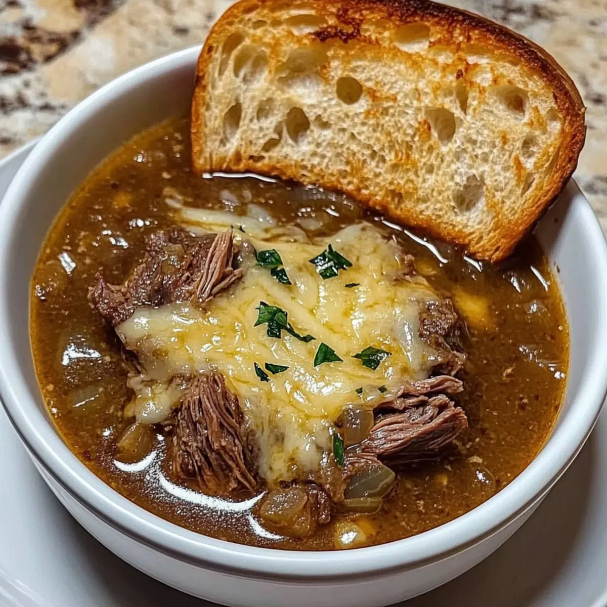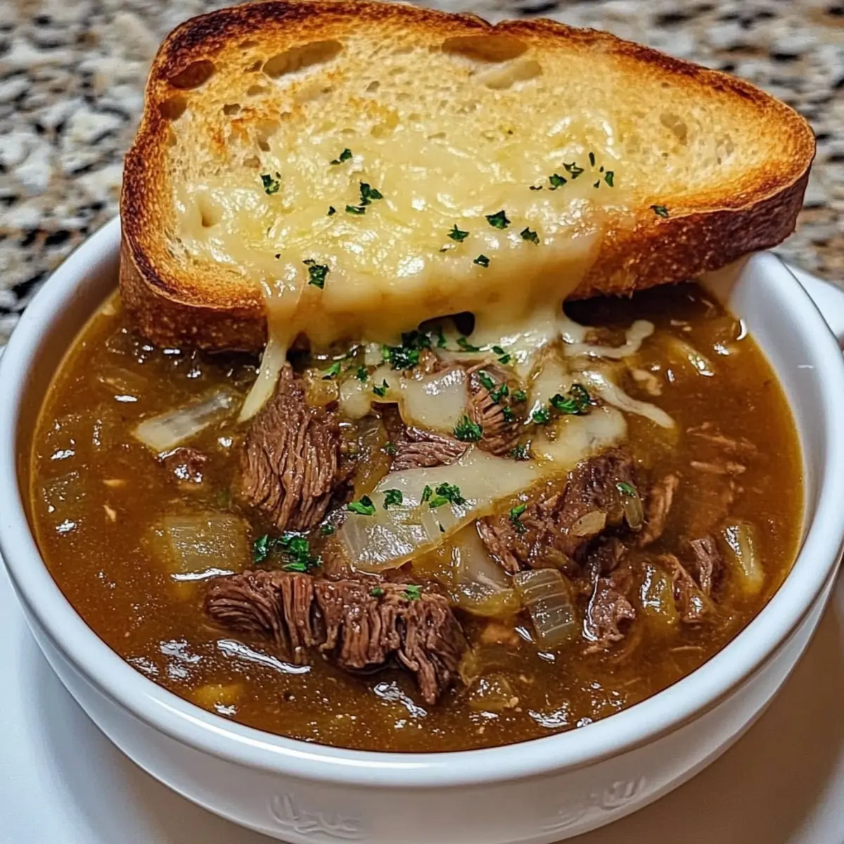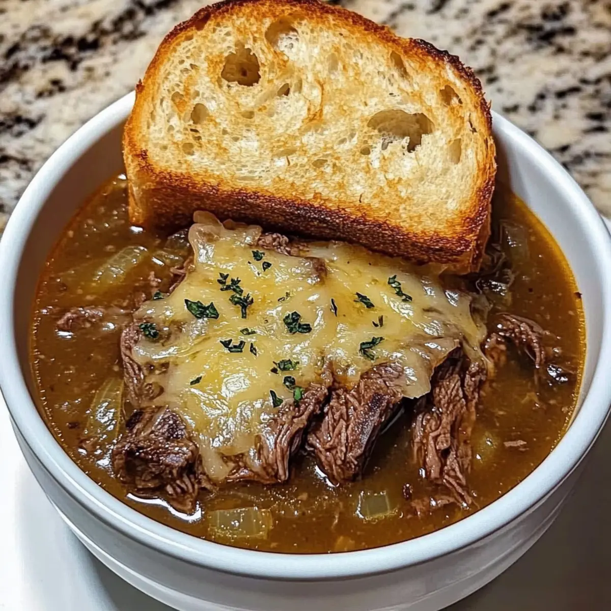 The aroma of caramelizing onions fills the kitchen, wrapping around you like a cozy blanket on a chilly evening. That’s the moment I knew I was creating something truly special: French Onion Beef Short Rib Soup. This recipe combines tender, savory beef short ribs and sweet, caramelized onions into a hearty comfort food that warms the soul. With its velvety broth and gooey, melted cheese atop crunchy bread, it’s a delightful update to the traditional French onion experience. This dish is not only a show-stopper for gatherings but also offers the benefit of being adaptable—whether you’re looking for gluten-free alternatives or exploring different types of beef, this soup has your back. Are you ready to dive into a bowl of comfort that celebrates the art of home cooking? Why is this soup a must-try? Irresistible Comfort: This French Onion Beef Short Rib Soup is the epitome of cozy dining, bringing warmth and satisfaction to any table. Savory Goodness: The combination of tender beef short ribs and sweet caramelized onions results in a rich, deep flavor that’s simply intoxicating. Versatile Ingredients: Feel free to explore variations by using lean beef chuck or opting for gluten-free bread without compromising on taste. Effortless Preparation: With straightforward steps, you can effortlessly impress loved ones with a gourmet-quality meal, perfect for gatherings. Reheat and Enjoy: This soup stores beautifully, making it ideal for meal prep—just warm it up for a hearty weeknight dinner, perhaps alongside an arugula salad with lemon vinaigrette to cut through the richness! French Onion Beef Short Rib Soup Ingredients For the Soup Base Olive Oil – Adds fat for searing beef and sautéing onions; feel free to use any neutral oil. Beef Short Ribs – The star ingredient providing rich flavor and tender texture after slow cooking; lean beef chuck works as a great substitute for a lighter option. Onions – Create the sweet, deep flavor through caramelization; yellow or sweet onions are recommended for the best results. Garlic – Enhances the overall depth of flavor; fresh garlic is preferred for maximum taste. Beef Broth – The base of the soup, adding richness; for extra flavor, consider using high-quality beef stock or chicken broth for a lighter version. Balsamic Vinegar – Adds a touch of acidity to balance out the richness. Thyme – Contributes aromatic herbal notes; consider substituting with oregano or Italian seasoning if desired. Bay Leaf – Enhances the depth of flavor throughout the soup. Salt & Pepper – Essential seasonings to enhance all other flavors in this comforting dish. For the Topping French Bread – Provides a satisfying crunch; gluten-free bread is available for a celiac-friendly option. Swiss or Gruyère Cheese – Offers that glorious melty layer essential for the finishing touch; feel free to reduce the amount if using a stronger cheese for efficient flavor. Embrace the heartwarming essence of French Onion Beef Short Rib Soup, and prepare to transport your taste buds on an unforgettable journey! Step‑by‑Step Instructions for French Onion Beef Short Rib Soup Step 1: Heat the Oil Begin by heating 2 tablespoons of olive oil in a large pot or Dutch oven over medium heat. Allow the oil to shimmer, indicating it’s ready. This will ensure a good sear on the beef short ribs, which will add depth to your French Onion Beef Short Rib Soup. Step 2: Sear the Short Ribs Season the beef short ribs generously with salt and pepper. Add them to the hot oil, searing for 4–5 minutes on each side until they form a rich, golden crust. Once browned, carefully remove them from the pot and set aside, leaving the flavorful drippings behind for the next step. Step 3: Caramelize the Onions In the same pot, add 3 to 4 sliced onions, stirring well to coat them in the remaining drippings. Cook over medium heat, stirring occasionally, for 15–20 minutes until the onions are deeply caramelized and sweetly aromatic. This step is crucial as it builds the foundation of flavor for your soup. Step 4: Add Garlic Once the onions are caramelized, stir in 2 cloves of minced garlic, blending it into the mixture. Cook for an additional 1–2 minutes until the garlic becomes fragrant, enhancing the depth of flavors in your French Onion Beef Short Rib Soup. Step 5: Incorporate Broth and Seasonings Return the seared beef short ribs to the pot, followed by 6 cups of beef broth, 2 tablespoons of balsamic vinegar, 1 teaspoon of dried thyme, and 1 bay leaf. Stir everything to combine, allowing the hearty flavors to meld together, prepping your soup for a long, delicious simmer. Step 6: Simmer the Soup Bring the mixture to a gentle boil, then reduce the heat to low. Cover the pot and let it simmer for 1.5 to 2 hours, or until the beef is fork-tender. This slow cooking time allows all the flavors to deepen, transforming the soup into a comforting masterpiece. Step 7: Prepare Bread for Topping As your soup nears completion, preheat the broiler in your oven. Slice French bread and arrange the pieces on a baking sheet. Toast the bread lightly under the broiler for about 2–3 minutes, until golden and crispy, ready to support the cheese topping. Step 8: Shred the Beef After the cooking time, remove the short ribs from the pot. Let them cool slightly, then discard the bones and shred the meat into bite-sized pieces. Return the savory shredded beef to the pot, blending it back into your hearty French Onion Beef Short Rib Soup. Step 9: Assemble for Broiling Ladle the soup into oven-safe bowls, topping each with a slice of the toasted French bread. Generously sprinkle your choice of Swiss or Gruyère cheese over the bread, layering on the gooey goodness that will melt beautifully in the oven. Step 10: Broil and Serve Place the bowls under the broiler for 2–3 minutes, watching closely until the cheese is beautifully melted and bubbly. Once done, carefully remove from the oven and serve your sumptuous F