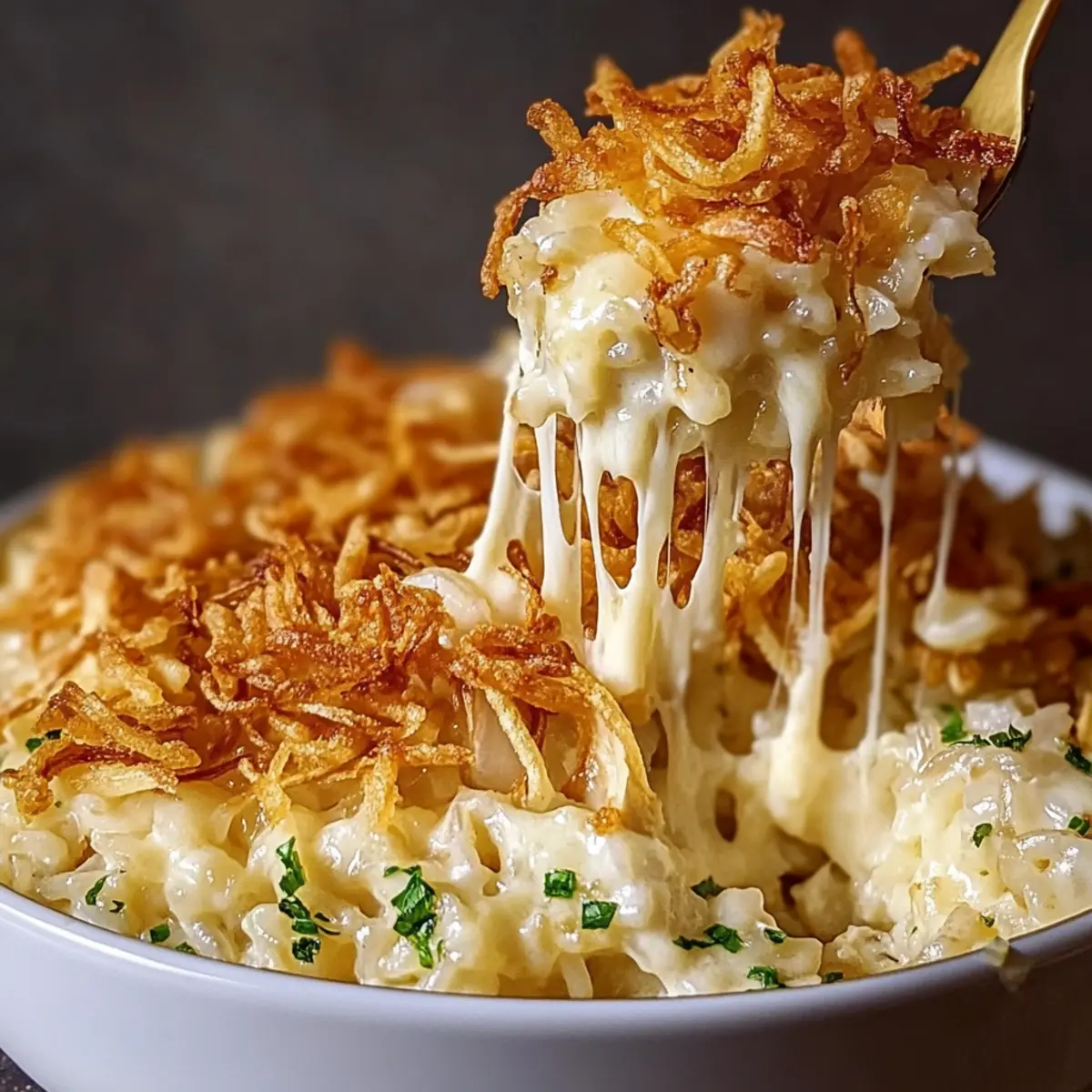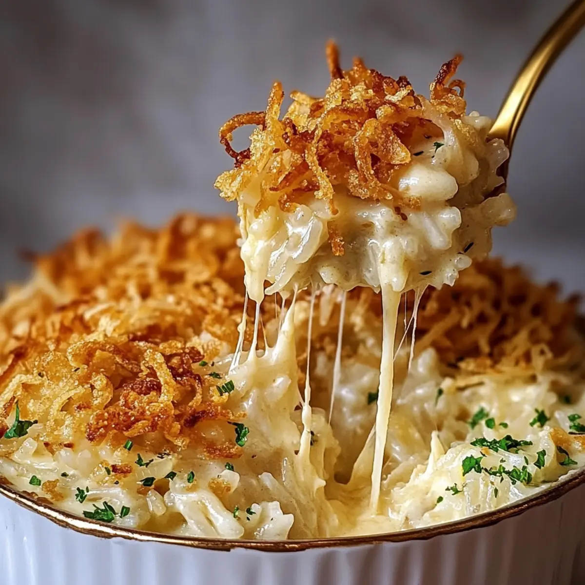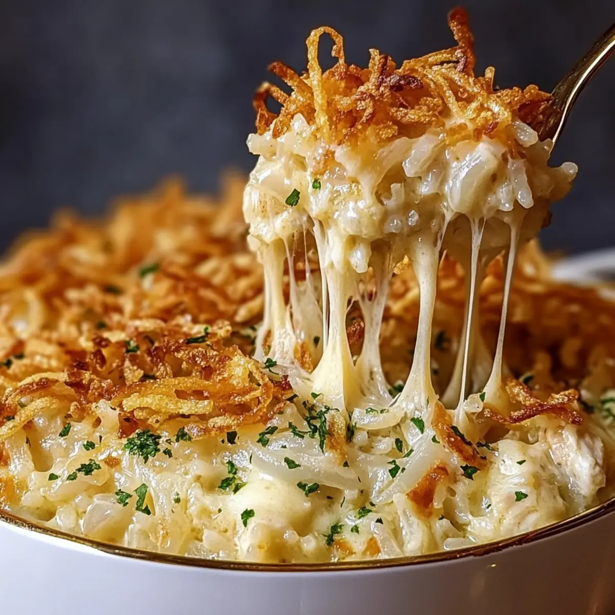 As I stirred the bubbling mixture in the oven, the comforting aroma of my French Onion Chicken Rice Bake filled the kitchen, instantly making me feel at home. This simple yet satisfying dish layers tender chicken, fluffy rice, and creamy soups, all topped with crispy French fried onions—a delightful twist on classic comfort food. Perfect for a quick weeknight dinner, this casserole can be on your table in just 45 minutes, making it both a time-saver and a crowd-pleaser. Plus, it’s easily adaptable; you can sneak in some veggies for a nutritious boost or use rotisserie chicken for even swifter prep. So, are you ready to transform dinner into a heartwarming experience? Let’s get cooking! Why is this casserole a must-try? Comforting, Cozy Layers: Each bite of this French Onion Chicken Rice Bake envelops you in a warm embrace, ideal for chilly evenings. Quick & Easy: Ready in just 45 minutes, it’s your go-to for weeknight dinners. Crowd-Pleasing Appeal: Everyone—kids and adults—will delight in the creamy goodness. Versatile Twist: Feel free to add veggies for extra flavor or use leftover rotisserie chicken to save time. Dive into this dish for a hassle-free experience that transforms any meal into a cozy celebration! French Onion Chicken Rice Bake Ingredients For the Casserole • Cooked White Rice – Provides structure and base for the casserole. • Shredded Chicken – Adds protein and heartiness to the dish. • Creamy Soups (e.g., cream of mushroom or chicken) – Contributes creaminess and enhances flavor. • Sour Cream – Adds tanginess and creaminess to balance flavors. • Shredded Mozzarella or Swiss Cheese – Melts beautifully and provides a savory topping. • French Fried Onions – Offers a crispy, flavorful topping. • Garlic Powder and Onion Powder – Enhance the dish’s savory profile. • Fresh Parsley – Adds freshness and a pop of color for garnish. Pro Tip: If you’re looking to make a delightful French Onion Chicken Rice Bake, substituting brown rice can provide a nuttier flavor that complements the creamy elements nicely. Step‑by‑Step Instructions for French Onion Chicken Rice Bake Step 1: Preheat the Oven Begin by preheating your oven to 350°F (175°C). This ensures your French Onion Chicken Rice Bake will cook evenly and develop that lovely golden crust. While the oven heats up, gather your ingredients and a large mixing bowl to prepare for the main assembly of the casserole. Step 2: Combine Ingredients In your large mixing bowl, combine the cooked white rice, shredded chicken, creamy soups, sour cream, garlic powder, and onion powder. Mix thoroughly until all ingredients are well incorporated, creating a rich and creamy base for your casserole. You should get a smooth mixture that looks inviting and smells delicious! Step 3: Transfer to Baking Dish Grease a 9×13 inch baking dish with cooking spray or a little butter, ensuring easy removal later. Pour the rice and chicken mixture into the dish, spreading it out evenly to ensure even cooking. The layer should look generous, as this will be the foundation of your comforting French Onion Chicken Rice Bake. Step 4: Add Cheese and Onions Sprinkle half of the shredded mozzarella or Swiss cheese over the rice and chicken mixture to create a luscious layer of meltiness. Next, add a generous layer of French fried onions on top, which will provide that satisfying crunch. The combination of cheese and onions will bring an irresistible aroma as it bakes! Step 5: Bake the Casserole Place the baking dish in the preheated oven and bake uncovered for 30-35 minutes. Watch closely as it cooks; you’ll know it’s ready when the casserole is bubbly and the cheese turns a delightful golden brown. The crunchy onions should also look crispy and tempting at this stage. Step 6: Garnish and Serve Once the baking time is up, carefully remove the casserole from the oven. Let it rest for a few minutes to firm up. Just before serving, sprinkle fresh parsley across the top for a pop of color and freshness. Your delightful French Onion Chicken Rice Bake is now ready to be enjoyed! Expert Tips for French Onion Chicken Rice Bake • Crispy Topping Reminder: To keep the crispy onion topping when reheating, use the oven instead of the microwave to maintain texture. • Advance Assembly: Prepare the casserole a day ahead and refrigerate it. This allows flavors to meld beautifully; just pop it in the oven before serving! • Check Chicken Always: Ensure your shredded chicken is fully cooked beforehand. This significantly simplifies the preparation and enhances food safety. • Fresh Flavors: For an extra punch of flavor, consider using fresh garlic and onions instead of powdered versions to elevate your dish. • Healthy Substitutes: Opt for Greek yogurt instead of sour cream for a lighter version without sacrificing flavor. Enjoy your French Onion Chicken Rice Bake guilt-free! French Onion Chicken Rice Bake Variations Feel free to get adventurous with your French Onion Chicken Rice Bake and make it uniquely yours! Gluten-Free Option: Substitute quinoa for rice for a gluten-free version that’s just as hearty and satisfying. Veggie Boost: Add steamed broccoli or sweet peas to the mix for extra nutrition and a burst of color. Spicy Kick: Spice things up by swirling in some hot sauce or red pepper flakes for that fiery touch! Herb Infusion: Incorporate fresh herbs like thyme or rosemary for an aromatic experience; they pair beautifully with the rich onion flavors. Dairy-Free Delight: Use coconut cream in place of sour cream and swap out the cheese for a dairy-free variety. Protein Swap: Experiment with shredded turkey or even a plant-based protein for a different twist that maintains the deliciousness. Flavor Fusion: Add a can of diced tomatoes or roasted red peppers for a Mediterranean flair that brightens the dish. Decadent Cheese Layer: Try a mix of gouda and sharp cheddar instead of mozzarella for a gourmet touch that’s 