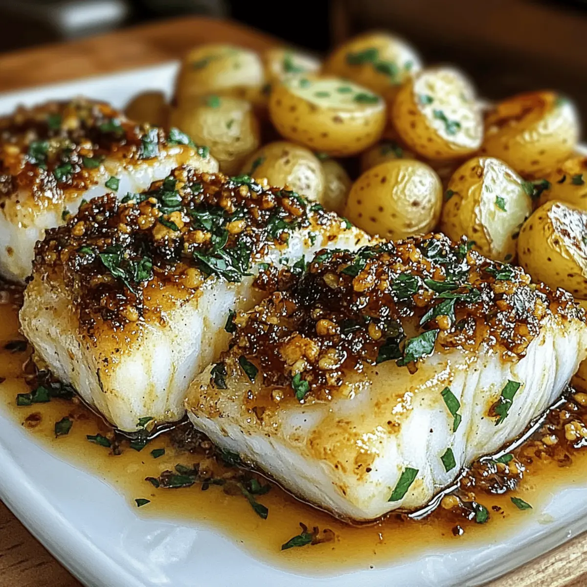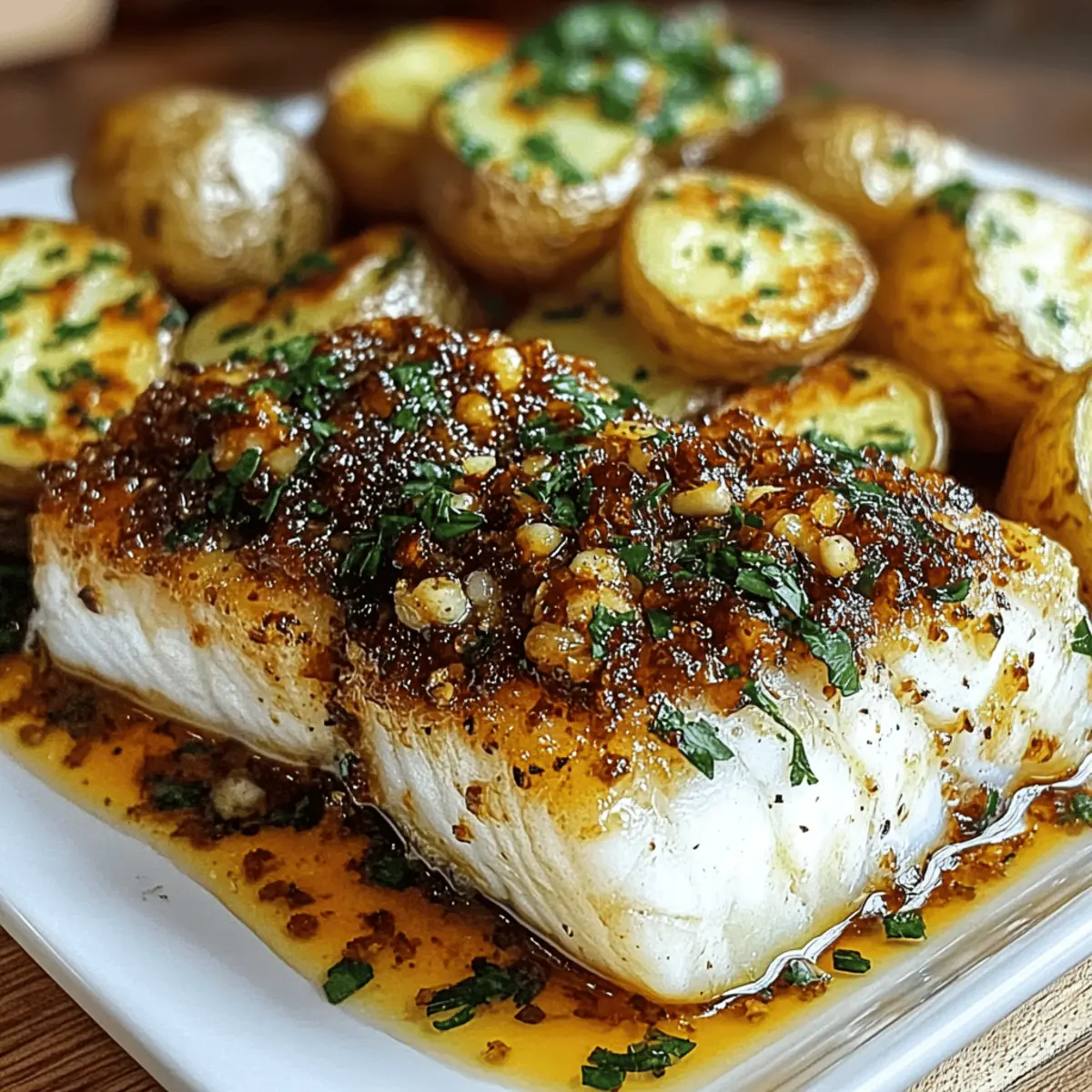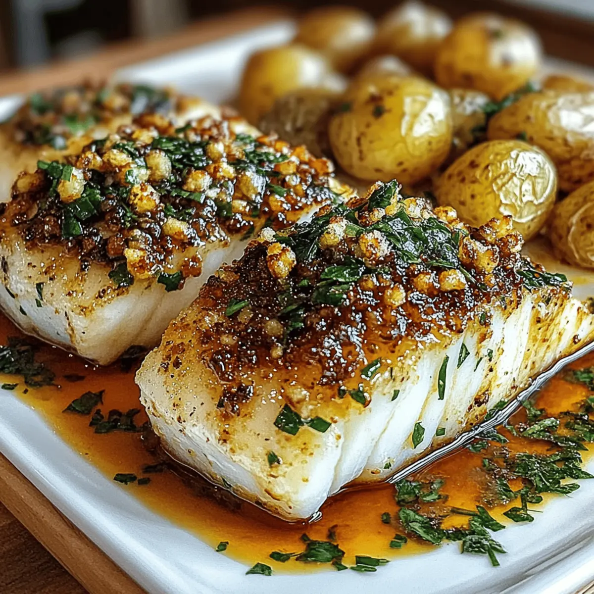As I stood over the stove, the delightful aroma of sizzling garlic began to fill my kitchen, transporting me to a cozy seaside bistro. Today, I’m excited to share my recipe for Garlic Butter Cod with Crispy Roasted Potatoes—a dish that’s not only quick to prepare but also bursts with lean protein and healthy omega-3s. Imagine flaky cod fillets, luscious with garlic butter, paired harmoniously with golden-brown, crispy potatoes. This meal is a true game-changer for busy weeknights when you crave something nutritious yet satisfying, all within an hour. Ready to impress your family or unwind with a delicious dinner? Let’s dive into cooking this simple yet elegant recipe! Why is Garlic Butter Cod a Must-Try? Quick and Easy: This recipe comes together in under an hour, making it perfect for a hectic weeknight dinner. Health Boost: Packed with lean protein and omega-3s, garlic butter cod is a delightful way to enjoy a nutritious meal. Crispy Comfort: The combination of flaky cod and perfectly crispy roasted potatoes offers an irresistible contrast in textures. Flavor Explosion: A rich, garlicky butter sauce elevates the dish, ensuring every bite is bursting with flavor—ideal for satisfying those cravings! Versatile Option: Feel free to swap the cod for other fish like haddock or tilapia, or play with herbs to customize the taste. And if you’re in the mood for more mouthwatering dishes, check out my Garlic Butter Chicken or Roasted Chicken Garlic recipes for additional flavor-packed inspiration! Garlic Butter Cod Ingredients • Discover the essentials for a delightful dish! For the Cod Cod fillets – Lean and rich in omega-3s, perfect for soaking up the garlic butter flavor. Butter – The star of the sauce; ensures a rich and creamy texture in every bite. Garlic – Freshly minced adds aromatic depth; you can use garlic powder in a pinch. Lemon Juice – Brightens the dish and balances the richness of the butter. Fresh Thyme – Adds earthy notes; dried thyme can be used as a substitute. Salt and Pepper – Essential for seasoning to taste. For the Roasted Potatoes Baby Potatoes – Their natural sweetness enhances the dish and provides satisfying carbs. Olive Oil – Drizzled over potatoes for roasting, promoting a crispy exterior. Paprika – Optional spice for an extra layer of flavor on your potatoes. For Garnish Fresh Parsley – Sprinkle on top for a pop of color and freshness. Step‑by‑Step Instructions for Garlic Butter Cod with Roasted Potatoes Step 1: Preheat the Oven Begin by preheating your oven to 425°F (220°C). This high temperature is crucial for achieving crispy roasted potatoes. While your oven heats up, gather your baking sheet and prepare to roast those delicious baby potatoes to a perfectly golden hue. Step 2: Prepare the Potatoes Take your halved baby potatoes and toss them in a bowl with olive oil, garlic powder, paprika, salt, and pepper. Make sure each potato is well-coated for maximum flavor. Spread them evenly on your prepared baking sheet, ensuring they have enough space to crisp up nicely during roasting. Step 3: Roast the Potatoes Place the baking sheet in the oven and roast the potatoes for 20-25 minutes. Halfway through, flip them to ensure even cooking until they are golden and tender. This step brings out their natural sweetness and creates that irresistible crispy exterior you crave in your Garlic Butter Cod with Roasted Potatoes. Step 4: Make the Garlic Butter While the potatoes roast, melt butter in a saucepan over medium heat. Add minced garlic and sauté for 1-2 minutes until fragrant and golden, being careful not to let it burn. Remove from heat and stir in lemon juice and fresh thyme. This lovely garlic butter will soon coat your cod for a rich flavor. Step 5: Cook the Cod Season your cod fillets with salt and pepper. In a skillet over medium-high heat, warm olive oil until shimmering, then gently place the fillets in the pan. Sear each side for 3-5 minutes until the cod is golden brown and flakes easily with a fork, ensuring it is perfectly cooked for your Garlic Butter Cod. Step 6: Combine Cod with Sauce Once the cod is cooked, pour the prepared garlic butter generously over the fillets, allowing the flavors to infuse beautifully. Let them sit for a minute, soaking up the delicious garlic and herb goodness while the roasted potatoes finish baking in the oven. Step 7: Serve and Garnish When the potatoes are done roasting, plate your Garlic Butter Cod next to the crispy potatoes. Drizzle any remaining garlic butter on top and garnish with fresh parsley for a touch of color and brightness. Serve your meal with lemon wedges for an added zing, and enjoy! Expert Tips for Garlic Butter Cod Pat Dry: Ensuring your cod fillets are patted dry before cooking will help achieve a perfect sear, avoiding steaming. Space Out Potatoes: Avoid overcrowding the baking sheet when roasting the potatoes; this prevents them from getting crispy and helps them roast evenly. Check Doneness: Use a meat thermometer to ensure the cod reaches an internal temperature of 145°F (63°C) for perfectly cooked Garlic Butter Cod. Herb Variations: Feel free to experiment with different herbs like dill or oregano instead of thyme for a personalized flavor twist. Serving Freshness: Garnish with fresh parsley and serve with lemon wedges to brighten up the dish and enhance the presentation. What to Serve with Garlic Butter Cod with Roasted Potatoes Elevate your dining experience with delightful sides that complement the richness of creamy garlic butter and crispy potatoes. Fresh Arugula Salad: A light salad with lemon vinaigrette adds brightness and contrasts beautifully with the hearty cod. Steamed Asparagus: Crisp-tender asparagus brings a fresh crunch, enhancing the meal with vibrant color and nutrients. Garlic Bread: Crisp, buttery slices pack an extra punch of garlic flavor while providing a delightful textural contrast. Ratatouille: This classic vegetable medley introduc