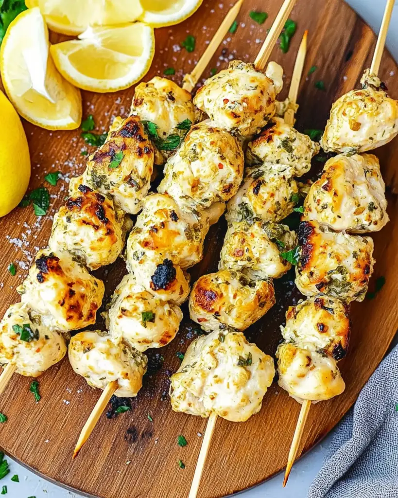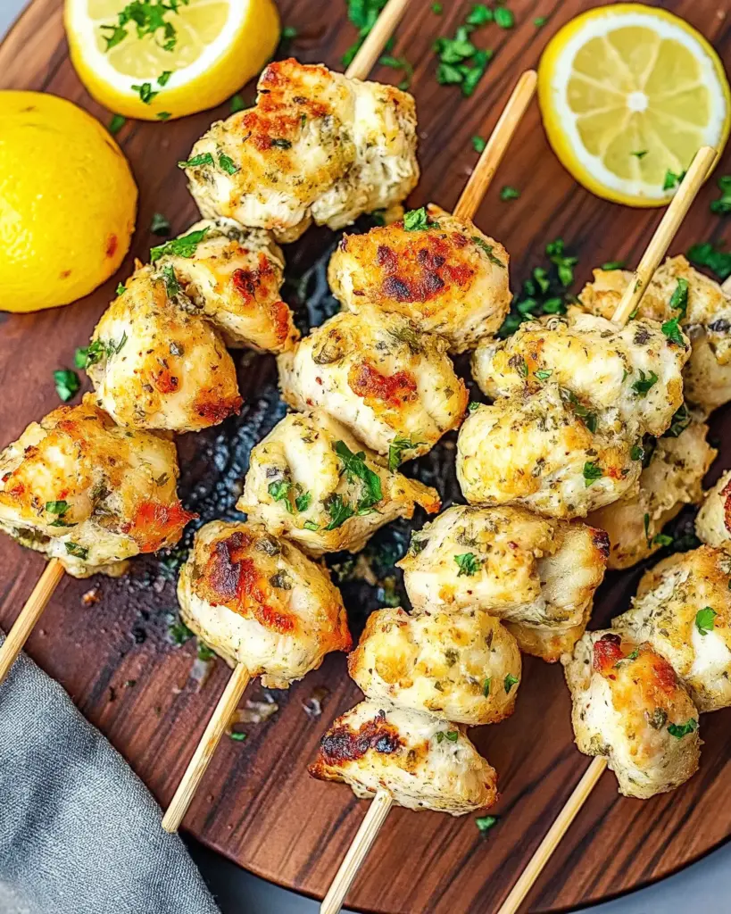 Introduction to Garlic Parmesan Chicken Skewers These Garlic Parmesan Chicken Skewers are a perfect blend of bold garlic flavor and rich, cheesy parmesan, grilled to juicy perfection. Ideal for appetizers, weeknight dinners, or party platters, they bring a delicious twist to classic chicken skewers. Easy to prepare and packed with savory goodness, these skewers are sure to become a favorite for gatherings or casual meals alike. Why You’ll Love This Garlic Parmesan Chicken Skewers Bold Garlic Flavor: Fresh garlic infuses every bite with robust taste. Savory Parmesan Coating: Adds a rich, cheesy crust that complements the chicken beautifully. Juicy and Tender: Properly marinated and grilled for moist, flavorful meat. Easy to Make: Minimal ingredients and simple steps perfect for any cooking skill level. Versatile Serving: Great as a main dish, appetizer, or part of a larger spread. Perfect for Entertaining: Crowd-pleasing finger food for parties and barbecues. Customizable: Pair with dipping sauces or add herbs for extra flavor. Ingredients for Garlic Parmesan Chicken Skewers These skewers start with simple ingredients that pack a punch of cheesy, garlicky goodness. Here’s what you’ll need: Boneless, skinless chicken breasts: The star of the show! Cut into 1-inch cubes for even cooking. Olive oil: This adds moisture and helps the flavors meld together beautifully. Garlic: Freshly minced garlic brings a punch of flavor that elevates the dish. Parmesan cheese: Grated for that rich, nutty taste that pairs perfectly with chicken. Italian seasoning: A blend of herbs that adds depth and a touch of Mediterranean flair. Salt and black pepper: Essential for enhancing all the flavors in the marinade. Fresh parsley: A sprinkle on top not only adds color but also a fresh taste. Skewers: Wooden or metal, these are necessary for assembling your delicious bites. Feel free to get creative! For a spicy kick, toss in some red pepper flakes. If you’re looking for alternatives, shrimp or cubed tofu can be great substitutes for chicken. For exact measurements, check the bottom of the article where you can find everything available for printing. How to Make Garlic Parmesan Chicken Skewers Making Garlic Parmesan Chicken Skewers is a straightforward process that anyone can master. Let’s dive into the steps that will lead you to a delicious meal in no time! Step 1: Prepare the Skewers If you’re using wooden skewers, soak them in water for at least 30 minutes. This prevents them from burning in the air fryer. Metal skewers? You can skip this step! Step 2: Make the Marinade In a large bowl, combine the olive oil, minced garlic, grated Parmesan cheese, Italian seasoning, salt, and black pepper. Mix it well until you have a smooth marinade. The aroma will already start to make your mouth water! Step 3: Marinate the Chicken Add the chicken cubes to the bowl with the marinade. Toss everything together until the chicken is well coated. Let it sit for about 15 minutes to absorb those fantastic flavors. Step 4: Assemble the Skewers Now it’s time to thread the marinated chicken onto the skewers. Make sure to leave a little space between each piece for even cooking. This is where you can get creative—alternate with veggies if you like! Step 5: Preheat the Air Fryer Preheat your air fryer to 400°F. This step is crucial for achieving that perfect crispy exterior. While it heats up, you can finish assembling your skewers. Step 6: Cook the Skewers Place the skewers in the air fryer basket in a single layer. Avoid overcrowding to ensure they cook evenly. Cook for 10-12 minutes, flipping halfway through. You’ll know they’re done when the chicken reaches an internal temperature of 165°F. Step 7: Garnish and Serve Once cooked, remove the skewers from the air fryer. Sprinkle with fresh parsley for a pop of color and flavor. Serve them hot, and watch them disappear from the plate! Tips for Success Always soak wooden skewers for at least 30 minutes to prevent burning. For extra flavor, let the chicken marinate longer—up to an hour if you have time. Don’t overcrowd the air fryer; cook in batches if necessary for even cooking. Experiment with different herbs or spices in the marinade for a unique twist. Serve with a side of dipping sauce for added flavor! Equipment Needed Air Fryer: The star appliance for cooking these skewers quickly and evenly. If you don’t have one, a grill or oven works too. Skewers: Wooden or metal skewers are essential. If you’re in a pinch, use toothpicks for smaller bites. Mixing Bowl: A large bowl for marinating the chicken. Measuring Cups and Spoons: For accurate ingredient measurements. Variations Spicy Garlic Parmesan: Add red pepper flakes or a dash of hot sauce to the marinade for a fiery kick. Herb-Infused: Experiment with fresh herbs like rosemary or thyme in the marinade for a fragrant twist. Vegetarian Option: Substitute chicken with cubed tofu or hearty vegetables like bell peppers and zucchini for a plant-based version. Cheesy Delight: Mix in some mozzarella cheese with the Parmesan for an extra cheesy experience. Asian-Inspired: Swap the Italian seasoning for soy sauce, ginger, and sesame oil for a unique flavor profile. Serving Suggestions Fresh Salad: Pair the skewers with a crisp Caesar or garden salad for a refreshing contrast. Dipping Sauce: Serve with a side of marinara or garlic aioli for an extra flavor boost. Grilled Veggies: Complement with grilled vegetables like zucchini or bell peppers for a colorful plate. Wine Pairing: Enjoy with a chilled white wine, like Sauvignon Blanc, to enhance the meal. FAQs about Garlic Parmesan Chicken Skewers Can I use frozen chicken for this recipe? While fresh chicken is ideal, you can use frozen chicken. Just make sure to thaw it completely before marinating. This ensures the flavors penetrate well and the chicken cooks evenly in the air fryer. How do I store leftovers? Store any leftover Garlic Parmesan Chicken Skewers in an 