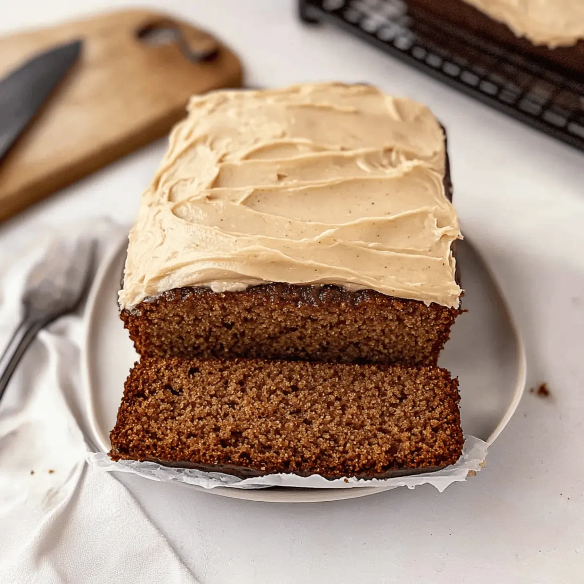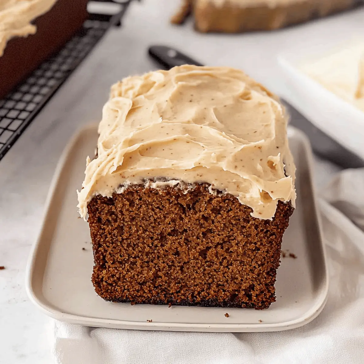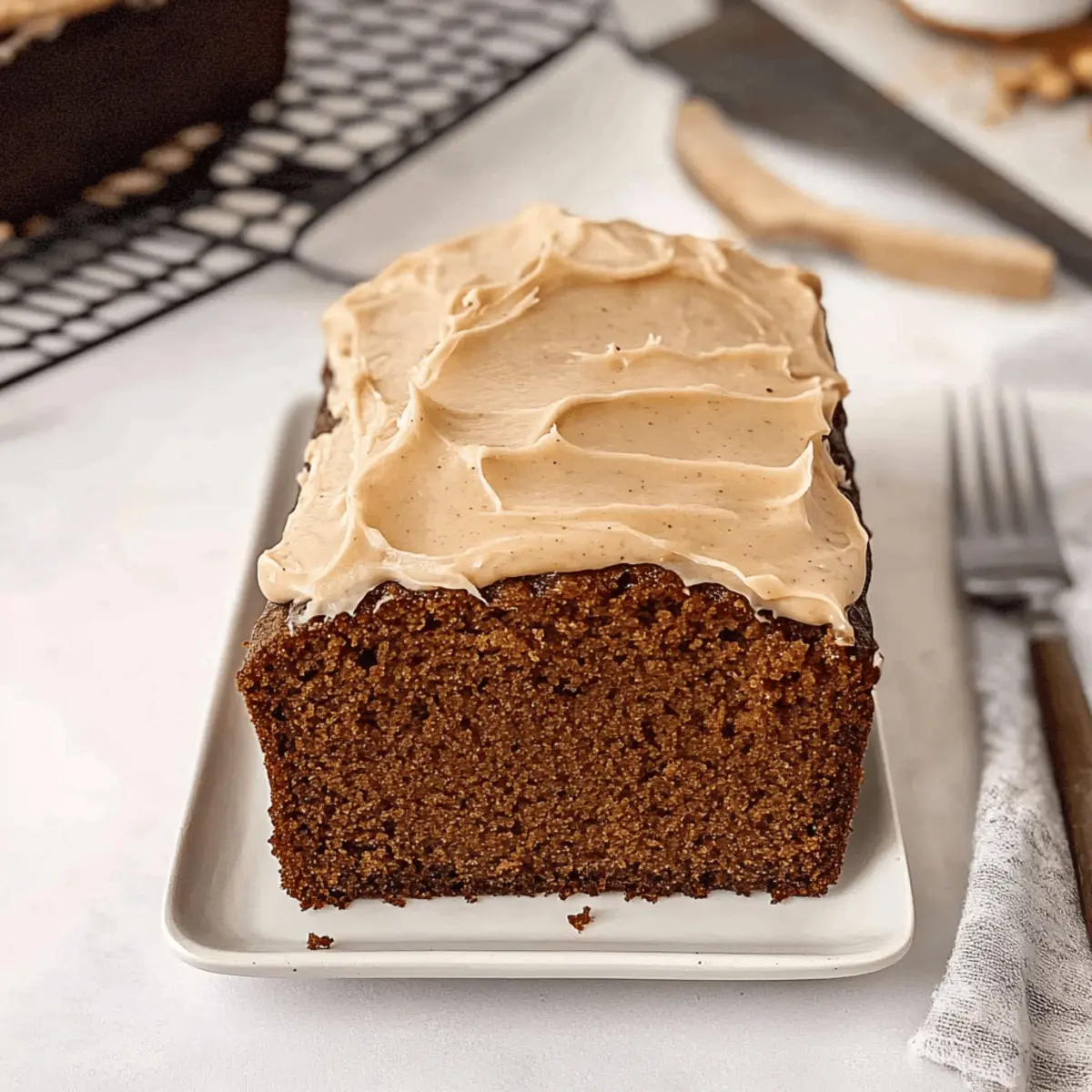 The kitchen fills with the warm, inviting scent of ginger and cinnamon, evoking memories of festive gatherings and cozy winter afternoons. My Gingerbread Loaf is a delightful twist on the classic holiday staple, featuring a moist, cake-like texture that bursts with all the comforting spices we love. This versatile loaf isn’t just perfect for breakfast or as an afternoon snack—it makes an exceptional homemade gift, beautifully topped with rich brown butter cream cheese frosting. Not only will it bring a touch of holiday magic to your table, but it also freezes exceptionally well, allowing you to savor that joyous flavor whenever the mood strikes. Are you ready to fill your home with the spirit of the season? Let’s get baking! Why is this Gingerbread Loaf a Must-Try? Irresistible aroma: The heavenly scent of ginger and cinnamon will have everyone flocking to your kitchen. Versatile delight: Perfect for breakfast, an afternoon snack, or as a festive dessert. Easy to make: This recipe simplifies the baking process with straightforward steps and readily available ingredients. Gift-worthy: Package it beautifully to share as a thoughtful homemade gift during the holidays. Freezer-friendly: Make it ahead and enjoy a slice whenever you need a taste of comfort—just pull it from the freezer! Embrace the season’s spirit with this cozy Gingerbread Loaf that captures the essence of holiday baking. A slice paired with your favorite hot beverage is sure to bring joy! Gingerbread Loaf Ingredients • Essential for Your Holiday Baking For the Loaf All-purpose flour – Provides structure; can substitute with a gluten-free flour blend for a gluten-free version. Baking soda – Acts as a leavening agent for rise; ensure it’s fresh for best results. Kosher salt – Enhances flavor; can reduce or omit if sensitive to sodium. Ground ginger – Adds signature spice; consider fresh minced ginger for a stronger flavor. Ground cinnamon – Contributes warm sweetness and depth to your Gingerbread Loaf. Ground nutmeg – Complements spices with nutty flavor; can substitute with allspice. Ground cloves – Adds depth to the flavor profile; omit for a lighter taste. Egg (room temperature) – Binds ingredients and adds moisture; flax egg as a vegan alternative works well. Vanilla extract – Enhances flavor complexity in the loaf. Unsalted butter (room temperature) – Adds moisture and richness; can use coconut oil for a dairy-free alternative. Light brown sugar (packed) – Provides sweetness and moisture; dark brown sugar enhances flavor. Molasses – Essential for traditional gingerbread flavor and moisture; choose unsulfured molasses for a mellow sweetness. Buttermilk (room temperature) – Reacts with baking soda to aid rise and adds tang; can replace with milk plus vinegar (1 tbsp vinegar to 1 cup milk). For the Frosting Brown butter – Offers a rich, nutty flavor; using standard melted butter will lose that distinctive richness. Cream cheese – Base for frosting; full-fat produces the creamiest texture; substitute with mascarpone for a different twist. Powdered sugar (sifted) – Sweetens frosting and is essential for achieving the right texture; cornstarch can help stabilize. Vanilla extract (for frosting) – Adds a delightful depth of flavor; almond extract gives it a unique twist. Salt (for frosting) – Balances sweetness and enhances flavor notes. Get ready to create a heartwarming Gingerbread Loaf that will surely bring smiles and comfort to all! Step‑by‑Step Instructions for Gingerbread Loaf Step 1: Preheat and Prepare Begin by preheating your oven to 350°F (175°C) and lining a loaf pan with parchment paper, letting the edges hang over for easy removal later. This ensures a perfectly baked Gingerbread Loaf that won’t stick. Set your prepared pan aside while you gather and measure your dry ingredients. Step 2: Sift Dry Ingredients In a medium bowl, sift together 2 cups of all-purpose flour, 1 teaspoon of baking soda, ½ teaspoon of kosher salt, 2 teaspoons of ground ginger, 1 teaspoon of ground cinnamon, ½ teaspoon of ground nutmeg, and ½ teaspoon of ground cloves. This step aerates the flour and evenly distributes the spices, resulting in a beautifully flavored loaf. Set this mixture aside for later. Step 3: Cream Butter and Sugar In a large mixing bowl, cream together ½ cup of room temperature unsalted butter and 1 cup of packed light brown sugar until the mixture is smooth and fluffy, about 3-5 minutes using an electric mixer. The sugar should dissolve completely into the butter, creating a light texture that will help your Gingerbread Loaf rise beautifully. Step 4: Add Molasses and Egg Next, add ¾ cup of unsulfured molasses, 1 large room temperature egg, and 1 teaspoon of vanilla extract to the creamed mixture. Mix thoroughly until well combined, ensuring the molasses adds its rich flavor throughout the batter. This combination will also contribute to the lovely moistness of your Gingerbread Loaf. Step 5: Alternate Adding Dry Ingredients and Buttermilk Gradually mix in the flour mixture you prepared earlier, alternating with ½ cup of room temperature buttermilk. Start and finish with the dry ingredients, mixing just until combined to avoid overmixing. This step ensures a tender, moist Gingerbread Loaf, holding in all those wonderful spices and flavors you’ve introduced. Step 6: Bake the Gingerbread Loaf Pour the thick batter into your prepared loaf pan, smoothing the top with a spatula. Bake in the preheated oven for 50-55 minutes, or until a toothpick inserted into the center comes out clean. The top should be golden brown and slightly dome-shaped, filling your kitchen with those heavenly holiday aromas. Step 7: Cool the Loaf Once baked, remove the Gingerbread Loaf from the oven and allow it to cool in the pan for about 20 minutes. This cooling period helps the loaf firm up and makes it easier to remove from the pan. After cooling, carefully transfer it to a wire rack t