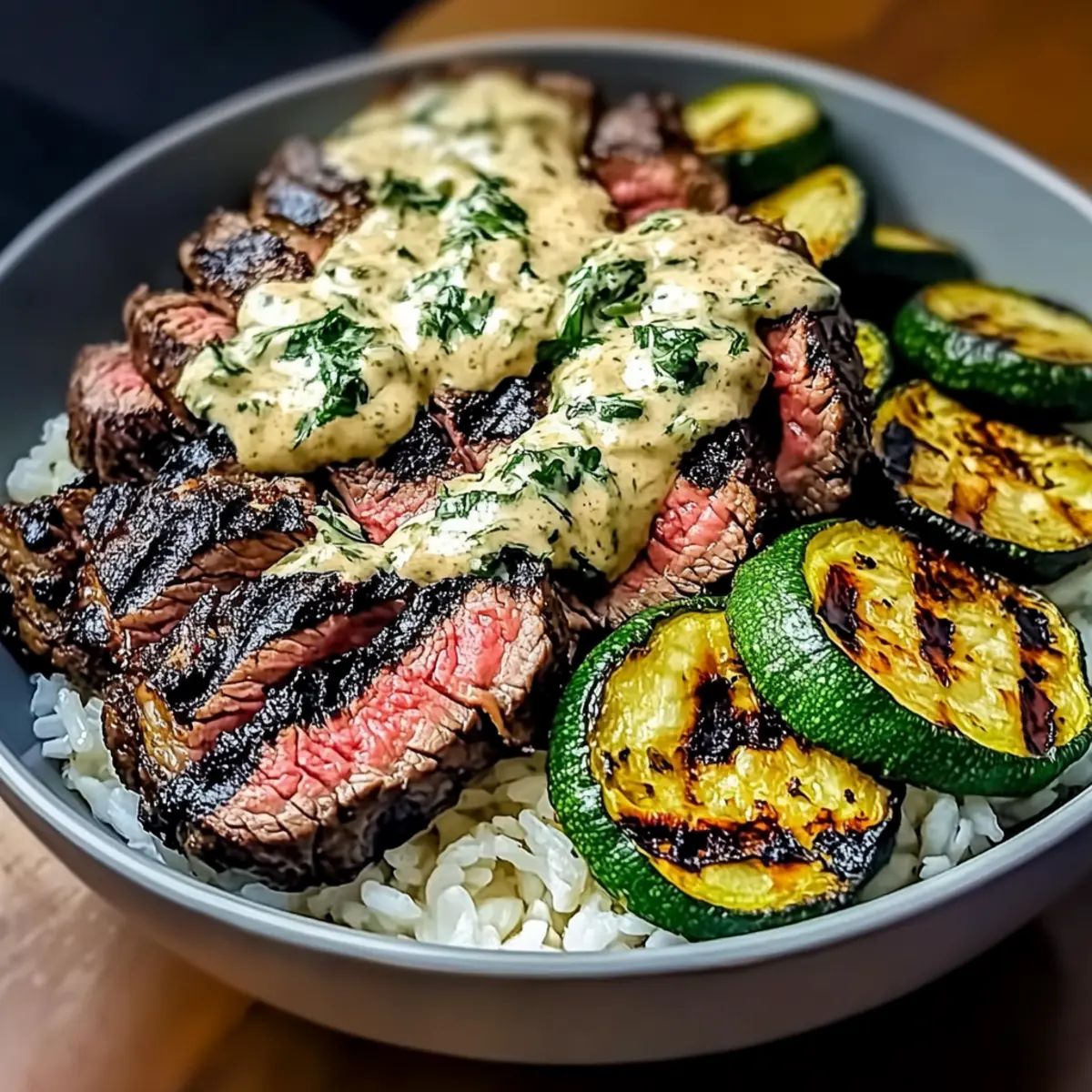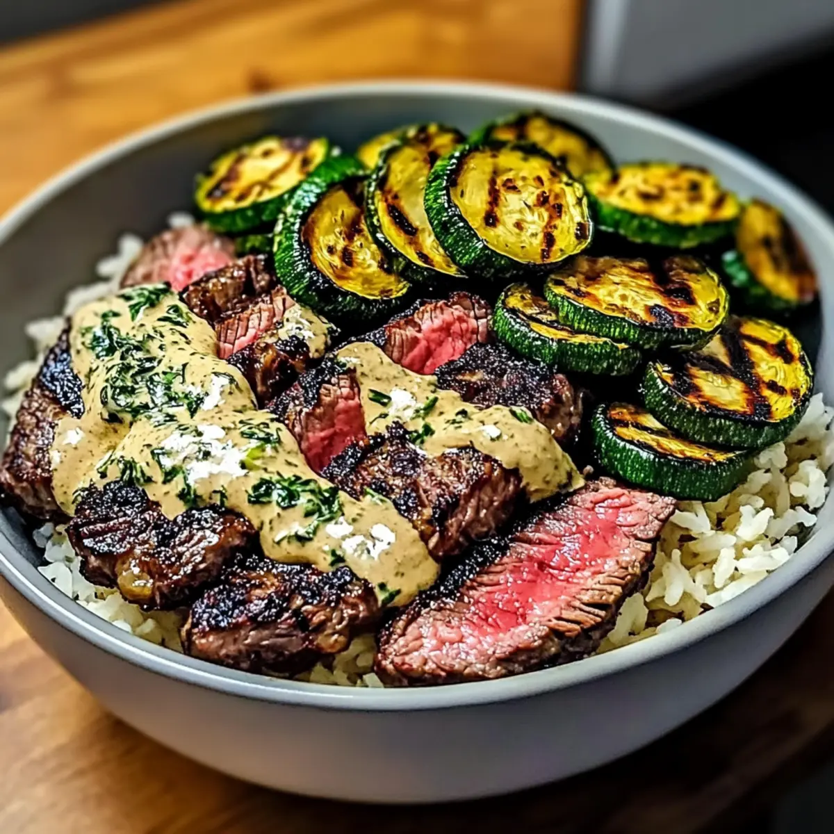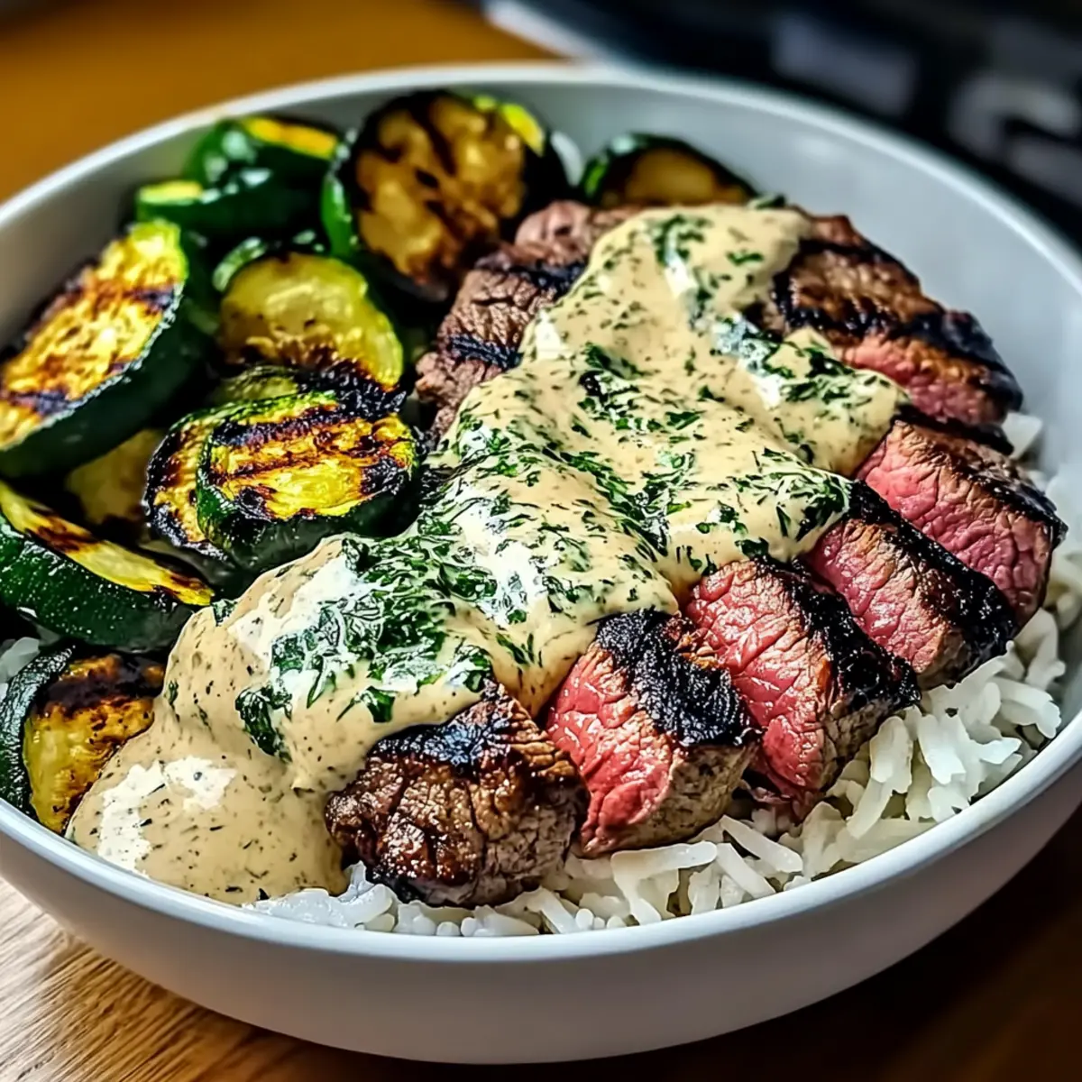 As the sun dips below the horizon, the sizzling sound of steak on the grill fills the air, hinting at a delightful meal ahead. This Customizable Grilled Steak Bowl with Creamy Herb Sauce & Grilled Zucchini is not just another dinner; it’s a comforting hug on a plate. Perfect for when I crave something hearty yet quick, this recipe offers endless adaptability—swap in chicken, shrimp, or even tofu for a plant-based twist. Not only do I love how simple it is to prepare, but it also allows me to pack a week’s worth of flavor into those bowls, making meal prep a breeze. Just wait until you drizzle that tangy herb sauce over the grilled goodness! What flavor combinations will you explore in your version? Why is this grilled steak bowl irresistible? Customizable Fun: This Grilled Steak Bowl with Sauce & Grilled Zucchini lets you take the reins, swapping proteins and bases to suit your tastes. Quick Meal Prep: Ideal for busy weeknights, you can prepare delicious bowls in no time. Rich Flavor: The creamy herb sauce perfectly complements the savory steak and smoky zucchini, creating a mouthwatering experience. Versatile Options: Whether you’re craving chicken, shrimp, or tofu, this dish adapts effortlessly to your cravings. Plus, check out my Grilled Shrimp Bowl for another delightful option! Get ready to impress your taste buds—each bite is packed with love and robust flavors! Grilled Steak Bowl Ingredients • Get ready to create deliciousness! For the Steak • Steak – Choose a tender cut like ribeye or sirloin for juiciness. For the Zucchini • Zucchini – It develops a smoky sweetness when grilled, but you can swap it for bell peppers or asparagus. For the Creamy Herb Sauce • Sour Cream or Greek Yogurt – This creamy base adds richness; plant-based yogurt works for a dairy-free option. • Dijon Mustard – Adds a tangy kick; it’s optional, but highly recommended for flavor. • Fresh Herbs (Chives or Parsley) – Fresh herbs elevate the sauce; consider mixing in dill or cilantro for added depth. • Garlic Powder – Infuses savory goodness into the sauce. • Onion Powder – Enhances flavor and adds a bit of sweetness. For Assembly • Cooked Rice or Mashed Potatoes – Serves as a hearty base; jasmine rice is perfect, or try cauliflower mash for a low-carb twist. • Olive Oil – Essential for grilling—don’t skip it! Step‑by‑Step Instructions for Grilled Steak Bowl with Sauce & Grilled Zucchini Step 1: Prepare the Steak Pat the steak dry with paper towels, ensuring a great sear, and season generously with salt, pepper, garlic powder, and onion powder. Allow the steak to rest at room temperature for 15-20 minutes for optimal flavor and tenderness, letting the spices penetrate the meat as it warms up for grilling. Step 2: Make the Creamy Herb Sauce In a medium bowl, whisk together the sour cream (or Greek yogurt), Dijon mustard, fresh herbs, garlic powder, salt, and pepper until smooth and well-combined. Cover the bowl and refrigerate the sauce for at least 10 minutes to allow the flavors to meld, creating a tangy complement to the grilled steak and zucchini. Step 3: Grill the Zucchini Slice the zucchini into 1/2-inch thick rounds and toss them in a bowl with olive oil, salt, and pepper to ensure even coating. Preheat your grill to medium-high heat, then grill the zucchini slices for 2-3 minutes on each side until they develop beautiful grill marks and become tender yet slightly crispy, enhancing their smoky flavor. Step 4: Cook the Steak Place the seasoned steak on the preheated grill. Cook for 3-4 minutes on one side without moving it to achieve a nice sear. Flip the steak and continue grilling for another 3-4 minutes until it reaches an internal temperature of 130°F for medium-rare. To ensure juiciness, let the steak rest for 5-10 minutes before slicing. Step 5: Assemble the Grilled Steak Bowl In a serving bowl, create a hearty base with your choice of cooked rice or mashed potatoes. Add a generous layer of grilled zucchini, then lay the sliced steak on top. Drizzle the creamy herb sauce over the assembled ingredients, allowing the flavors to blend harmoniously in your Grilled Steak Bowl with Sauce & Grilled Zucchini, ready to be enjoyed. What to Serve with Customizable Grilled Steak Bowl with Creamy Herb Sauce Elevate your dining experience with delightful side dishes that perfectly complement this hearty grilled bowl. Garlicky Green Beans: A classic pairing, these tender green beans bring a pop of color and a fresh crunch that balances the richness of the steak bowl. Crisp Garden Salad: Tossed with a light vinaigrette, a vibrant salad adds a refreshing contrast, making each bite of the bowl feel lighter and more balanced. Creamy Risotto: This rich and flavorful side is the ultimate comfort food. Its creamy texture complements the grilled steak beautifully, offering an indulgent twist. Roasted Sweet Potatoes: With their natural sweetness, roasted sweet potatoes provide a lovely contrast to the savory elements of the bowl while adding a nutritious touch. Chilled White Wine: A glass of chilled Sauvignon Blanc or Chardonnay enhances the flavors of both the steak and the herb sauce, offering a delightful dining experience. Zesty Coleslaw: This crunchy side dish adds a tangy bite, cutting through the creaminess of the sauce and giving your meal that extra zing. Garlic Bread: Simply irresistible, garlic bread is perfect for soaking up any leftover creamy herb sauce, bringing your grilled steak bowl to a delicious conclusion. How to Store and Freeze Grilled Steak Bowl Fridge: Store assembled bowls in airtight containers for up to 3 days, ensuring the creamy herb sauce is kept separate to maintain freshness. Freezer: You can freeze cooked steak and zucchini for up to 3 months. Be sure to place in freezer-safe containers, and thaw overnight in the fridge before reheating. Reheating: Gently reheat the steak and zucchini on a skillet or in the microwave, ensuring the d