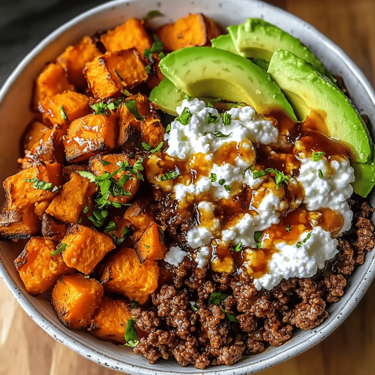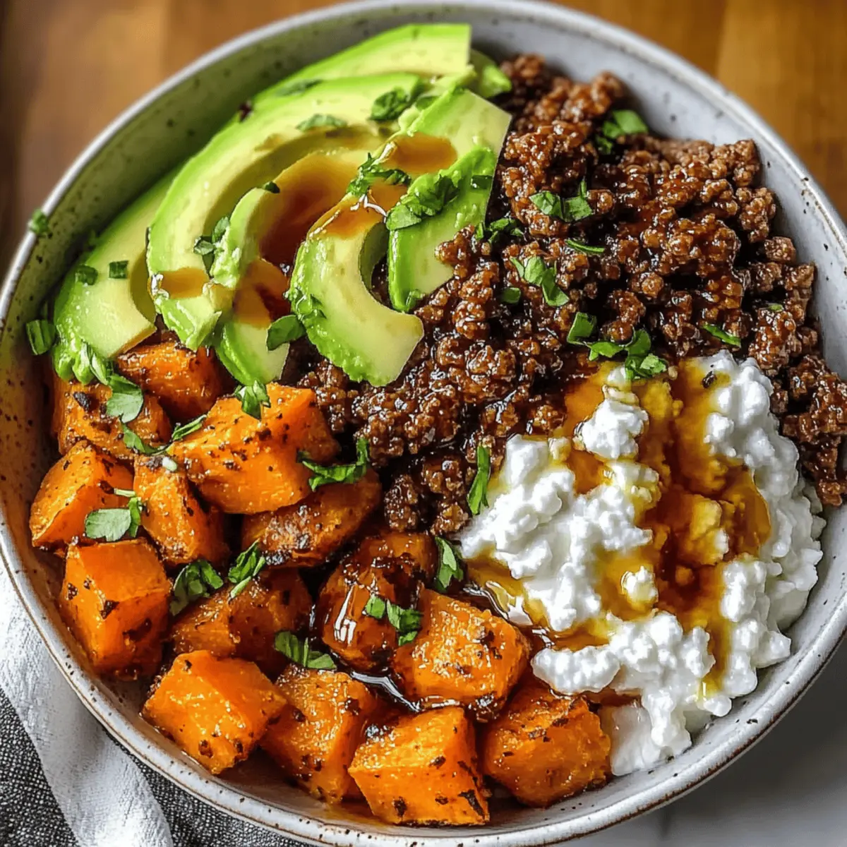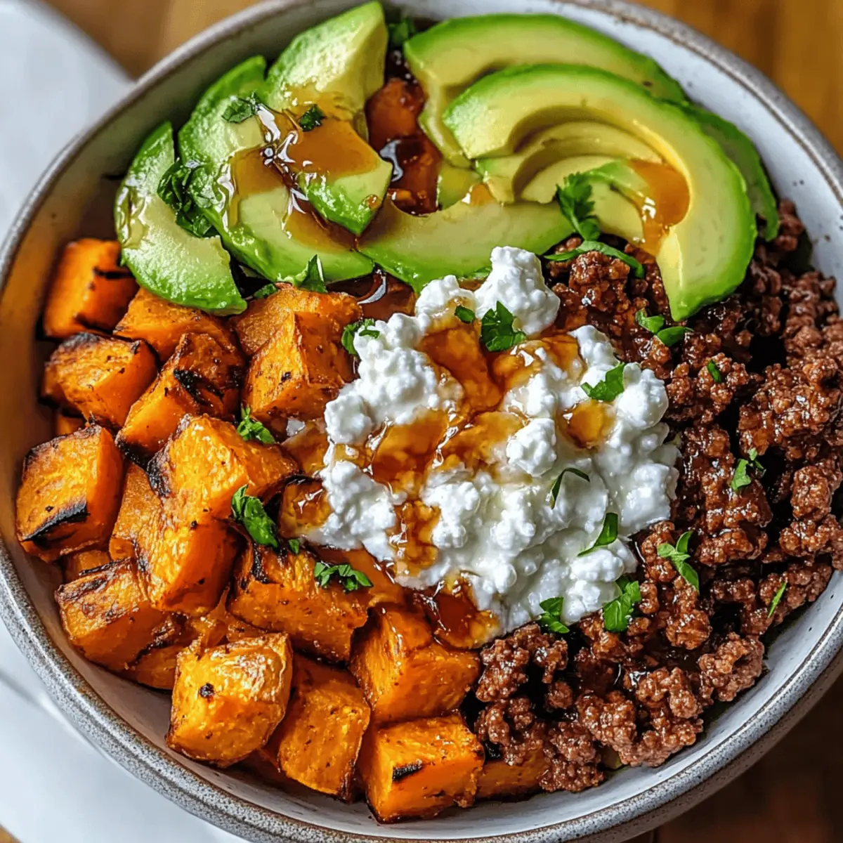 4. Assemble the bowl by layering sweet potatoes, ground beef, cottage cheese, and avocado.