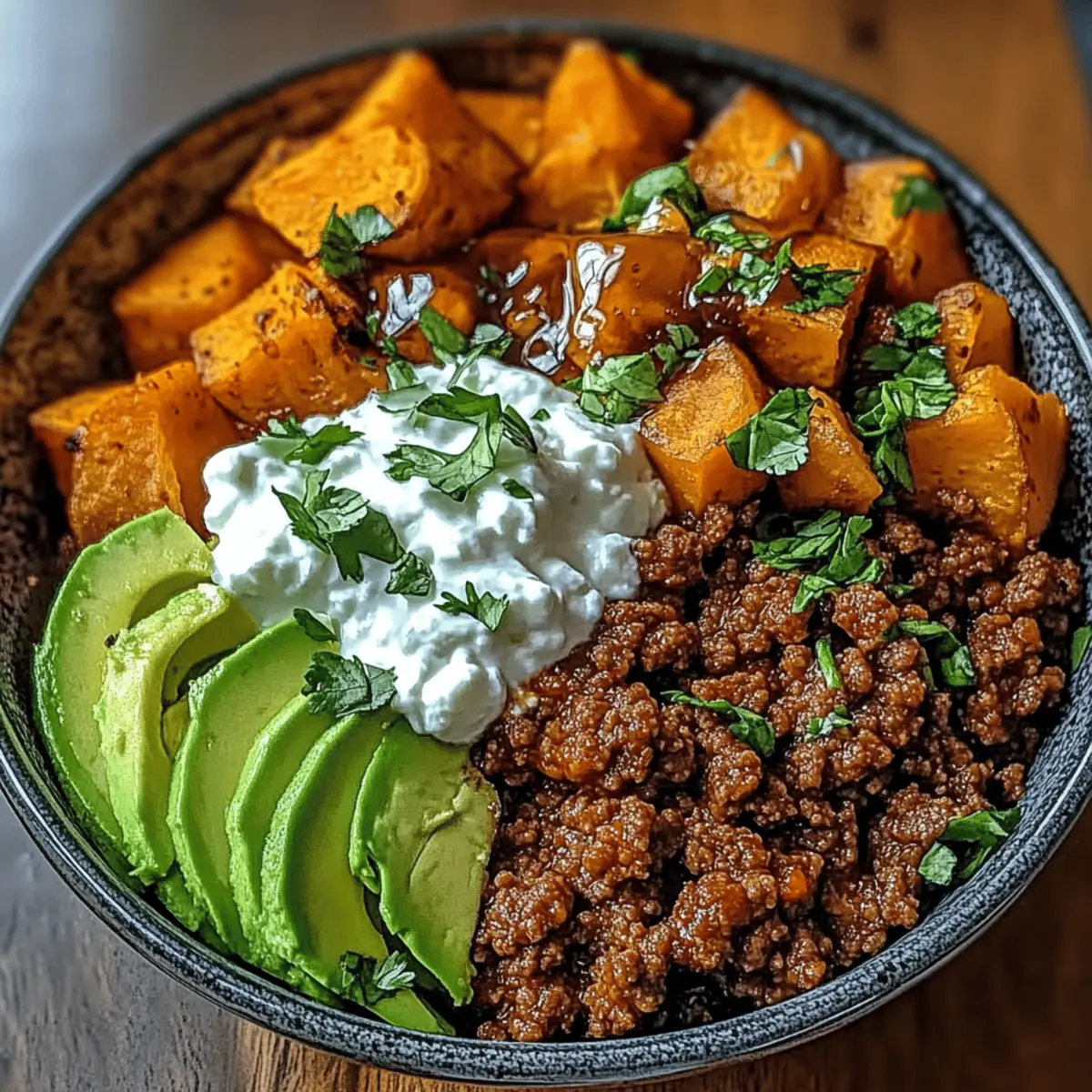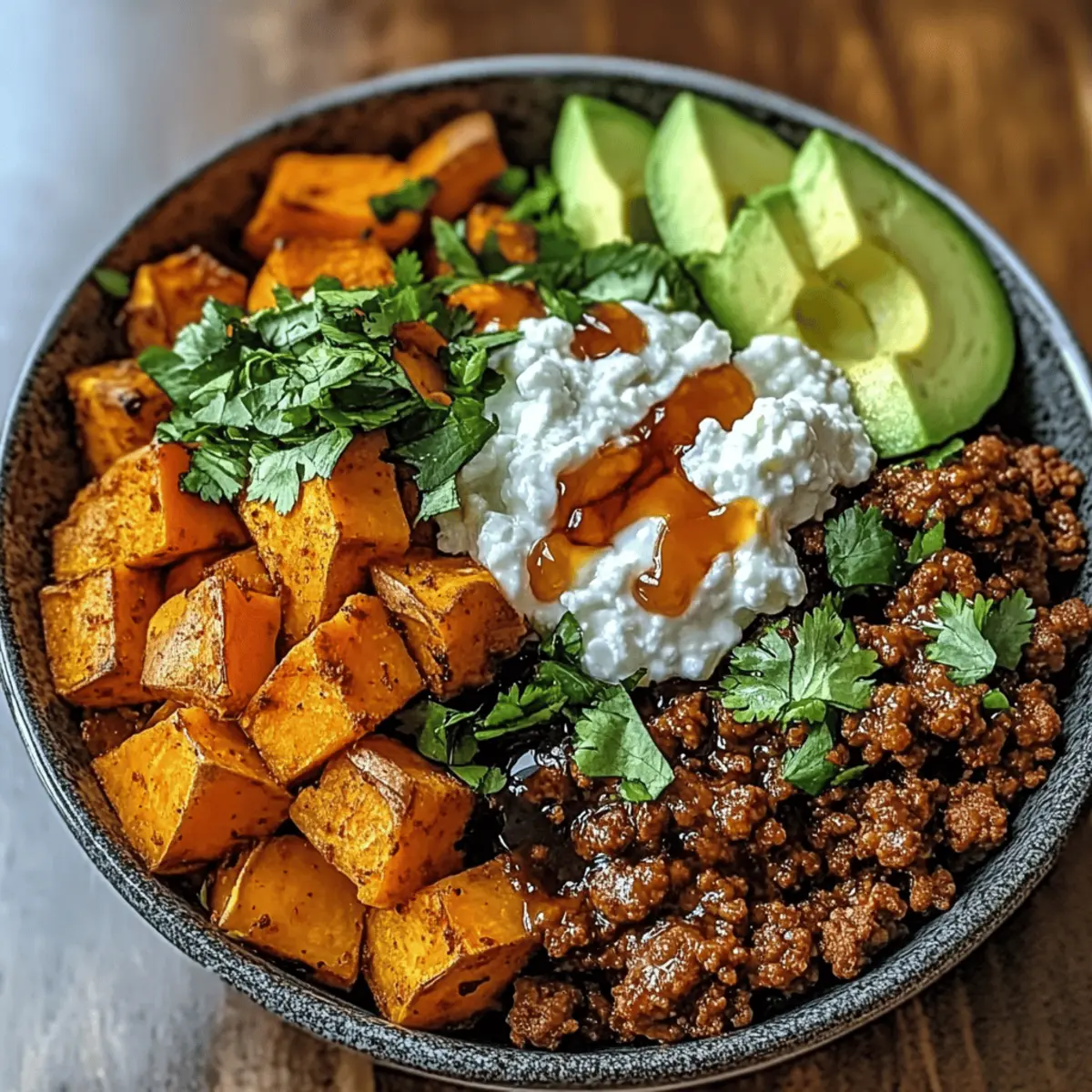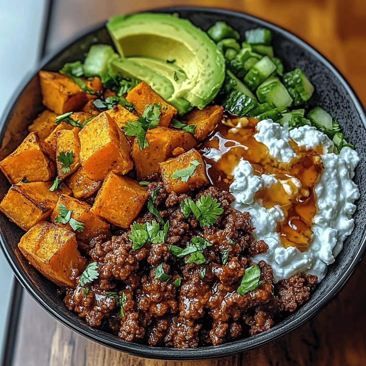 Once everything is ready, it’s time to assemble your Ground Beef Hot Honey Bowls. Start by layering a generous scoop of roasted sweet potatoes at the bottom of each bowl, followed by a layer of the savory ground beef mixture. Then, add sliced avocado and a portion of creamy cottage cheese on top for that delightful creaminess.
