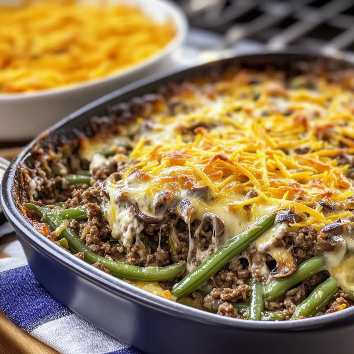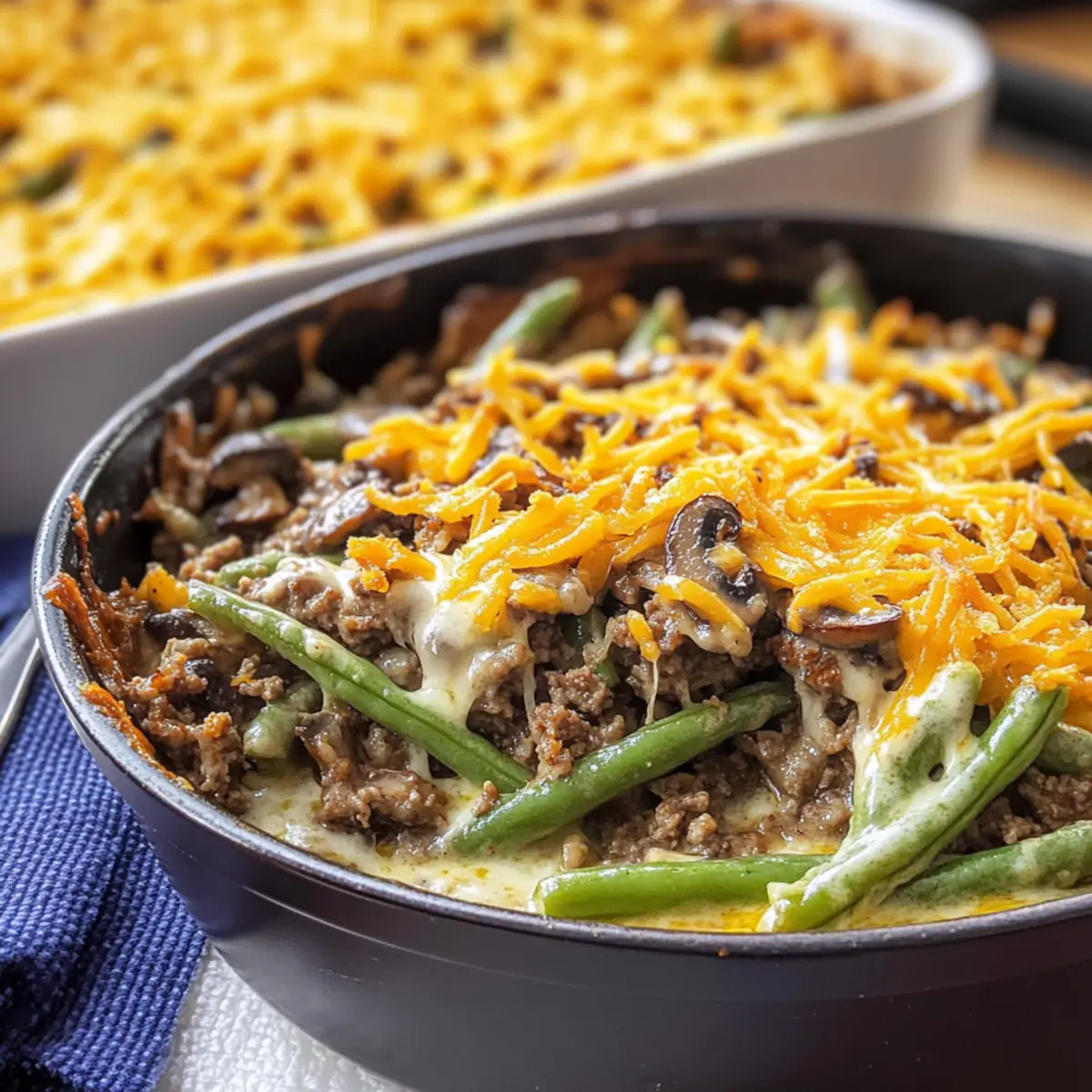 Enjoy a comforting Hamburger Green Bean Casserole with Mushrooms, a gluten-free, keto-friendly, one-pan meal perfect for family dinners.