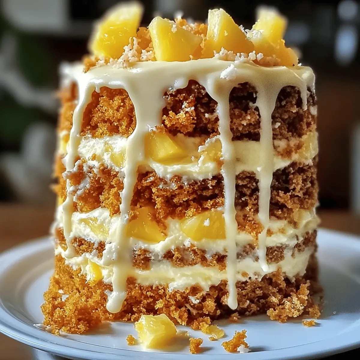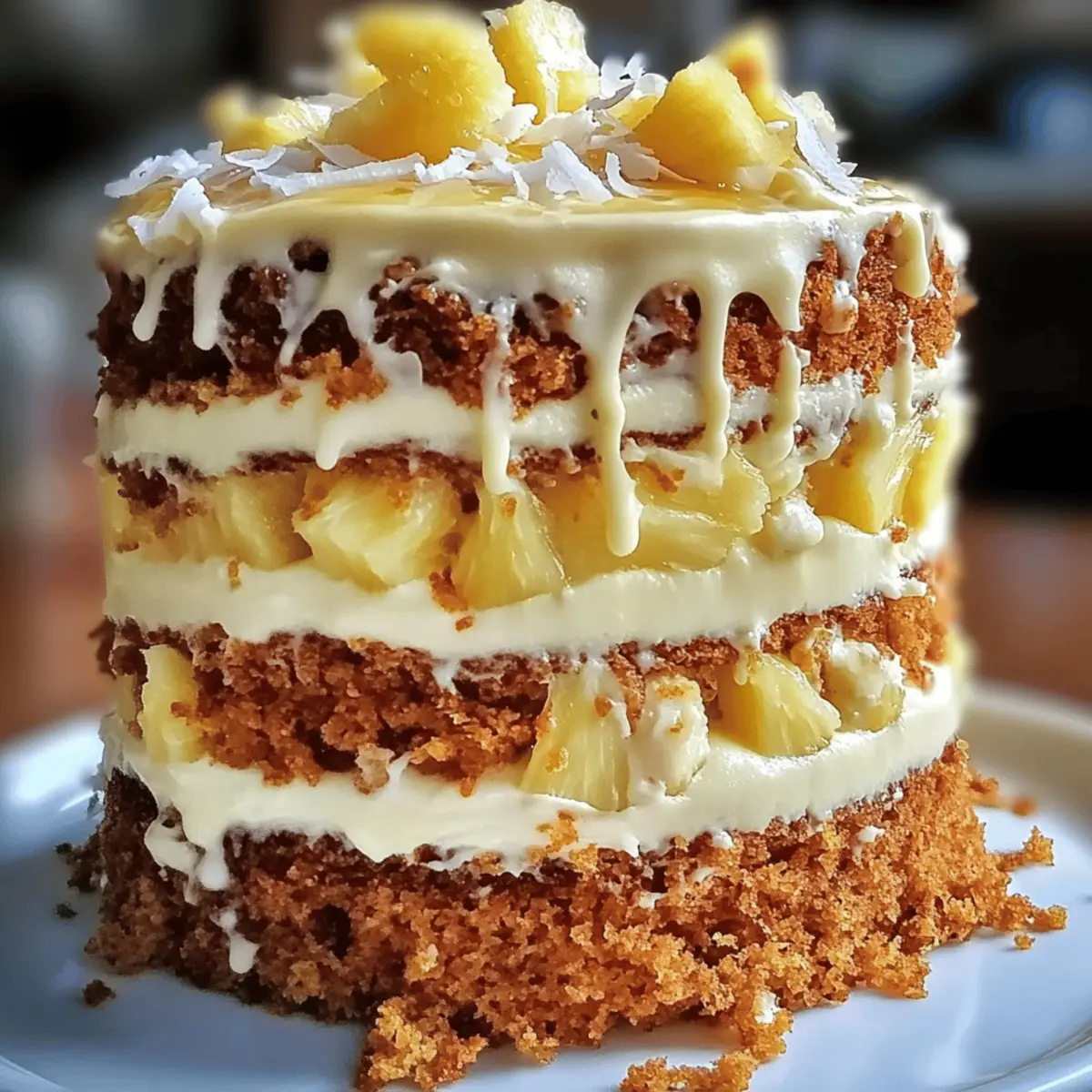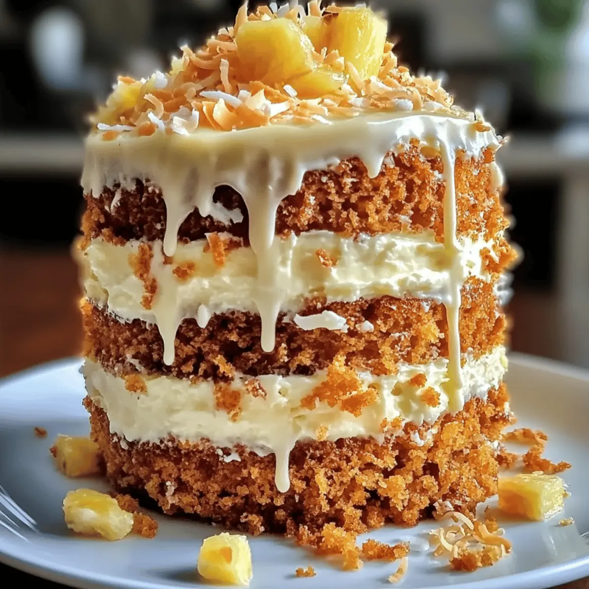 As I sifted through my pantry, hoping to conjure up a little tropical magic, I stumbled upon a can of crushed pineapple and a bag of carrots, and an idea was born. Enter the Hawaiian Carrot Pineapple Cake—a delightful twist on a classic that’s sure to brighten your day! This recipe harmoniously marries the sweetness of juicy pineapple, the warmth of cinnamon, and the enticing nuttiness of shredded coconut, making it a true crowd-pleaser. And if you’re seeking something that’s both quick to whip up and perfect for any occasion, this cake ticks all the boxes. Picture a cozy afternoon, a slice of this cake in hand, and you’re transported to sandy beaches with every bite. Want to add a splash of tropical joy to your baking repertoire? Let’s dive into this delicious recipe together! What makes this cake so special? Tropical Escape: The combination of crushed pineapple and shredded coconut offers a refreshing taste that transports you straight to a Hawaiian paradise. Easy to Make: With simple ingredients and straightforward steps, you’ll be enjoying this cake in no time. Moist and Flavorful: Each slice is bursting with moisture, thanks to the carrots and pineapple—perfect for a delightful treat at any gathering. Versatile Delight: Whether it’s a birthday, holiday, or just a cozy afternoon, this Hawaiian Carrot Pineapple Cake is always a crowd-pleaser, just like our Lemon Velvet Cake or Basque Burnt Cheesecake. Creamy Frosting: Topped with a luscious cream cheese frosting, it adds a rich finishing touch. You’ll find yourself going back for seconds—this cake is just that irresistible! Hawaiian Carrot Pineapple Cake Ingredients • Get ready to create a tropical masterpiece! For the Cake All-Purpose Flour – Provides the structure you need for a tender cake. Granulated Sugar – Adds the perfect level of sweetness to balance the flavors. Baking Soda – Acts as a leavening agent for that delightful rise in your cake. Baking Powder – Enhances leavening, contributing to a light, airy texture. Ground Cinnamon – Infuses warmth and spice that complements the other tropical flavors. Salt – Highlights and enhances the overall taste of the cake. Vegetable Oil – Keeps the cake moist and adds richness to each bite. Large Eggs – Essential for binding and providing structure to your cake. Grated Carrots – Adds moisture, natural sweetness, and a nutritious touch. Crushed Pineapple – Brings juicy sweetness and moisture; ensure it’s drained well to avoid a soggy cake! Shredded Coconut – Infuses texture and tropical flavor; try toasting it for an extra crunch. Chopped Walnuts (optional) – Introduces a delightful crunch and enhances richness. For the Cream Cheese Frosting Cream Cheese – The star of the frosting, creating a creamy, luscious base. Unsalted Butter – Adds richness and helps achieve that smooth frosting texture. Powdered Sugar – Sweetens and provides structure to your frosting, making it perfectly spreadable. Vanilla Extract – Elevates the flavor profile and adds depth to the frosting. This Hawaiian Carrot Pineapple Cake is sure to be a hit at your next gathering! Step‑by‑Step Instructions for Hawaiian Carrot Pineapple Cake Step 1: Preheat and Prepare Preheat your oven to 350°F (175°C) and grease two 9-inch round cake pans with non-stick spray or butter. Ensure your pans are adequately coated to prevent the cake from sticking. This step sets the stage for a perfect bake, so don’t skip it! Step 2: Mix Dry Ingredients In a large mixing bowl, whisk together 2 cups of all-purpose flour, 2 cups of granulated sugar, 2 teaspoons of baking soda, 1 teaspoon of baking powder, 1 teaspoon of ground cinnamon, and a pinch of salt. This blend of dry ingredients will provide the structure and flavor for your Hawaiian Carrot Pineapple Cake, creating a harmonious foundation. Step 3: Combine Wet Ingredients In a separate bowl, mix together 1 cup of vegetable oil and 4 large eggs until well blended. Stir in 2 cups of grated carrots, 1 cup of drained crushed pineapple, and 1 cup of shredded coconut (and optional 1 cup of chopped walnuts, if desired). These wet ingredients infuse moisture and tropical flavors, making your cake irresistibly delicious. Step 4: Combine Mixtures Gently fold the wet ingredients into the dry mixture, being careful not to overmix. Just combine until no dry flour remains visible, ensuring you maintain a tender texture for your Hawaiian Carrot Pineapple Cake. Overmixing could lead to a dense cake, so be light-handed! Step 5: Bake the Cake Divide the batter evenly between the prepared pans and smooth the tops with a spatula. Place the pans in your preheated oven and bake for 25–30 minutes. Keep an eye on your cakes, and they’re done when a toothpick inserted in the center comes out clean, signaling they’re perfectly baked. Step 6: Cool the Cake Once baked, remove the pans from the oven and let them cool in the pans for 10 minutes. Then carefully transfer the cakes to wire racks to cool completely. Cooling them properly ensures a fluffy and moist texture for your Hawaiian Carrot Pineapple Cake, ready for frosting! Step 7: Prepare the Frosting While the cakes cool, prepare the cream cheese frosting. In a mixing bowl, beat together 8 ounces of softened cream cheese and ½ cup of unsalted butter until smooth and creamy. The frosting will complement the tropical flavors of your cake, making each slice a true delight. Step 8: Finish the Frosting Gradually add 3 cups of powdered sugar and 1 teaspoon of vanilla extract to the cream cheese mixture. Beat until fluffy and well combined. This creamy frosting is the perfect finishing touch for your Hawaiian Carrot Pineapple Cake, providing richness and flavor to every bite. Step 9: Frost the Cake Once the cake layers are completely cool, spread a thick layer of cream cheese frosting between the two layers. Then, frost the top and sides of the cake with the remaining frosting. Optionally, garnish wi
