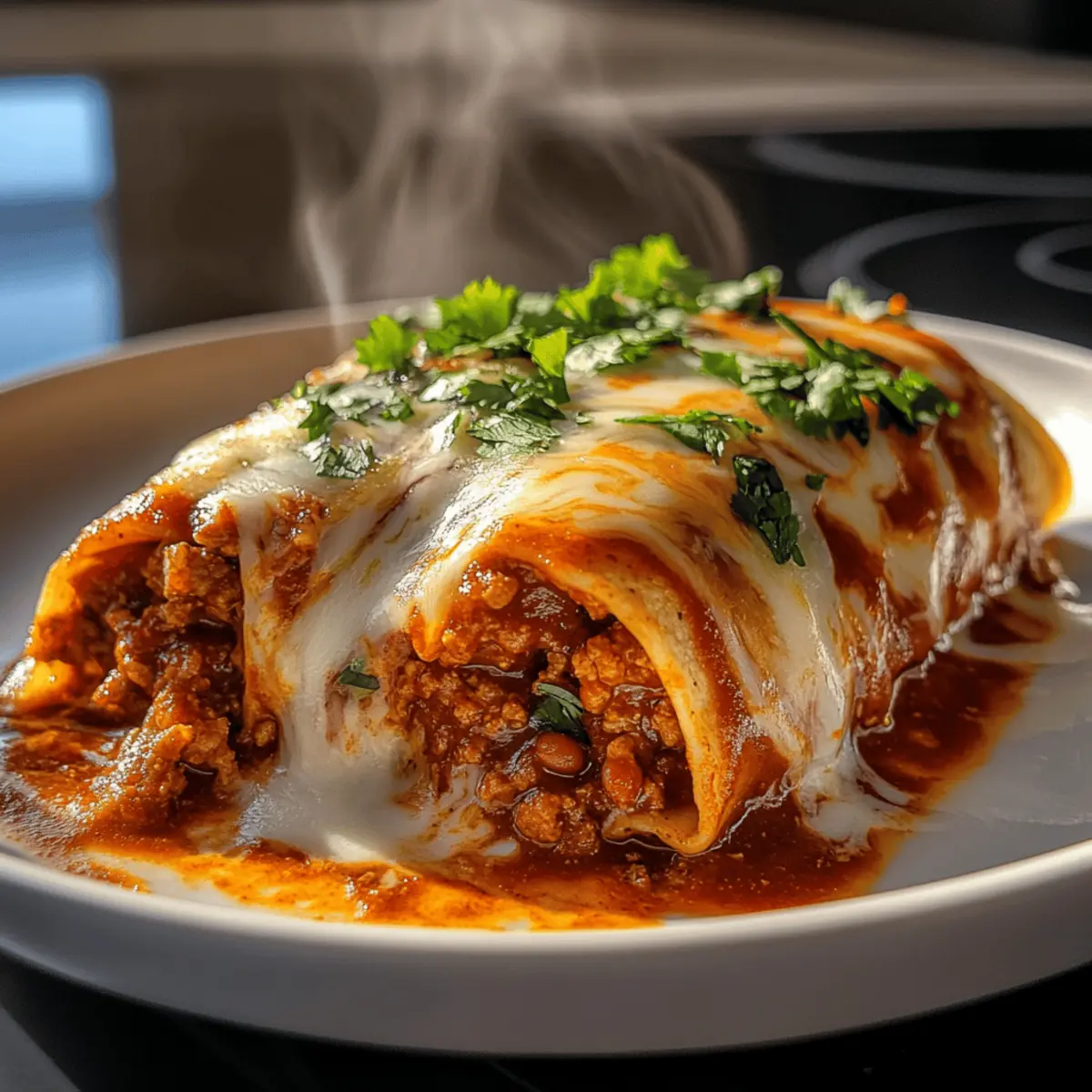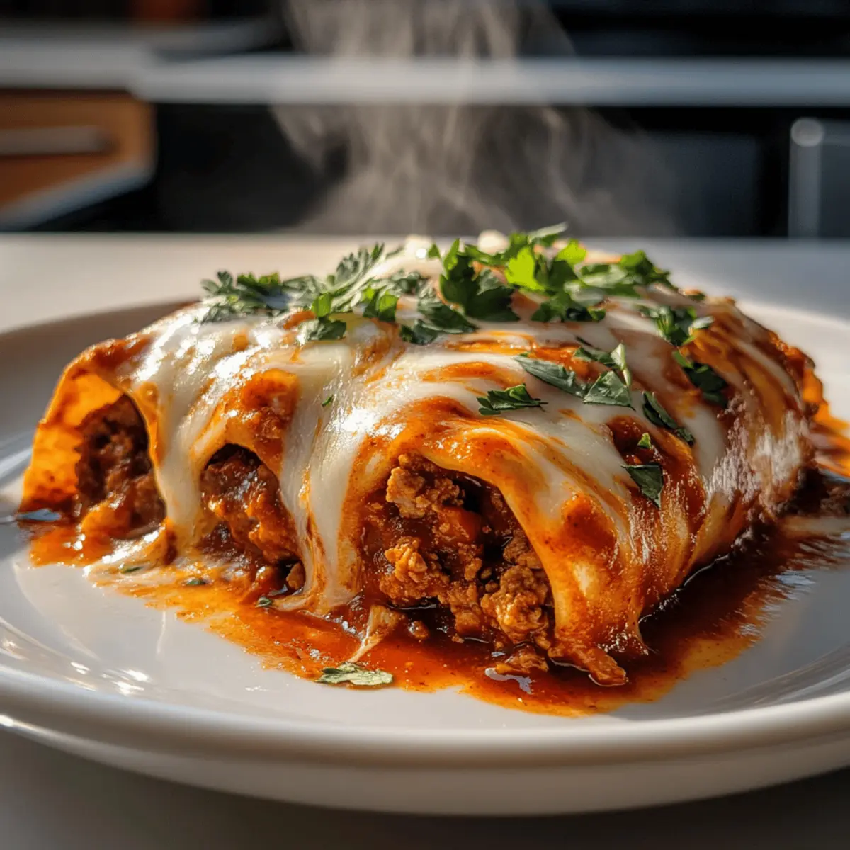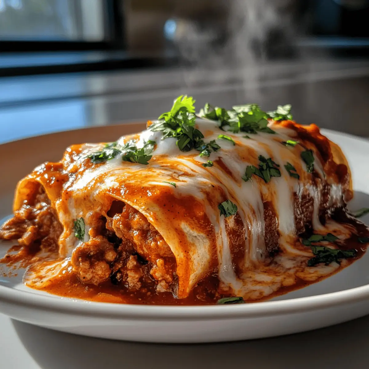 As I pulled out the warm, soft tortillas, a delightful wave of nostalgia washed over me. There’s something magical about merging the comforting elements of enchiladas and burritos, and this Irresistible Enchirito captures that essence perfectly. In just 30 minutes, you can create a meal that not only satisfies your taste buds but is also customizable for every family member around the dinner table. Picture gooey cheese and spicy beef wrapped snugly in a tortilla, ready to be devoured after a long day. The beauty of this recipe lies in its quick preparation, making it an effortless go-to for busy weeknights, while also allowing for a variety of toppings—a win-win for any home chef. Are you ready to bring the warmth of this comforting dish into your kitchen? Let’s dive into the delicious details! Why You’ll Love This Enchirito Comforting Simplicity: The fuss-free steps make this recipe accessible for anyone, whether you’re an experienced chef or just starting out. Customizable Delights: Tailor your enchirito with toppings like jalapeños or avocado, ensuring everyone’s preferences are met. Quick and Easy: Whip up this heartwarming meal in just 30 minutes, perfect for those busy evenings when time is tight. Crowd-Pleasing Flavor: With the perfect blend of savory beef, creamy beans, and melty cheese, this dish is sure to please even the pickiest eaters. Make Ahead Magic: Prepare your enchiritos in advance for a hassle-free dinner, simply baking them when you’re ready to serve. Don’t forget to check out our Sloppy Joe Garlic for another easy family favorite! Irresistible Enchirito Ingredients For the Filling: • Ground Beef – Provides protein and a hearty base. Substitute with turkey or a plant-based meat alternative for a lighter version. • Taco Seasoning – Adds bold, spicy flavor. Store-bought or homemade (blend chili powder, cumin, garlic powder, and onion powder). • Refried Beans – Contributes creaminess and protein. Can replace with black beans or pinto beans if you prefer. For the Tortillas and Cheese: • Tortillas (Flour) – Encases the filling. Flour tortillas are preferred for sturdiness; corn tortillas can be used for a gluten-free option but might need to be doubled. • Shredded Cheese – Melts to create a gooey topping. Use cheddar, Monterey Jack, or a dairy-free cheese for a lacto-vegetarian option. For the Sauce and Garnish: • Enchilada Sauce – Provides moisture and flavor. Opt for red or green sauce based on your heat preference; homemade can replace canned for freshness. • Fresh Onions and Cilantro – For garnish, adding a refreshing crunch. Swap cilantro for parsley if unavailable. Now that we have our ingredients ready, it’s time to start making your Irresistible Enchirito! Step‑by‑Step Instructions for Irresistible Enchirito Step 1: Preheat the Oven Start by preheating your oven to 350°F (175°C) to ensure it’s hot and ready for the Enchirito. This crucial first step guarantees that your dish bakes perfectly, creating that bubbly, golden cheese topping we all crave. While the oven heats, gather your ingredients and set up your cooking space for a smooth assembly process. Step 2: Cook the Beef In a large skillet, brown 1 pound of ground beef over medium heat for 5–7 minutes, breaking it into small crumbles with a spatula. You’ll know it’s ready when the beef is no longer pink and has a nice brown color. Once cooked, drain any excess grease to keep your enchiritos flavorful yet not overly greasy. Step 3: Add Flavor Stir in your taco seasoning along with ¾ cup of water to the skillet with the beef, mixing well to combine all the flavors. Let it simmer for 5 minutes, allowing the mixture to thicken and develop a rich flavor. You’ll notice a delicious aroma filling your kitchen—this is the essence of the Irresistible Enchirito! Step 4: Warm the Beans In a separate pan, heat the refried beans over low heat until they are warm and spreadable, which should take about 3–5 minutes. Stir occasionally to ensure that the beans don’t stick to the pan. This creamy layer will add an extra dimension to your enchirito, making each bite a delightful experience. Step 5: Assemble the Enchirito Take a flour tortilla and spread about 2 tablespoons of warm refried beans across the center. Then, add a generous portion of your beef mixture and sprinkle a handful of shredded cheese on top. Roll the tortilla tightly, enclosing all the delicious fillings, and place it seam-side down in a baking dish. Repeat this process for all tortillas. Step 6: Arrange in Dish Carefully arrange the assembled enchiritos in your greased baking dish, ensuring they fit snugly. Once they are all in, pour your favorite enchilada sauce over the top, covering them generously, and then sprinkle with any remaining cheese. This step promises that every enchirito is dripping with flavor and ready for baking. Step 7: Bake to Perfection Pop your enchiritos in the preheated oven and bake for 20 minutes, or until the cheese is melted, bubbly, and starting to turn golden brown. The enticing smells wafting from the oven are an assurance that your Irresistible Enchirito is nearing completion. Keep an eye on it towards the end to avoid over-baking. Step 8: Garnish and Serve Once out of the oven, let your enchiritos rest for 5 minutes to firm up slightly. Now it’s time to add those delightful finishing touches! Top with fresh diced onions and chopped cilantro for a burst of freshness before serving. Dive into this comforting dish and enjoy the delightful flavors and textures of your homemade Irresistible Enchirito! Irresistible Enchirito Variations & Substitutions Feel free to put your personal twist on this delicious enchirito recipe with these easy suggestions! Chicken Swap: Substitute ground beef with shredded chicken for a lighter, yet equally flavorful filling. This variation offers a delightful change while keeping the essence of an enchirito intact. Plant-Based Option