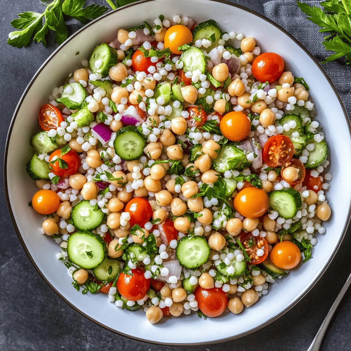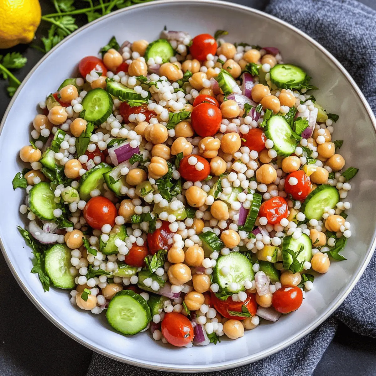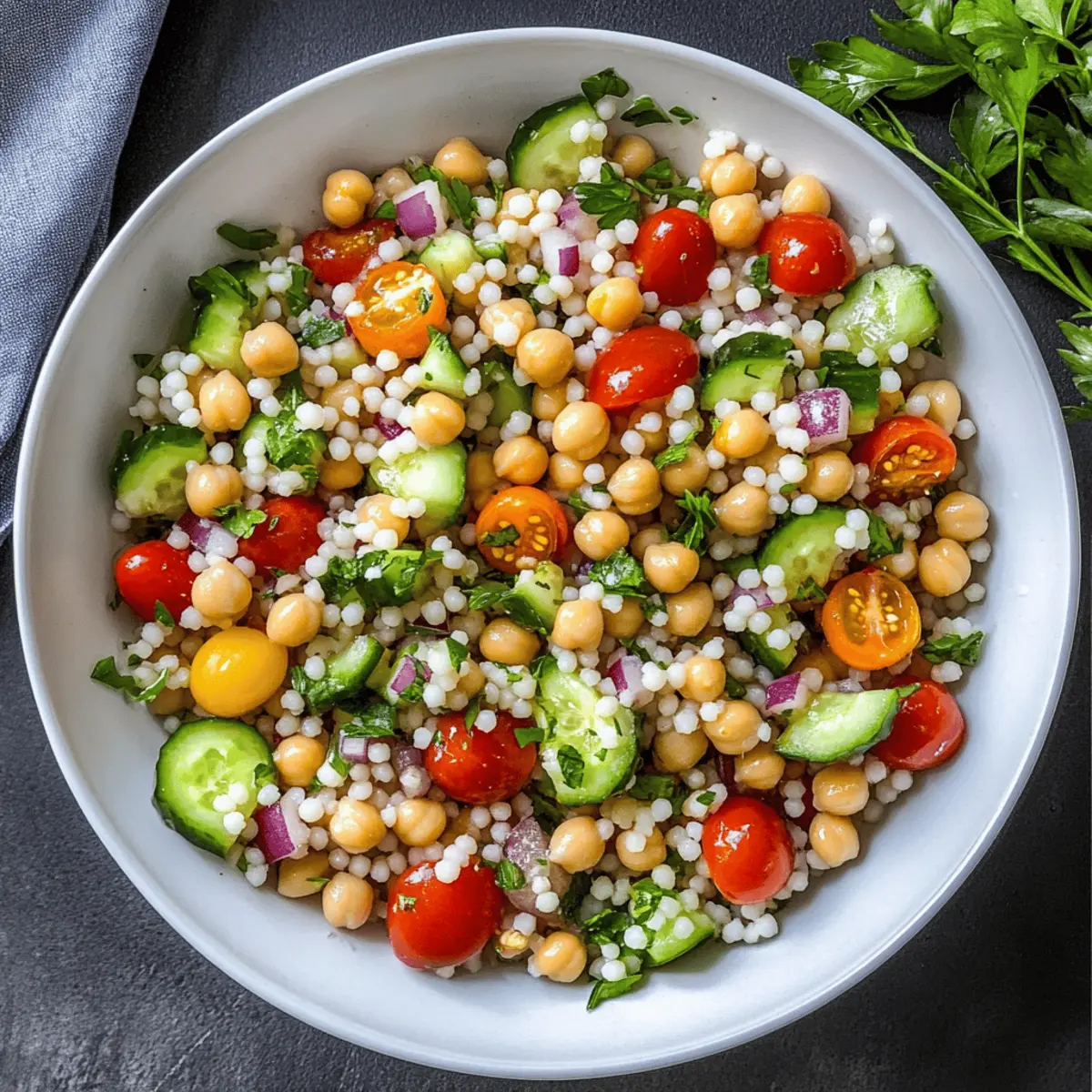 Standing in my kitchen, I grabbed a handful of vibrant vegetables and felt a spark of excitement—today was the day for a refreshing Israeli Couscous Salad. This delightful dish comes together effortlessly, featuring plump couscous, creamy chickpeas, and bright veggies bursting with color. Not only is it a fiber-rich, vegetarian option that’s perfect for any meal, but it can also be whipped up in just 30 minutes, making it a fantastic choice for busy weeknights or a breezy weekend lunch. Plus, with the freedom to customize your salad with ingredients like crumbled feta or your favorite seasonal veggies, there’s no limit to how deliciously creative you can get! Ready to dive into the fresh flavors of the Mediterranean? Let’s get cooking! Why is this salad so refreshing? Vibrant flavors come together in every bite, making this Israeli Couscous Salad a true crowd-pleaser! Quick to prepare, it’s perfect for busy lifestyles yet feels impressive for gatherings. Customize it easily! Toss in feta, or switch up the veggies for endless variations. Nutritious and fiber-rich, this salad not only delights your taste buds but also boosts your health. Serve it with grilled meats or pack it in pita for a delightful meal on-the-go. If you enjoyed this recipe, make sure to check out our Pesto Pasta Salad for another quick and tasty option! Israeli Couscous Salad Ingredients For the Salad • Israeli Couscous – Provides a chewy texture and is the base of this fresh salad; regular couscous can be used as a substitute. • Chickpeas (canned) – Add protein and creaminess; always drain and rinse to reduce sodium. • Cherry Tomatoes – Bring sweetness and color to the dish; any fresh or diced tomato can replace these. • English Cucumber – Gives a refreshing crunch; Persian or regular cucumbers are great alternatives. • Red Onion – Offers sharpness and depth; soak in water to mitigate strong flavors if desired. • Fresh Parsley – Adds brightness and herbal notes; you can substitute cilantro or basil for a different taste. • Fresh Mint – Enhances freshness and aroma; optional but highly recommended for a fragrant salad. For the Dressing • Lemon Juice – Provides essential acidity; if needed, lime juice is a suitable alternative. • Olive Oil – Adds richness and helps emulsify the dressing; opt for high-quality extra virgin for best flavor. • Salt – Use to taste for seasoning; adjust according to dietary preferences. Feel free to mix and match these ingredients to create your own perfect version of an Israeli Couscous Salad! Step‑by‑Step Instructions for Israeli Couscous Salad Step 1: Cook the Couscous In a medium pot, bring 4 cups of salted water to a rolling boil over high heat. Add 1 cup of Israeli couscous and a splash of olive oil, stirring gently. Reduce the heat to medium, and let it cook for about 10 minutes, or until the couscous is tender and slightly chewy. Once cooked, drain the couscous and spread it on a baking sheet to cool to room temperature. Step 2: Prepare the Vegetables While the couscous is cooling, wash and chop 1 cup of cherry tomatoes and 1 medium English cucumber into bite-sized pieces. Finely dice about half of a red onion, adjusting the quantity based on your preference. Spread the chopped vegetables onto a cutting board for easy mixing later. This vibrant assortment will bring fresh flavors to your Israeli Couscous Salad. Step 3: Combine the Salad Ingredients In a large mixing bowl, combine the cooled Israeli couscous, chopped tomatoes, cucumbers, diced onion, and 1 can of drained and rinsed chickpeas. Toss in ¼ cup of chopped fresh parsley and a few fresh mint leaves for an invigorating aroma. Use a rubber spatula to gently mix everything together, ensuring an even distribution of colors and textures throughout the salad. Step 4: Prepare the Dressing In a small jar or bowl, combine the juice of 1 lemon, ¼ cup of olive oil, and sea salt to taste. If you prefer a tangy kick, feel free to add a pinch of black pepper. Seal the jar and shake vigorously until well combined, or whisk the ingredients in a bowl until emulsified. This dressing will beautifully coat your Israeli Couscous Salad, enhancing its fresh flavors. Step 5: Dress the Salad Pour the prepared dressing over the salad mixture just before serving. Using tongs or a large spoon, gently toss the Israeli Couscous Salad until all ingredients are evenly coated and glistening with the dressing. This step ensures that every bite is packed with that delicious Mediterranean flavor we all love. Step 6: Serve and Enjoy Once tossed, your vibrant Israeli Couscous Salad is ready to be served! You can plate it as a refreshing side dish or enjoy it as a light main course. The salad can be garnished with crumbled feta or additional fresh herbs, adding an appealing touch. For the best flavor, serve immediately or let it sit for 10-15 minutes to allow the ingredients to meld together. Expert Tips for Israeli Couscous Salad Cool Couscous Properly: Ensure the couscous cools completely before mixing; this prevents clumping and keeps each bite fluffy in your Israeli Couscous Salad. Dress at the Right Time: For maximum freshness, only add the dressing just before serving. This keeps your salad crisp and vibrant. Enhance Flavor Profiles: Consider soaking the diced red onion in cold water for 10 minutes to soften its taste, making your salad more enjoyable. Explore Flavor Additions: Don’t hesitate to get creative—add-ins like feta cheese or diced avocado can elevate your Israeli Couscous Salad to a new level of deliciousness. Store It Smart: If you need to make the salad in advance, store the components separately. Combine them just before serving to maintain their freshness and texture. Storage Tips for Israeli Couscous Salad Fridge: Store the salad in an airtight container for up to 3 days. This keeps it fresh and delicious while the flavors continue to meld. Freezer: Freezing is not recommended as the 