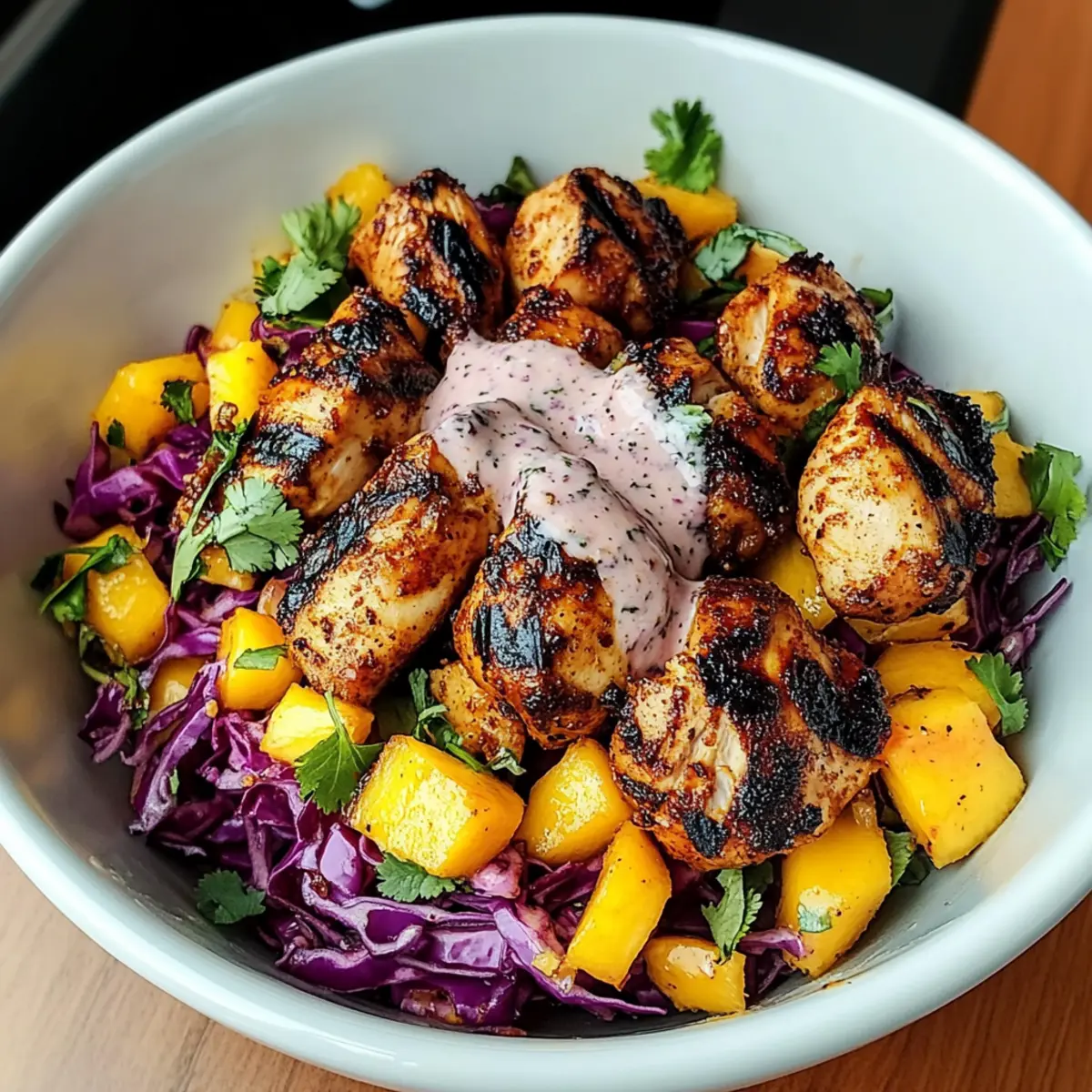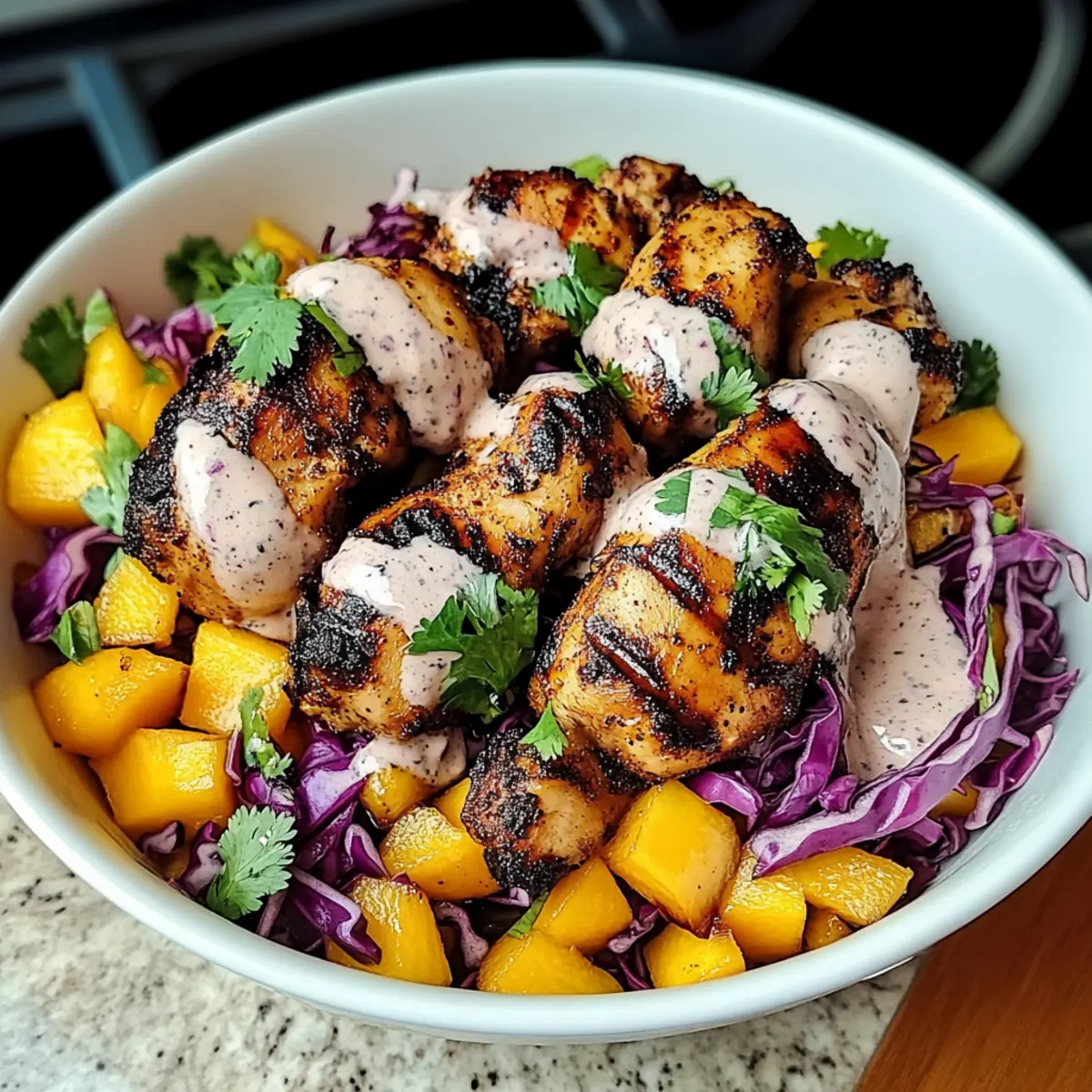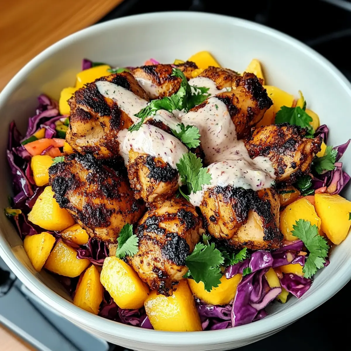 Delicious Jerk Chicken & Mango Slaw Bowls with Honey Lime Cream