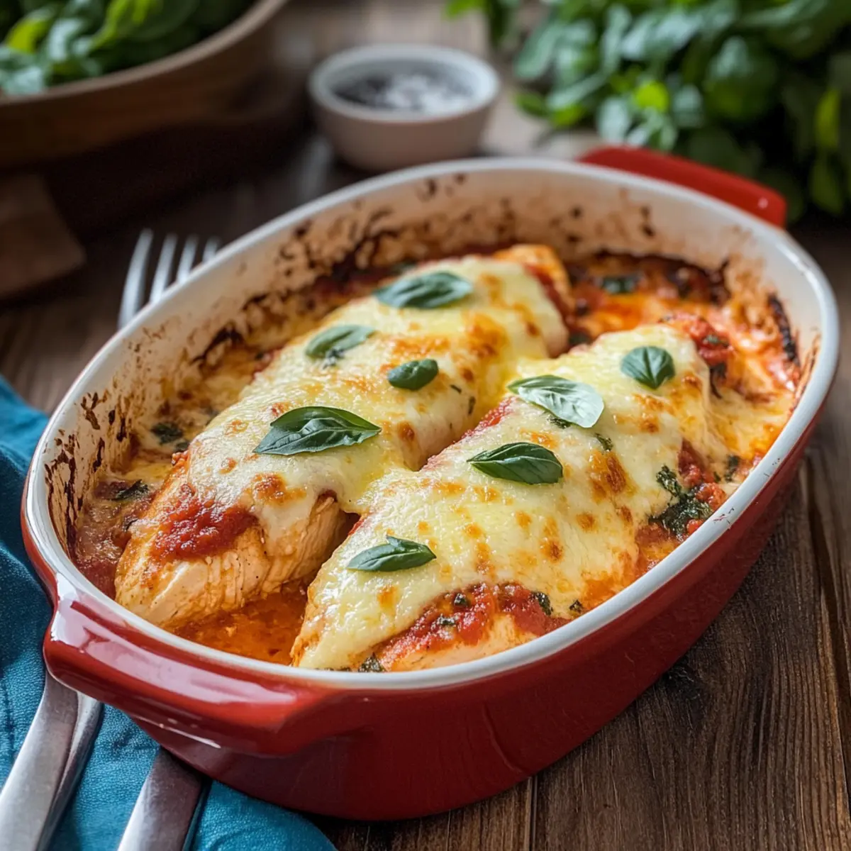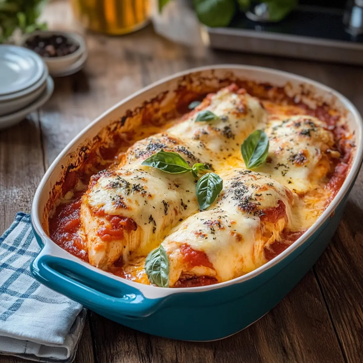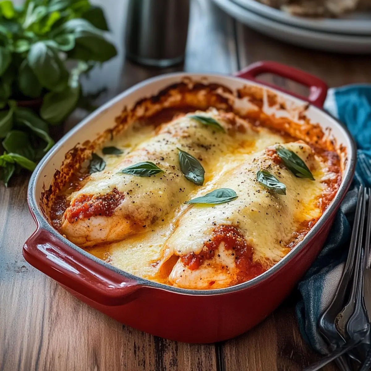 As I pulled a bubbling casserole from the oven, the rich aroma of marinara and melting cheese filled my kitchen, instantly transforming the space into a comforting haven. This Keto Chicken Parmesan Casserole is my go-to dish for those busy weeknights when health and taste are a must. Imagine indulging in tender chicken smothered in a luscious, sugar-free marinara sauce, all while sticking to your low-carb lifestyle. The best part? This recipe is not just quick to prepare but also a crowd-pleaser that the whole family will adore. So, are you ready to dive into this scrumptious, guilt-free comfort food that will keep your taste buds happy and your waistline intact? Let’s get cooking! Why is this casserole a must-try? Simplicity at its best: This Keto Chicken Parmesan Casserole is incredibly easy to prepare, making it perfect for even the busiest of weeknights. Indulgent flavors without the guilt: Enjoy all the rich, savory goodness that comes with traditional chicken parmesan while sticking to your low-carb goals. Family-friendly and universally appealing: Kids and adults alike will savor every bite, making it a surefire hit at the dinner table. Meal prep friendly: You can whip this up ahead of time and store it in the fridge, allowing for quick reheating. Versatility to suit your taste: Feel free to add veggies like zucchini or spinach for added nutrients, or swap out the chicken for turkey or eggplant for a vegetarian twist. Keto Chicken Parmesan Casserole Ingredients For the Chicken • Boneless, Skinless Chicken Breasts – the main protein source, providing structure and heartiness. Choose fresh for best results. For the Sauce • Sugar-Free Marinara Sauce – adds richness and flavor without the carbs; look for brands without added sugars. For the Cheese • Mozzarella Cheese – provides gooey, melty texture and flavor; fresh mozzarella can enhance creaminess. • Parmesan Cheese – adds a sharp, nutty flavor and a golden crust when baked; can substitute with Pecorino Romano for a bolder taste. For Seasoning • Italian Seasoning – enhances overall flavor; substitute with a mix of oregano, basil, and thyme if needed. • Garlic Powder – provides depth to the dish; fresh minced garlic can be used for a stronger flavor. Step‑by‑Step Instructions for Keto Chicken Parmesan Casserole Step 1: Preheat the Oven Begin by preheating your oven to 375°F (190°C). This essential first step ensures that your Keto Chicken Parmesan Casserole cooks evenly and thoroughly, resulting in tender chicken and bubbling cheese. Make sure your rack is set to the center position for optimal heat distribution, so your casserole turns out perfectly golden. Step 2: Season the Chicken While the oven is heating, take your boneless, skinless chicken breasts and season them generously with salt, pepper, Italian seasoning, and garlic powder. Use your hands to rub the seasoning into the meat, giving it a vibrant flavor profile that’s crucial for this Keto Chicken Parmesan Casserole. Set the chicken aside to allow the flavors to meld while you prepare the next steps. Step 3: Arrange the Chicken in the Casserole Dish Grab a medium-sized casserole dish and layer the seasoned chicken breasts in the bottom. Ensure they’re spread out evenly to allow for even cooking and maximum flavor absorption. You want to create a sturdy base for your casserole that will hold up to the rich marinara sauce you’re about to add, so make sure they fit snugly without crowding. Step 4: Add the Marinara Sauce Next, pour the sugar-free marinara sauce evenly over the chicken, making sure each piece is well-coated. The sauce will serve as the heart of your Keto Chicken Parmesan Casserole, adding moisture and depth to the dish. Use a spatula to gently spread the sauce if needed, creating a beautiful pool of rich flavor over the chicken. Step 5: Sprinkle the Cheeses Now, it’s time to generously sprinkle mozzarella and Parmesan cheeses over the marinara sauce. This cheesy layer is what will give your casserole that ooey-gooey texture and delightful golden crust once baked. Don’t hold back on the cheese—it’s one of the defining aspects of a delicious chicken parmesan. Step 6: Cover with Foil To retain moisture during baking, cover the casserole dish tightly with aluminum foil. This step is crucial for ensuring that the chicken cooks thoroughly while the cheese melts without browning too quickly. The steam created will help keep the chicken juicy and tender, setting up your Keto Chicken Parmesan Casserole for success. Step 7: Bake the Casserole Place your covered casserole dish in the preheated oven and bake for 30-40 minutes. Keep an eye on it; the chicken should reach an internal temperature of 165°F (74°C), ensuring it’s fully cooked. You’ll know it’s ready when you see bubbly sauce and melted cheese peeking through the foil edges. Step 8: Uncover and Brown the Cheese After the initial baking time, carefully remove the foil to let the top brown. Return the casserole to the oven for an additional 5-10 minutes. This step will give your Keto Chicken Parmesan Casserole that lovely golden color on top, enhancing both its visual appeal and texture. Step 9: Let it Rest Once the cheese is perfectly browned, take the casserole out of the oven and let it cool for a few minutes. This resting time allows the juices to redistribute, making it easier to serve and ensuring every bite is packed with flavor. Consider garnishing with fresh basil for an added touch of freshness. How to Store and Freeze Keto Chicken Parmesan Casserole Fridge: Store leftovers in an airtight container in the fridge for up to 3 days. Reheat in the oven or microwave until heated through. Freezer: For longer storage, freeze individual portions wrapped tightly in plastic wrap and then in aluminum foil for up to 2 months. Thaw in the fridge overnight before reheating. Reheating: To reheat, place the casserole in a preheated oven at 350°F (175°C) for about 20