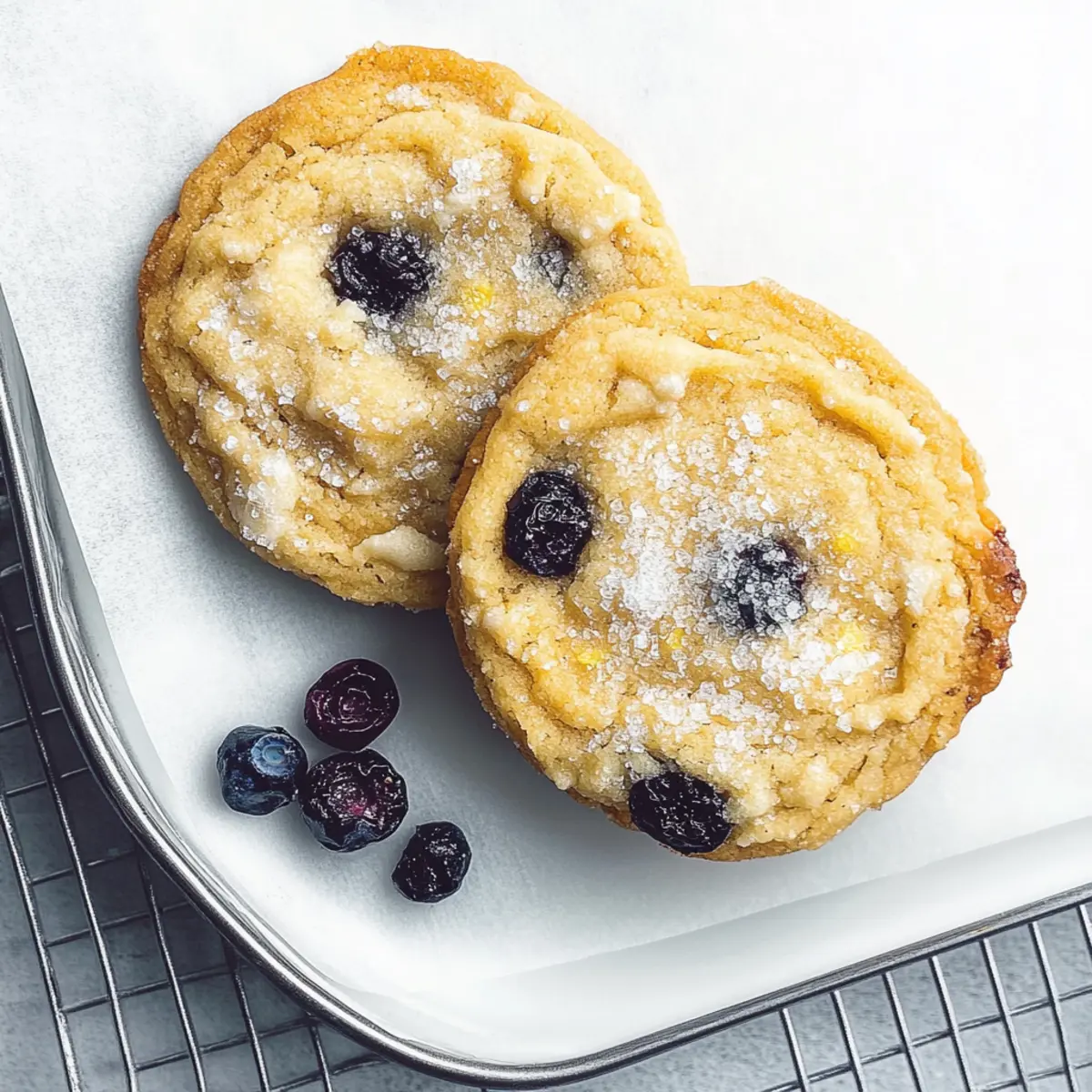 The aroma of freshly baked cookies wafting through the kitchen is one of the simplest pleasures in life, isn’t it? Today, I’m thrilled to share my recipe for Lemon Blueberry Cookies, a delightful blend of zesty citrus and sweet blueberries that guarantees a soft and chewy cookie experience. Unlike the typical muffin-like treats, these cookies boast crispy edges and an incredibly straightforward prep, making them perfect for both cozy mornings and sunny picnics. A gluten-free option is even available, so everyone can indulge in these vibrant bites! Whether you’re looking to impress guests or simply treat yourself, these cookies are sure to become a favorite. Ready to dive into this deliciousness? Let’s get baking! Why Are Lemon Blueberry Cookies Special? Bright, Zesty Flavor: The combination of fresh lemon zest and sweet blueberries creates a refreshing explosion of taste in every bite, making these cookies a true delight. Simple Preparation: With just a few essential ingredients, this recipe ensures you can whip up a batch without any hassle, perfect for busy bakers! Texture Perfection: Featuring a unique soft and chewy center with irresistible crispy edges, these cookies are a textural joy that your taste buds will crave. Adaptable Recipe: Whether you prefer gluten-free options or want to try different fruit variations, this recipe is versatile enough to suit your needs. Check out our Banana Oatmeal Cookies for more delightful alternatives! Crowd-Pleasing Treat: Everyone loves cookies, and these vibrant delights are perfect for sharing at any gathering or enjoying as a personal treat. You can serve them with a refreshing cup of tea or try pairing them with a delightful glass of milk. Quick and Freezable: Bake a batch and save extras in the freezer for special occasions. They retain their flavor and texture beautifully, ensuring you have a sweet surprise ready whenever you need one! Lemon Blueberry Cookies Ingredients For the Cookies • Unsalted Butter – Provides richness and tenderness; ensure butter is at room temperature for best results. • Granulated Sugar – Balances the tartness of lemon; can be substituted with coconut sugar for a healthier option. • Light Brown Sugar – Adds moisture and a hint of caramel flavor; use dark brown sugar as a substitute if preferred. • Egg – Binds ingredients together and adds moisture; try a flax egg for a vegan alternative. • Vanilla Extract – Enhances the overall flavor; replace with lemon extract for a stronger citrus kick. • All-Purpose Flour – Gives structure to the cookie; substitute with a gluten-free flour blend for gluten-free Lemon Blueberry Cookies. • Baking Soda – Helps cookies rise; make sure it’s fresh for maximum effectiveness. • Cream of Tartar – Stabilizes the dough, contributing to texture; baking powder can be used instead, but flavor may vary. • Salt – Enhances flavor and balances sweetness; kosher salt is preferred for even distribution. • Freeze-Dried Blueberries – Offers bursts of blueberry flavor without extra moisture; can substitute with dried wild blueberries, but texture will vary. • Coarse Sanding Sugar – Adds decorative sparkle and crunch; use granulated sugar for a simpler finish. Step‑by‑Step Instructions for Lemon Blueberry Cookies Step 1: Mix Sugars and Zest In a stand mixer, combine the granulated sugar, brown sugar, and freshly grated lemon zest. Use your fingers to massage the zest into the sugars until fragrant, about 1-2 minutes. The aroma of lemon will invigorate your senses and set the stage for your Lemon Blueberry Cookies. Step 2: Cream Butter Add the room temperature unsalted butter to the sugar mixture. Mix on high speed for about 3 minutes, or until the mixture is light and fluffy, with a pale color. This step is crucial for achieving a tender, chewy texture in your cookies, so be patient and let the mixer do the work. Step 3: Incorporate Egg and Vanilla Crack in the egg and add the vanilla extract, continuing to mix until everything is well blended. Scrape down the sides of the bowl with a spatula to ensure all ingredients are fully incorporated. This scrumptious blend creates the rich base for your Lemon Blueberry Cookies. Step 4: Combine Dry Ingredients In a separate bowl, whisk together the all-purpose flour, baking soda, cream of tartar, and salt. Gradually add the dry mixture to the wet ingredients in the mixer, mixing until just combined. Be careful not to overmix—the dough should be slightly sticky, perfect for holding those delightful blueberries. Step 5: Fold in Blueberries Gently fold in the freeze-dried blueberries using a spatula, ensuring they are evenly distributed throughout the dough. This step adds lovely bursts of flavor to your Lemon Blueberry Cookies, enhancing their attractiveness and taste. Step 6: Chill Dough Cover the bowl with plastic wrap and chill the cookie dough in the refrigerator for 30 minutes. Chilling prevents the cookies from spreading too much during baking, ensuring those deliciously chewy edges you crave. Step 7: Prep for Baking Preheat your oven to 350°F (175°C). Line two baking sheets with parchment paper. Using a cookie scoop, portion the chilled dough and roll each ball in coarse sanding sugar for a delightful crunch, then space them about 2 inches apart on the prepared sheets. Step 8: Bake Place your baking sheets in the preheated oven and bake for 8-9 minutes, or until the edges are lightly golden while the centers remain slightly soft. Remove the Lemon Blueberry Cookies from the oven, allowing them to cool on the wire rack for a few minutes before transferring them to a serving plate. Expert Tips for Lemon Blueberry Cookies Precise Measurements: Ensure you measure your flour accurately using a kitchen scale. Too much flour can lead to dry cookies, while too little can make them too sticky. Chill the Dough: Don’t skip the chilling step! It helps in achieving that perfect soft and chewy texture while 