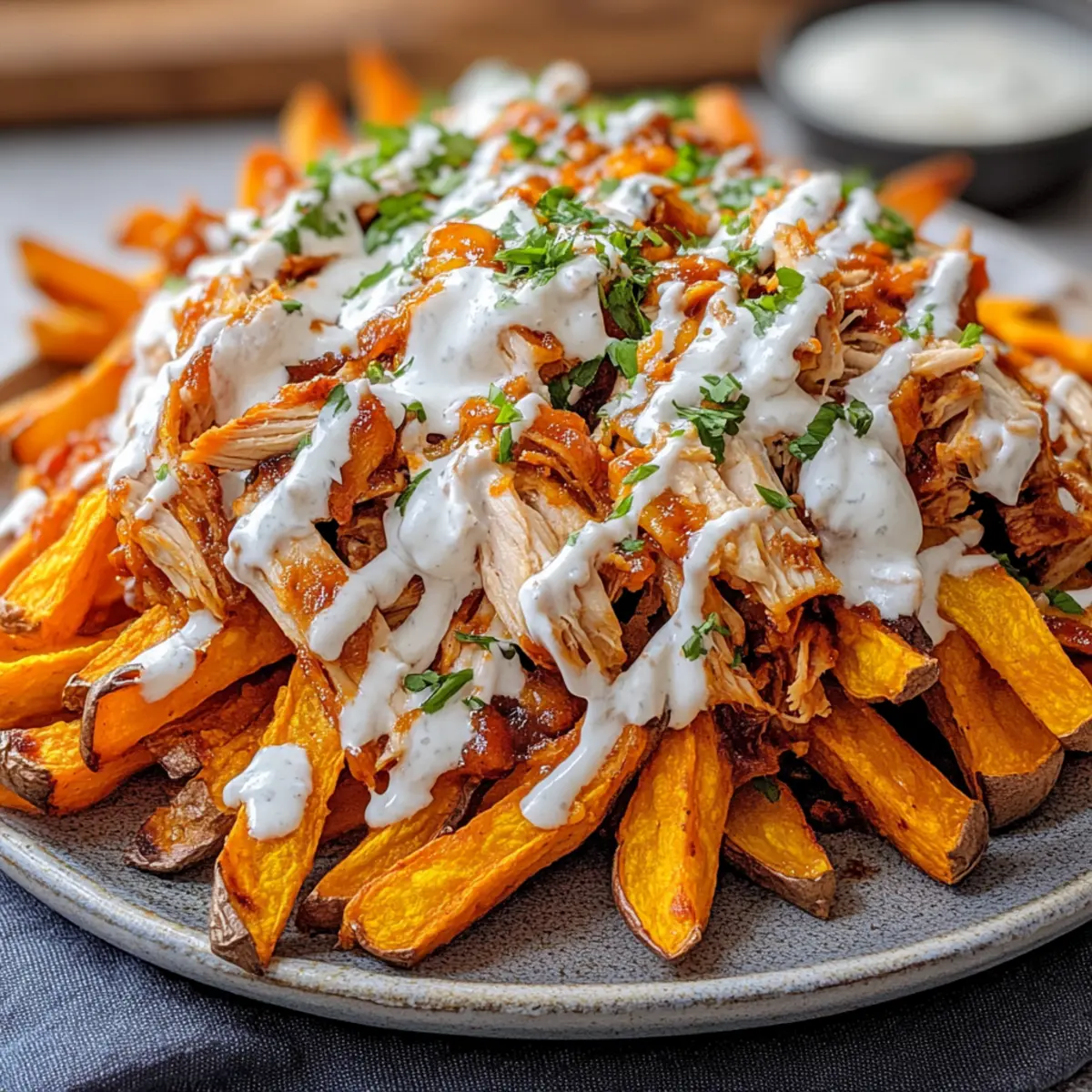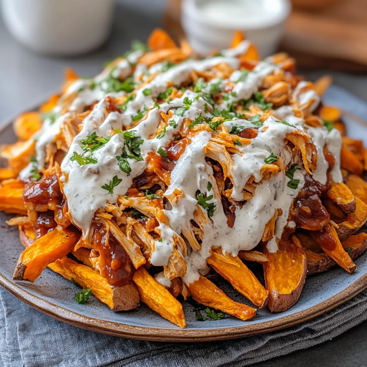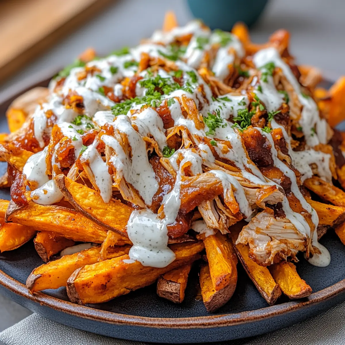 In the heart of my kitchen, the scent of BBQ and sweet potatoes swirls together, igniting a delightful memory of cozy family dinners. These Loaded BBQ Chicken Sweet Potato Fries are my go-to for evenings when I crave something comforting yet lightened-up. With crispy air-fried sweet potato fries topped with juicy BBQ chicken and a creamy Greek yogurt ranch drizzle, this dish satisfies your taste buds while keeping things nutritious. Perfect for busy weeknights or lively game days, these fries promise an effortless way to bring everyone together around the table. Plus, they’re versatile enough for you to showcase your creativity with different toppings! Are you ready to dive into this delicious fusion of flavors? Why are these fries a game-changer? Loaded with flavor: These Loaded BBQ Chicken Sweet Potato Fries combine sweet and savory, delivering a taste explosion that will keep you coming back for more. Healthier indulgence: Enjoy the satisfaction of comfort food without guilt—thanks to air-frying and lean protein! Creative versatility: Feel free to switch up toppings or sauces, like our Honey BBQ Chicken or even a creamy feta for a Mediterranean twist. Quick prep time: Just 30 minutes from start to finish; they’re perfect for those busy weeknights. Crowd-pleaser: With their irresistible crunch and rich toppings, these fries are sure to impress family and friends at any gathering! Loaded BBQ Chicken Sweet Potato Fries Ingredients • Get ready for a deliciously satisfying meal! For the Sweet Potato Fries Sweet Potatoes – the star of the show, cut into fry shapes for the ultimate crispy texture. Olive Oil – helps create that golden, crispy finish; avocado oil is a fantastic substitute. Salt, Pepper, Paprika, Garlic Powder – perfect seasoning blend for fries; feel free to adjust these spices to match your taste preferences. For the Chicken Topping Cooked Shredded Chicken Breast – ideal lean protein; rotisserie chicken can save you time and effort. Light BBQ Sauce – offers that smoky flavor; choose no-sugar-added options for a healthier twist. For the Cheesy Finish Reduced-Fat Shredded Cheddar Cheese – adds a creamy touch; use dairy-free cheese if you prefer a vegan option. For the Ranch Drizzle Nonfat Greek Yogurt – brings creaminess and tang to the ranch; regular yogurt works just as well for a richer flavor. Light Mayo – adds to the creaminess of the ranch; omit it for a lighter drizzle. Ranch Seasoning – amp up the flavor with store-bought or homemade seasoning. Optional Toppings Chopped Green Onions or Parsley – for a pop of freshness and color for your loaded BBQ Chicken Sweet Potato Fries! Step‑by‑Step Instructions for Loaded BBQ Chicken Sweet Potato Fries Step 1: Prep Sweet Potatoes Start by washing and peeling 2-3 sweet potatoes, then cut them into fry shapes. For optimal texture, you can soak the cut fries in cold water for 30 minutes to draw out excess starch. This step helps achieve that coveted crispy finish for your Loaded BBQ Chicken Sweet Potato Fries. Step 2: Season Fries Drain and pat the soaked sweet potato fries dry, then place them in a large bowl. Drizzle with 2-3 tablespoons of olive oil, ensuring they are well-coated. Sprinkle with salt, pepper, paprika, and garlic powder, and toss again to evenly distribute the seasoning. The vibrant colors should shine before cooking! Step 3: Air-Fry (or Bake) Preheat your air fryer to 400°F (200°C). Arrange the seasoned sweet potato fries in the air fryer basket in a single layer, ensuring they have space to cook evenly. Air-fry for 15-20 minutes, shaking the basket half-way through for even crispiness. If baking, place fries on a lined baking sheet and bake at 425°F (220°C) for 20-25 minutes until golden brown. Step 4: Prepare BBQ Chicken While the fries are cooking, take 1-2 cups of cooked shredded chicken breast and mix it with ½ cup of light BBQ sauce in a bowl. Ensure the chicken is well-coated for a deliciously smoky flavor. Set this mixture aside as your savory topping for the Loaded BBQ Chicken Sweet Potato Fries. Step 5: Assemble Once the sweet potato fries are golden and crispy, remove them from the air fryer or oven and arrange them on a serving platter. Top the fries generously with your BBQ chicken mixture and sprinkle 1-1.5 cups of reduced-fat shredded cheddar cheese over the top. Allow the cheese to melt slightly from the warmth of the fries. Step 6: Drizzle Ranch Sauce In a small bowl, mix together ½ cup of nonfat Greek yogurt, 2 tablespoons of light mayo, and 1-2 teaspoons of ranch seasoning to create your ranch drizzle. Once your Loaded BBQ Chicken Sweet Potato Fries are assembled, generously drizzle this creamy ranch over the top for an added flavor boost that ties all the elements together. Step 7: Serve Present your Loaded BBQ Chicken Sweet Potato Fries immediately on a rustic platter to encourage sharing and storytelling. Optional: Garnish with chopped green onions or parsley for a fresh touch. The inviting aroma and colorful presentation will make it hard for anyone to resist diving in! What to Serve with Loaded BBQ Chicken Sweet Potato Fries In the spirit of crafting a full meal, let’s explore delightful pairings that enhance your experience with this crowd-pleasing dish. Crisp Side Salad: A fresh mix of greens with a light vinaigrette balances the richness of the fries, adding a refreshing crunch. Garlic Roasted Broccoli: This savory side offers a healthy contrast with tender florets and crispy edges that play well against the fries. Creamy Coleslaw: The cool, creamy texture of coleslaw marries beautifully with the warm, flavorful fries for a delightful combination. Grilled Corn on the Cob: Sweet, smoky grilled corn brings a fun, seasonal touch that complements the BBQ flavors of the dish. Zesty Guacamole: The fresh creaminess of guacamole lightens up the plate while introducing a different layer of flavor that pairs perfectly. Refreshing Lemonade: A bright, tangy lem