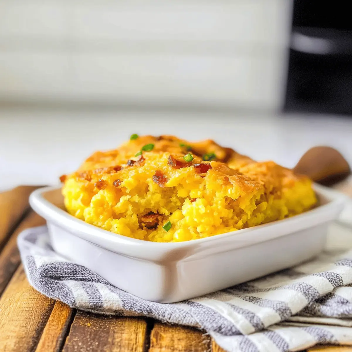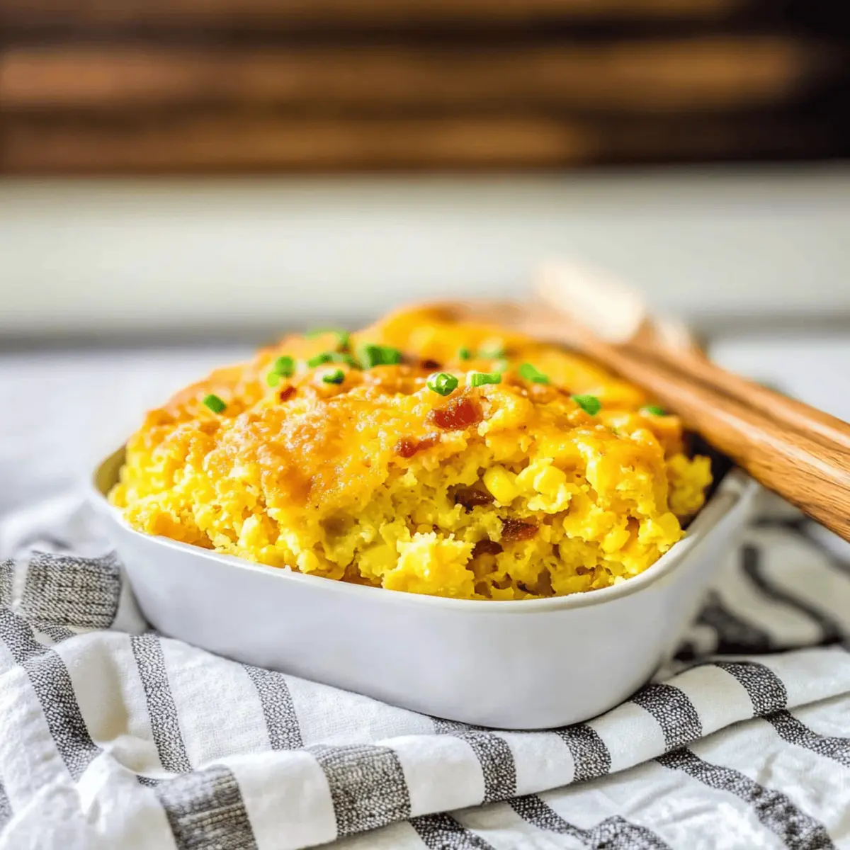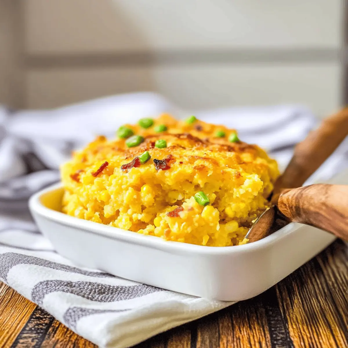 As I stood in my kitchen, the comforting aroma of my Loaded Cornbread Casserole filled the air, instantly transporting me to family gatherings and Southern cookouts. This delightful dish combines cheesy goodness, smoky bacon, and sweet corn, all wrapped in a golden-brown cornbread base that’s as warm and inviting as a hug. Not only is it a breeze to whip up, making it perfect for busy evenings or potluck parties, but it also allows for endless adaptations to suit your taste. So whether you’re serving it alongside BBQ ribs or enjoying it solo with a green salad, this casserole is sure to spark joy and smiles at your table. Who says comfort food can’t be both easy and delicious? Ready to dig into a slice of this mouthwatering goodness? Why Is This Casserole a Must-Try? Irresistible flavors: This Loaded Cornbread Casserole delivers a delightful combination of cheesy goodness and smoky bacon that dances on your palate. Endless versatility: Easily customize with your favorite ingredients—think jalapeños for heat or veggies for extra nutrition! Easy preparation: Whip it up quickly, making it ideal for busy weeknights or last-minute potlucks. Perfectly pairs with BBQ ribs or a simple green salad, ensuring happy faces all around. Crowd-pleaser: It’s a dish that brings everyone together, creating memorable moments over shared meals. Give it a try, and discover why everyone will be asking for seconds! Loaded Cornbread Casserole Ingredients • Get ready for cheesy goodness! For the Casserole Cornbread Mix – Provides the base structure of the casserole; use any 8.5 oz package for best results. Sour Cream – Adds moisture and richness; Greek yogurt can be an excellent, tangy substitution. Cream-Style Corn – Contributes sweetness and moisture; avoid using whole kernel corn to maintain the perfect texture. Green Chilies – Introduces a mild heat; for a spicier kick, opt for diced jalapeños or pepper jack cheese. Shredded Cheddar Cheese – Ensures cheesy flavor and creates a gooey crust on top; reserve half for topping and mix in the other half with the batter. Chopped Cooked Bacon – Delivers smokiness and savory depth; turkey bacon makes for a lighter alternative. Diced Green Onions – Adds freshness and a slight crunch; chives can work well as a substitute. Eggs – Act as a binder for the casserole; beating them until pale helps achieve a fluffy texture. Melted Butter – Enhances flavor and moisture; can be swapped for olive oil for a healthier option. Salt and Pepper – Season to taste for a perfectly balanced dish. For Topping Remaining Shredded Cheddar Cheese – Sprinkled on top for a final layer of gooey goodness; don’t skip this step for that golden crispy finish! This Loaded Cornbread Casserole is an easy-to-make, delicious dish that combines the comfort of Southern cuisine with versatile ingredients you’ll love! Step‑by‑Step Instructions for Loaded Cornbread Casserole Step 1: Preheat Your Oven Begin by preheating your oven to 375°F (190°C). This ensures a warm environment for the Loaded Cornbread Casserole to bake evenly and develop a golden crust. While the oven heats up, prepare your baking dish, which should be a 9×9-inch skillet or baking dish, making it ready for the delicious mixture that will follow. Step 2: Mix the Ingredients In a large mixing bowl, combine the cornbread mix, sour cream, cream-style corn, green chilies, half of the shredded cheddar cheese, chopped bacon, diced green onions, beaten eggs, and melted butter. Season the mixture with salt and pepper to taste. Stir gently until everything is well incorporated, being careful not to overmix to keep the casserole light and fluffy. Step 3: Prepare the Baking Dish Take your greased 9×9-inch skillet or baking dish and pour the cornbread mixture into it. Use a spatula to spread the mixture evenly across the dish. This ensures that every bite of your Loaded Cornbread Casserole is delightful and beautifully baked. Smooth the surface for an even cook and a polished look. Step 4: Add the Final Touch Sprinkle the remaining shredded cheddar cheese generously on top of the cornbread mixture. This layer will melt into a gooey, delicious crust, adding to the overall flavor of your Loaded Cornbread Casserole. Make sure to cover the surface adequately for that irresistible cheesy topping. Step 5: Bake to Perfection Place the dish in the preheated oven and bake for 25–30 minutes. Keep an eye on the casserole; it should rise and turn a lovely golden brown. To test for doneness, insert a toothpick into the center—if it comes out clean or with a few crumbs, your Loaded Cornbread Casserole is ready! Step 6: Cool and Serve Once baked, remove the casserole from the oven and allow it to cool for a few minutes. This resting period will make it easier to slice and serve. After a short wait, cut into squares and serve warm, delighting everyone at your table with the rich, comforting flavors of this Loaded Cornbread Casserole. Tips for the Best Loaded Cornbread Casserole Avoid Overmixing: Stir the batter just until combined. Overmixing can lead to a dense casserole instead of a light and fluffy texture. Use Fresh Ingredients: Fresh green onions and quality cheese make a remarkable difference. They enhance the overall flavor of your Loaded Cornbread Casserole. Adjust Spice Level: For a perfect heat balance, start with mild green chilies and add jalapeños if you like it spicier. This helps cater to everyone’s taste buds. Let it Rest: Allow your casserole to cool for about 5 minutes before slicing. This makes serving easier and keeps the layers intact for a beautiful presentation. Experiment with Toppings: Try adding sliced jalapeños or a dollop of sour cream on top before serving for extra flavor and creaminess! What to Serve with Loaded Cornbread Casserole The warm, comforting aroma of Loaded Cornbread Casserole sets the perfect stage for creating a delightful meal experience that will please everyone’s pal