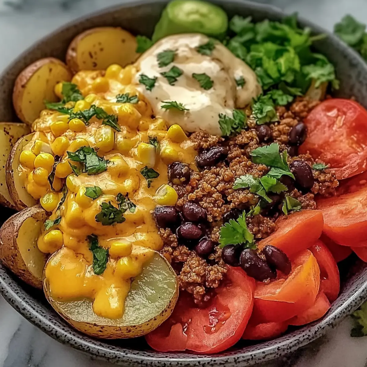 The aroma of spices wafts through the kitchen as I dive into a vibrant food adventure with my Loaded Fiesta Potato Bowls. This dish is not just a meal but a delightful experience that combines crispy roasted potatoes, seasoned beef, and layers of melty cheese. With a whopping 41g of protein per serving, these bowls are tailor-made for families seeking a hearty yet customizable dinner option. No more dull meals—everyone gets to be a part of the culinary fun by choosing their toppings. Whether you’re adding zesty salsa or creamy guacamole, the possibilities are endless! Curious about how to elevate your dinner game with this easy, nourishing recipe? Let’s get started! Why Are Loaded Fiesta Potato Bowls a Must-Try? Flavor Explosion: Every bite is a delightful fusion of crispy potatoes, savory beef, and melted cheese, delivering a thrilling taste experience. Customizable Perfection: Everyone can create their dream bowl with options like sour cream, salsa, or guacamole, making it a crowd favorite for family dinners. High Protein Packed: With an impressive 41g of protein per serving, this dish offers a hearty meal that satisfies and fuels your family’s day. Quick & Easy: This recipe is straightforward and quick to assemble, freeing up more time for family fun and less time spent in the kitchen. Healthy Twist: Substitute ingredients easily for a lighter version, like using sweet potatoes or ground turkey, while keeping the flavor intact. Great Leftovers: Store leftovers for a fast meal, just reheat in the oven to keep that signature crunch! Try complementing this meal with a side of Garlic Mashed Potatoes or a flavorful Sausage Potatoes Skillet! Loaded Fiesta Potato Bowls Ingredients For the Potatoes • Russet Potatoes – These are ideal for achieving that crispy exterior with a fluffy inside. • Olive Oil – Essential for getting a golden crust on your potatoes. • Chili Powder – Adds a warm, rich flavor to the dish. • Garlic Powder – Enhances the aroma and savory depth. • Salt – Simply elevates all the flavors. • Black Pepper – Introduces a gentle kick to balance the seasoning. For the Beef Mixture • Ground Beef (93% lean) – This is the flavorful protein base; swap for ground turkey or chicken for a leaner dish. • Taco Seasoning – Infuses the beef with zesty, robust flavors. • Water – Helps blend the taco seasoning with the beef for a saucy finish. For the Bowl Assembly • Black Beans – Adds an extra protein boost and fiber; any variety will work! • Corn Kernels – Brings a sweet crunch; use frozen, fresh, or canned based on availability. • Shredded Cheddar Cheese – Melts beautifully over the top for that comforting finish. Optional Toppings • Sour Cream or Greek Yogurt – Creamy additions for a tangy kick. • Salsa – Perfect for adding fresh, zesty goodness to your bowl. • Guacamole – A delicious option for creaminess and flavor. • Pickled Jalapeños – For those who like a spicy twist! • Fresh Cilantro – Adds a pop of freshness and color, enhancing the dish. Customize your Loaded Fiesta Potato Bowls to suit your family’s tastes! Enjoy the vibrant flavors and exciting textures in this nutritious dinner. Step‑by‑Step Instructions for Loaded Fiesta Potato Bowls Step 1: Preheat the Oven Begin by preheating your oven to 400°F (200°C) and prepare a baking sheet with parchment paper for easy cleanup. This temperature is perfect for roasting, ensuring that the potatoes develop a crispy exterior while staying fluffy inside. Get ready to enjoy the delicious aroma that will fill your kitchen! Step 2: Season the Potatoes In a large mixing bowl, toss chopped russet potatoes with olive oil, chili powder, garlic powder, salt, and black pepper. Ensure each potato piece is evenly coated for maximum flavor. The vibrant spices will create a mouthwatering base for your Loaded Fiesta Potato Bowls, setting the stage for a delightful meal. Step 3: Roast the Potatoes Spread the seasoned potatoes in a single layer on the prepared baking sheet. Roast them in the preheated oven for 25-30 minutes, flipping halfway through. You’ll know they’re done when they’re golden brown and crispy on the edges—this crunch is essential for the texture in your Loaded Fiesta Potato Bowls! Step 4: Brown the Ground Beef While the potatoes are roasting, heat a skillet over medium-high heat and add the ground beef. Cook for 6-8 minutes, breaking it up with a spatula, until it’s browned and no longer pink. Drain any excess fat to keep the dish healthy, while still allowing the beef flavor to shine through in your hearty bowls. Step 5: Add Taco Seasoning Stir in the taco seasoning and water to the browned beef, mixing thoroughly. Allow this mixture to simmer for about 2-3 minutes until the sauce thickens. The seasoning infuses the beef with zesty flavors that will complement the rest of your Loaded Fiesta Potato Bowls beautifully. Step 6: Combine with Beans and Corn Gently fold in the rinsed black beans and corn to the beef mixture, stirring until everything is heated through. This step not only boosts protein but adds vibrant color and texture to your meal; the sweet corn balances the savory beef perfectly in each Loaded Fiesta Potato Bowl. Step 7: Assemble the Bowls Once the potatoes are roasted and crispy, divide them among serving bowls. Top each bowl generously with your seasoned beef mixture and sprinkle shredded cheddar cheese on top. The heat from the beef will melt the cheese, creating a gooey, indulgent layer that elevates your Loaded Fiesta Potato Bowls to perfection. Step 8: Add Optional Toppings To finish, let everyone customize their Loaded Fiesta Potato Bowls with their favorite toppings. Offer options like sour cream, salsa, guacamole, or fresh cilantro for added flavor and freshness. This interactive step makes your family dinner fun and ensures everyone enjoys their unique bowl creation! How to Store and Freeze Loaded Fiesta Potato Bowls Ro