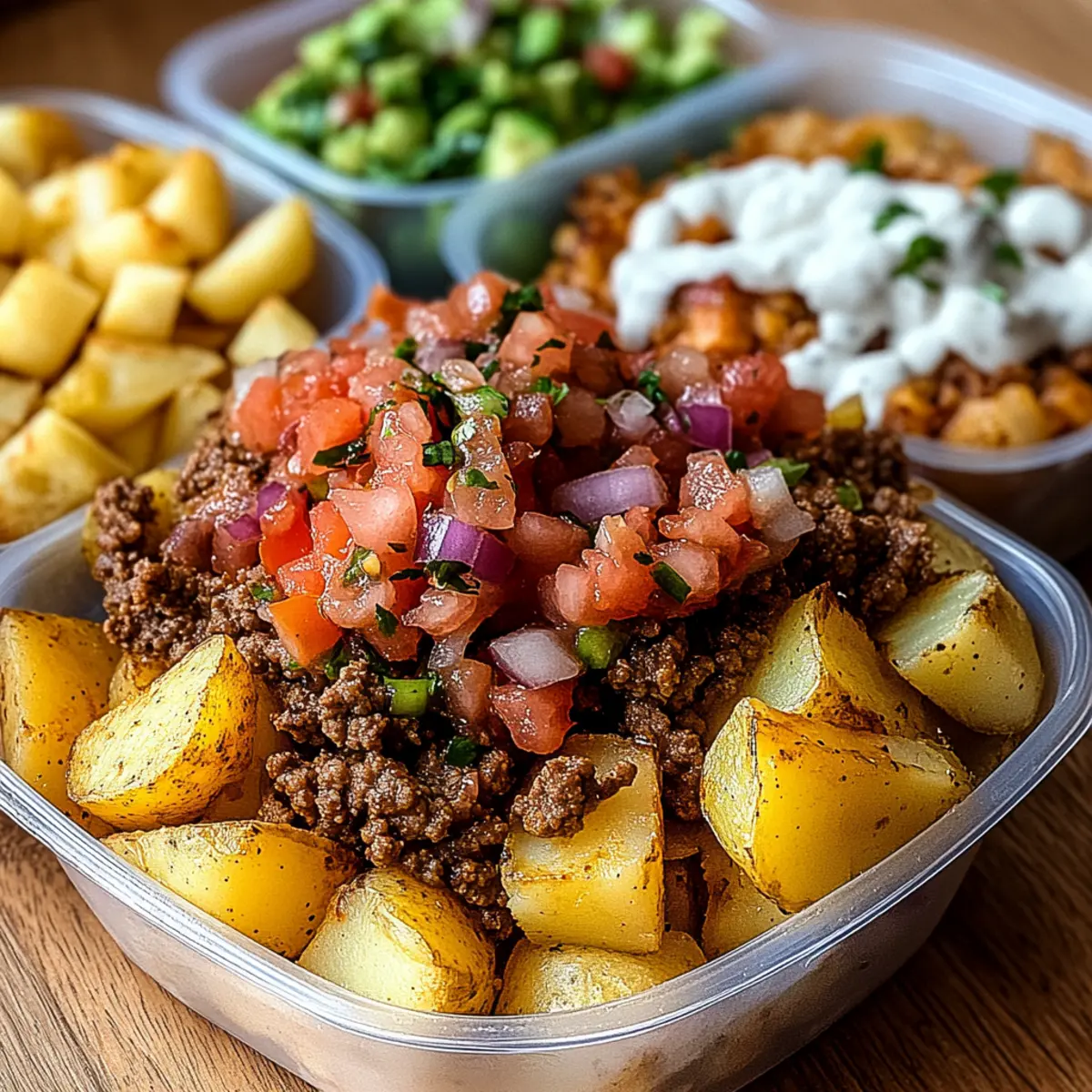 As I was swirling the toppings on my latest taco creation, a thought struck me: why not bring that bold flavor right into a cozy bowl? The Loaded Potato Taco Bowls are my answer! This recipe marries crispy roasted potatoes with savory seasoned ground beef, creating a hearty dish perfect for busy weeknights. What I love most about these bowls is how they cater to my ever-changing cravings—easy to customize, each one can be a little masterpiece in its own right. Plus, they’re packed with protein, making them a smart choice for meal prep. Let’s dive into this comforting culinary adventure together—what toppings will you choose to make it your own? Why Are Loaded Potato Taco Bowls Amazing? Comforting Flavor: The perfect fusion of crispy roasted potatoes and savory ground beef creates a rich, satisfying dish that feels like a warm hug on a plate. Customizable Delight: With endless topping options—from guacamole to jalapeños—each bowl can transform daily, catering to your cravings and dietary needs. Quick & Easy: This recipe comes together in a flash, making it ideal for busy weeknights or meal prepping on the weekend for easy lunches throughout the week. High-Protein: Packed with protein-rich ingredients, these bowls not only satisfy your hunger but also keep you energized and full. Meal Prep Friendly: Easily store individual bowls in the fridge for up to four days, allowing you to enjoy this delicious comfort food anytime! Try pairing it with my flavorful Garlic Mashed Potatoes for a delightful side! Loaded Potato Taco Bowls Ingredients For the Taco Meat Lean Ground Beef – 1 lb for a savory base; substitute with ground turkey for a lighter protein option. Creole Seasoning – ½ tsp adds a spicy kick; paprika works as a milder alternative. Cumin – ½ tsp enhances any earthy notes in the mix. Ground Coriander – ¼ tsp gives a lovely citrusy aroma. Onion Powder – ¼ tsp brings depth; fresh onion can be used if you prefer. Garlic Powder – ¼ tsp adds aromatic flavor; fresh garlic can amp the taste. Crushed Red Pepper – ¼ tsp for a touch of heat; adjust to match your spice love. Taco Seasoning – 1 tbsp or to taste for that essential taco flavor essence. Salt & Pepper – To taste, for balancing all those savory notes. For the Roasted Potatoes Yukon Gold Potatoes – 5–6 medium-large, diced for a fluffy yet crispy texture; sweet potatoes are great for a sweeter twist. Olive Oil – 1 tbsp enhances crispiness when roasting. Salt – 1 tsp, a must for flavoring! Oregano – 1 tsp adds a beautiful herbal note. Garlic Powder – 1 tsp reinforces that beloved garlic flavor alongside onion. Smoked Paprika – 1.5 tsp for a delightful smoky taste in each bite. For the Pico de Gallo (Salsa Fresca) Tomato – 1 large, diced to bring freshness and acidity. Jalapeño – 1, diced for a spicy kick; reduce if you’re heat-sensitive. Red Onion – ½, diced for a sweet touch. Lime Juice – From ½ lime to brighten the whole mix. Chopped Cilantro – 1 tbsp, giving that lovely herbal freshness. Salt & Pepper – To taste ensures a flavor balance that pops. For the Sriracha Mayo Mayonnaise – ½ cup, creamy base for that luscious touch. Sriracha – 2 tbsp, adjust for your spice preferences! Lemon Juice – ¼ tbsp, or vinegar if you’re running low on citrus. Black Pepper – 1 tsp to sprinkle that finishing touch of flavor. Get ready to create your own culinary delight with these Loaded Potato Taco Bowls that are as comforting as they are delicious! Step‑by‑Step Instructions for Loaded Potato Taco Bowls Step 1: Preheat the Oven Start by preheating your oven to 425°F (220°C). This ensures it reaches the perfect temperature for roasting the potatoes, which is key to achieving that crispy texture you want. While the oven heats up, gather your ingredients and prepare for the next steps to keep the cooking process smooth and efficient. Step 2: Prepare the Potatoes Wash and dice 5 to 6 medium-large Yukon Gold potatoes into even pieces for uniform cooking. In a large mixing bowl, toss them with 1 tablespoon of olive oil, 1 teaspoon of salt, 1 teaspoon of oregano, 1 teaspoon of garlic powder, and 1.5 teaspoons of smoked paprika. Make sure every piece is coated well before spreading them evenly on a baking sheet. Step 3: Roast the Potatoes Place the baking sheet in the preheated oven and roast the potatoes for about 25-30 minutes. Halfway through, give them a gentle flip to ensure they achieve a lovely golden brown and crispy finish. You’ll know they’re ready when they’re fork-tender and have a consistent golden hue. Step 4: Cook the Taco Meat While the potatoes roast, heat a skillet over medium heat. Add 1 pound of lean ground beef, breaking it apart as it cooks. Season it with ½ teaspoon of creole seasoning, ½ teaspoon of cumin, ¼ teaspoon of ground coriander, ¼ teaspoon of onion powder, ¼ teaspoon of garlic powder, ¼ teaspoon of crushed red pepper, and 1 tablespoon of taco seasoning. Cook it for about 7-10 minutes until the meat is browned and fully cooked, draining any excess fat. Step 5: Make the Pico de Gallo In a separate bowl, prepare your fresh pico de gallo by combining 1 large diced tomato, 1 diced jalapeño, and ½ diced red onion. Add the juice of ½ lime, 1 tablespoon of chopped cilantro, and season with salt and pepper to taste. Mix everything well and set aside to allow the flavors to meld as your potatoes and meat finish cooking. Step 6: Prepare the Sriracha Mayo In a small bowl, mix ½ cup of mayonnaise with 2 tablespoons of sriracha and ¼ tablespoon of lemon juice. Sprinkle in 1 teaspoon of black pepper and stir until combined. This creamy sriracha mayo will add a delightful kick to your Loaded Potato Taco Bowls, complementing the potatoes and taco meat perfectly. Step 7: Assemble the Bowls Once the potatoes are roasted and the meat is cooked, it’s time to assemble your Loaded Potato Taco Bowls! Start with a base of the crispy potatoes, then laye
