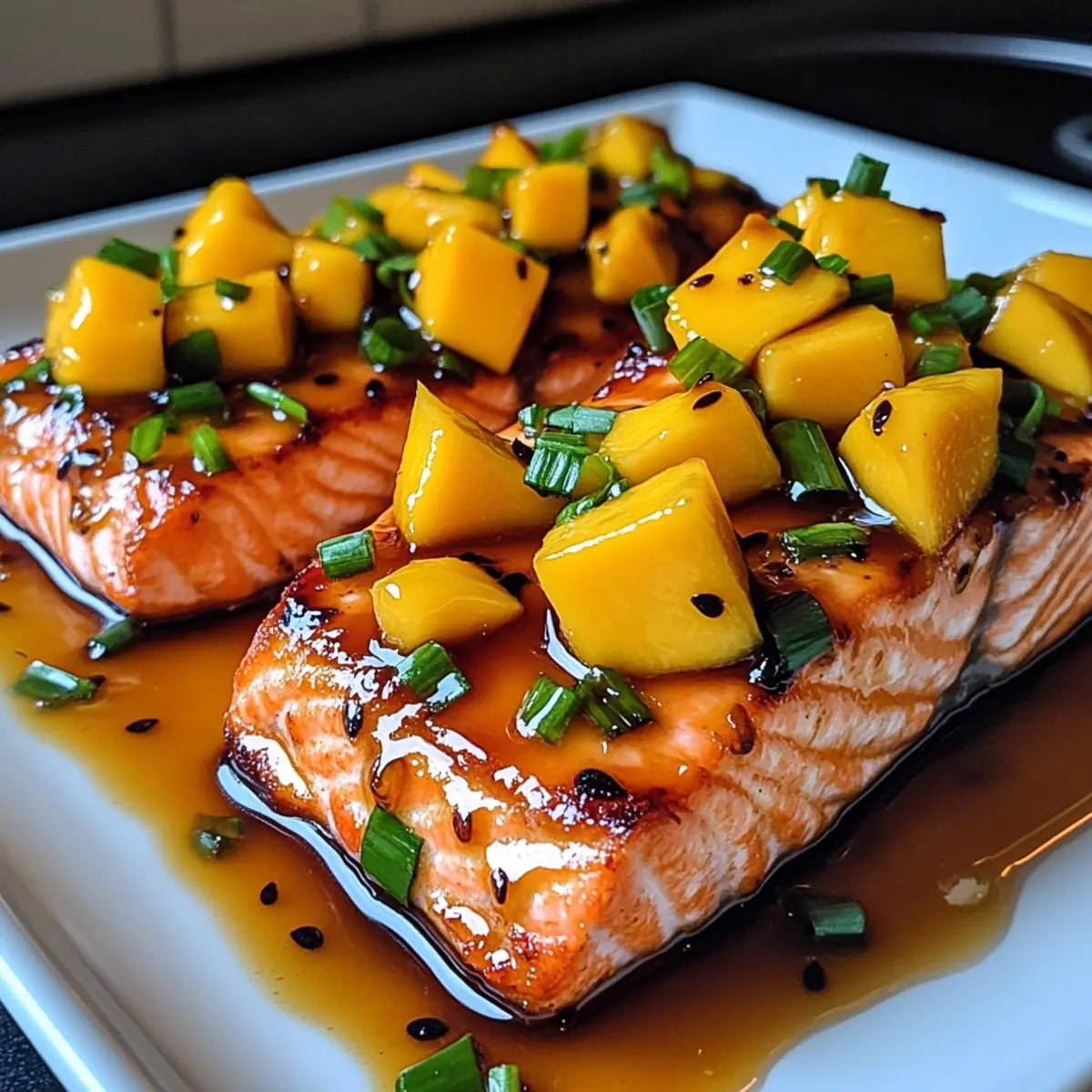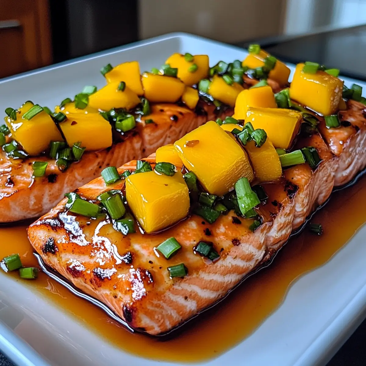 The aroma of sizzling salmon mingled with a hint of sweet mango wafts through my kitchen, instantly transporting me to a sun-soaked beach. This Mango Teriyaki Salmon recipe is my go-to for weeknight dinners when I crave something delicious yet simple to prepare. In just 30 minutes, you can serve up a dish that’s not only a feast for the eyes but also a healthy meal bursting with the tropical flavors of summer. The sweet and tangy mango pairs beautifully with the umami richness of teriyaki sauce, creating a perfectly balanced harmony on your plate. Plus, it’s quick enough to win over busy weeknights without sacrificing flavor or nutrition. Who could resist such a delightful culinary adventure right at home? Are you ready to bring the tropics into your kitchen? Why is this mango salmon a must-try? Quick and Easy: This recipe comes together in just 30 minutes, making it perfect for busy weeknights when you need something delicious without the hassle. Tropical Vibes: The sweet, juicy mango combined with teriyaki sauce brings a taste of summer to your table, transforming your dinner into a mini vacation. Healthy Choice: Packed with omega-3 fatty acids and vitamins, this Mango Teriyaki Salmon is as good for you as it is tasty, ideal for health-conscious food lovers. Versatile Option: Not a fan of salmon? Feel free to swap it out for chicken or other seafood, letting you customize the dish to your preferences. For another crowd-pleaser, try my Crock Pot Teriyaki or Mango Chicken Stir. Flavor Explosion: With a delightful mix of sweet and savory, this dish will impress your family and friends alike, ensuring it’s a hit every time you serve it! Mango Teriyaki Salmon Ingredients For the Salmon • Salmon Fillets – This star ingredient provides your dish with healthy omega-3 fatty acids; feel free to substitute with chicken breast if you prefer. For the Mango Mixture • Mango – Adds a burst of natural sweetness and tropical flavor to the dish; canned mango or peach can be used if fresh isn’t available. • Teriyaki Sauce – This key component delivers a savory umami flavor; store-bought is easy, but homemade can elevate the taste. • Lime Juice – Enhances the dish with a zesty acidity; lemon juice can work as a suitable alternative. For Garnishing • Chopped Green Onions – Imparts a fresh and mild onion flavor as a lovely garnish; can be omitted or replaced with chives if desired. Step‑by‑Step Instructions for Mango Teriyaki Salmon Step 1: Preheat the Oven Begin by preheating your oven to 400°F (200°C). This temperature is crucial as it ensures the salmon cooks evenly while developing a beautiful caramelized glaze from the teriyaki sauce. Take a moment to gather your ingredients, as having everything in place will make the preparation process seamless and enjoyable. Step 2: Prepare the Baking Tray Line a baking tray with parchment paper for easy cleanup and to prevent the salmon from sticking. Place the salmon fillets skin-side down on the prepared tray, ensuring there is enough space between each fillet. This allows for even cooking and helps achieve that lovely flaky texture in your Mango Teriyaki Salmon. Step 3: Mix the Mango Sauce In a medium-sized mixing bowl, combine the teriyaki sauce, diced mango, and fresh lime juice. Use a fork or a whisk to blend the ingredients thoroughly, ensuring the sweet mango pieces are evenly distributed within the sauce. This mixture will create a vibrant glaze that enhances the salmon with tropical flavors. Step 4: Coat the Salmon Pour the mango-teriyaki mixture over the salmon fillets, making sure each piece is generously coated. Use a spatula to spread the sauce evenly across the surface, allowing the salmon to soak up those delicious sweet and savory flavors. The contrast between the bright mango chunks and the rich sauce is a sight to behold! Step 5: Bake the Salmon Transfer the baking tray to your preheated oven and bake the salmon for approximately 15 to 20 minutes. Keep an eye on the fish; it’s done when it flakes easily with a fork and is opaque throughout. The delightful aroma of the Mango Teriyaki Salmon will fill your kitchen, heightening your anticipation for the meal. Step 6: Garnish and Serve Once baked to perfection, remove the salad from the oven and let it rest for a couple of minutes. Sprinkle chopped green onions on top for a fresh, mild flavor boost. Serving immediately is key; the warm glaze and vibrant flavors will captivate all who gather around your table. Enjoy the mouthwatering Mango Teriyaki Salmon! Make Ahead Options These Mango Teriyaki Salmon fillets are a fantastic option for meal prep, allowing you to enjoy a wholesome dinner even on the busiest days! You can prepare the mango-teriyaki sauce and coat the salmon fillets up to 24 hours in advance; simply refrigerate them in an airtight container to keep them fresh and flavorful. To maintain the quality of your meal, be sure to store the coated salmon away from strong-smelling foods. When you’re ready to serve, bake the salmon directly from the refrigerator, adding an extra minute or two to ensure it’s heated through. With these make-ahead tips, you can enjoy delicious, tropical flavors with minimal effort any night of the week! How to Store and Freeze Mango Teriyaki Salmon Fridge: Store leftovers in an airtight container in the refrigerator for up to 2 days. Make sure to keep it well-sealed to retain its delightful flavors. Freezer: If you want to freeze the dish, wrap the salmon tightly in plastic wrap followed by aluminum foil. It can be stored in the freezer for up to 3 months. Reheating: When you’re ready to enjoy again, thaw overnight in the refrigerator. Reheat gently in the oven or microwave, covering to prevent drying out, for the best results. Airtight Tips: Always ensure your container is airtight to preserve that delectable sweet and savory taste of the Mango Teriyaki Salmon while in storage. What to Serve with Mango Teriyaki Salmon? The v