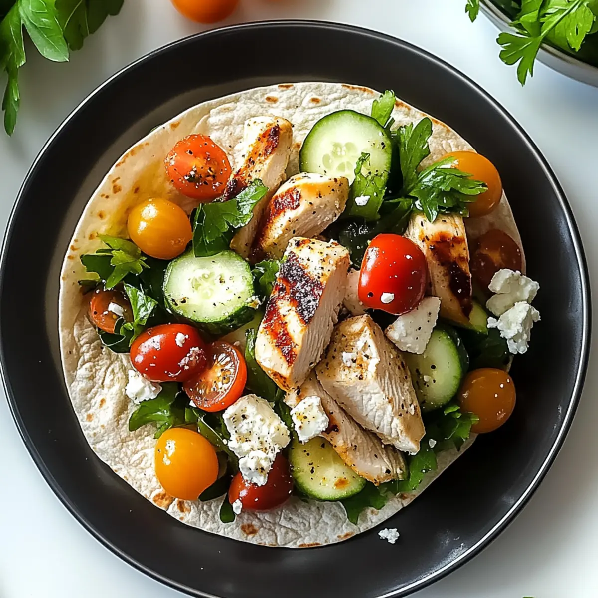 As I strolled through a bustling market in the heart of Santorini, the enticing aromas of grilled meats and vibrant vegetables enveloped me, creating a rush of anticipation. It was there that I fell in love with Mediterranean Chicken Wraps, an easy yet flavorful dish that brings that café experience right to my kitchen. Packed with zesty grilled chicken and crisp veggies, these wraps don’t just taste amazing, they also offer a quick, healthy option for lunch or dinner. With a luscious slather of creamy hummus, each bite delivers a delightful contrast of textures that’ll leave you craving more. Ready to create your own Mediterranean escape? Let’s dive into this delicious recipe! Why are Mediterranean Chicken Wraps so loved? Bursting with flavor: These wraps combine zesty grilled chicken, fresh veggies, and creamy hummus for a satisfying flavor explosion. Healthy and nutritious: Packed with lean protein and fresh ingredients, they offer a guilt-free meal option. Quick and easy: Perfect for a busy lifestyle, these wraps can be made in just 30 minutes! Versatile: Feel free to customize with different vegetables or wraps, making it adapt to everyone’s taste. Crowd-pleaser: At any gathering, these Mediterranean Chicken Wraps will be a hit—perfect to serve alongside a refreshing Greek salad or tzatziki sauce for dipping! Mediterranean Chicken Wraps Ingredients For the Chicken Boneless skinless chicken breasts – Tender and juicy when grilled; alternate with grilled veggies for a vegetarian twist. Olive oil – Adds richness and moisture; you can substitute with avocado oil for a unique flavor. Garlic powder – Provides a robust garlic essence without the fuss; fresh minced garlic can serve as an alternative. Dried oregano – Essential for bringing out that authentic Mediterranean taste; fresh oregano enhances flavor vibrancy. Paprika – Introduces a smoky sweetness; consider using smoked paprika for an extra kick. Salt – Balances the overall flavors; feel free to swap in sea salt or Himalayan salt. Black pepper – Offers a hint of heat; white pepper is a milder substitute. For the Wrap Whole wheat tortillas – Provides a nutty flavor and hearty texture; other options include flour or spinach tortillas. Hummus – Acts as a creamy, tangy base; tzatziki or avocado spread can be delicious alternatives. For the Filling Mixed greens – Adds a refreshing crunch; spinach or arugula can make great substitutes. Cucumber – Provides a crisp, refreshing bite; zucchini slices work well if you’re in a pinch. Cherry tomatoes – Juicy and sweet, they elevate the wrap; regular diced tomatoes can also do the trick. Red onion – Adds mild heat and beautiful color; green onions offer a subtler flavor. Feta cheese – Introduces a salty, tangy note, key to Mediterranean flair; you can use crumbled goat cheese for a different taste. Lemon juice – Brightens up the entire dish; lime juice is a refreshing alternative. By stocking up on these ingredients, you’ll be on your way to creating unforgettable Mediterranean Chicken Wraps that will transport your taste buds to the vibrant shores of the Mediterranean! Step‑by‑Step Instructions for Mediterranean Chicken Wraps Step 1: Preheat the Grill Begin by preheating your grill or grill pan over medium heat, around 375°F (190°C), for about 5 minutes. This will ensure that your Mediterranean Chicken Wraps have beautiful grill marks and cook evenly. If using a grill pan, lightly coat it with a bit of olive oil to prevent sticking and to enhance flavor. Step 2: Prepare the Chicken Drizzle olive oil generously over both sides of your boneless skinless chicken breasts. Then, season them with garlic powder, dried oregano, paprika, salt, and black pepper, rubbing the spices into the meat to ensure each bite is flavorful. This step sets the stage for your delicious Mediterranean Chicken Wraps, so make sure the chicken is well-coated. Step 3: Grill the Chicken Place the seasoned chicken breasts on the preheated grill, cooking for about 6-7 minutes on each side. You’re looking for a golden brown exterior, and to ensure it’s fully cooked, check that the internal temperature reaches 165°F (74°C). The smell of the spices will fill the air, enticing everyone around! Step 4: Rest the Chicken Once grilled, remove the chicken from the heat and let it rest for 5 minutes. This resting time allows the juices to redistribute, ensuring tender and juicy chicken that’s perfect for your Mediterranean Chicken Wraps. While the chicken rests, this is a good moment to prepare your fresh vegetables. Step 5: Slice the Vegetables Thinly slice the cucumber, halve the cherry tomatoes, and slice the red onion while the chicken is resting. These vibrant, crisp veggies will add crunch and freshness to your wraps. Set the vegetables aside, keeping them ready for the assembly of your Mediterranean Chicken Wraps. Step 6: Warm the Tortillas To prevent cracking when rolling your wraps, warm the whole wheat tortillas in a skillet over low heat for about 20 seconds or in the microwave for roughly the same time. This step makes the tortillas pliable and enhances their flavor, setting the perfect canvas for your Mediterranean Chicken Wraps. Step 7: Assemble the Wraps Spread a generous layer of creamy hummus over each warmed tortilla. Then, layer on the mixed greens, followed by the prepared cucumbers, cherry tomatoes, red onion, and crumbled feta cheese. These ingredients will provide a delightful contrast of flavors and textures, establishing a tasty foundation for your Mediterranean Chicken Wraps. Step 8: Add the Chicken and Lemon Juice After allowing the chicken to rest, slice it into strips and place it on top of the layered veggies and hummus. Drizzle with fresh lemon juice to bring brightness to the dish. The grilled chicken adds that heartiness to your Mediterranean Chicken Wraps while the lemon juice ties together all the flavors beautifully. Step 9: Roll and Serve Caref