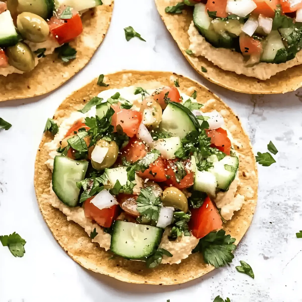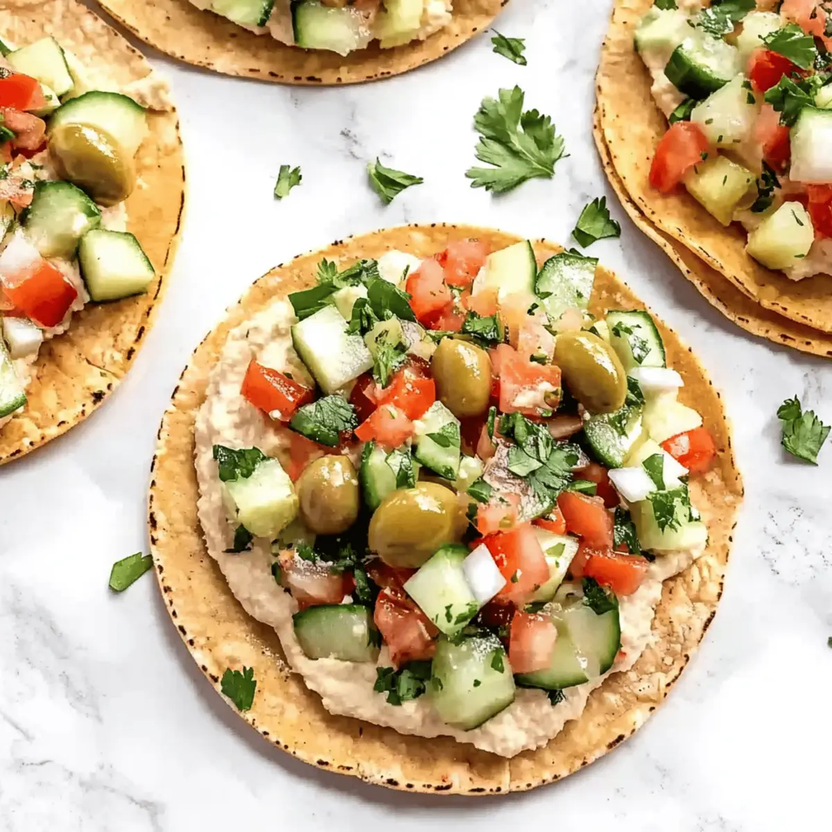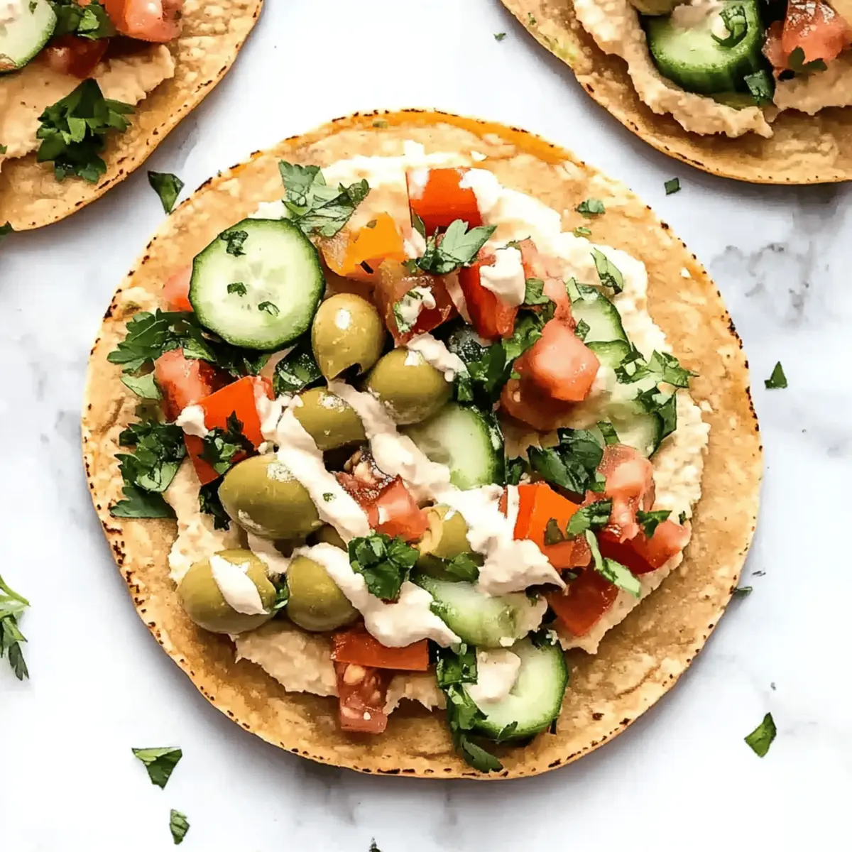 While browsing through my favorite food market last weekend, I stumbled upon a vibrant array of vegetables that instantly sparked my creativity. Out of this colorful bounty, I crafted these 10-Minute Vegan Mediterranean Tostadas, a dish that invites both flavor and simplicity into your kitchen. This quick recipe brilliantly combines crisp corn tortillas with creamy hummus and a refreshing salad mix, perfect for anyone seeking a delicious alternative to fast food. Not only are these tostadas vegan and gluten-free, but they also showcase the incredible versatility of Mediterranean ingredients. Imagine enjoying a light, satisfying meal that’s both nutrient-packed and bursting with taste. Are you ready to elevate your lunch or dinner game with a delightful Mediterranean twist? Let’s dive in! Why are these Mediterranean Tostadas special? Simplicity at Its Best: With only a few fresh ingredients, you can whip these up in just 10 minutes! Crispy Delight: The toasted corn tortillas provide a satisfying crunch that perfectly contrasts the creamy hummus. Flavor Explosion: Each bite bursts with Mediterranean flavors, thanks to the zesty dressing and vibrant salad mix. Vegan & Gluten-Free: Ideal for anyone looking for healthy, plant-based meals without sacrificing flavor. Versatile Base: Customize with seasonal veggies, protein additions like chickpeas, or different hummus flavors for endless possibilities. Crowd-Pleaser: These tostadas make a fantastic dish for gatherings or quick weeknight dinners, ready to wow your guests! Mediterranean Tostadas Ingredients For the Salad • Cucumber – Adds a refreshing crunch; substitute with zucchini for a similar texture. • Cherry Tomatoes – Provides sweetness and juiciness; any small tomato variety works as a substitute. • Green Olives – Brings a salty, briny flavor; substitute with capers for a tangy alternative. • Shallot or Red Onion – Adds sharpness and depth; you can use regular onion if shallots are unavailable. • Parsley – Offers freshness and color; substitute with cilantro for a different herbal profile. For the Dressing • Olive Oil – Enhances flavor and richness; avocado oil can be used as a neutral substitute. • Lemon Juice – Brightens the salad; lime juice makes a great alternative. • Salt & Pepper – Essential for seasoning; be mindful of salt if using brined olives. For the Tostadas • Corn Tortillas – Serve as the crispy base; swap with whole grain tortillas for added fiber. • Hummus – Adds creaminess and flavor; any variety works, but roasted red pepper adds a fun twist. • Tahini – Provides a rich, nutty drizzling finish; mix with water for a smooth, pourable consistency. Step‑by‑Step Instructions for Mediterranean Tostadas Step 1: Prepare the Salad In a medium bowl, combine the chopped cucumber, halved cherry tomatoes, sliced green olives, diced shallots, and roughly chopped parsley. Toss the ingredients together until evenly mixed. This vibrant salad will add freshness to your Mediterranean tostadas. Set aside to let the flavors meld while you prepare the dressing. Step 2: Make the Dressing In a small bowl, whisk together about 3 tablespoons of olive oil and the juice of one lemon, then sprinkle in salt and pepper to taste. The dressing should have a tangy and rich flavor that will elevate the salad. Once mixed, pour it over the salad mixture and gently toss everything to coat evenly. Step 3: Toast the Tortillas Heat a non-stick frying pan over medium heat and warm the corn tortillas one at a time for about 1-2 minutes on each side until they are golden brown and crispy. You can also use a toaster oven for this step. Once toasted, place the tortillas on a serving platter and ensure they stay warm. Step 4: Assemble Tostadas Spread approximately 2 tablespoons of hummus on each crispy tortilla, creating a nice creamy layer. Then, pile on about 1/4 cup of the vibrant salad mixture on top of the hummus. Each Mediterranean tostada should be colorful and filled with delicious textures for the perfect bite. Step 5: Drizzle with Tahini In a small bowl, mix tahini with a splash of water to achieve a smooth pouring consistency. Drizzle this mixture over the assembled tostadas for a rich, nutty flavor. This final touch adds elegance and depth, making your Mediterranean tostadas irresistible. Step 6: Serve and Enjoy For the best crunch, serve the tostadas immediately after assembling. If preparing for later, keep the components separate to avoid sogginess. Plate the Mediterranean tostadas beautifully, and enjoy a delightful meal that combines freshness and flavor in every bite! How to Store and Freeze Mediterranean Tostadas Fridge: Store each component—tortillas, salad, hummus, and tahini—in separate airtight containers. They will stay fresh for up to 3 days. Freezer: While it’s best to freeze only the tortillas, they can be stored in an airtight bag for up to 2 months. Thaw in the fridge before reheating. Assemble Just Before Serving: To maintain the crunch of your Mediterranean tostadas, combine all elements right before enjoying. This helps avoid sogginess! Reheating Tortillas: Reheat in a frying pan over medium heat for about 1 minute on each side until crispy again. Enjoy that delightful crunch! Make Ahead Options These Mediterranean Tostadas are perfect for busy home cooks looking to save time! You can prepare the salad mixture up to 3 days in advance; simply combine the chopped cucumber, cherry tomatoes, olives, shallots, and parsley, then store it in an airtight container in the fridge. To maintain freshness, keep the dressing separate until just before serving. The corn tortillas can be toasted in advance as well—just warm them up quickly in the oven before assembling. When you’re ready to enjoy, spread the hummus on the crispy tortillas, add the salad, and drizzle with tahini for a delicious meal that’s just as fresh and flavorful! What to Serve with 10-Minute Mediterranean Tostadas Pi