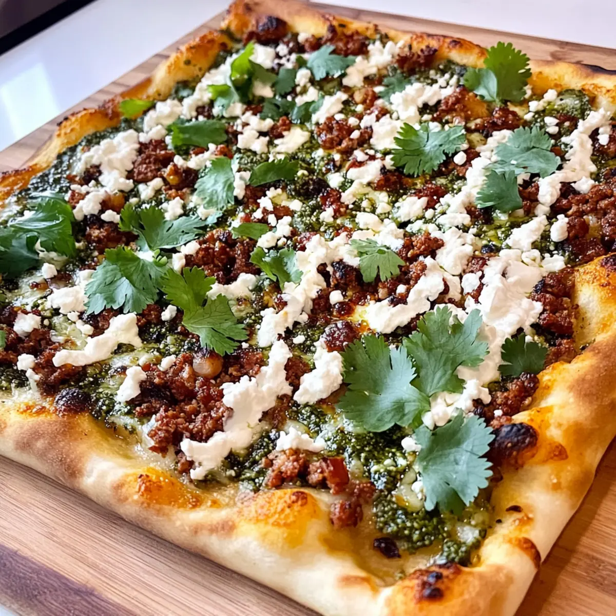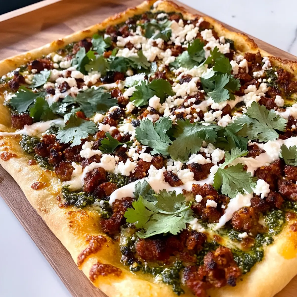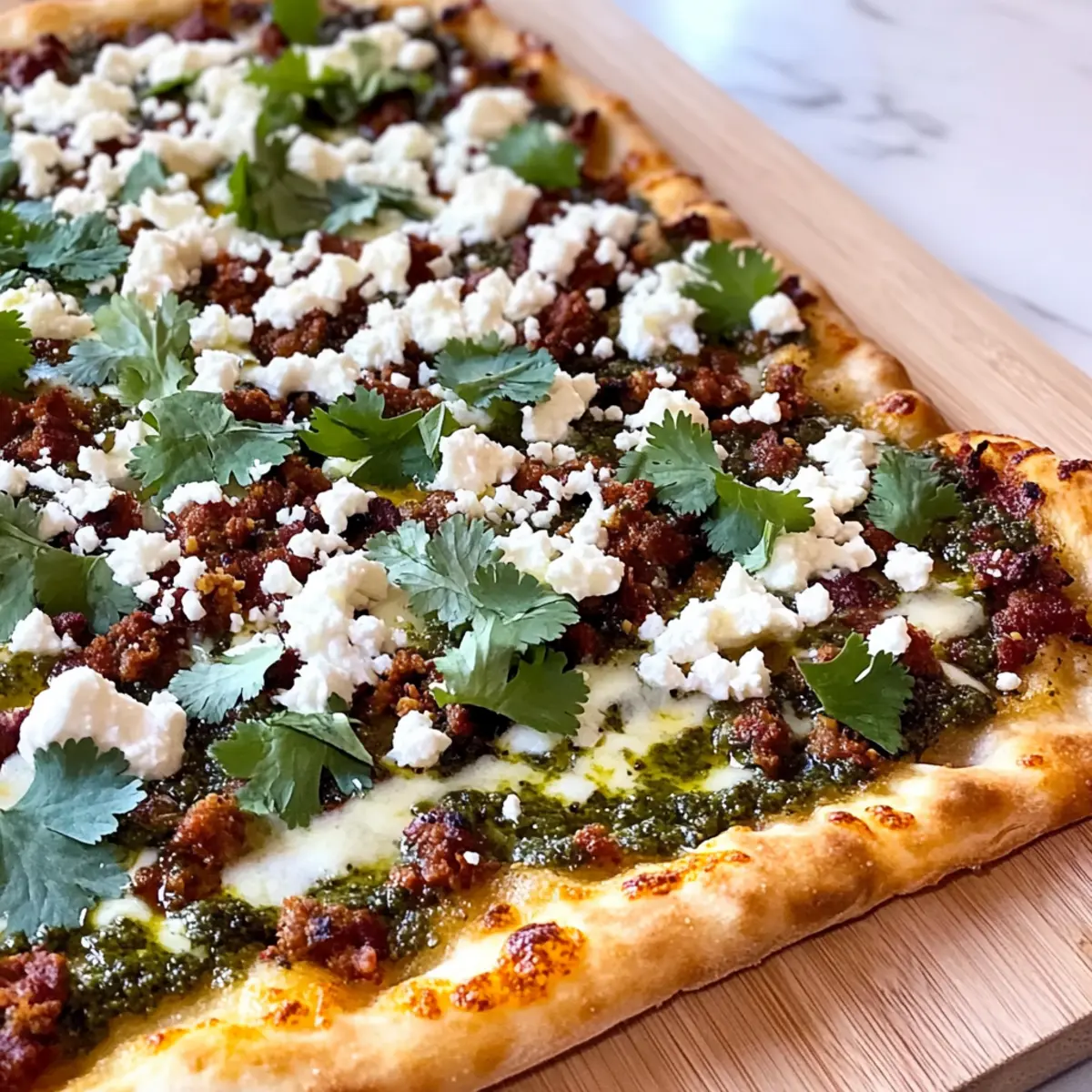 Get ready to indulge in this delicious Mexican pizza topped with vibrant cilantro pesto, and remember, for a vegetarian twist, simply swap out the chorizo!
