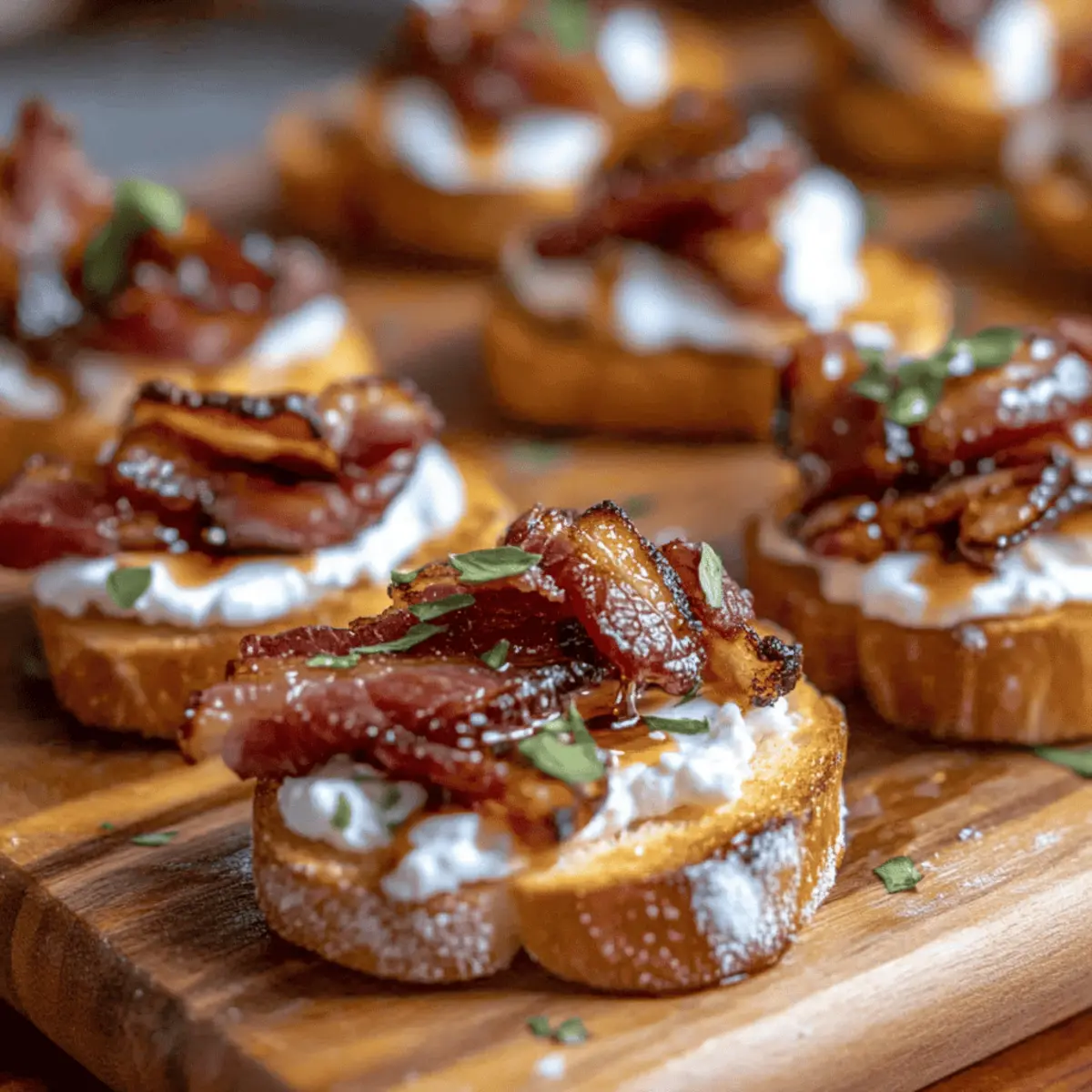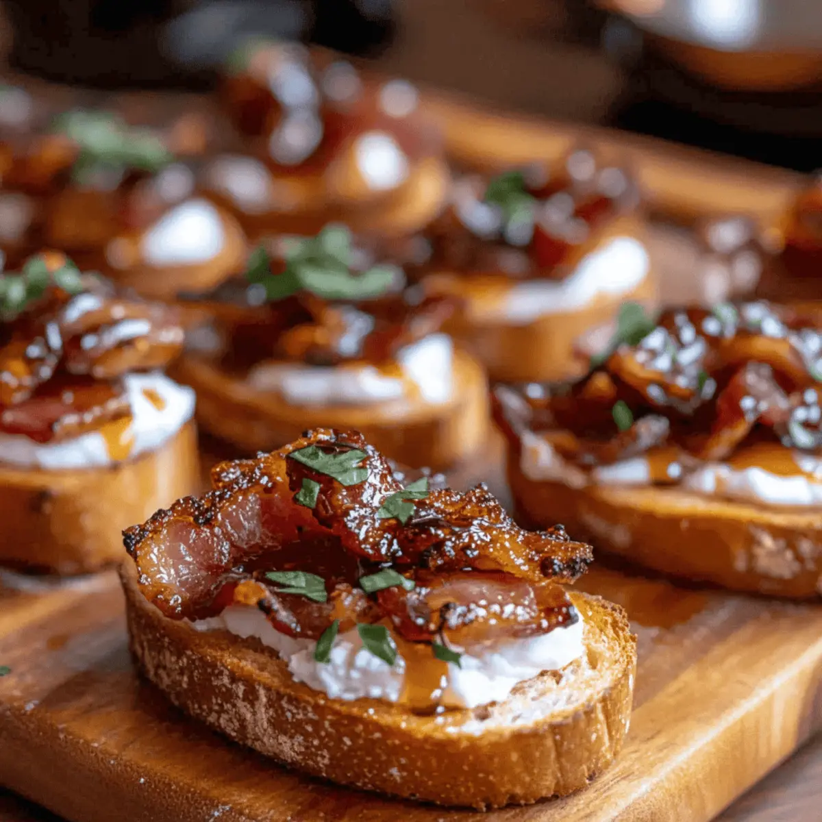 Walking into the kitchen, I was greeted by the irresistible aroma of sweet, spicy candied bacon sizzling away in the oven. Inspired by a desire to elevate my appetizer game, I dove into creating what I now call my Million Dollar Bacon Crostini. This delightful recipe is a true crowd-pleaser, pairing crisp baguette slices with luscious goat cheese and that sticky bacon magic. In under an hour, you can whip up this elegant yet easy dish that transforms any gathering into a culinary event. Plus, with options for gluten-free bread and ingredient substitutions, everyone can join in on the deliciousness. Are you ready to impress your friends with this delectable twist on classic crostini? Why Are Million Dollar Bacon Crostini Irresistible? Unforgettable Flavor: With the perfect blend of sweet and spicy, each bite bursts with unique taste that will leave your guests craving more. Easy to Prepare: This recipe comes together quickly, making it ideal for both novice cooks and seasoned chefs. In less than an hour, you’ll have a stunning appetizer ready to serve! Flexible Ingredients: Whether you need a gluten-free option or want to swap out goat cheese for cream cheese, this recipe adapts to your dietary needs, ensuring everyone can enjoy it. Crowd-Pleasing Appeal: These crostinis are guaranteed to be a hit at parties or family gatherings—trust me, they won’t last long on the table! For another easy recipe that you can whip up in a flash, check out my delicious Tomato Bacon Pasta. Elevated Presentation: The combination of crispy bread, creamy cheese, and vibrant herbs creates a dish that looks as fabulous as it tastes, making it perfect for impressing guests. Million Dollar Bacon Crostini Ingredients • Gather these must-have ingredients to create your impressive million dollar bacon crostini! For the Bacon Thick-cut bacon – Adds savory depth and crunch; substitute with turkey bacon for a lighter option. Brown sugar – Sweetness to balance the saltiness of bacon; coconut sugar can be used for a healthier version. Water – Helps dissolve and activate the sugar for that perfect candied texture. Black pepper – Provides mild heat and depth. Cayenne pepper – Adds an optional kick; omit if you prefer a milder dish. Red pepper flakes – Optional for extra heat; adjust according to your taste. For the Crostini Baguette (1 large) – The base for crostini, creating a crunchy canvas; slice into 24 rounds for perfect servings. Olive oil – Used for brushing the bread to enhance flavor before toasting. Salt and pepper – Essential for seasoning those crispy baguette slices. For the Topping Goat cheese log (8 oz) – Offers tangy creaminess; blend with cream cheese for a milder taste if desired. Maple syrup, honey, or hot honey – For drizzling, adds a delightful sweetness that complements the bacon beautifully. Fresh herbs (thyme or chives) – Optional garnishes for added flavor and visual appeal. Candied pecans – Optional for an extra crunch and a touch of sweetness. With these flavorful components, you’ll soon be delighting your taste buds with the irresistible million dollar bacon crostini! Step‑by‑Step Instructions for Million Dollar Bacon Crostini Step 1: Preheat the Oven Start by preheating your oven to 375°F (190°C). Line a baking sheet with foil to catch drippings, and place a wire rack atop it. This setup allows the grease to drain away, ensuring the bacon becomes wonderfully crispy while baking, perfect for your Million Dollar Bacon Crostini. Step 2: Prepare the Bacon Coating In a mixing bowl, blend together 1/2 cup of brown sugar, 2 tablespoons of water, and seasonings like black pepper, cayenne, and red pepper flakes. This sweet and spicy mixture will coat your strips of thick-cut bacon beautifully. Make sure each strip is thoroughly dredged to ensure maximum flavor and caramelization during baking. Step 3: Bake the Bacon Lay the coated bacon strips evenly on the wire rack and slide them into the preheated oven. Allow them to bake for 25–30 minutes, flipping halfway through for even crispiness. You’ll know they’re ready when they are beautifully caramelized and crispy, filling your kitchen with an irresistible aroma. Step 4: Toast the Baguette Slices While the bacon bakes, slice the baguette into 24 rounds about 1/2 inch thick. Lightly brush each slice with olive oil and season with a sprinkle of salt and pepper. Place them on a separate baking sheet and toast in the oven for 8–10 minutes until they are golden-brown and crispy—this will be the perfect crunchy base for your Million Dollar Bacon Crostini. Step 5: Assemble the Crostini Once the bacon has cooled slightly, chop it into bite-sized pieces. Grab your toasted baguette slices and generously spread tangy goat cheese over each one. Top with the chopped candied bacon pieces, and finish by drizzling with maple syrup or honey for a delightful sweetness that enhances the savory components. Step 6: Garnish and Serve To elevate your Million Dollar Bacon Crostini, add fresh herbs like thyme or chives, and sprinkle on some candied pecans, if using. These garnishes not only add flavor but also a beautiful presentation. Serve immediately while the crostini are warm and the flavors are at their peak for an unforgettable appetizer experience. Million Dollar Bacon Crostini Variations Feel free to let your creativity shine and customize these Million Dollar Bacon Crostini for a delightful twist! Dairy-Free: Substitute goat cheese with a cashew-based cheese for a creamy texture without the dairy. Gluten-Free: Use gluten-free baguette options to make this delicious crostini suitable for everyone. Spicy Kick: Add sliced jalapeños or a dash of sriracha on top to amp up the heat and flavor profile. Sweet & Savory: Experiment with different drizzles like balsamic glaze or agave syrup for a unique sweet contrast. Veggie Boost: Top the crostini with sliced roasted red peppers or sautéed mushrooms for an earthy flavor twist.