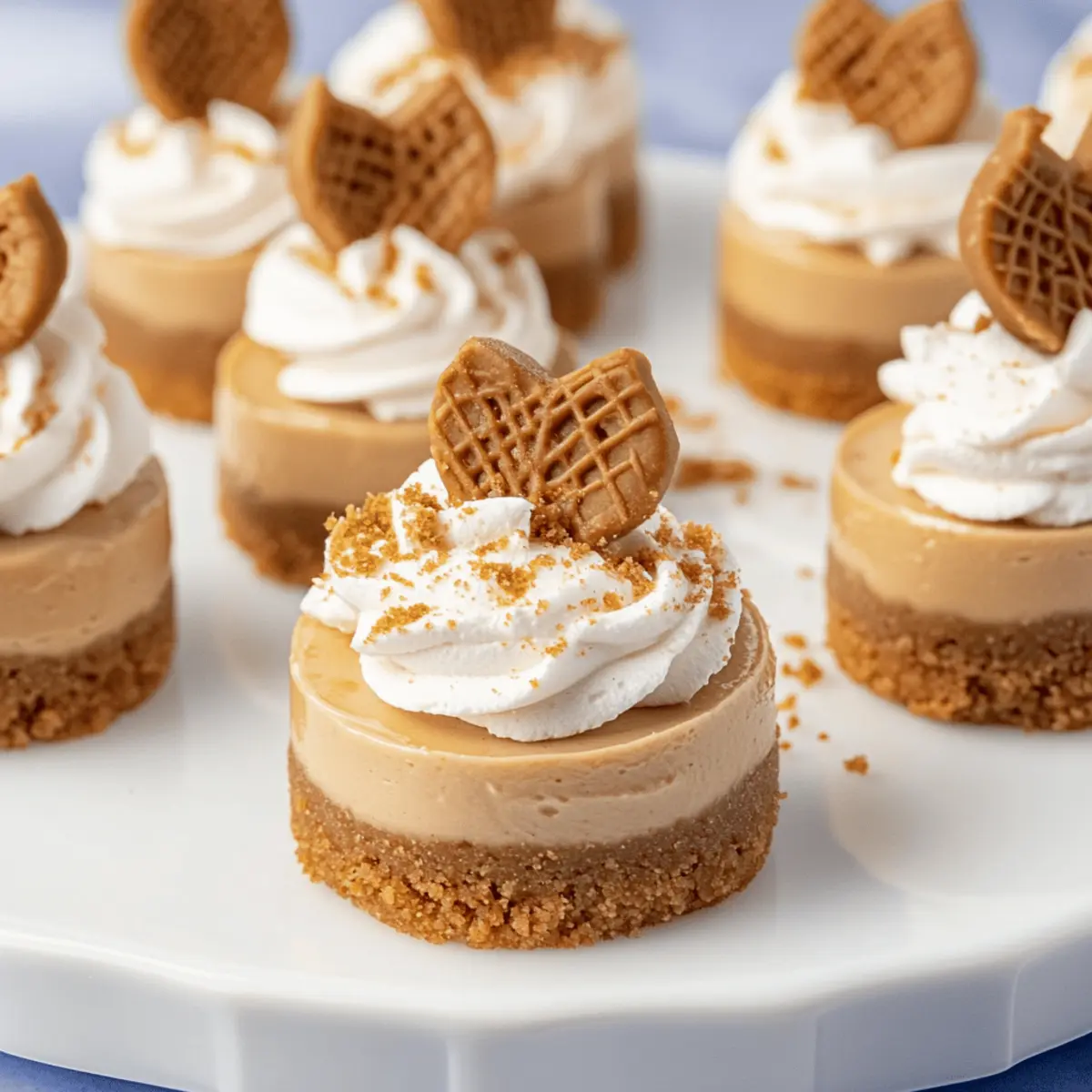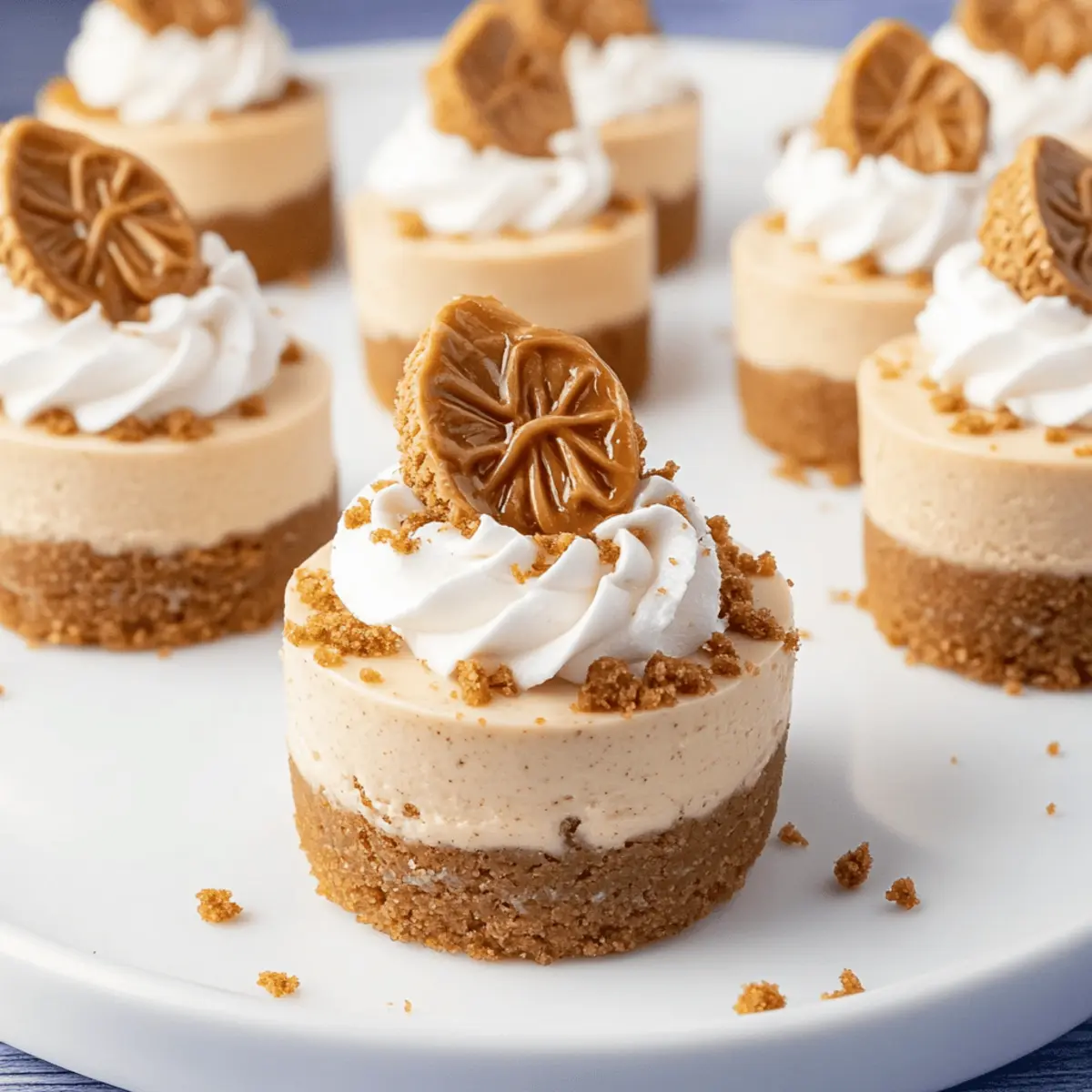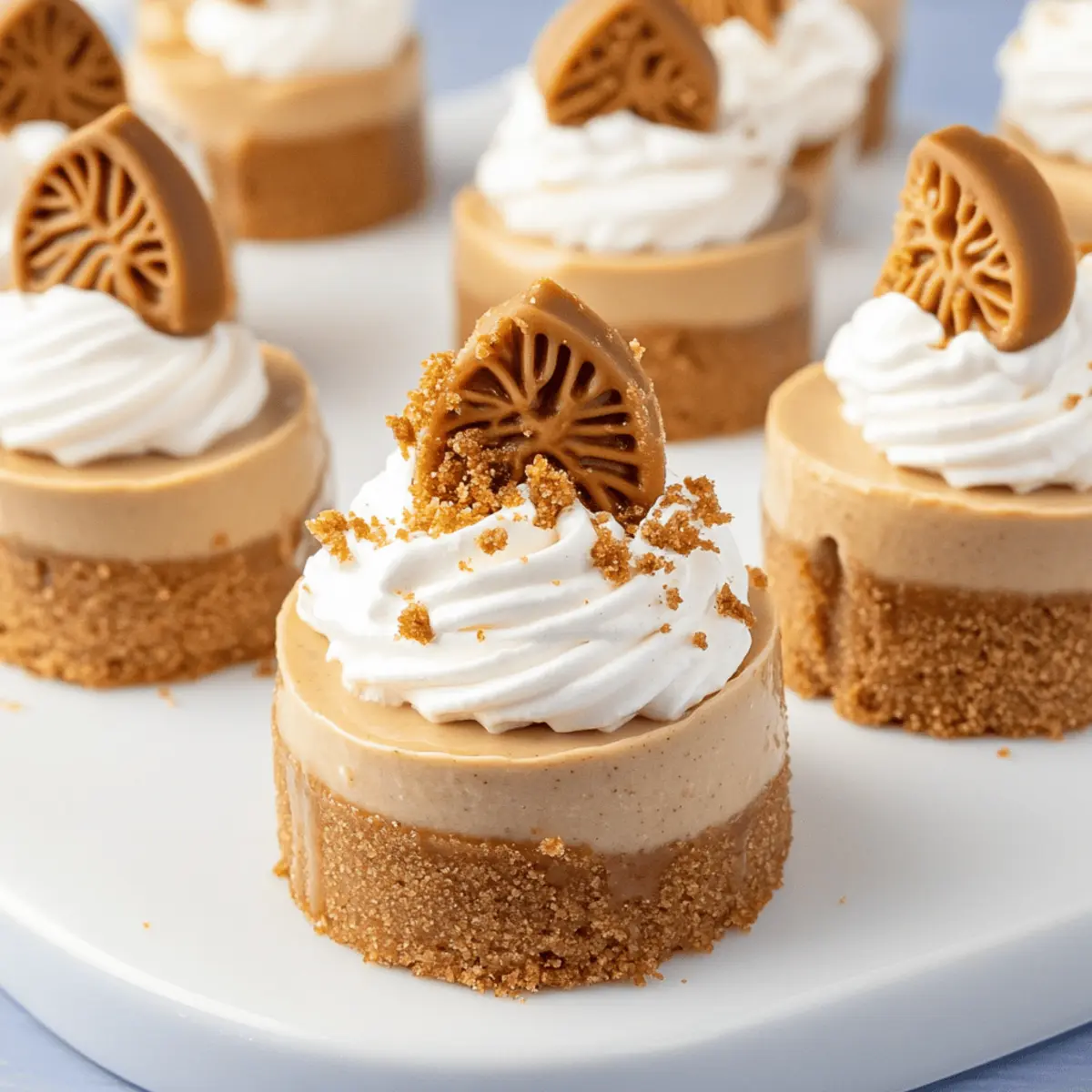 “Can you believe it?” I overheard my friend exclaim as she took her first bite of a Mini Biscoff Cheesecake. The look of sheer delight on her face said it all! These little treasures unite the smooth, creamy essence of cheesecake with the comforting warmth of Biscoff cookies, creating a dessert that’s perfect for any occasion. What makes them even more appealing is that they’re no-bake and incredibly easy to whip up, making them an ideal choice for both novice and seasoned cooks alike. Imagine treating your loved ones to these luscious bites of cookie butter goodness that not only satisfy sweet cravings but also transform any gathering into a memorable experience. Curious about how to bring this easy dessert into your kitchen? Let’s dive into the recipe! Why are Mini Biscoff Cheesecakes a must-try? Irresistible Taste: The creamy cheesecake paired with the rich flavor of Biscoff creates a dessert experience unlike any other. No-Bake Convenience: This recipe is perfect for busy individuals, requiring minimal effort while delivering maximum flavor. Visually Stunning: Individual portions topped with whipped cream and cookie crumbs make for a beautiful dessert presentation. Crowd-Pleasing Delight: Ideal for gatherings, these mini treats will wow friends and family, leaving them craving more. Pair them with a delicious beverage or even alongside a decadent Biscoff Cookie Cheesecake for an unforgettable dessert spread. Versatile & Customizable: Feel free to tweak the recipe with different cookie flavors or toppings to suit every palate! Mini Biscoff Cheesecakes Ingredients • Here’s everything you need to create these delightful no-bake treats! For the Cookie Crust Biscoff cookie crumbs – 2 cups (200 g) – Provides a sweet, crunchy base that enhances the flavor of the cheesecake. Granulated sugar – 2 tbsp (24 g) – Enhances sweetness in the crust, making it perfectly delicious. Salted butter – 6 tbsp (84 g), melted – Binds the cookie crumbs and adds richness to the crust. For the Cheesecake Filling Cream cheese – 16 oz (454 g), room temperature – The creamy base for the cheesecake, creating that luscious texture. Powdered sugar – 1 ¾ cup (210 g) – Sweetens the filling while ensuring a smooth consistency. Biscoff spread (cookie butter) – 1 cup (237 g) – Adds the signature flavor and creaminess essential for Mini Biscoff Cheesecakes. Vanilla extract – 2 tsp – Enhances and rounds out the overall flavor profile. Heavy cream (for the filling) – 1 cup (237 ml) – Whipped to create lightness and airiness in the cheesecake. For the Topping Heavy cream (for whipped topping) – ¾ cup (177 ml) – Whipped for a light and airy finish. Additional Biscoff spread – ¾ cup (177 g), for drizzling – Adds extra flavor and an appealing drizzle on top. Biscoff cookie crumbs (for garnish) – 2 tbsp (30 g) – Decorative crunch to enhance presentation. Biscoff cookies – 12, halved – An extra touch for garnish and added flavor! Step‑by‑Step Instructions for Mini Biscoff Cheesecakes Step 1: Prepare the Crust In a mixing bowl, combine 2 cups of Biscoff cookie crumbs, 2 tablespoons of granulated sugar, and 6 tablespoons of melted salted butter. Stir until the mixture resembles wet sand. Using about 1 tablespoon of this crust mixture, firmly press it into the bottom of each cavity in a mini cheesecake pan. Set aside to allow the crust to firm up while you prepare the filling. Step 2: Make the Cheesecake Filling In a large mixing bowl, beat 16 ounces of room temperature cream cheese until smooth and creamy. Gradually add in 1 ¾ cups of powdered sugar, 1 cup of Biscoff spread, and 2 teaspoons of vanilla extract. Mix well until fully combined. Then, slowly add 1 cup of heavy cream and continue to beat until the mixture is thick and fluffy, resembling a light and airy batter perfect for your Mini Biscoff Cheesecakes. Step 3: Fill the Crusts Scoop or pipe the cheesecake filling into the prepared crusts, filling them generously to create a delightful mini treat. Smooth the tops with a spatula for an even finish. Once filled, cover the mini cheesecakes with plastic wrap and refrigerate for at least 12 hours, allowing them to set properly and develop their flavors. Step 4: Make the Whipped Cream When ready to serve your Mini Biscoff Cheesecakes, whip ¾ cup of heavy cream with 1 tablespoon of powdered sugar and a splash of vanilla extract until medium-stiff peaks form. This whipped cream will add a light, airy topping to each cheesecake. Transfer the whipped cream to a piping bag for easy decoration or simply dollop it onto each cheesecake once they are set and chilled. Step 5: Assemble the Toppings To add an extra layer of flavor, melt ¾ cup of additional Biscoff spread in the microwave for about 20-30 seconds, just until pourable. Drizzle the melted spread generously over each cheesecake for a luscious finish. Top with a dollop of whipped cream and sprinkle with 2 tablespoons of Biscoff cookie crumbs for added texture and visual appeal, finishing with half a Biscoff cookie on top for that perfect touch. Expert Tips for Mini Biscoff Cheesecakes Room Temperature Dairy: Ensure all dairy, including cream cheese and heavy cream, is at room temperature to achieve a smooth, fluffy texture in your Mini Biscoff Cheesecakes. Avoid Overbeating: Be careful not to overbeat the heavy cream when whipping; stop when you reach medium-stiff peaks to prevent graininess in your cheesecake. Greased Pans: For easy removal, lightly grease your cheesecake pan or opt for one with removable bottoms. This step is vital for maintaining the shape of your mini treats. Flavor Variations: Feel free to experiment with different cookie flavors or toppings like chocolate ganache; just ensure the cookie essence remains prominent in these Mini Biscoff Cheesecakes. Chill Time Matters: Allow the cheesecakes to set in the fridge for at least 12 hours. This chilling time enhances the flavors and helps create 