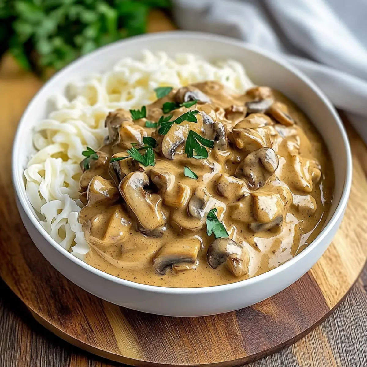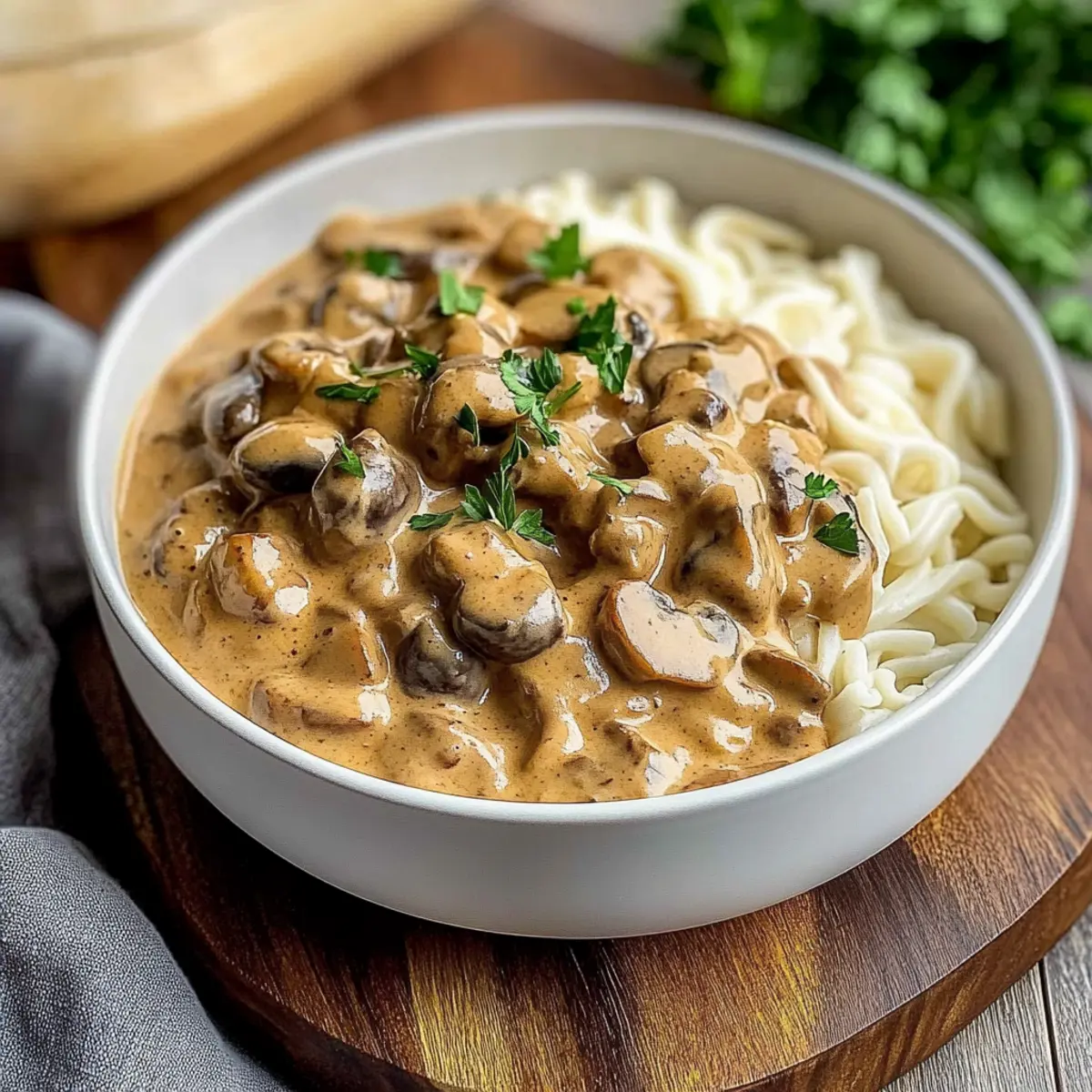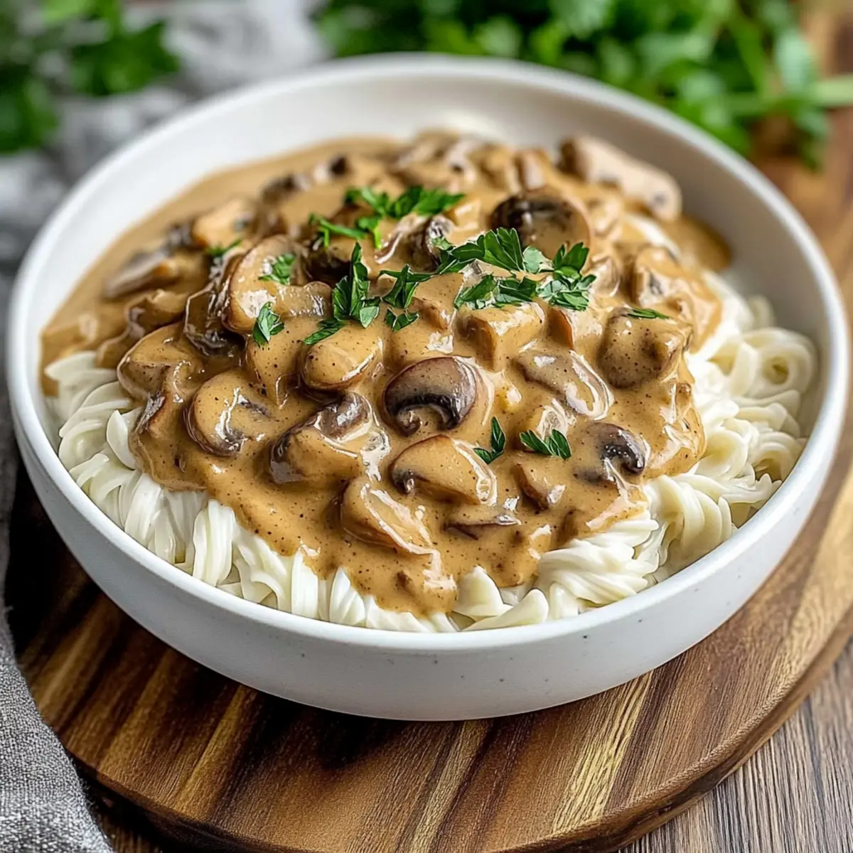 The aroma of sautéing mushrooms and garlic wafts through the kitchen, taking me back to cozy family dinners filled with laughter and warmth. Introducing my Mushroom and Seitan Stroganoff, a dish that captures that nostalgic comfort in a delightful vegetarian form. It’s remarkable how quickly you can whip this up, ready in just 30 minutes, making it perfect for busy weeknights while still being a showstopper for dinner guests. The creamy texture and rich umami flavors will entice even the most devoted carnivores, while offering a healthful alternative for those seeking vegetarian or vegan comfort food. I can’t wait for you to try it—what’s your favorite way to switch up classic recipes? Why Try Mushroom and Seitan Stroganoff? Comforting, this Mushroom and Seitan Stroganoff brings the warm, homey flavors you crave in just 30 minutes. Nutritious twist: Packed with protein from seitan and fiber from mushrooms, it’s a hearty option for health-conscious eaters. Flexible recipe: Easily adapt it to your preferences—try different mushrooms or swap in chickpeas for protein. Undeniably satisfying: Rich, creamy sauce clings to tender noodles, making it a dish the whole family will love. Looking for more comforting meals? Check out my Baked Mac Cheese for another crowd-pleaser! Mushroom and Seitan Stroganoff Ingredients For the Stroganoff • Onion – Adds sweetness and depth of flavor; opt for yellow or white for the best results. • Garlic – Provides aromatic savoriness; fresh cloves are recommended for intensity. • Mushrooms (10 oz) – The main star, contributing umami and texture; choose cremini or button for a rich flavor. • Seitan (8 oz) – Acts as a meat substitute providing a hearty texture; slice thinly for even cooking. • Olive Oil (1 tbsp) – For sautéing, adds richness; can substitute with vegetable oil. • Flour (1 tbsp) – Thickens the stroganoff sauce; use gluten-free flour if needed. • Vegetable Broth (1 ½ cups) – Adds moisture to the sauce; homemade or low-sodium store-bought works well. • Dairy-Free Sour Cream (1 cup) – Creates creaminess and tang; substitute with regular sour cream if not vegan. • Dijon Mustard (1 tbsp) – Adds a pungent note and depth of flavor. • Soy Sauce/Tamari (1 tbsp) – Enhances umami and adds saltiness; tamari is great for gluten-free. • Smoked Paprika (1 tsp) – Offers a smoky flavor that deepens the dish’s complexity. • Thyme (½ tsp) – Provides aromatic herbal notes; can be substituted with oregano. • Egg Noodles or Pappardelle (12 oz) – The starch base; choose vegan pasta for a completely vegan dish. • Fresh Parsley – For garnish and a touch of freshness. Step‑by‑Step Instructions for Mushroom and Seitan Stroganoff Step 1: Prep Ingredients Start by finely chopping the onion and mincing the garlic, setting them aside. Then, clean and slice your mushrooms and thinly slice the seitan. This prep work ensures everything is ready for a smooth cooking process. Having your ingredients prepped saves time and creates a more enjoyable cooking experience as you prepare your Mushroom and Seitan Stroganoff. Step 2: Sauté Onions In a large skillet, heat the olive oil over medium heat for about 1 minute. Once hot, add the chopped onions and sauté them for 5–7 minutes until they become soft and translucent, stirring frequently. You’ll know they’re ready when they have a beautiful golden hue. This step lays the flavorful foundation for your Mushroom and Seitan Stroganoff. Step 3: Add Garlic Stir in the minced garlic and cook for an additional 1–2 minutes. Keep a close eye on it to prevent burning; you want it fragrant and lightly golden. The aroma of garlic should fill your kitchen, enhancing the base flavors of your dish. After this, you’re ready to add the mushrooms. Step 4: Cook Mushrooms Increase the skillet heat to medium-high and add the sliced mushrooms. Sauté for 8–10 minutes, stirring occasionally, until the mushrooms release their moisture and are nicely browned. You’ll know they are done when they shrink down in size and develop a deep, rich color. This step is crucial for adding umami depth to the Mushroom and Seitan Stroganoff. Step 5: Incorporate Seitan Push the cooked mushrooms to one side of the skillet and add the sliced seitan. Cook for 3–4 minutes, stirring occasionally, until it slightly browns. This step adds texture and heartiness, mimicking the feel of traditional stroganoff while making it a satisfying vegetarian option. Step 6: Add Flour Sprinkle the flour over the mushroom and seitan mixture, stirring well for about 2 minutes to eliminate any raw flour taste. This step helps thicken the sauce, ensuring a creamy consistency. You’ll notice the mixture starting to adhere, setting the stage for the rich sauce to come in your Mushroom and Seitan Stroganoff. Step 7: Pour in Broth Gradually pour in the vegetable broth, stirring continuously to avoid lumps. Bring the mixture to a gentle simmer over medium heat, which should take about 3–4 minutes. As it simmers, watch for thickening as it begins to bubble and reduce, creating a luscious base for your stroganoff. Step 8: Mix in Creaminess Add the dairy-free sour cream, Dijon mustard, soy sauce, smoked paprika, and thyme to the skillet. Stir everything together until smooth and let it simmer for another 5–7 minutes. The sauce should thicken further and develop a creamy, comforting texture, embodying the essence of your Mushroom and Seitan Stroganoff. Step 9: Cook Noodles While the sauce simmers, cook your egg noodles or pappardelle according to package instructions in a separate pot. Usually, this takes about 8–10 minutes until they are al dente. Once done, drain them, but avoid rinsing the noodles to keep the starch for better sauce adhesion. Step 10: Combine and Serve Once your noodles are cooked, either toss them directly into the sauce to coat or plate the noodles and spoon the mushroom and seitan sauce over th