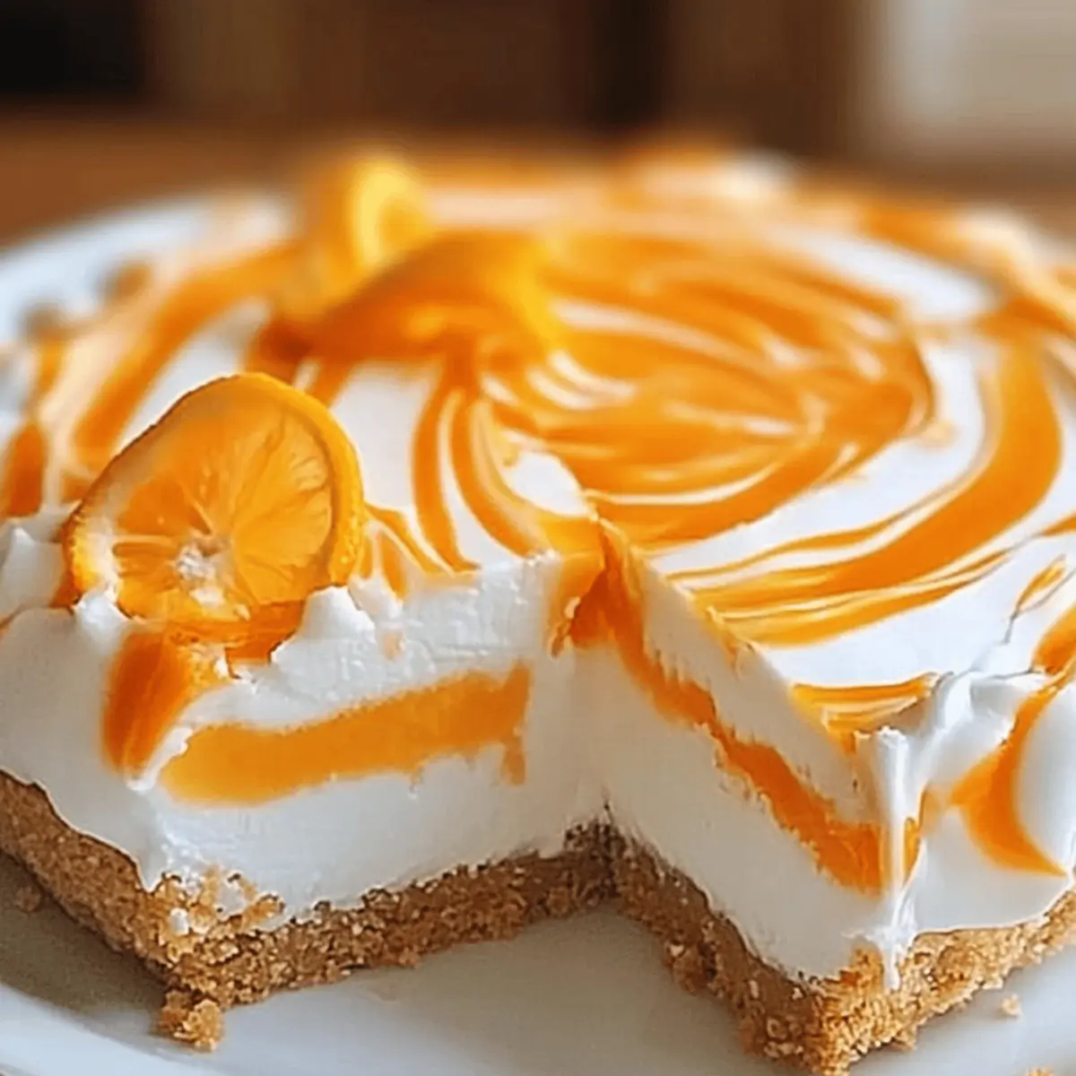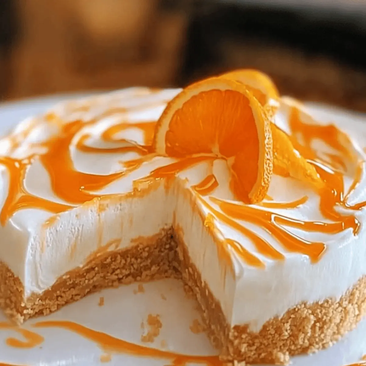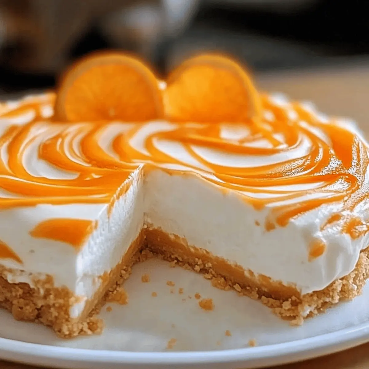As I strolled through the vibrant farmers market last weekend, I couldn’t help but be drawn to the fragrant oranges, their bright hue promising a burst of sunshine in every bite. This No-Bake Orange Creamsicle Cheesecake transforms that irresistible citrus delight into a creamy, dreamy dessert that’s perfect for any occasion. With its effortless preparation and the magic of no baking required, you’ll find yourself returning again and again to this crowd-pleaser. Not only does it bring a refreshing twist to your table, but it also provides a delightful sense of nostalgia reminiscent of carefree summer days. Wouldn’t you love to impress your friends and family with a dessert that’s as simple as it is delicious? Why Is This Cheesecake So Irresistible? Creamy Delight: The No-Bake Orange Creamsicle Cheesecake offers a light, fluffy texture that melts in your mouth, perfect for warm weather gatherings. Quick Prep: You can whip this up in just a few simple steps, making it an ideal last-minute dessert that saves you time and hassle. Bright Citrus Flavor: With fresh orange juice and zest, each slice bursts with sunny, refreshing flavors that transport you straight to summer. Versatile Toppings: Feel free to get creative! Top it with fresh berries or a dollop of whipped cream for an extra touch. If you’re looking for more cheesecake inspiration, check out my Biscoff Cookie Cheesecake or the delectable Apple Crumble Cheesecake. Nostalgic Twist: This cheesecake beautifully captures the essence of childhood treats, bringing a smile to everyone who takes a bite. Crowd-Pleaser: Whether it’s a family dinner or a summer party, this cheesecake will leave your guests raving and asking for the recipe! No-Bake Orange Creamsicle Cheesecake Ingredients For the Crust Graham Cracker Crumbs – Provides the crust structure; can substitute with crushed digestive biscuits for a richer flavor. Unsalted Butter – Binds the graham cracker crust; use coconut oil as a dairy-free alternative. For the Filling Cream Cheese – Adds creamy richness; make sure it’s softened for easy blending, or use vegan cream cheese for a dairy-free option. Powdered Sugar – Sweetens the cheesecake while ensuring a smooth texture; granulated sugar can be used, but may alter the texture slightly. Heavy Whipping Cream – Creates a light, airy filling; non-dairy whipping alternatives can work for a vegan version. Fresh Orange Juice – Imparts a fruity flavor; fresh juice is recommended for best taste, but can substitute with lemon juice for a tart twist. Orange Zest – Enhances the orange flavor profile; lemon zest can be used for a different citrus character. Vanilla Extract – Adds depth of flavor; use pure vanilla extract for best results, while imitation extract can be a more affordable option. Unflavored Gelatin – Provides structure to the cheesecake without baking; agar-agar can be used as a vegetarian option. Cold Water – Activates the gelatin; no substitutes needed. Optional Garnish Orange Slices/Zest – For decoration before serving; adds a pop of color and a hint of freshness to the dish. Step‑by‑Step Instructions for No-Bake Orange Creamsicle Cheesecake Step 1: Prepare the Crust In a mixing bowl, combine graham cracker crumbs with melted unsalted butter until evenly moistened. Press the mixture firmly into the bottom of a 9-inch springform pan, creating a flat and compact crust. Use the back of a measuring cup to ensure it’s tightly packed. Place the crust in the refrigerator while you prepare the filling, allowing it to set slightly. Step 2: Soften Cream Cheese In a large mixing bowl, beat the softened cream cheese using an electric mixer on medium speed until it becomes smooth and creamy, about 2-3 minutes. Scrape down the sides of the bowl as needed to ensure even mixing. This step is crucial for achieving a silky texture in your No-Bake Orange Creamsicle Cheesecake filling. Step 3: Mix in Powdered Sugar Gradually add the powdered sugar to the creamed cheese, mixing at low speed until fully incorporated. Continue mixing for an additional minute until the mixture is light and fluffy. The sugar will sweeten the cheesecake and ensure a smooth consistency, enhancing the overall taste and texture of your dessert. Step 4: Add Cream and Flavorings Pour in the heavy whipping cream, fresh orange juice, orange zest, and vanilla extract into the cream cheese mixture. Beat on medium-high speed until the mixture is light and fluffy, roughly 3-4 minutes. You’ll know it’s ready when the filling has increased in volume and holds soft peaks, creating a delightful creaminess that complements the orange flavor. Step 5: Bloom Gelatin In a small bowl, sprinkle the unflavored gelatin over cold water and let it sit for 5 minutes to bloom. This step activates the gelatin, which will help set the cheesecake. After blooming, gently heat the mixture in the microwave or on the stovetop until completely dissolved, about 30 seconds in the microwave. Step 6: Combine Gelatin Carefully stir the dissolved gelatin into the cheesecake mixture, blending until fully incorporated. This is essential for giving your No-Bake Orange Creamsicle Cheesecake the structure it needs without baking. Ensure there are no lumps, as a smooth texture is key to a successful cheesecake. Step 7: Fill the Crust Pour the creamy filling over the chilled graham cracker crust, using a spatula to spread it evenly across the surface. Smooth the top to your desired finish, making sure there are no air bubbles trapped underneath. This fill-and-smooth process creates a beautiful presentation when you serve your cheesecake. Step 8: Chill Cover the springform pan with plastic wrap and refrigerate the cheesecake for at least 4 hours, but preferably overnight. This chilling process allows the cheesecake to set properly, ensuring a perfect slice that holds its shape when served, making it a mouthwatering No-Bake Orange Creamsicle Cheesecake. Step 9: Unmold Once s