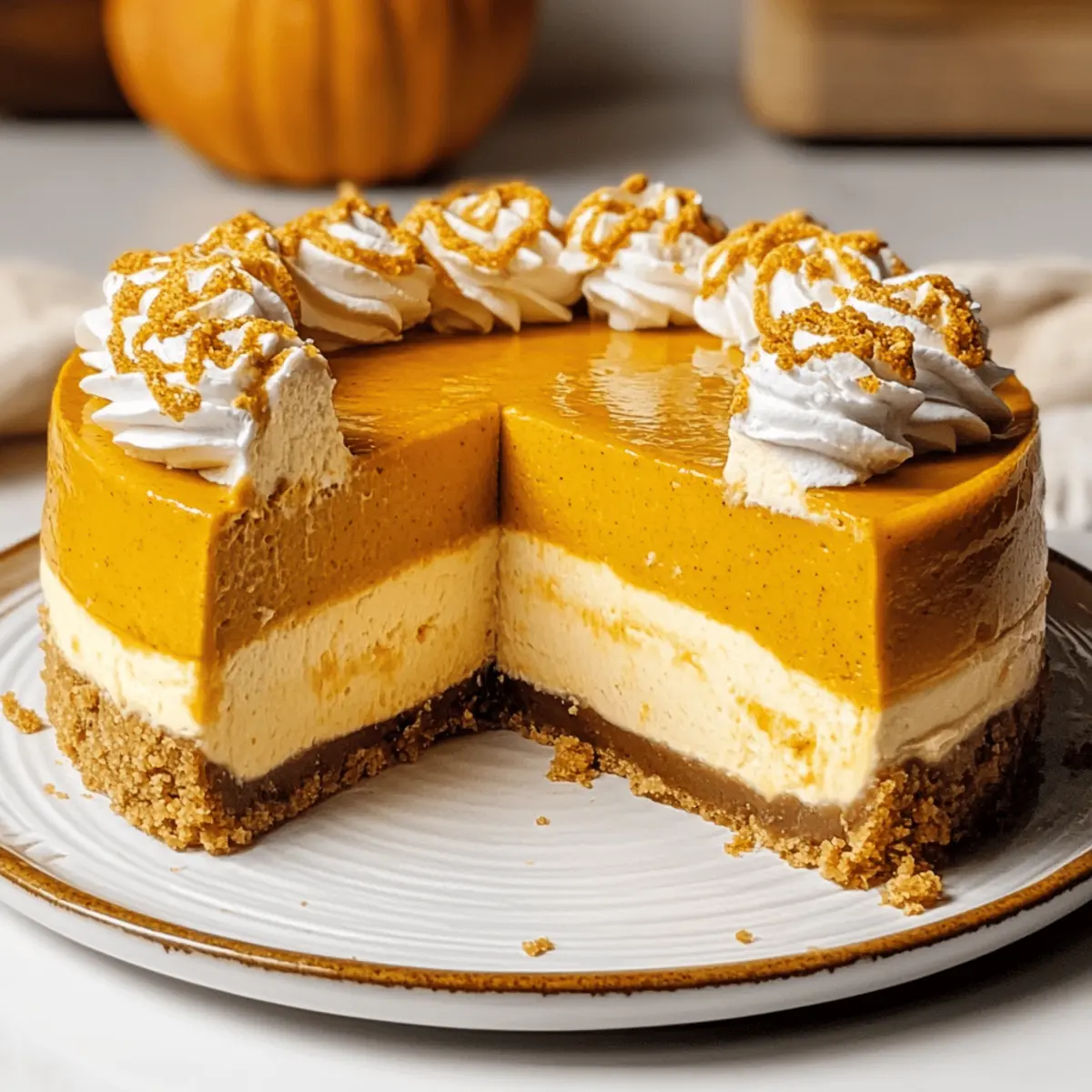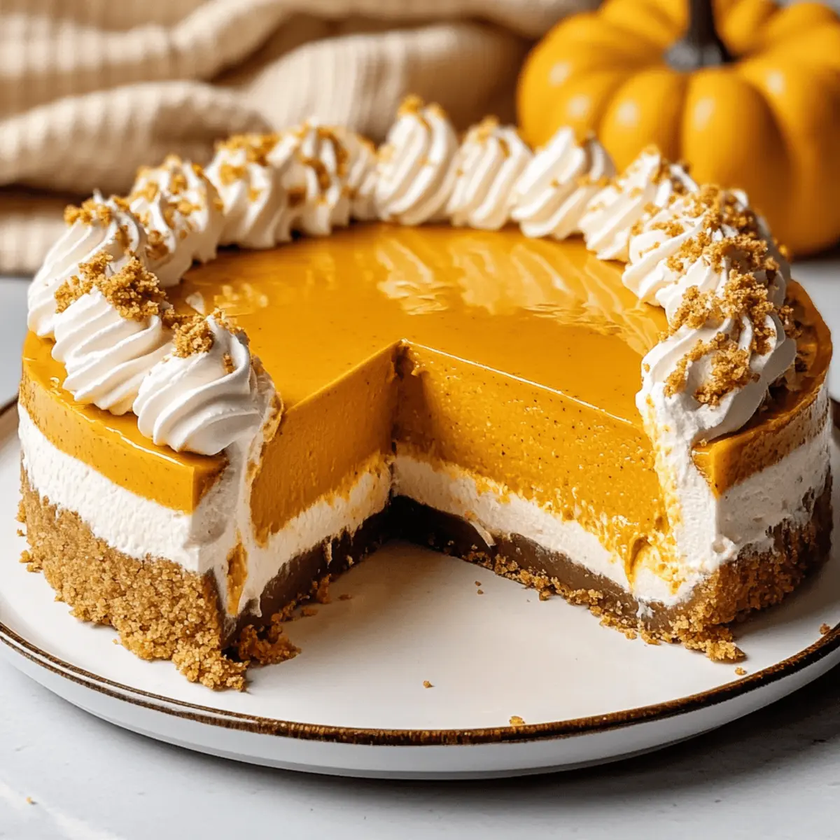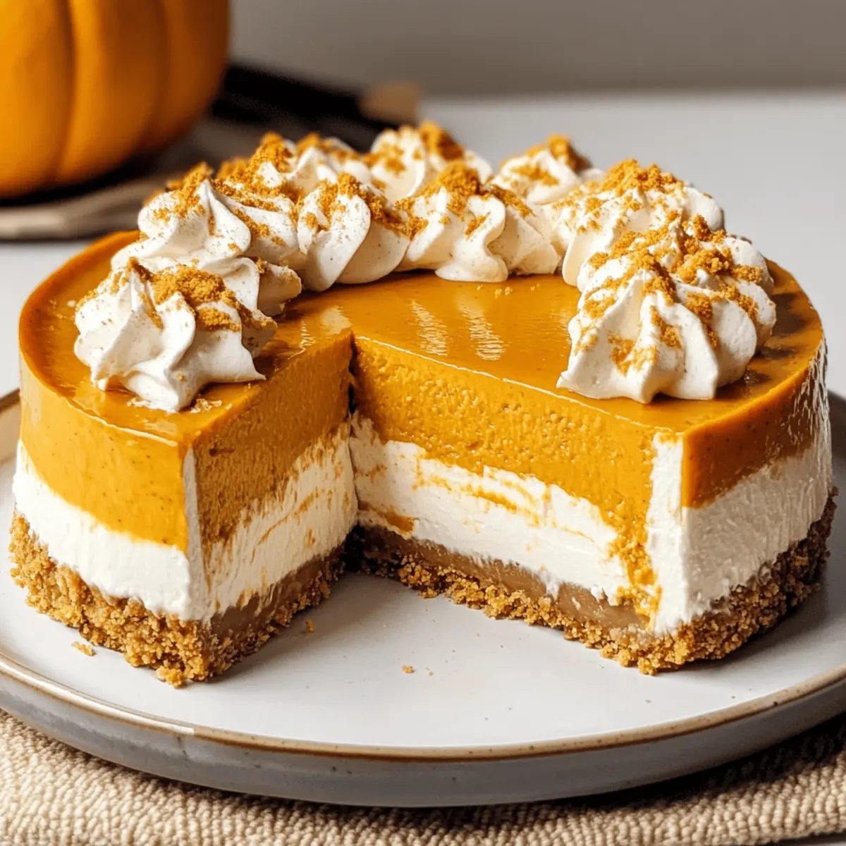 As autumn’s chill settles in, nothing quite evokes the season like a luscious dessert that doesn’t require an oven. Enter the No Bake Pumpkin Cheesecake, an effortless fall delight that’s here to save your taste buds from mundane fast-food indulgence. With its creamy texture and spiced flavors reminiscent of tradition, this cheesecake is not only quick to prepare but also freezer-friendly, making it perfect for those cozy gatherings or Thanksgiving feasts. You can whip this up ahead of time and watch as it steals the spotlight, letting you focus on creating cherished memories with family and friends. Are you ready to elevate your dessert game and impress your guests with a simple yet stunning treat? Why is No Bake Pumpkin Cheesecake a Must-Try? Simplicity at Its Finest: This recipe requires minimal effort, combining ingredients effortlessly without the need for baking. Creamy Texture: The use of cream cheese and whipped cream creates a rich, velvety filling that melts in your mouth. Fall Flavor Explosion: Loaded with warm spices like cinnamon and nutmeg, it’s a delightful taste of autumn in every bite. Make-Ahead Perfection: Easily prepared in advance, this cheesecake can be stored in the fridge, saving you time for other festivities. Crowd-Pleaser: Its irresistible flavor and stunning presentation make it a standout at any gathering, from Thanksgiving to family dinners. For more delicious no-bake options, check out our Biscoff Cookie Cheesecake or refreshing Cheesecake Ice Cream. No Bake Pumpkin Cheesecake Ingredients • Discover the simplicity of your favorite fall dessert! For the Crust Graham Cracker or Gingersnap Crumbs – The base layer providing structure and flavor; gingersnaps add a delightful peppery spice. Sugar – Sweetens the crust, balancing flavors beautifully. Butter (melted) – Binds the crust ingredients together; try margarine or coconut oil for a dairy-free twist. For the Filling Cream Cheese (full-fat) – Delivers a rich and creamy filling; avoid low-fat or whipped varieties for the best texture. Canned Pumpkin – The star of this dish; use 100% pure pumpkin and drain excess moisture for a firmer cheesecake. Powdered Sugar – Lightens the filling while adding sweetness. Molasses – Adds a depth and caramelly undertone; substitute with dark brown sugar or maple syrup if desired. Vanilla Extract – Elevates the overall flavor of the filling. Spices (cinnamon, ginger, nutmeg, cloves, cardamom) – A fragrant mix creating a holiday-inspired flavor explosion. For the Whipped Cream Topping Heavy Cream – Whipped to create a fluffy texture; ensure stiff peaks for easy folding into your filling. Create this No Bake Pumpkin Cheesecake and enjoy the joyful flavors of fall without turning on your oven! Step‑by‑Step Instructions for No Bake Pumpkin Cheesecake Step 1: Prepare the Crust In a mixing bowl, combine 1 and ½ cups of crushed graham cracker or gingersnap crumbs with ⅓ cup of sugar and ½ cup of melted butter. Mix until the texture resembles wet sand. Firmly press this mixture into the bottom of a 9-inch springform pan to create an even crust. Place the pan in the freezer for 15 minutes to allow the crust to set. Step 2: Make the Filling Using a hand mixer, whip 16 ounces of softened cream cheese in a large bowl until it’s smooth and creamy, about 2-3 minutes. Gradually add 1 cup of canned pumpkin, 1 cup of powdered sugar, 2 tablespoons of molasses, 1 teaspoon of vanilla extract, and 1 and ½ teaspoons of mixed spices (cinnamon, nutmeg, and ginger). Blend until silky smooth, scraping down the sides of the bowl as needed. Step 3: Incorporate Whipped Cream In a separate bowl, pour 1 cup of heavy creamand use a hand mixer to whip it until stiff peaks form, usually 3-5 minutes. Gently fold the whipped cream into the pumpkin mixture, being careful not to deflate the cream. This step will give the No Bake Pumpkin Cheesecake its light, airy texture, so add the whipped cream gradually and fold until fully combined. Step 4: Assemble the Cheesecake Carefully pour the creamy pumpkin filling into the chilled crust, using a spatula to smooth the top for an even finish. Once the filling is level, cover the springform pan with plastic wrap to prevent any drafts from affecting the texture. Refrigerate the cheesecake for at least 8 hours, ideally overnight, allowing it to firm up and develop its flavors. Step 5: Serve and Enjoy After chilling, remove the cheesecake from the fridge, unclip the springform pan, and serve cold. Feel free to garnish generously with spiced whipped cream, a drizzle of caramel, or some crushed cookies on top. This No Bake Pumpkin Cheesecake not only looks stunning but tastes like autumn on a plate—perfect for your fall gatherings! How to Store and Freeze No Bake Pumpkin Cheesecake Fridge: Keep your No Bake Pumpkin Cheesecake covered in the refrigerator for up to 3 days to maintain its freshness and creamy texture. Freezer: For longer storage, wrap slices or the whole cheesecake tightly in plastic wrap, then aluminum foil, and freeze for up to 3 months. Thawing: When ready to enjoy, remove from the freezer and thaw in the fridge overnight. This ensures it remains creamy and delicious without compromising texture. Airtight: Always use airtight containers or wrappings to prevent freezer burn and maintain the delightful flavors of your cheesecake. Make Ahead Options These No Bake Pumpkin Cheesecakes are perfect for meal prep enthusiasts! You can prepare the crust and filling up to 24 hours in advance, allowing the flavors to deepen. Simply crush the graham crackers or gingersnaps, mix with melted butter and sugar, then press it into your springform pan. Prepare the filling by whipping cream cheese and folding in the pumpkin spice mixture, then chill it until ready to assemble. Keep the cheesecake stored covered in the refrigerator for up to 3 days for maximum freshness. When it’s time to serve, add your desired toppings like whipped cre